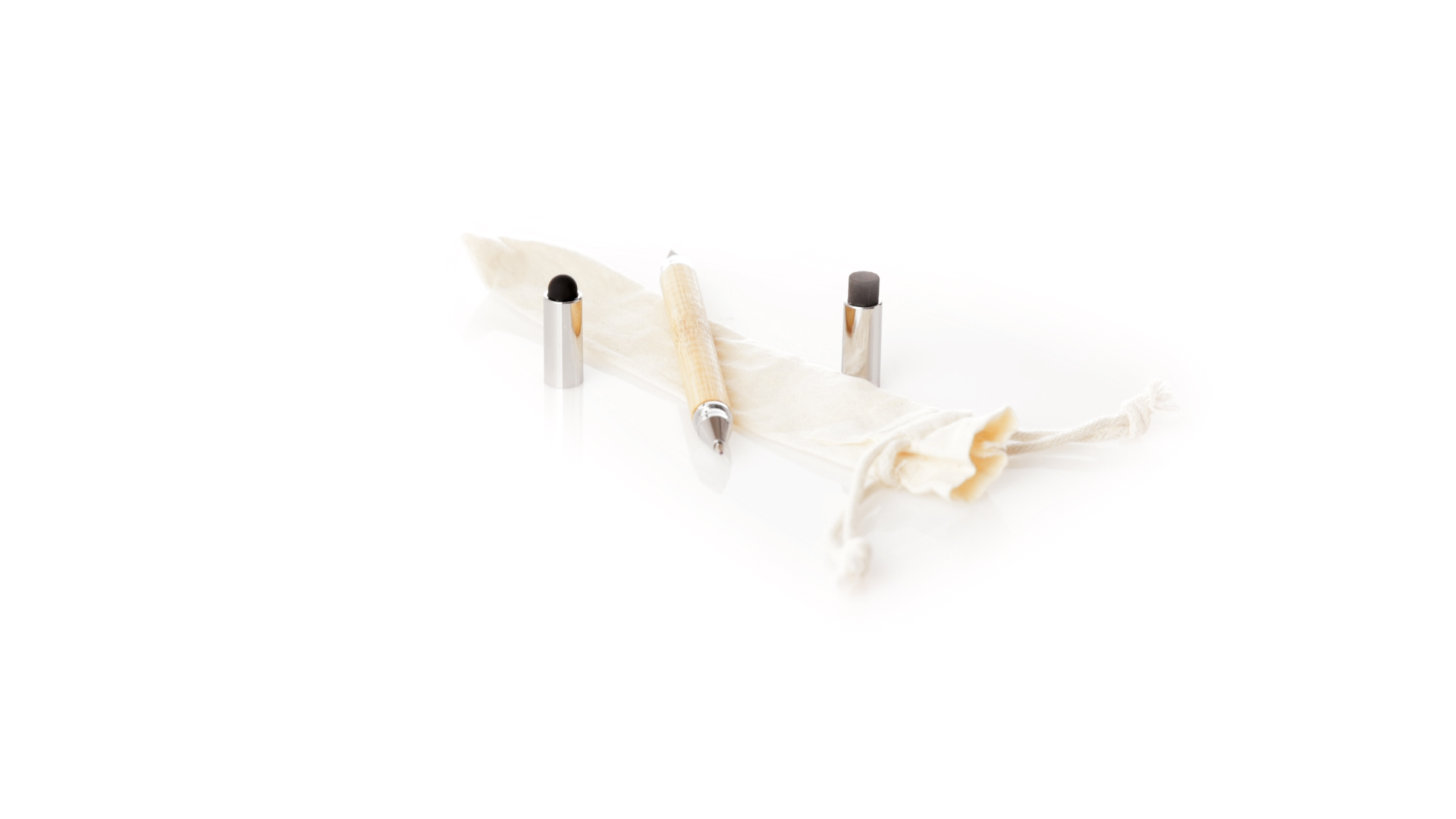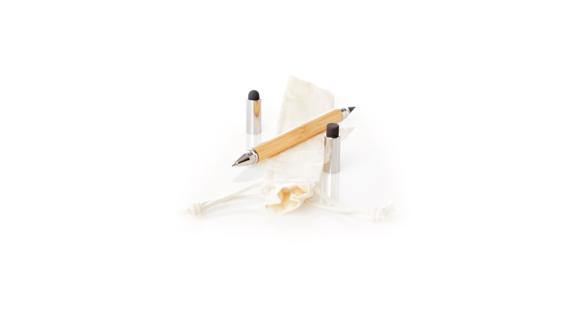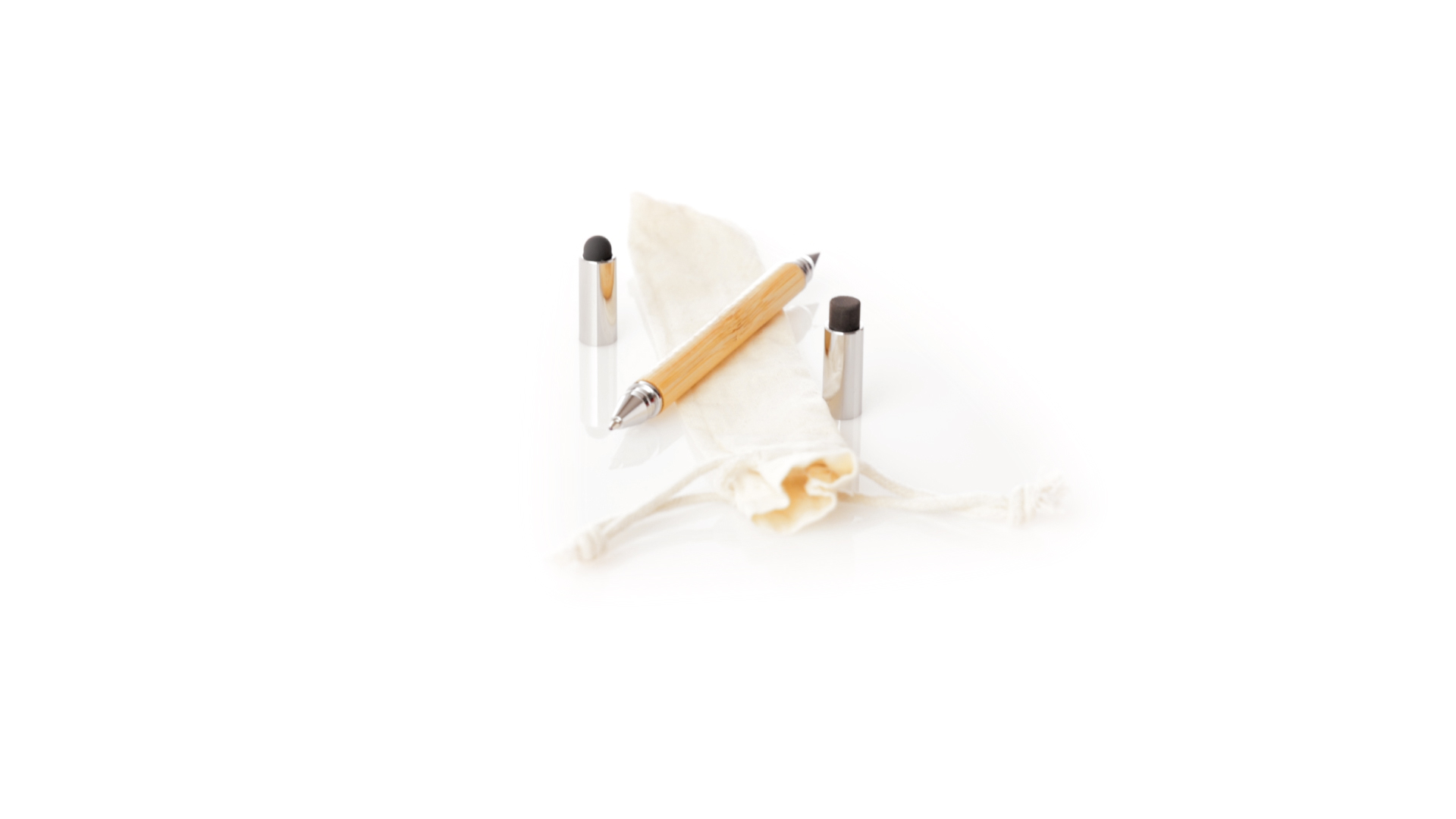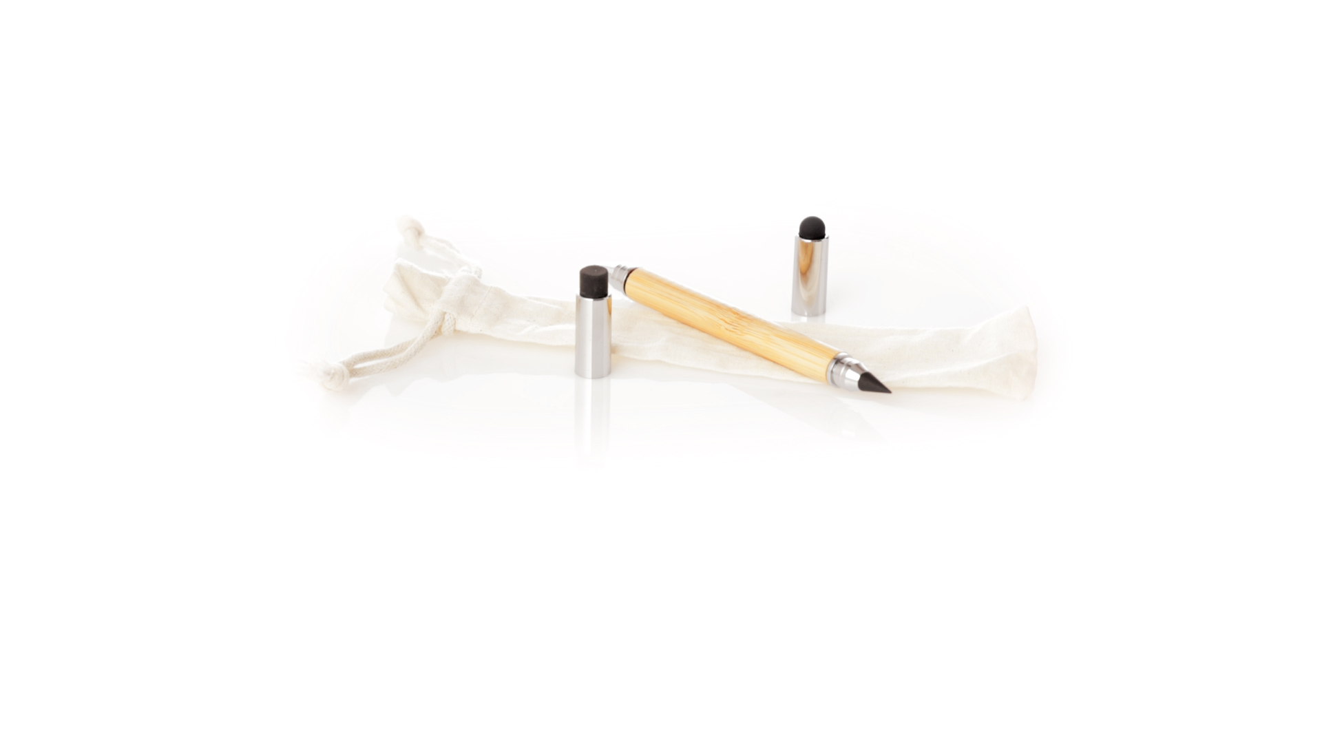 2-in-1-Dauerbleistift aus Bambus, mit glattem Schaft und verchromten Beschlägen. Mit Kapuzenverschluss, Radiergummi und Stift an beiden Enden, mit Kugelschreibern an einem Ende (Jumbo-Füllung und blaue Tinte) und ewigem Bleistift am anderen Ende, so dass Sie immer denselben Bleistift verwenden und keinen Abfall produzieren. Präsentiert in einem Etui aus Baumwolle mit Kordelzugverschluss.