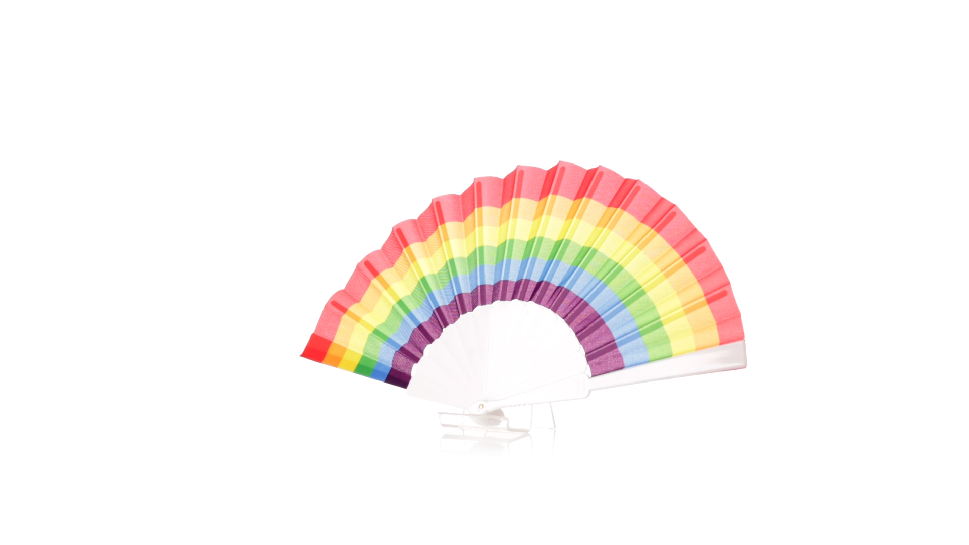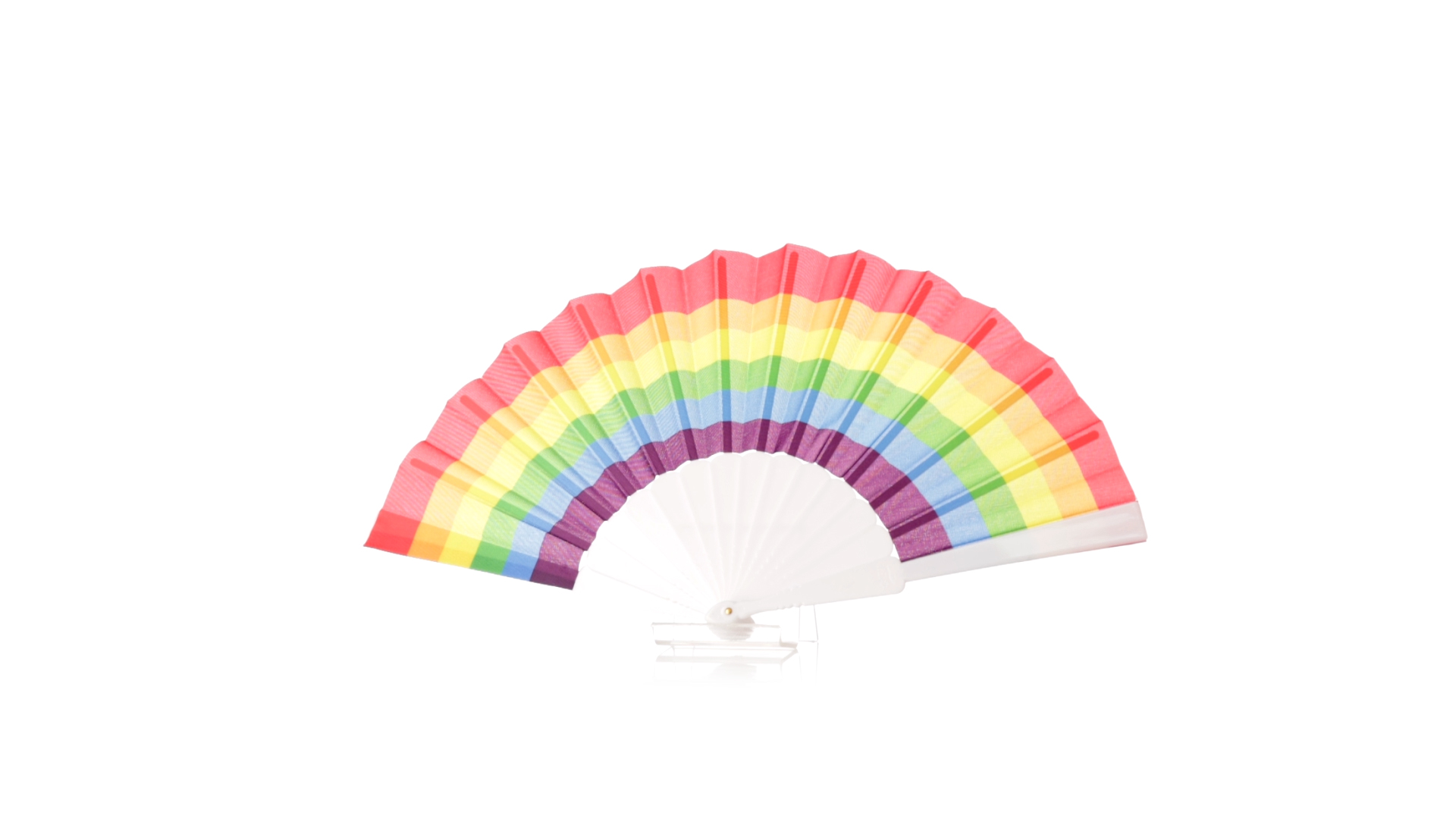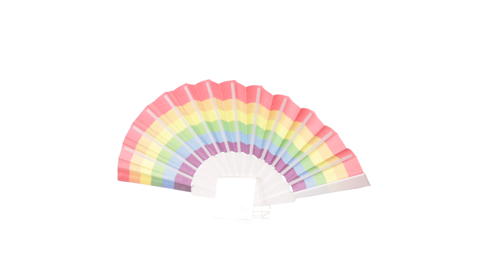 Regenbogenfächer mit mehrfarbigem Stoff und weissen RPET-Rippen. Ein Fächer, der sich sehen lassen kann, mit dem unverwechselbaren, in Form gespritzten RPET. Präsentiert in einer individuellen weissen Schachtel mit Sichtfenster.
