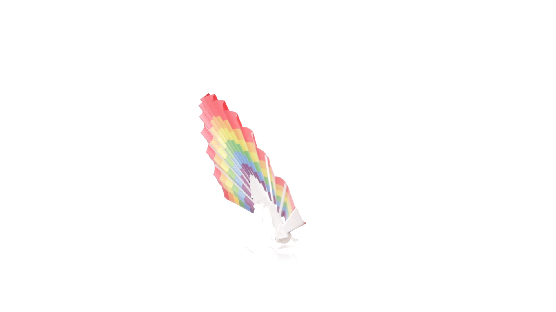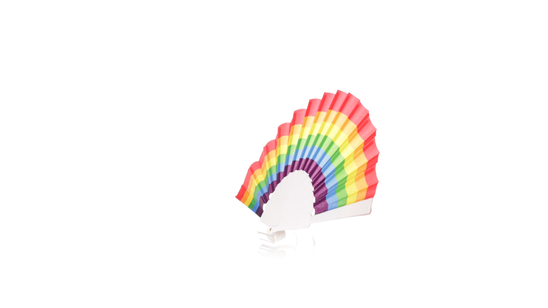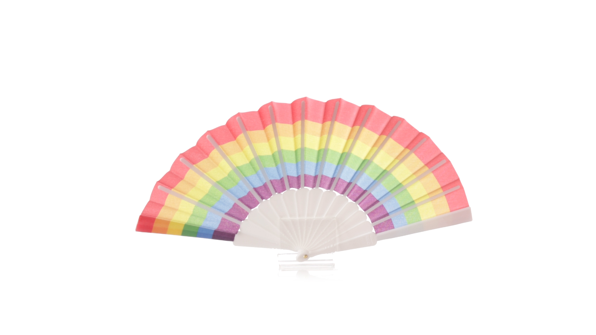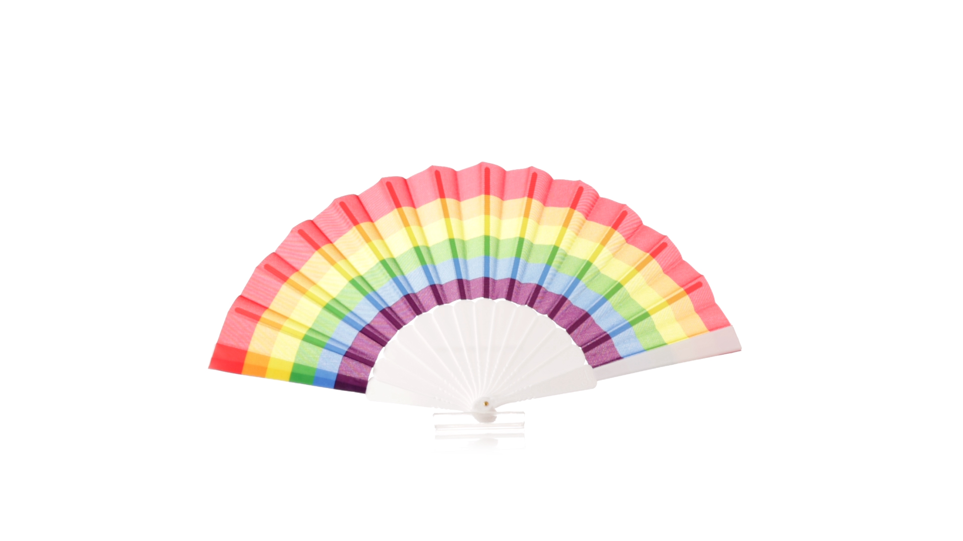 Regenbogenfächer mit mehrfarbigem Stoff und weissen RPET-Rippen. Ein Fächer, der sich sehen lassen kann, mit dem unverwechselbaren, in Form gespritzten RPET. Präsentiert in einer individuellen weissen Schachtel mit Sichtfenster.