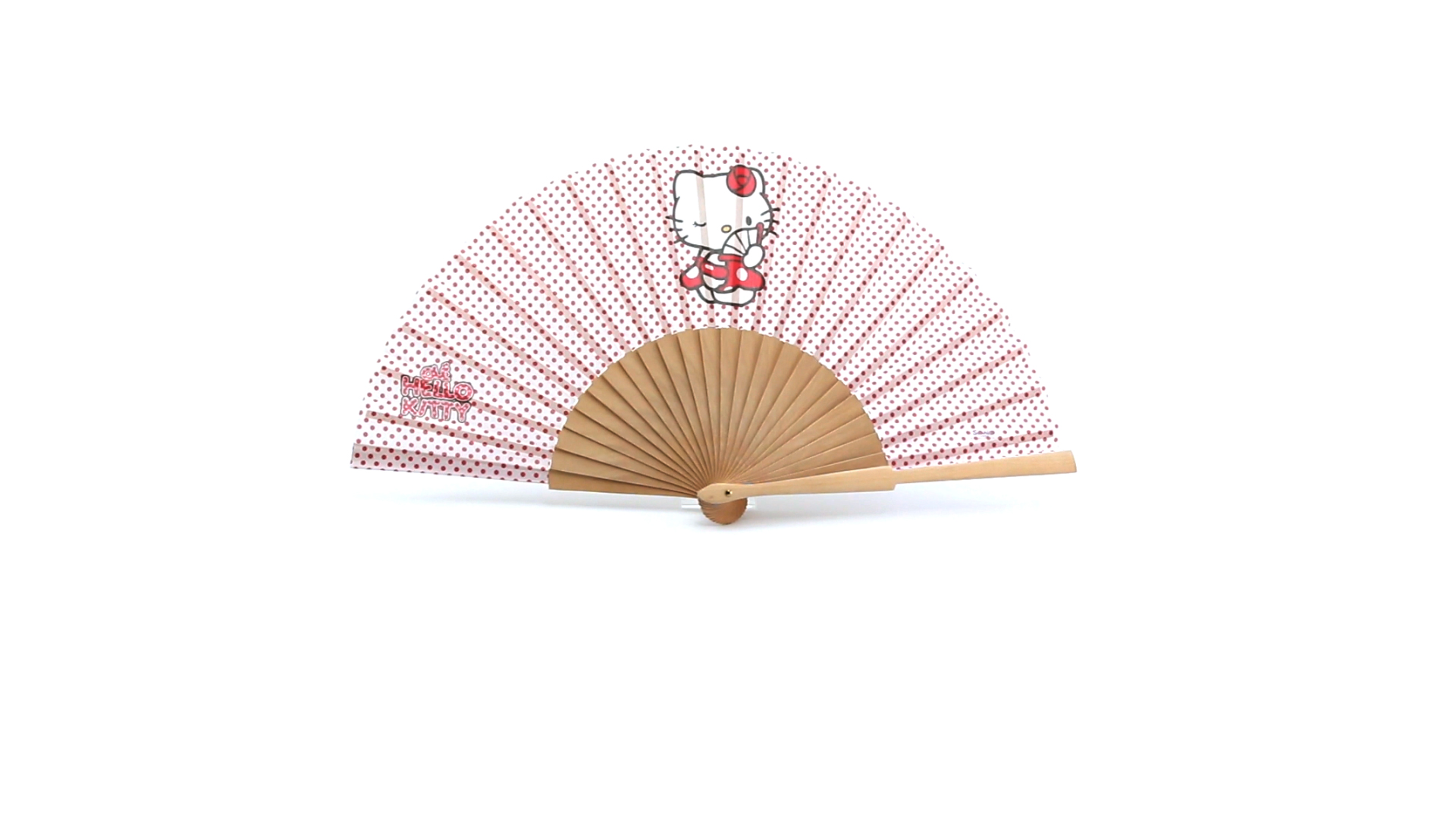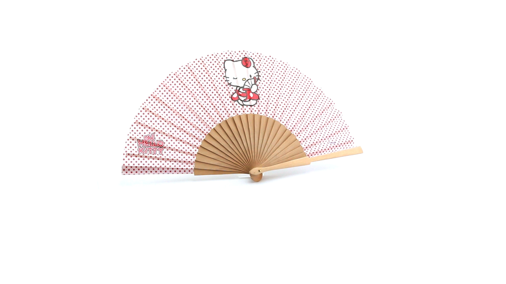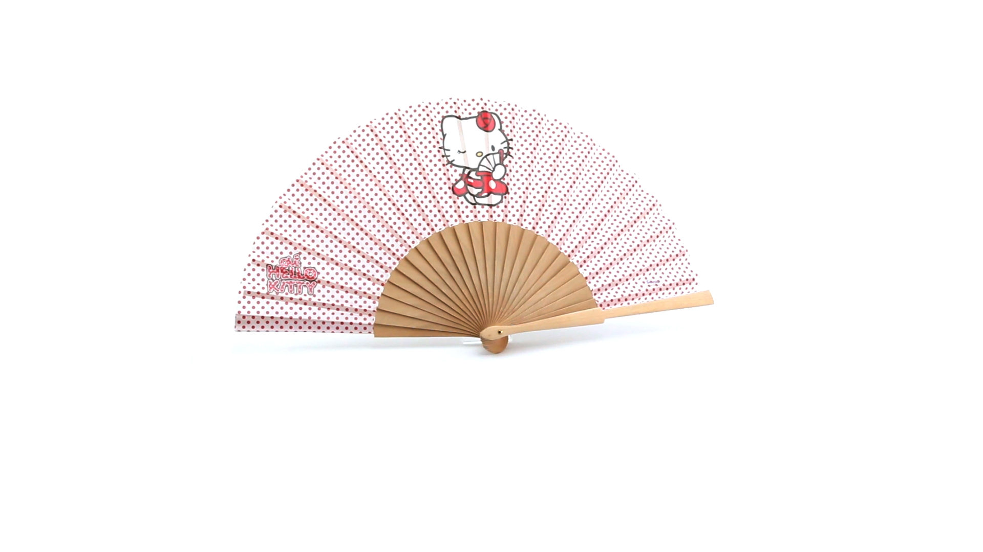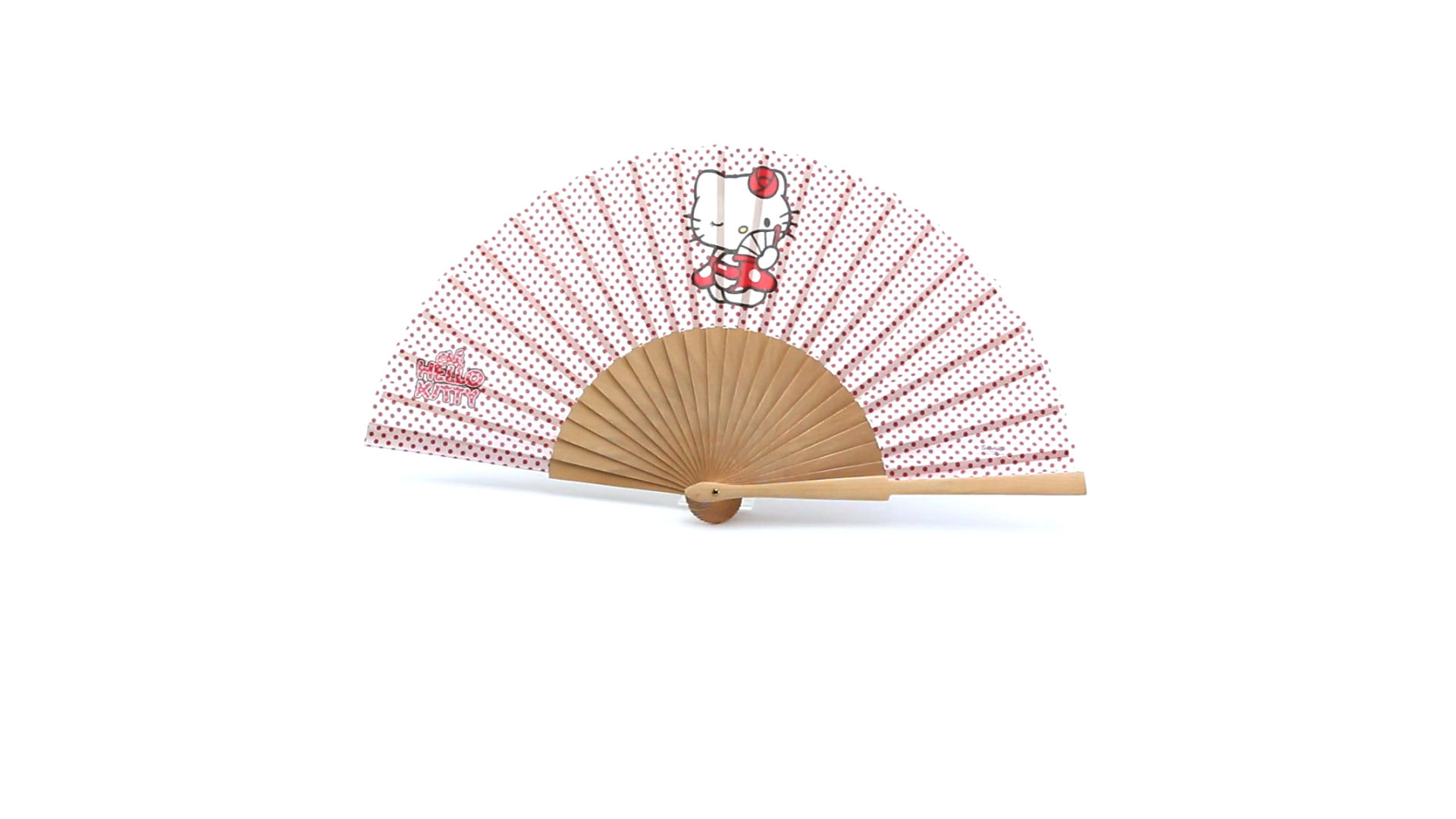 Fächer von Hello Kitty mit Stäbchen aus Naturholz und Gewebe mit originellem Design der Katze der Marke. Präsentiert in einer individuellen Box.
