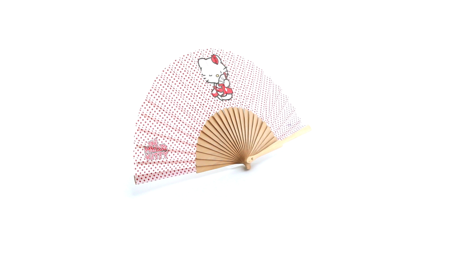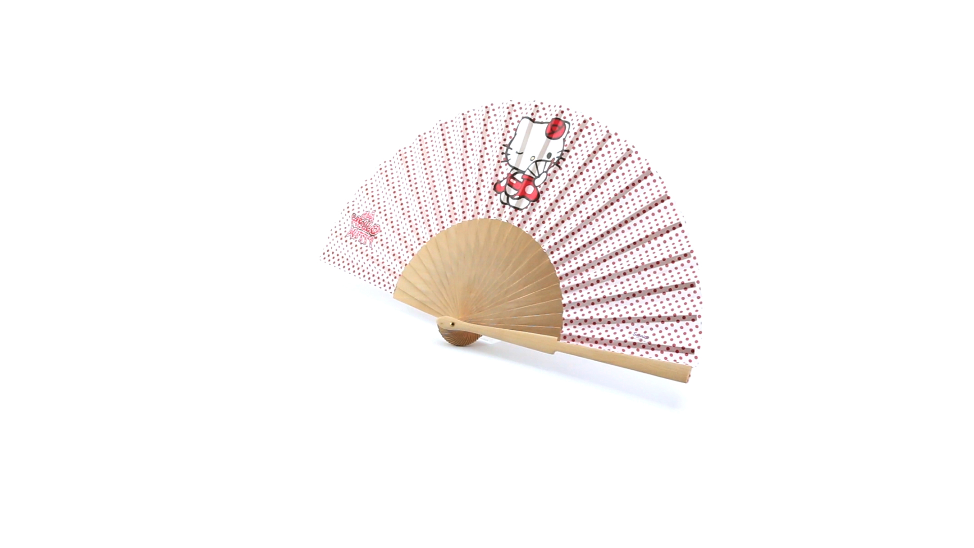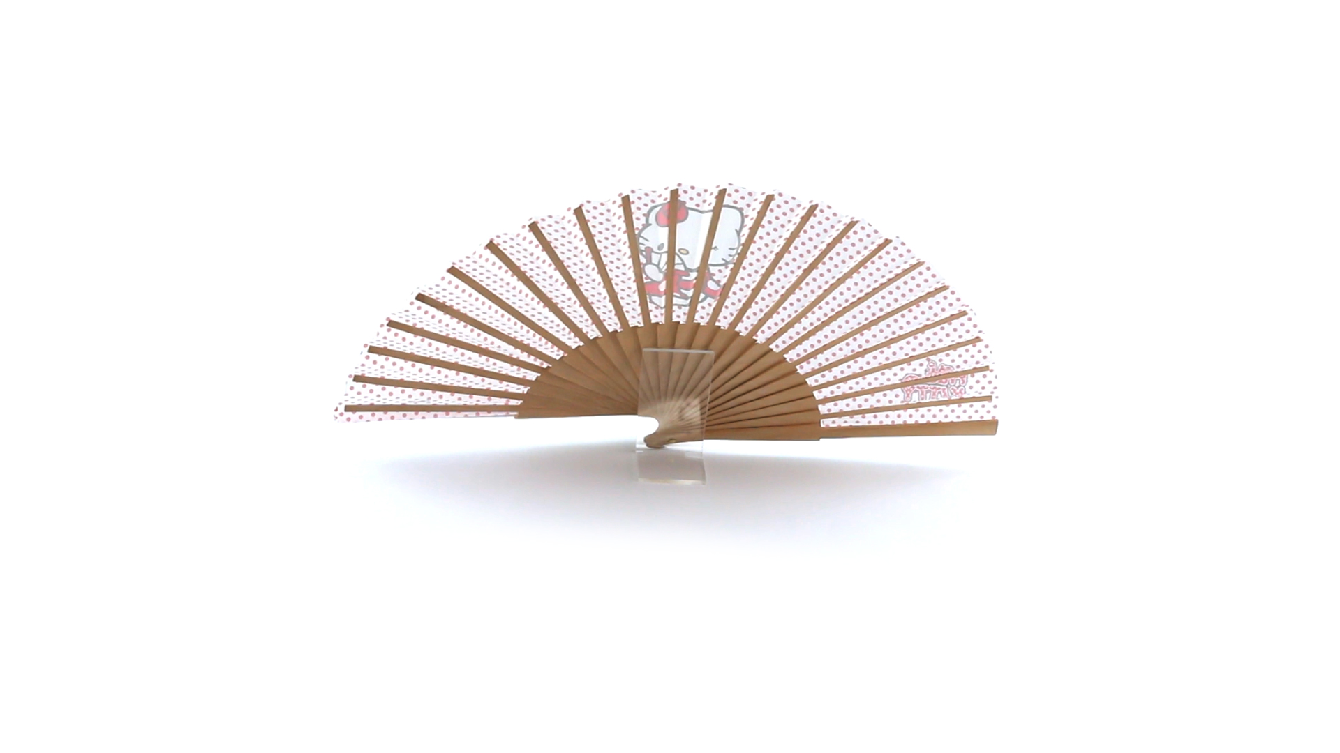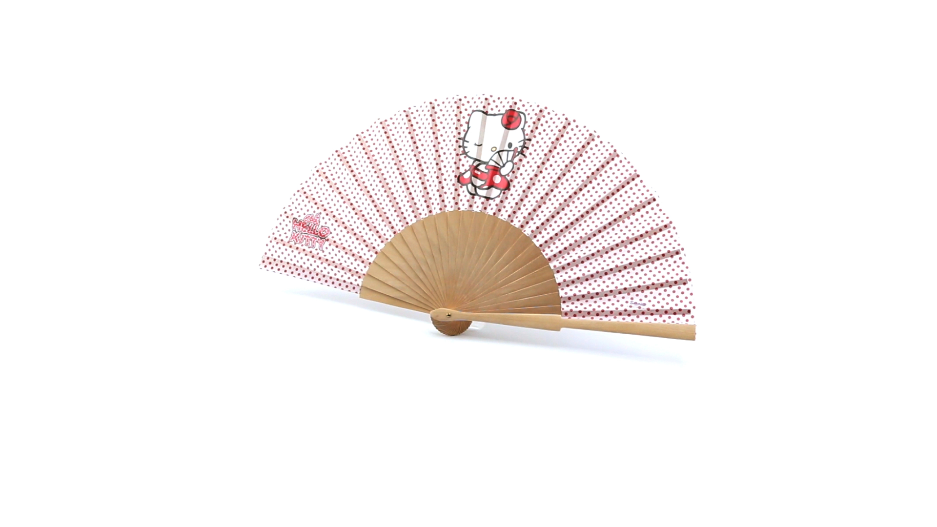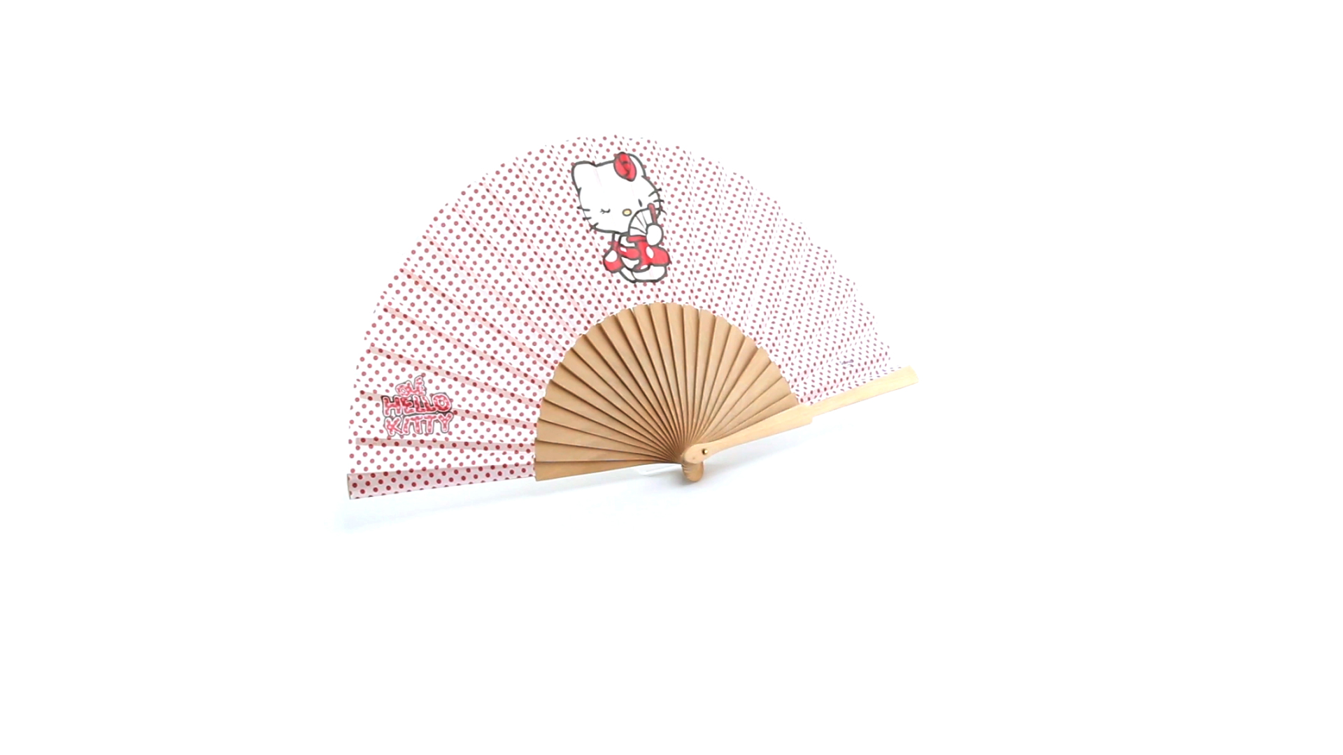 Fächer von Hello Kitty mit Stäbchen aus Naturholz und Gewebe mit originellem Design der Katze der Marke. Präsentiert in einer individuellen Box.