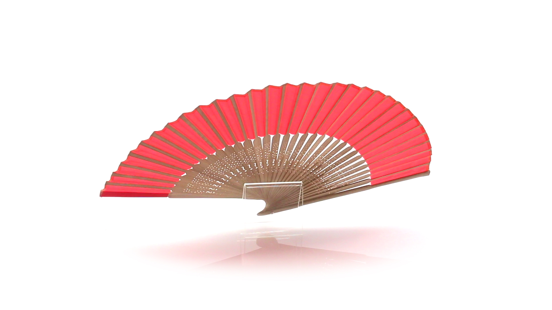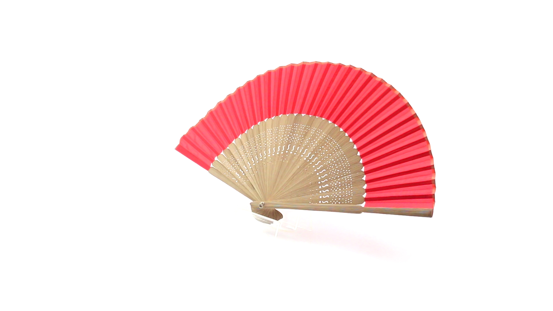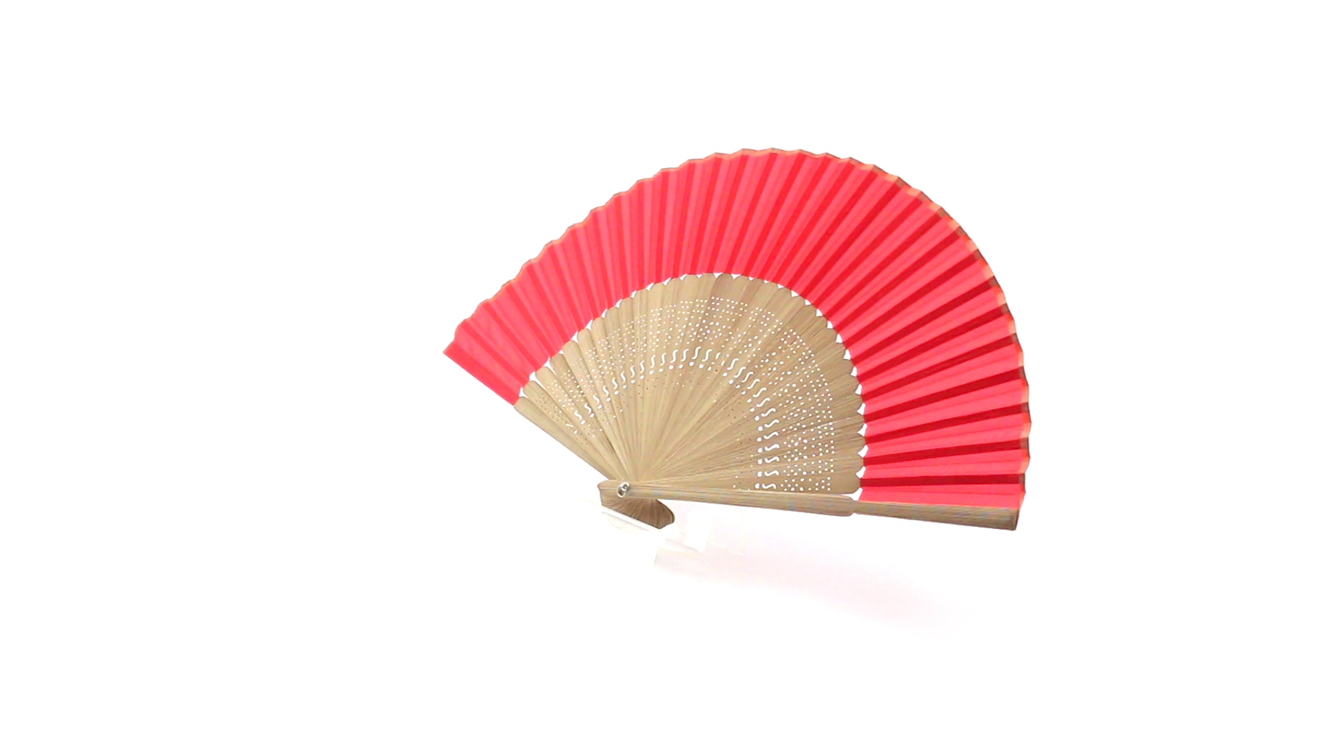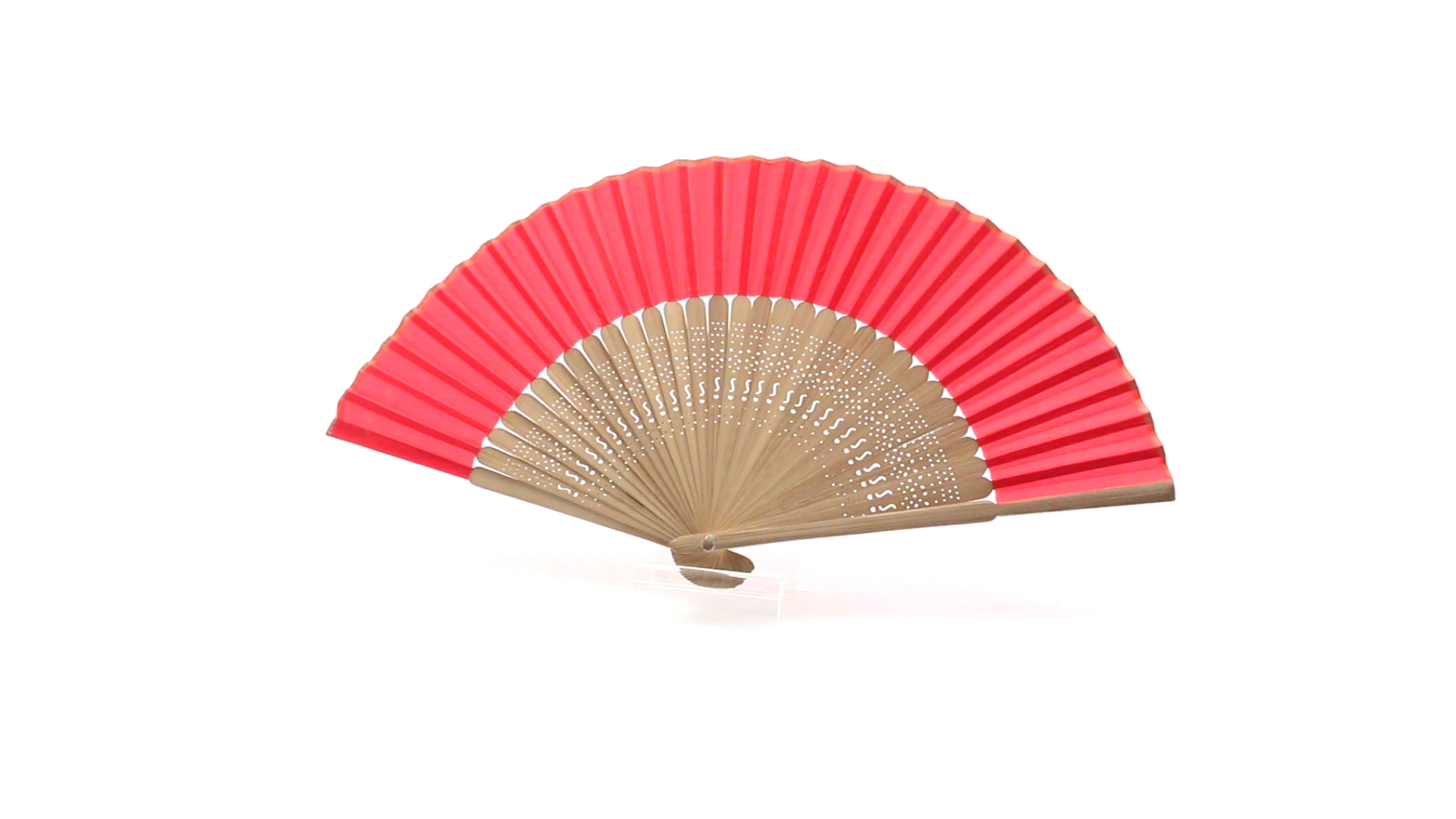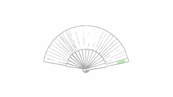 Handfächer aus gestanzten Holzstäbchen und Polyestergewebe in verschiedenen Farben. Präsentiert in einer individuellen Stofftasche mit Schleifenband.