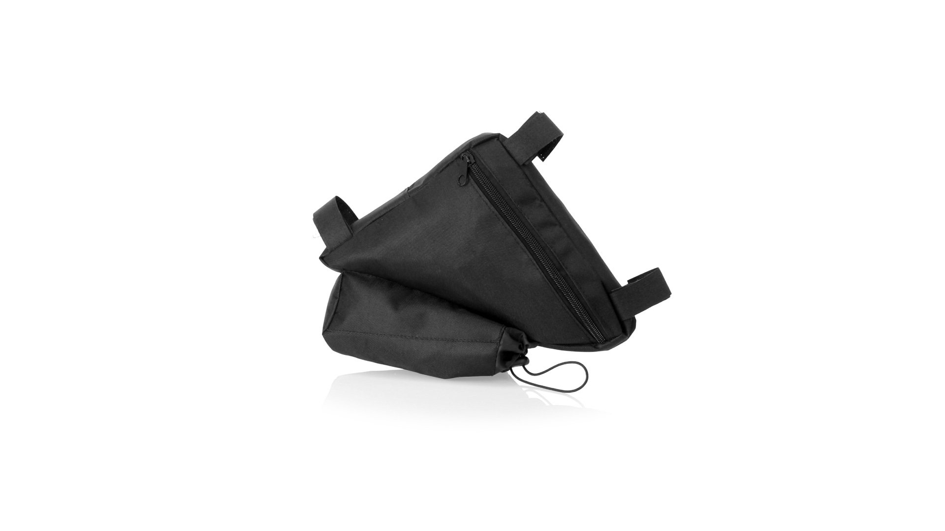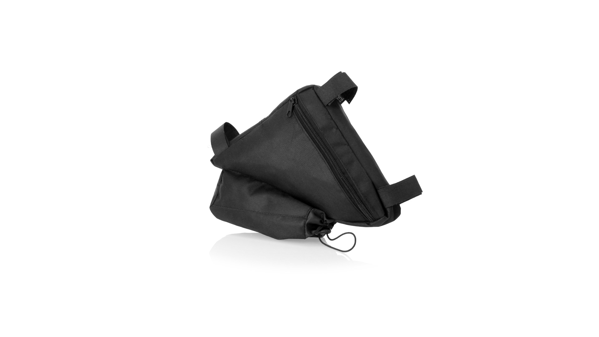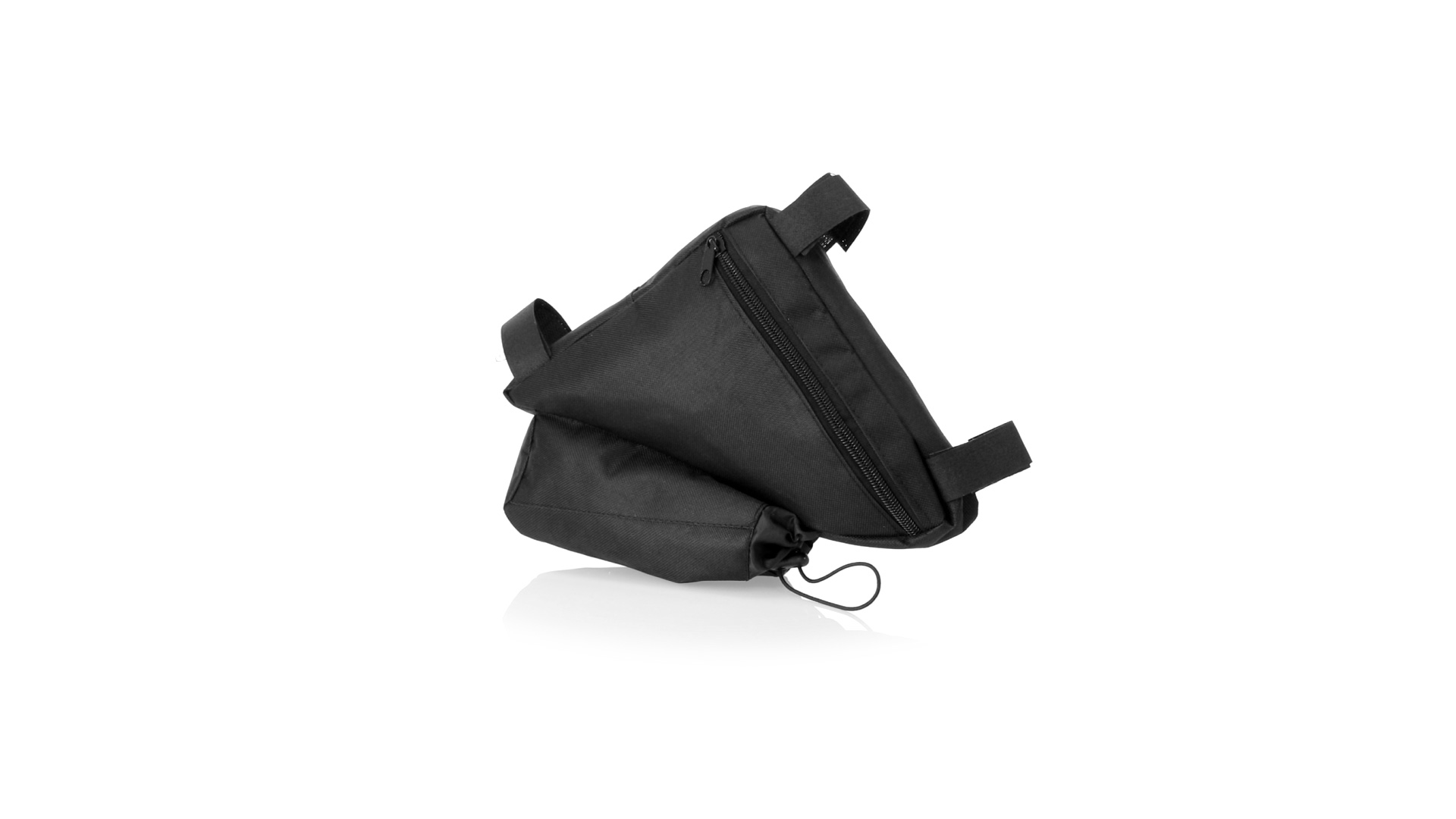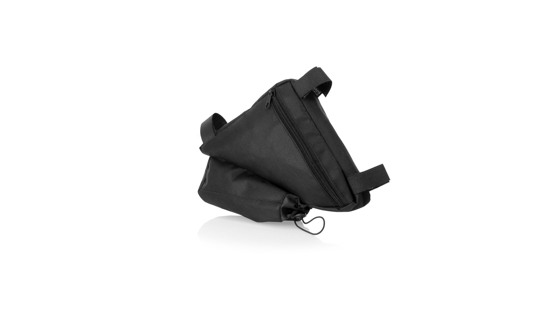 Fahrradtasche aus strapazierfähigem 600D-Polyester mit PVC-verstärkter Innenseite. Erhältlich in schwarz. Hauptfach mit Reissverschluss und universeller Anpassung an den Fahrradrahmen durch 3 Klettbänder. Wasserflaschenfach mit verstellbarem Kordelzug.
