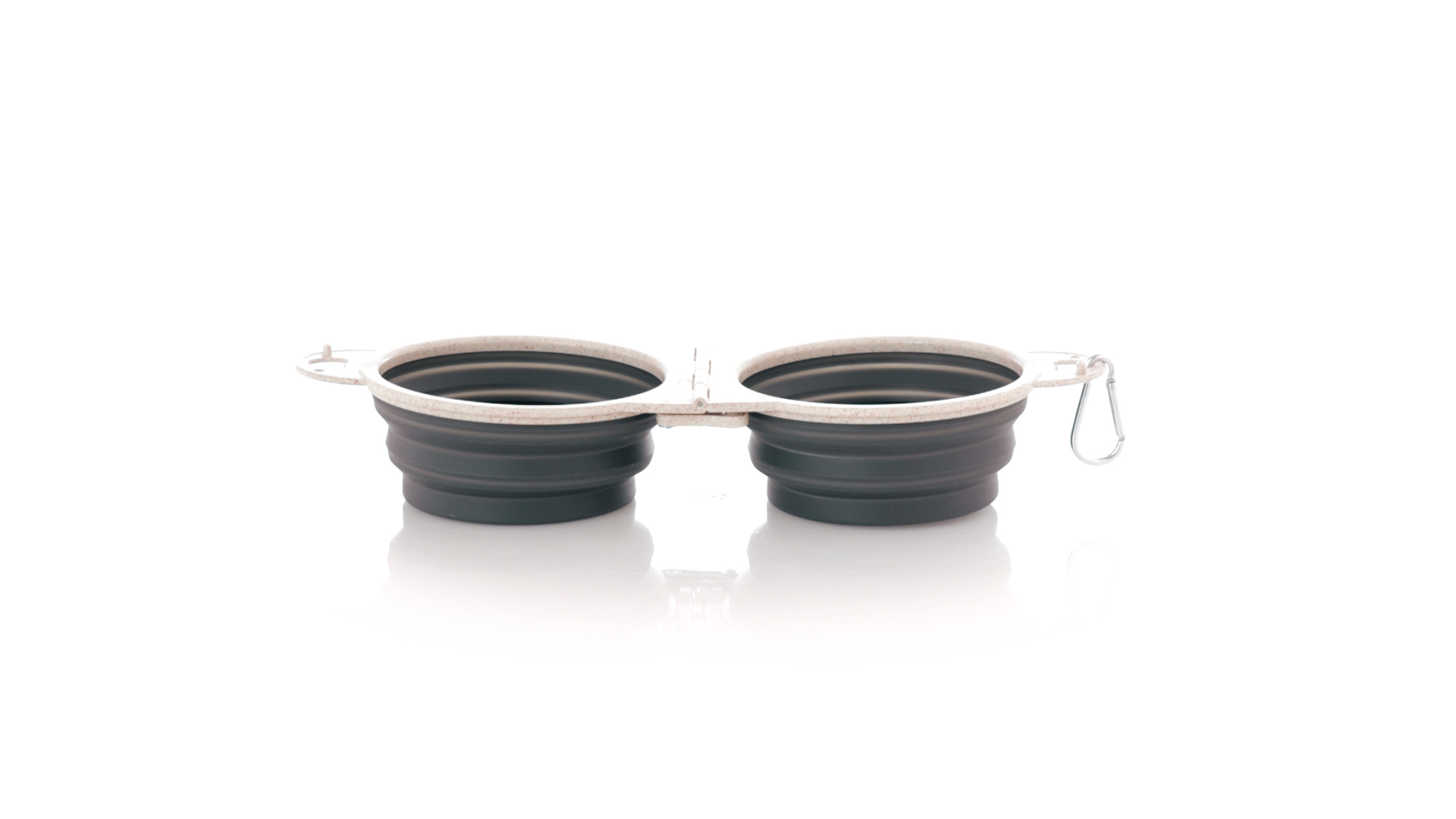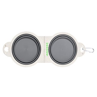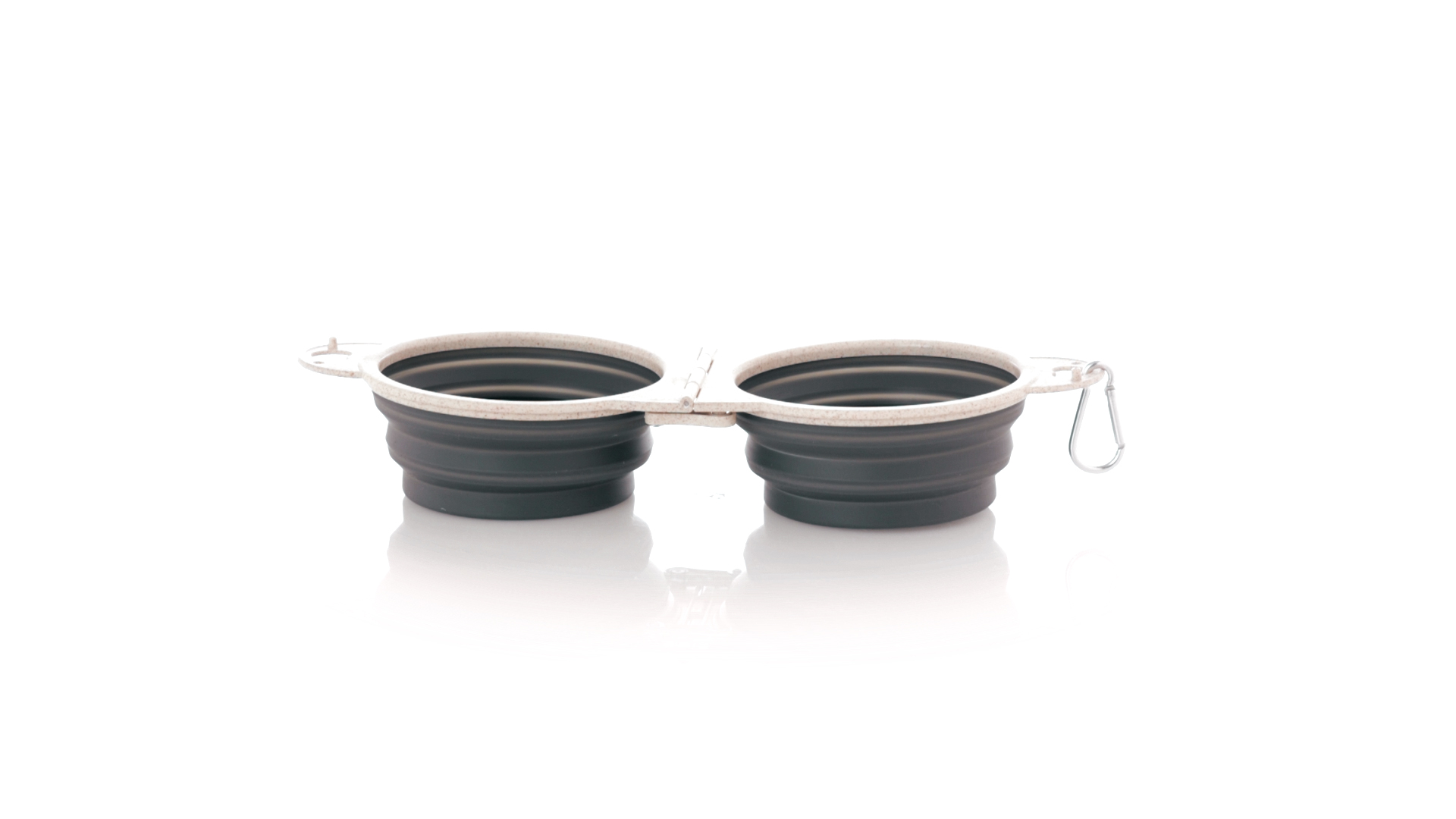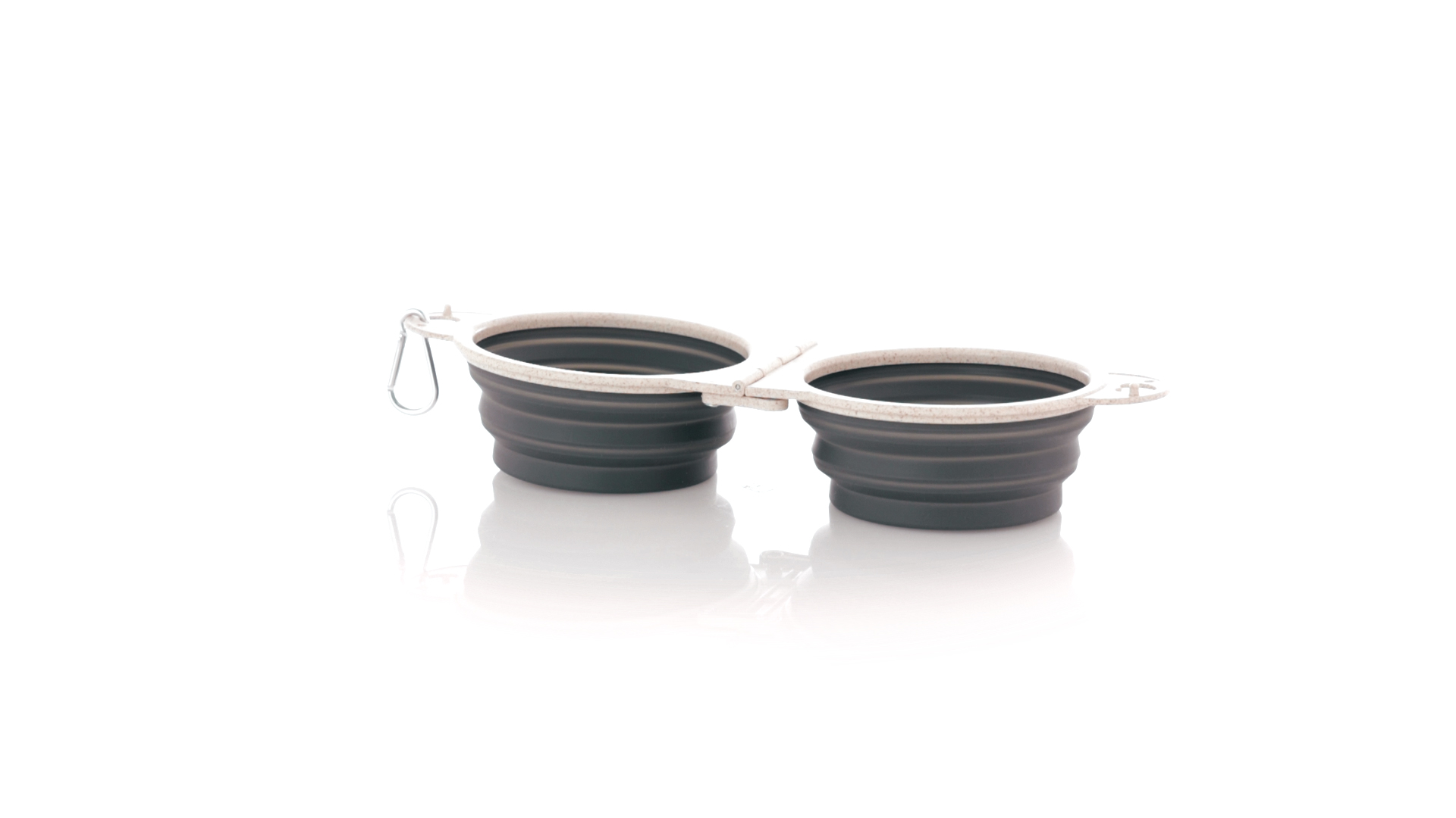 Faltbarer Futternapf aus Weizenstroh. Kompaktes Design, mit zwei Fächern und perfekt für den Einsatz überall. Inklusive praktischem, einfach zu befestigendem Karabiner. Präsentiert in einer einzelnen recycelten Tasche.