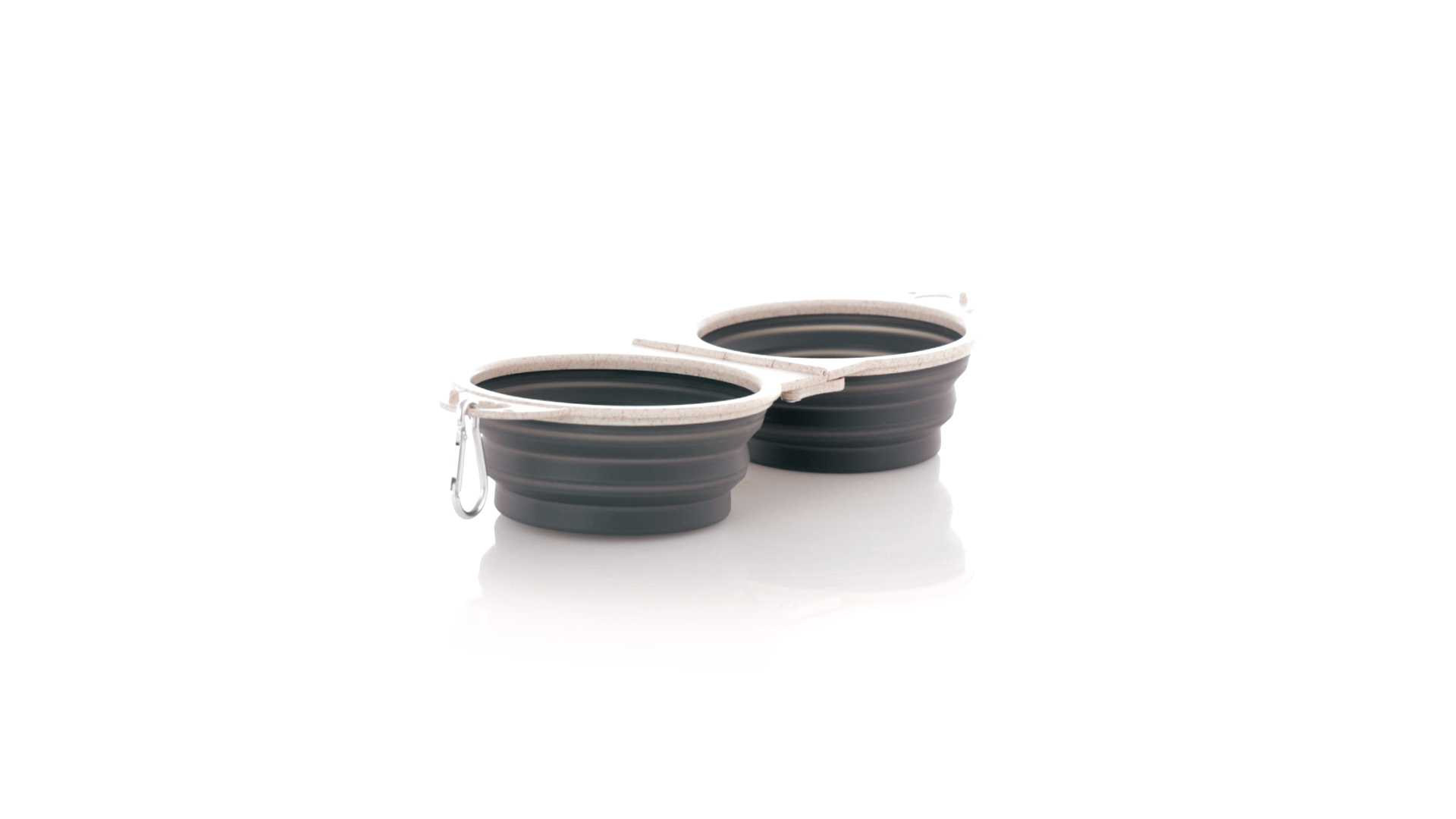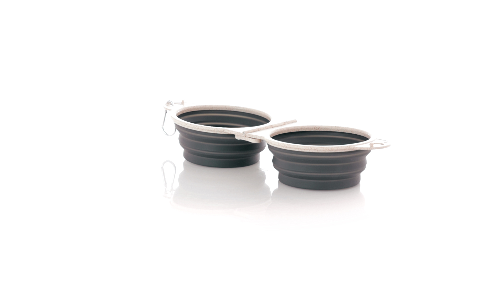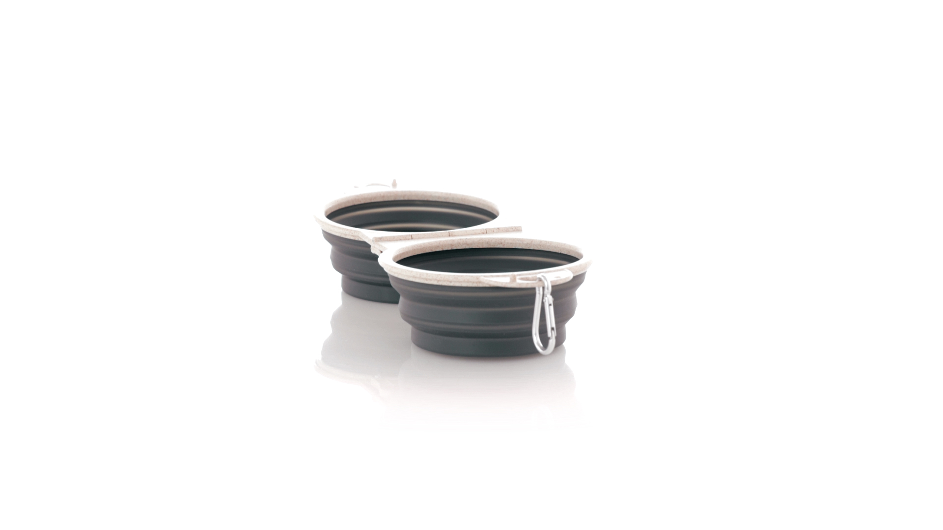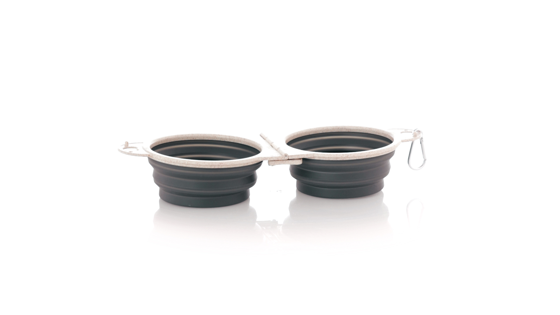 Faltbarer Futternapf aus Weizenstroh. Kompaktes Design, mit zwei Fächern und perfekt für den Einsatz überall. Inklusive praktischem, einfach zu befestigendem Karabiner. Präsentiert in einer einzelnen recycelten Tasche.
