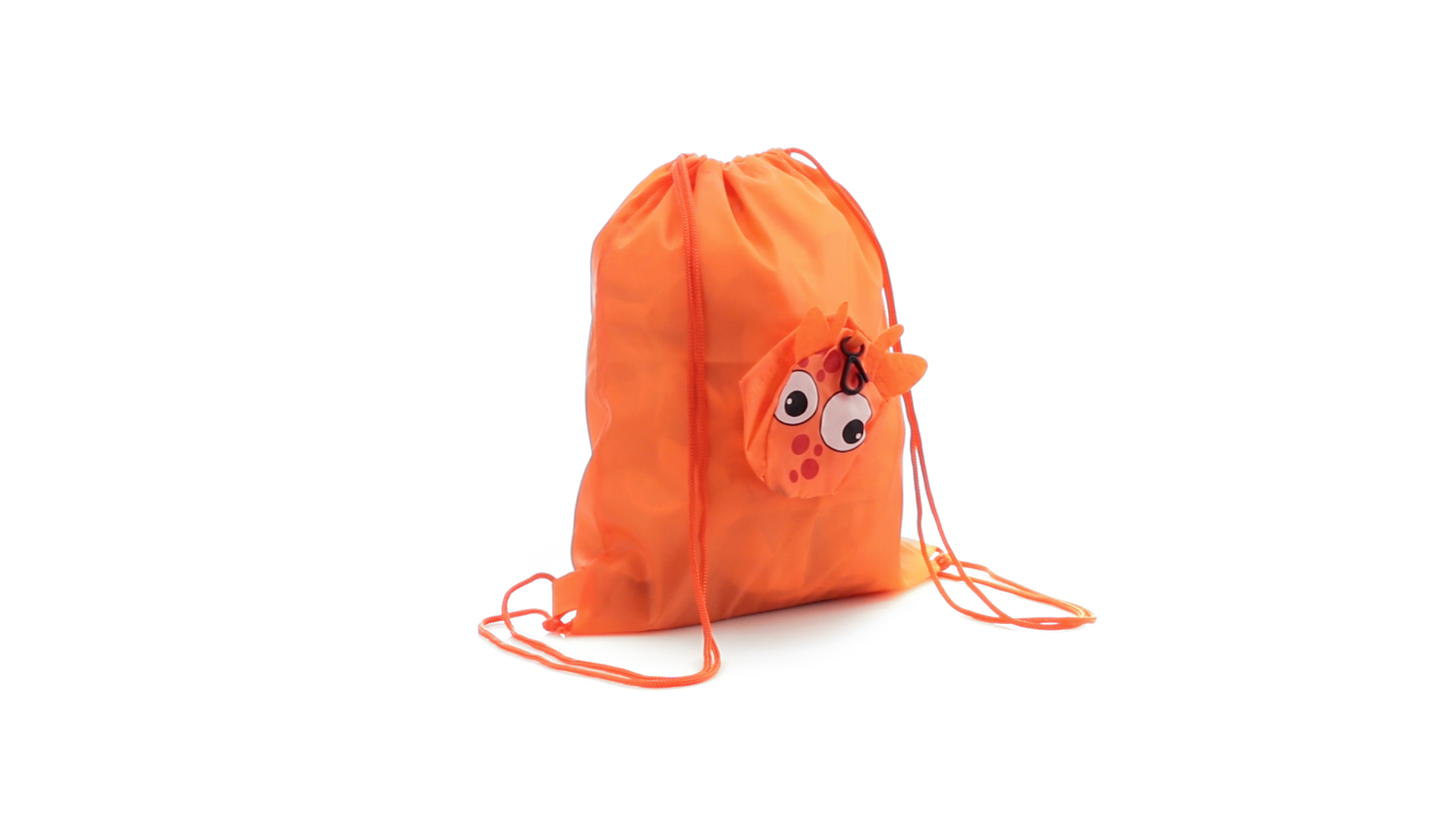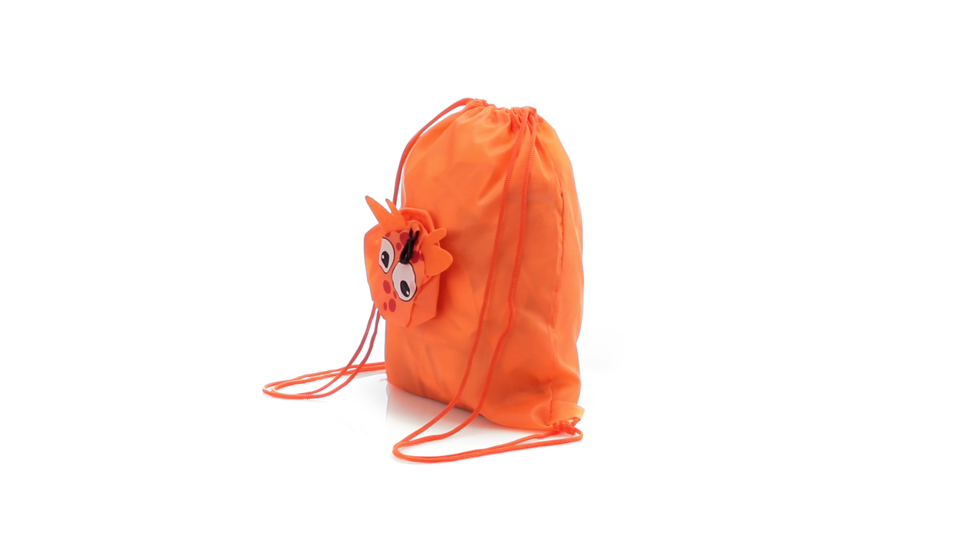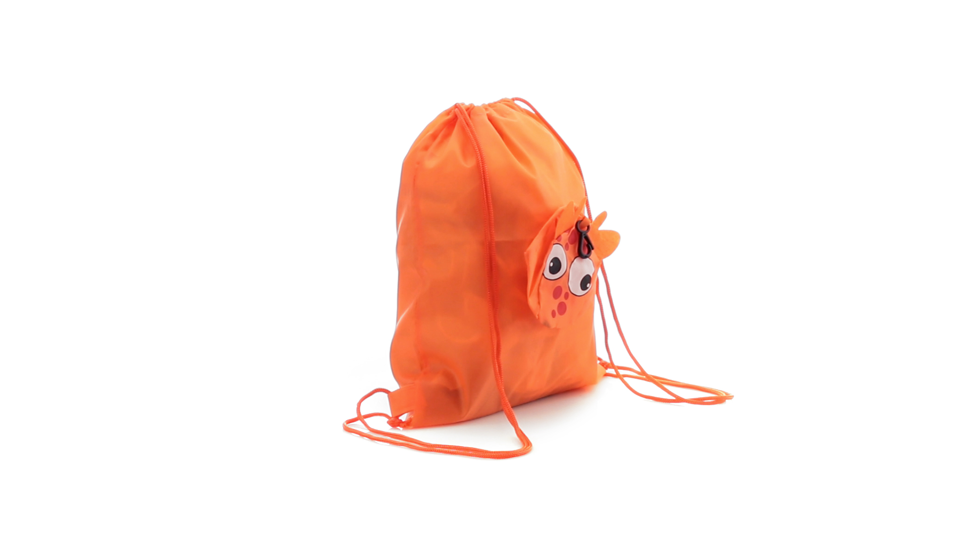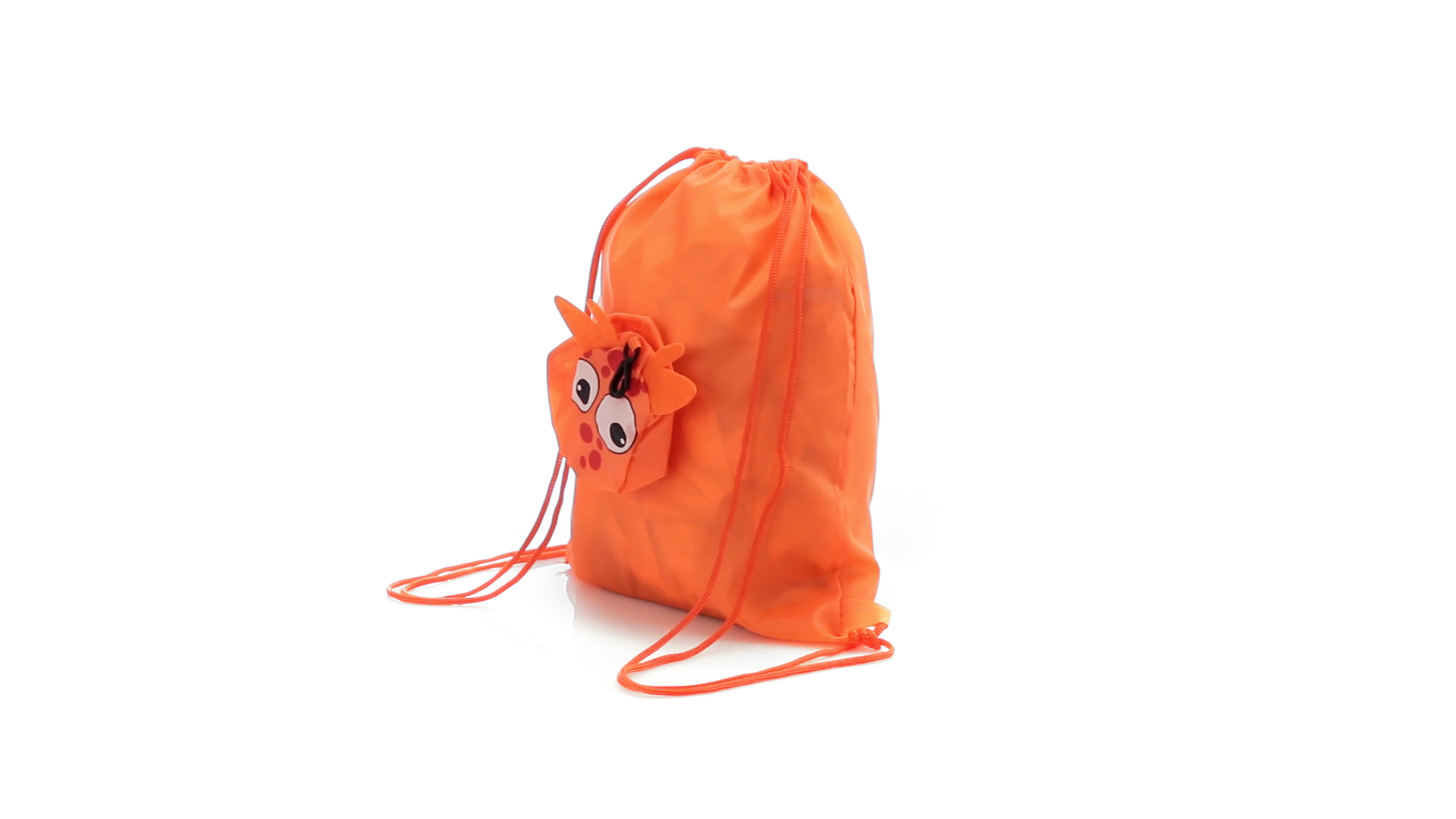 Faltbarer Rucksack mit Kordelzug aus 190T Polyester mit fröhlichem Tier-Design in verschiedenen lebendigen Farben. Mit Tragegriff, Zugbändern und farblich passenden Seitenverstärkungen. Verstaubar in integriertem Beutel in Tier-Form. mit farblich passender Trageschlaufe und Kordelstopper.
