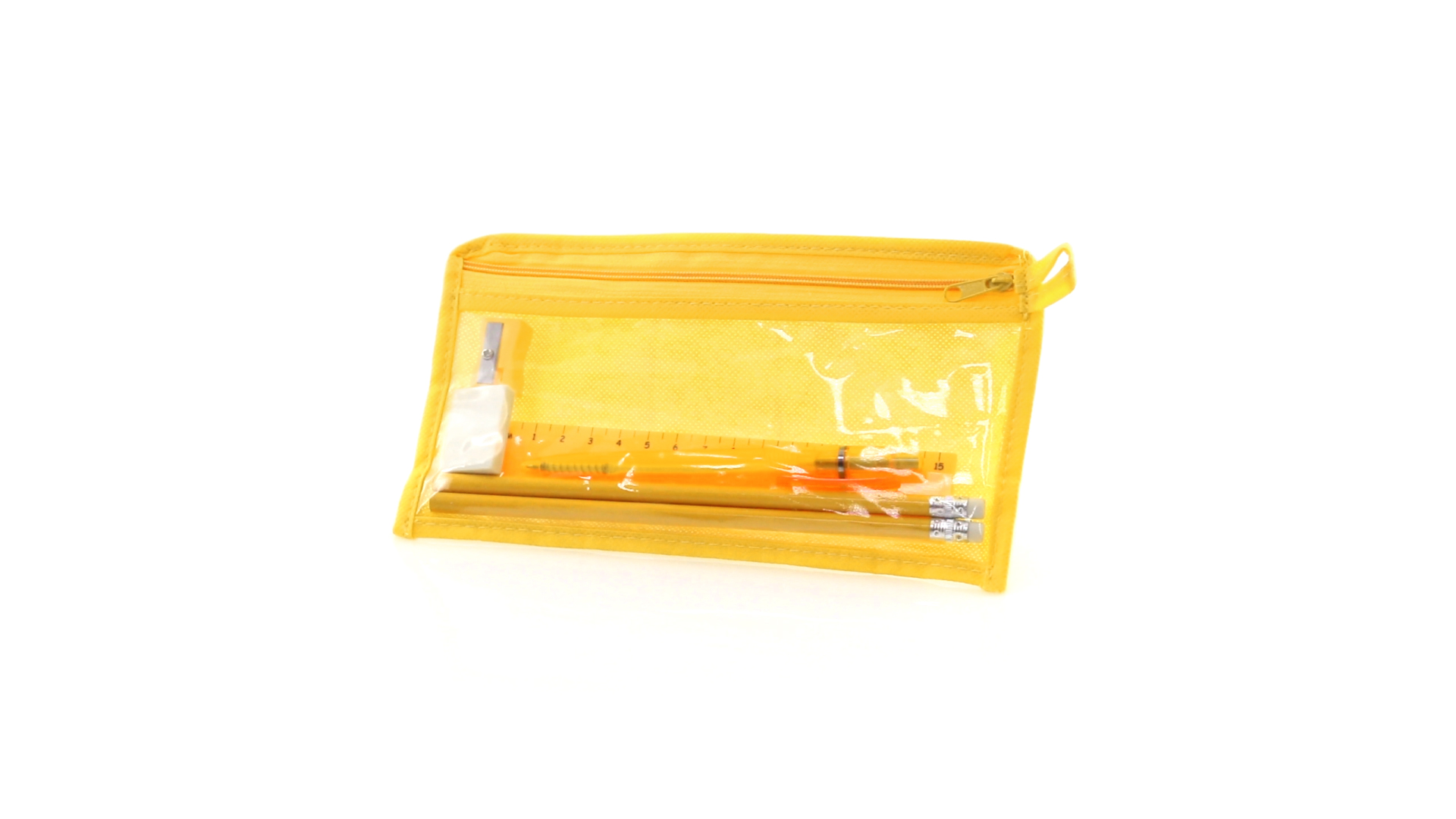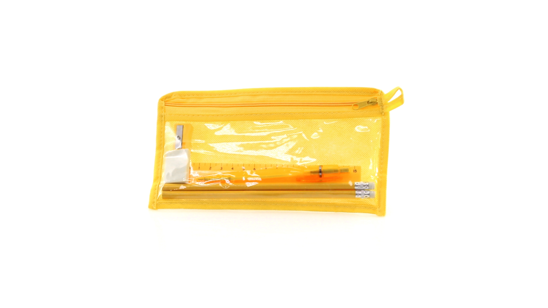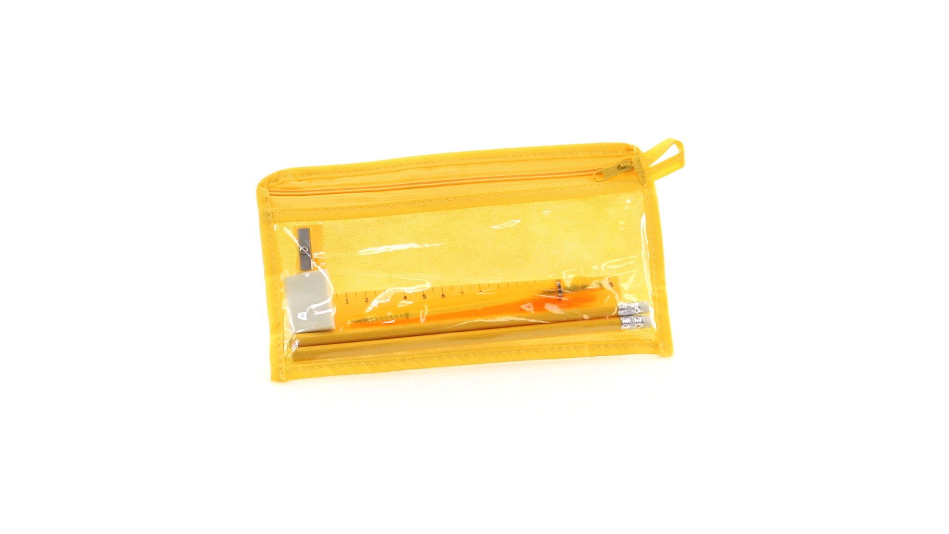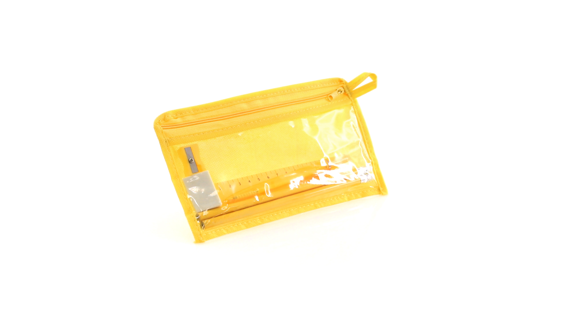 7-teiliges-Set in einem Non-Woven-Etui aus Faservlies in kräftigen Farben und mit einer transparenten PVC-Front. Enthält 2 Holz-Bleistifte mit zylindrischem Körper und integriertem Radiergummi sowie einen Kugelschreiber, Anspitzer, 15 cm langes Lineal und Radiergummi. Mit bequemem und farblich passendem Tragegriff.