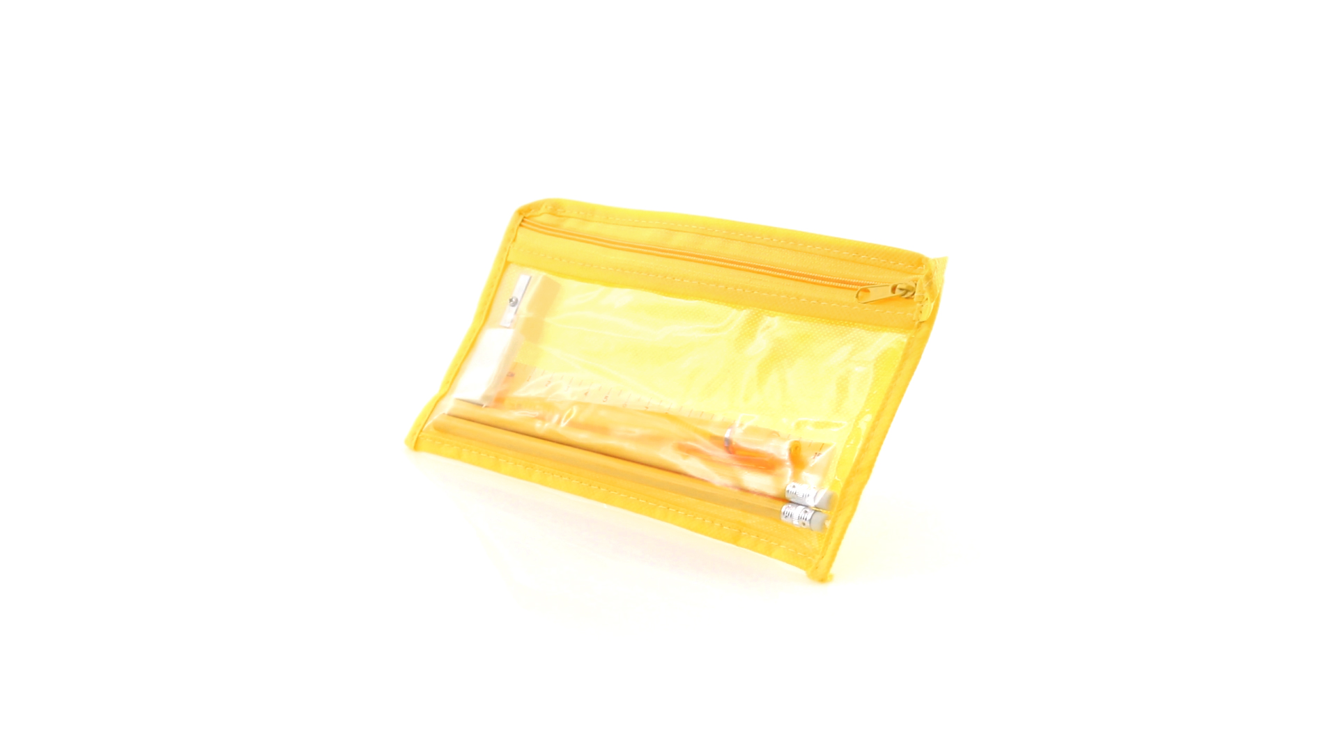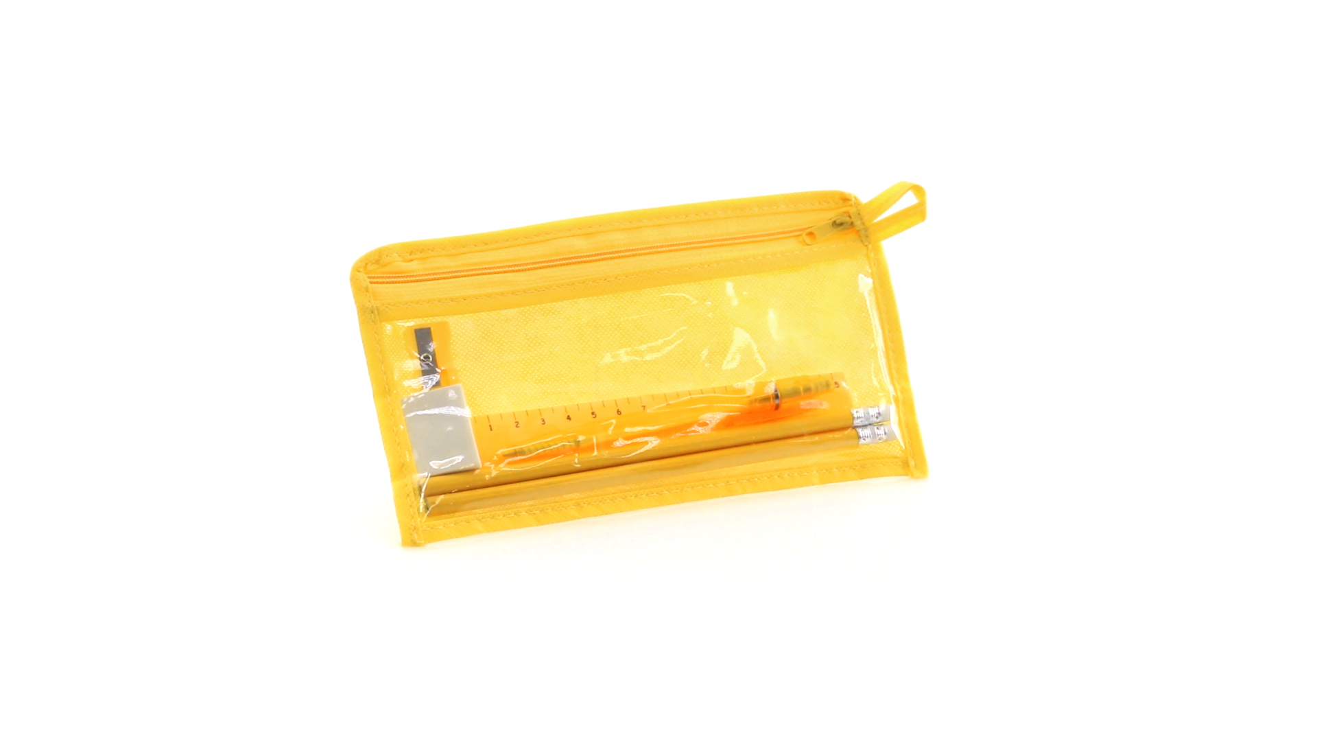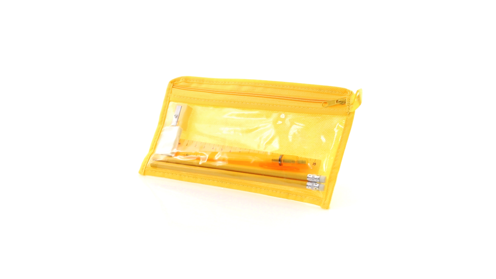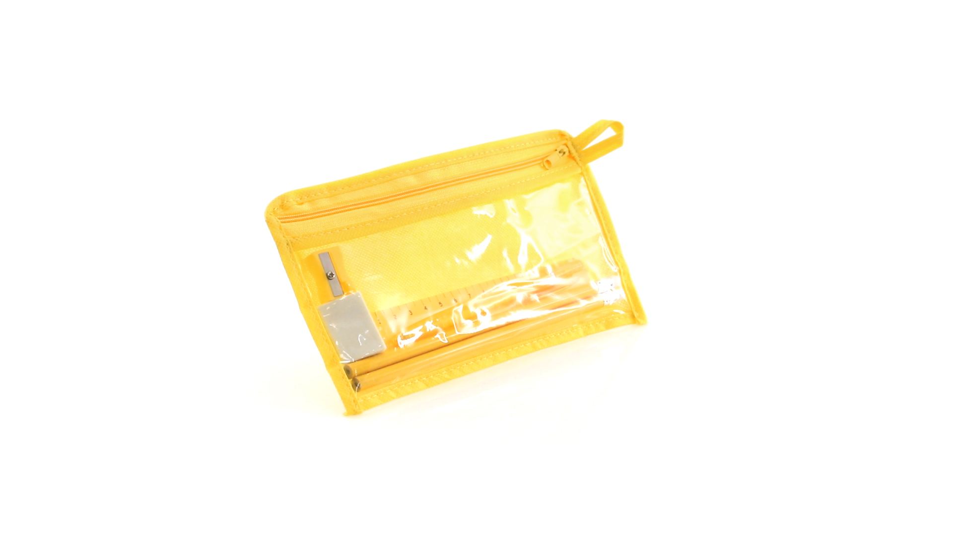 7-teiliges-Set in einem Non-Woven-Etui aus Faservlies in kräftigen Farben und mit einer transparenten PVC-Front. Enthält 2 Holz-Bleistifte mit zylindrischem Körper und integriertem Radiergummi sowie einen Kugelschreiber, Anspitzer, 15 cm langes Lineal und Radiergummi. Mit bequemem und farblich passendem Tragegriff.
