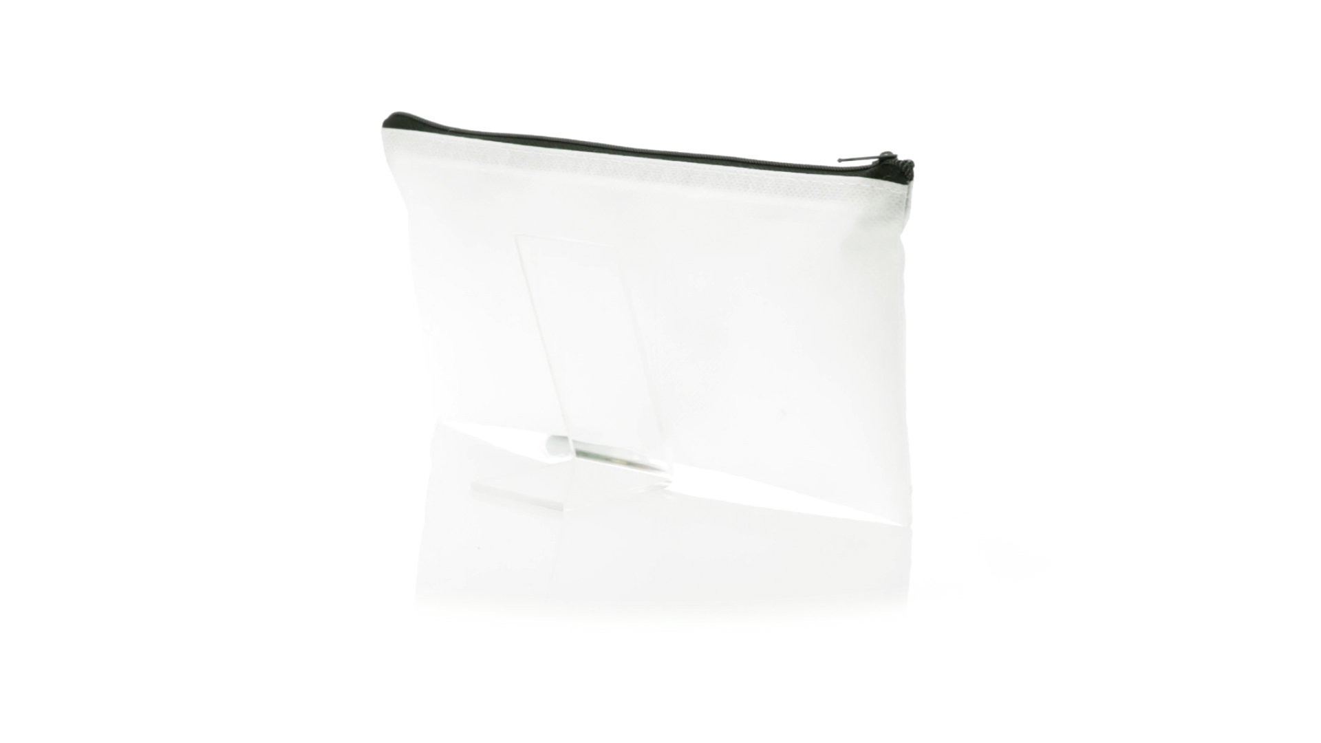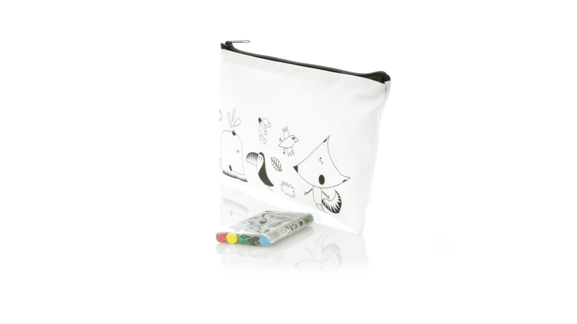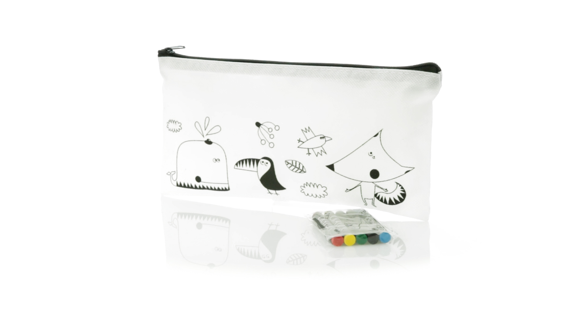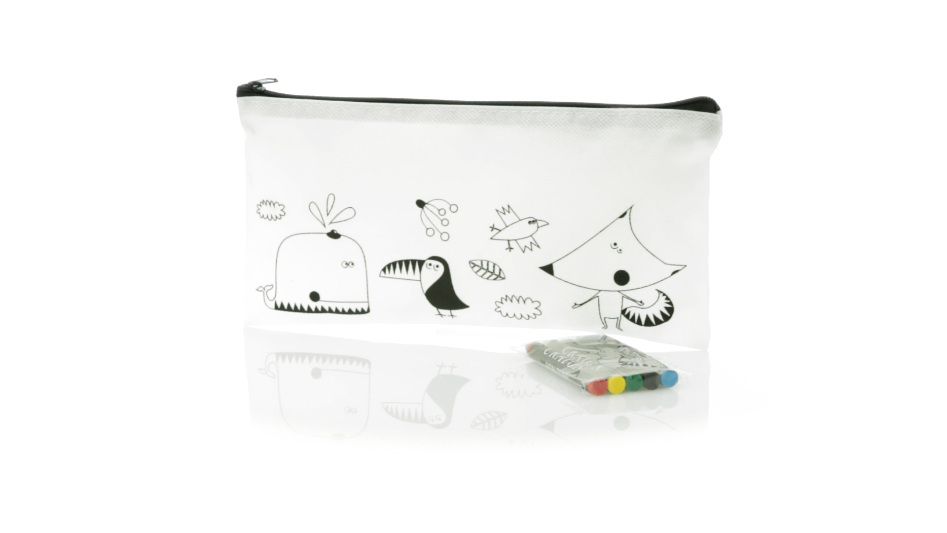 Weisses Non-Woven-Etui aus Faservlies. Speziell entwickelt für das Bemalen mit Wachsmalstiften. Enthält 5 zylinderförmige Wachsmalstifte in verschiedenen Farben. Mit Reissverschluss in Schwarz.