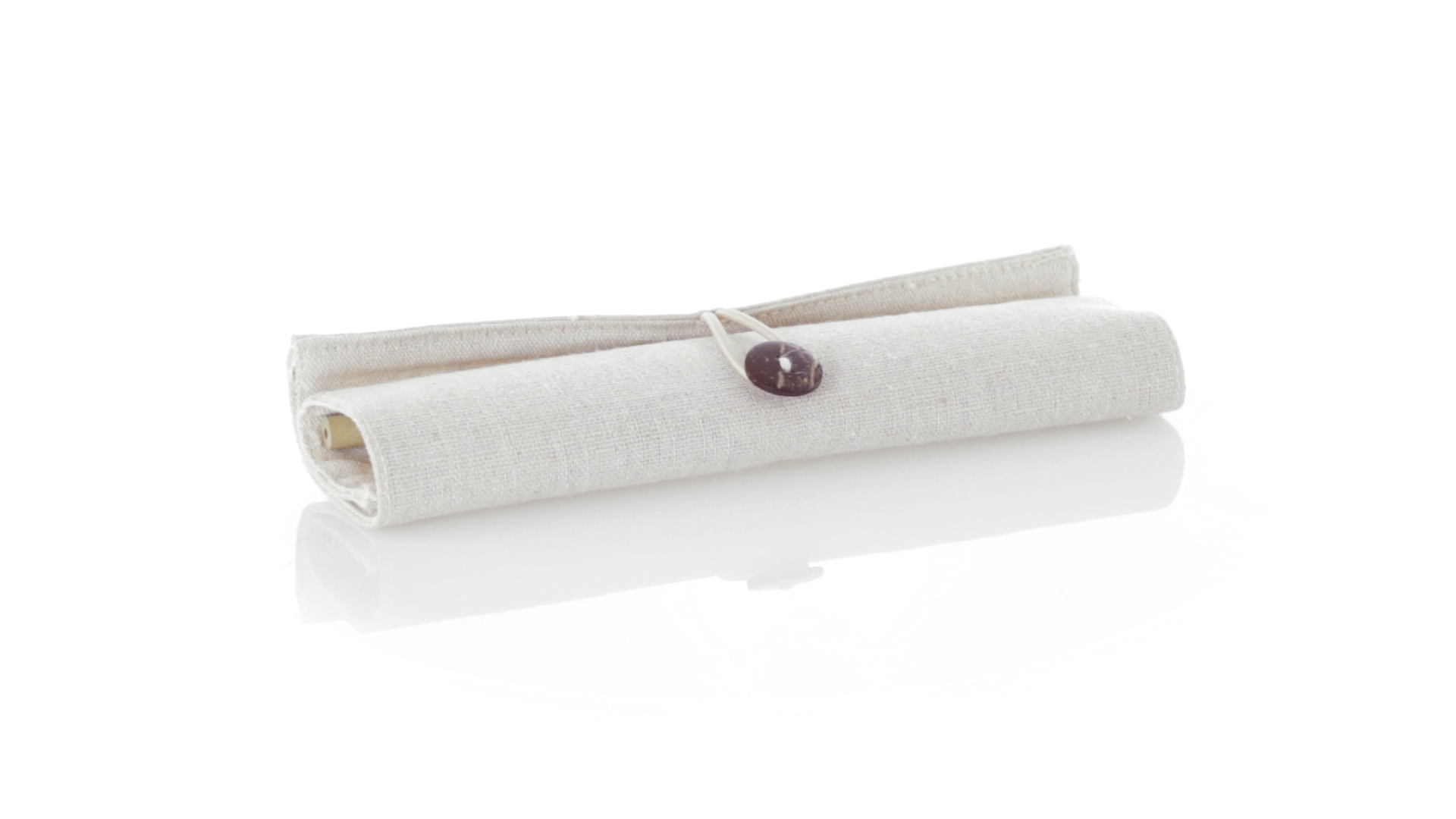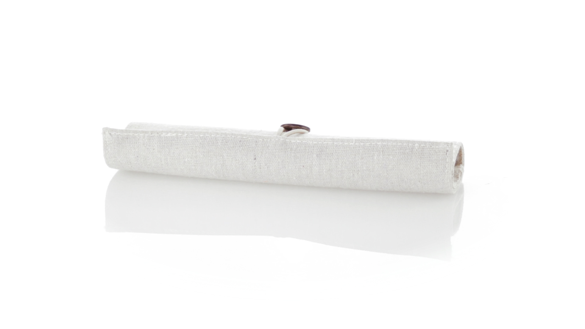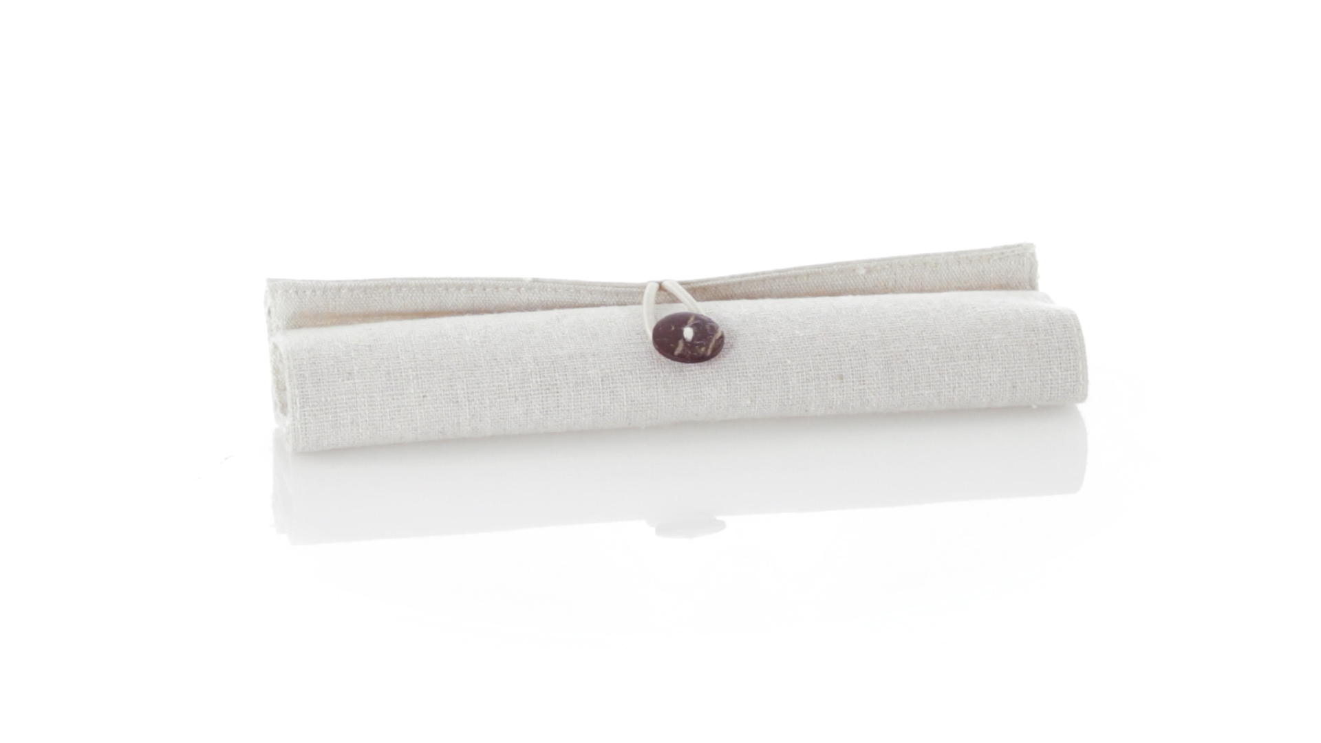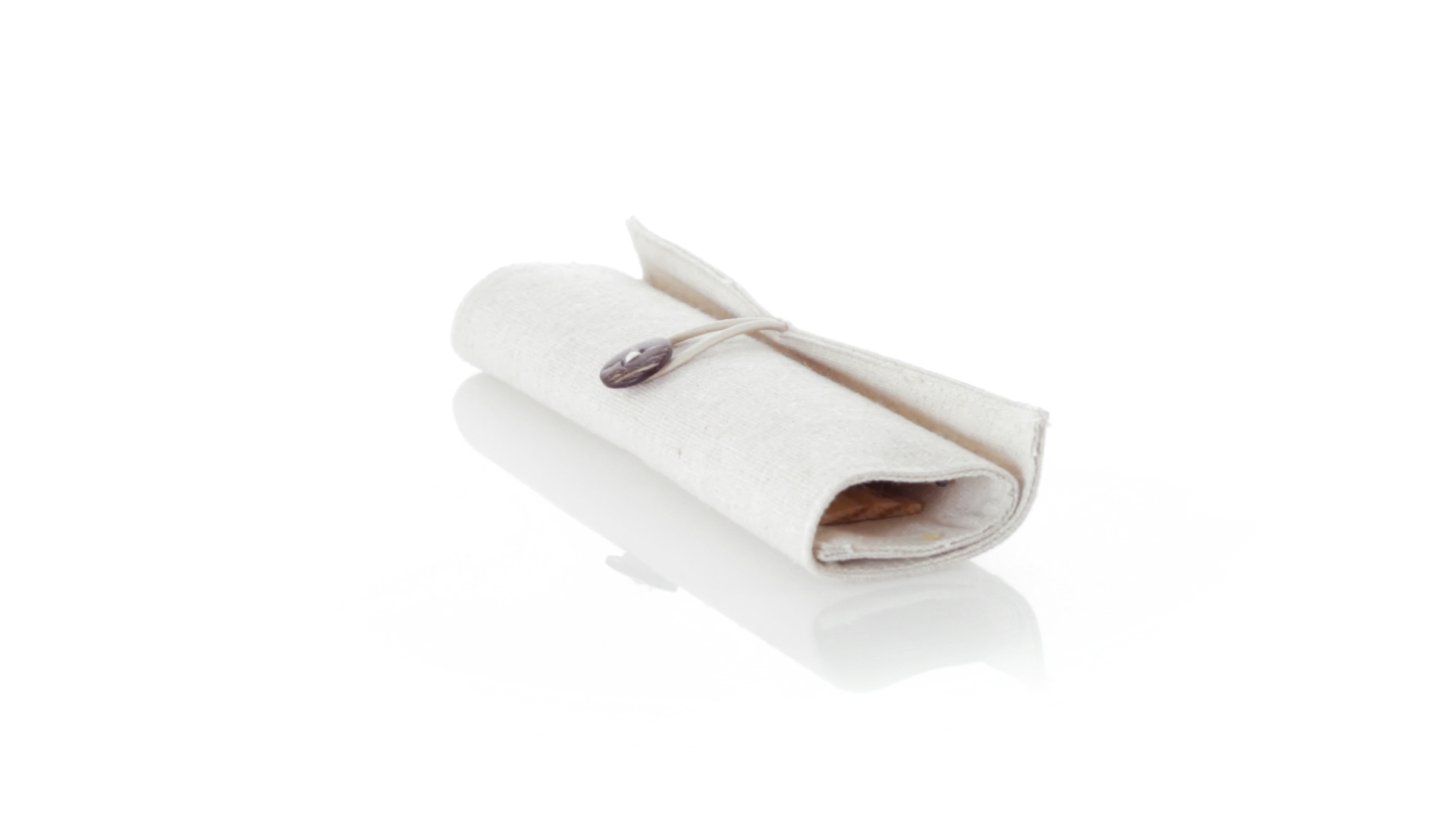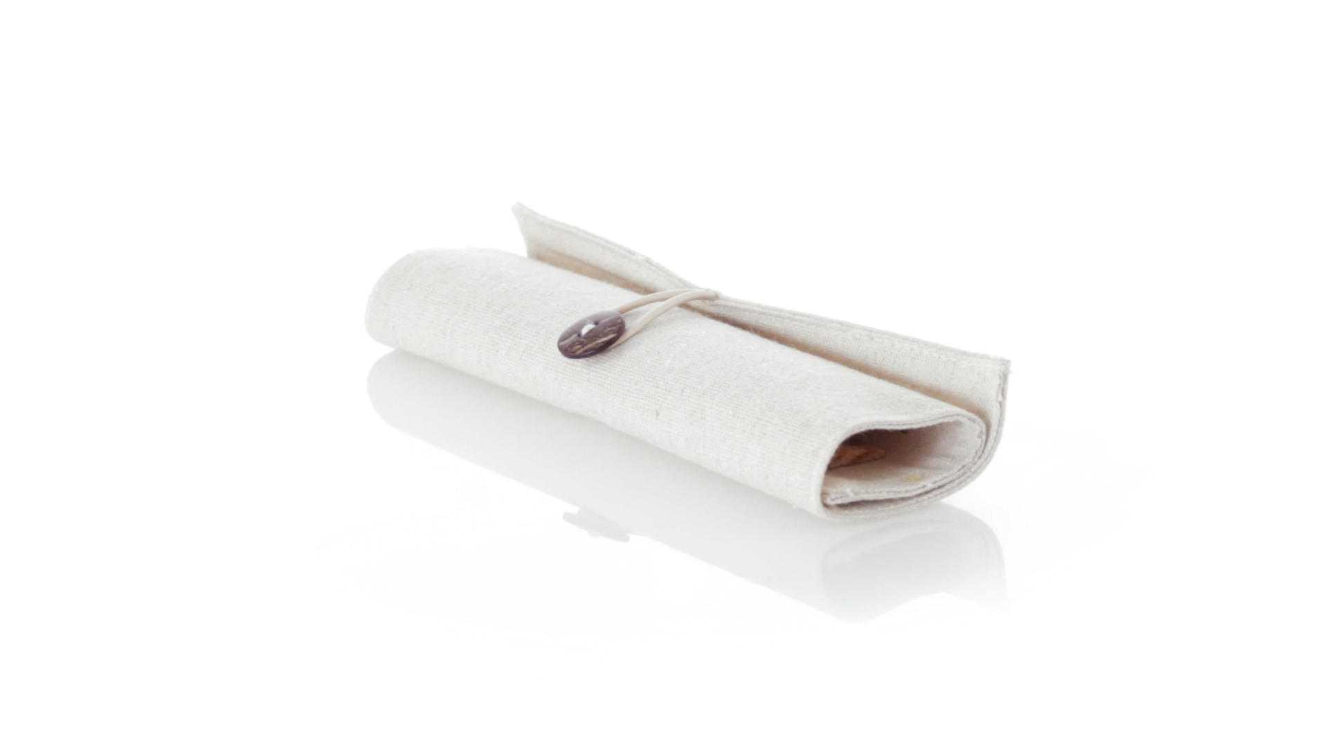Originelles Etui der Linie Nature aus Baumwolle und Jutefasern. Mit elegantem Knopfverschluss. Enthält Zubehör in Naturfarbe: Radiergummi, Anspitzer, Kugelschreiber aus Recyclingkarton, Holzbleistift und Holzlineal.
