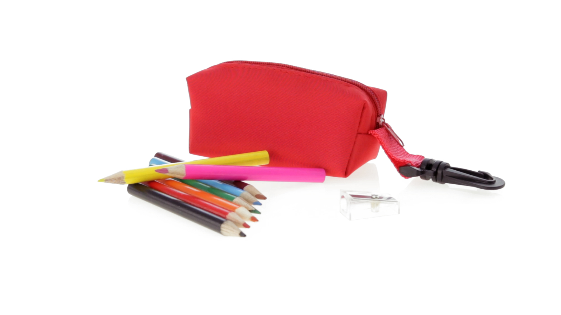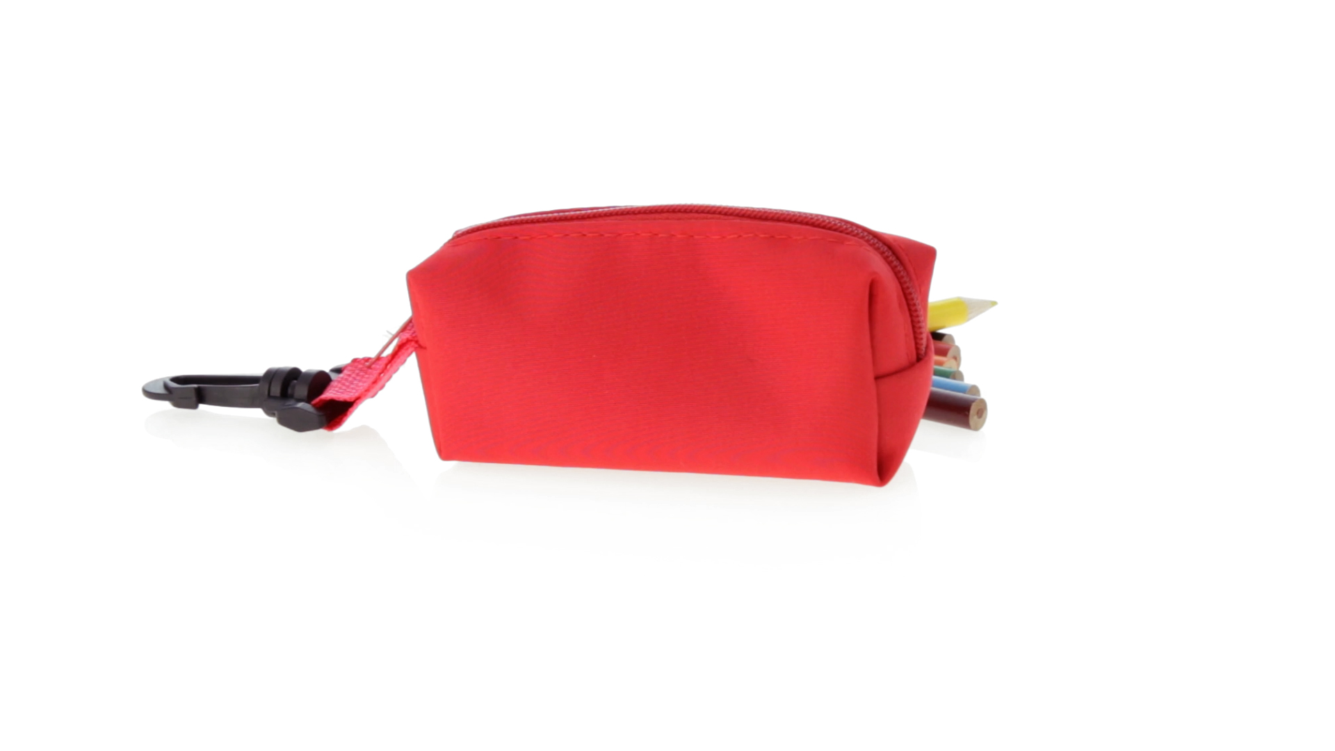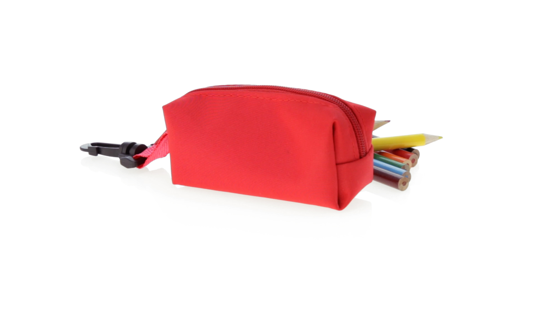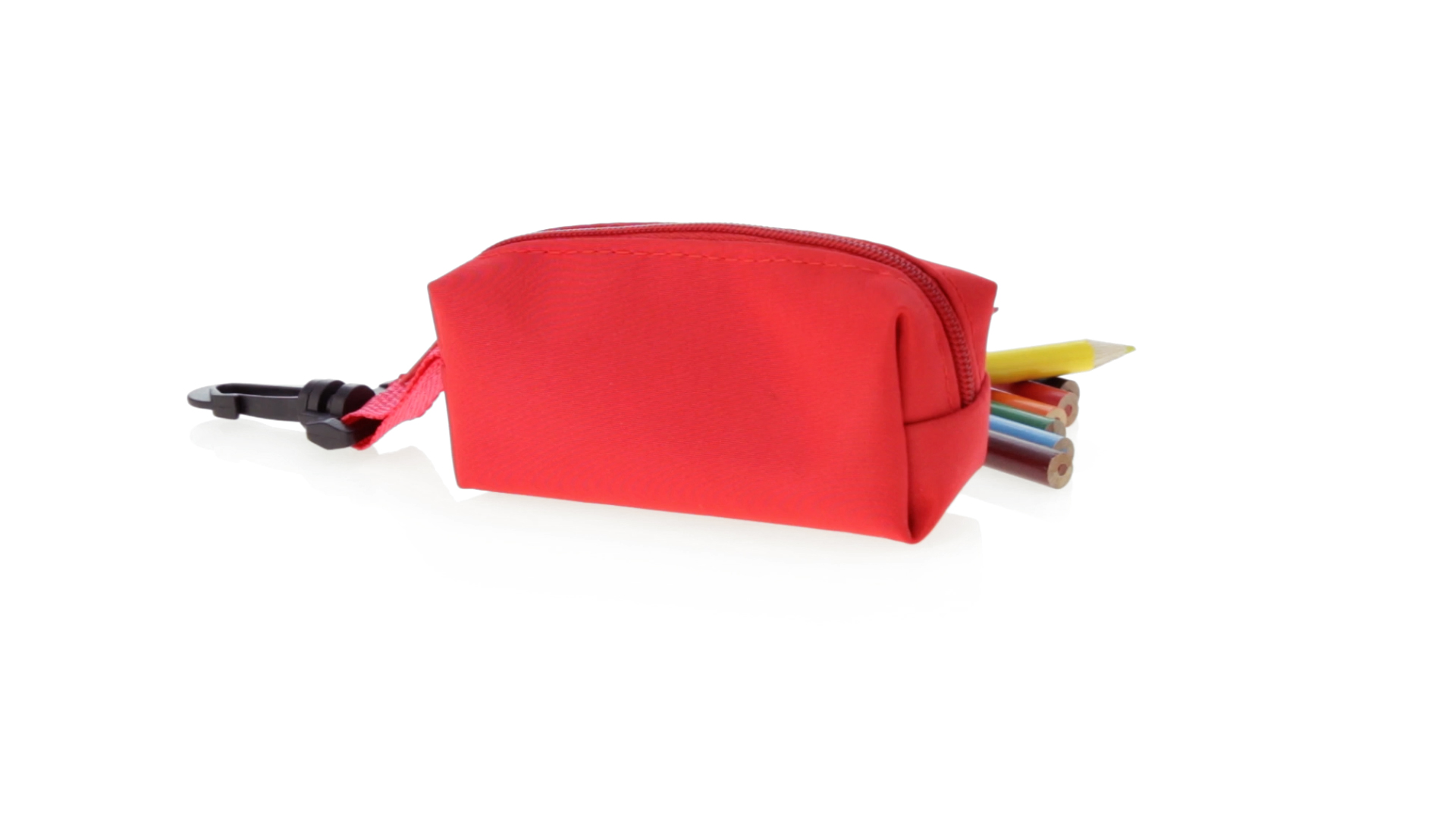Etui mit farblich passendem Reissverschluss aus 420D Polyester in verschiedenen Farben. Mit drehbarem Karabiner. Enthält Anspitzer und 8 Buntstifte mit rundem Schaft in glänzender Ausführung und einer Vielzahl von Farben.