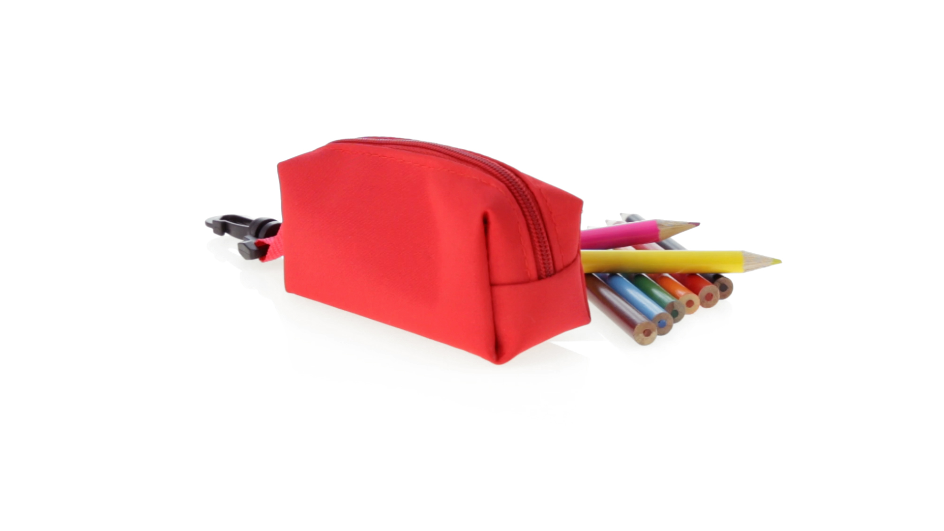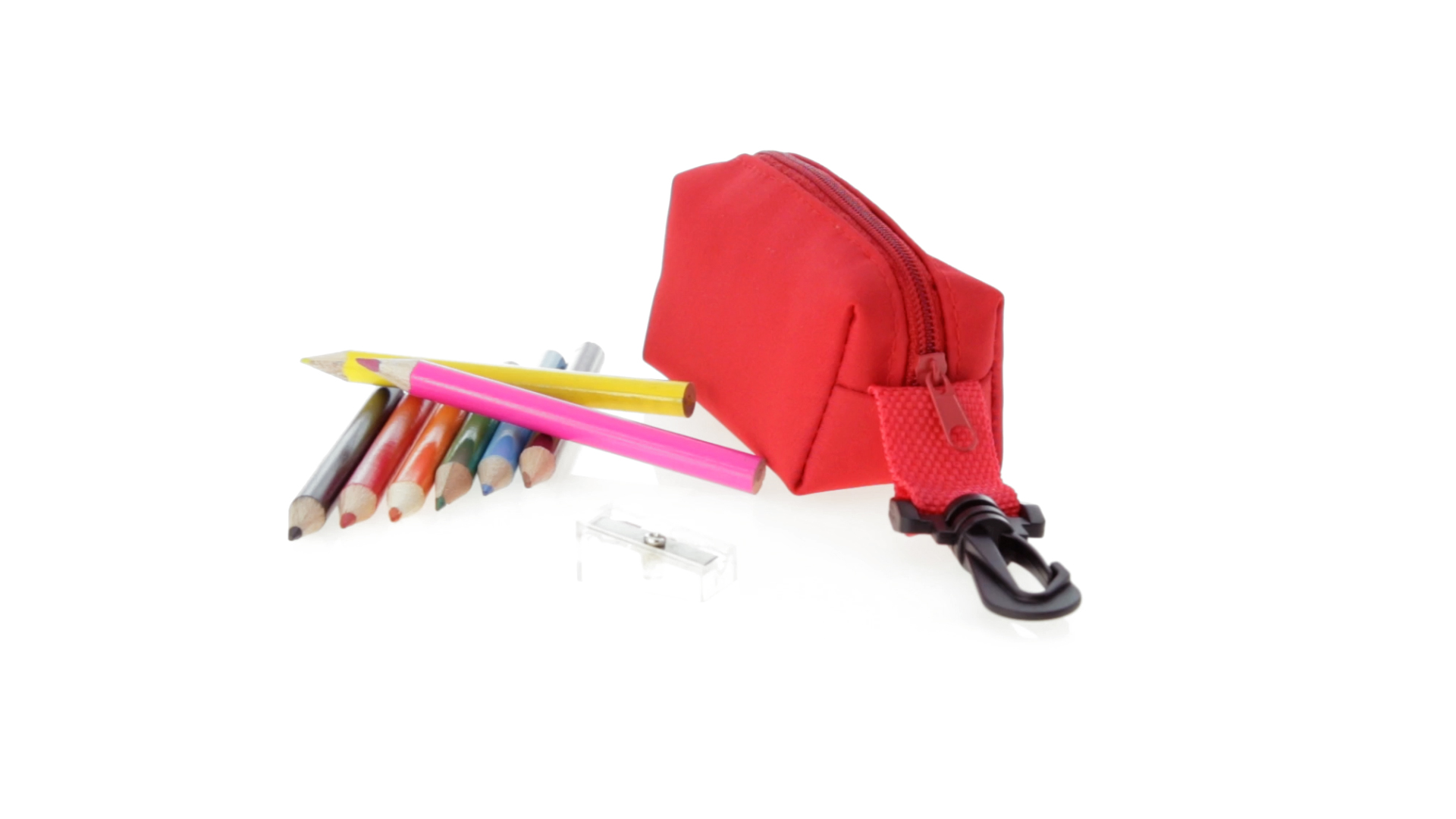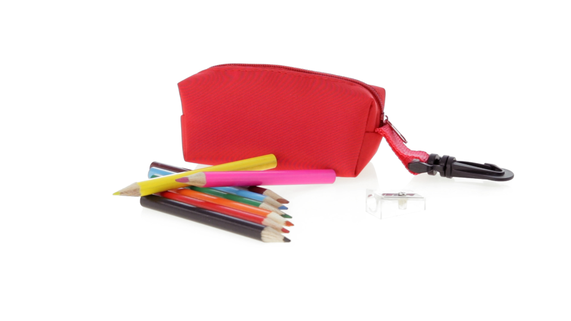 Etui mit farblich passendem Reissverschluss aus 420D Polyester in verschiedenen Farben. Mit drehbarem Karabiner. Enthält Anspitzer und 8 Buntstifte mit rundem Schaft in glänzender Ausführung und einer Vielzahl von Farben.