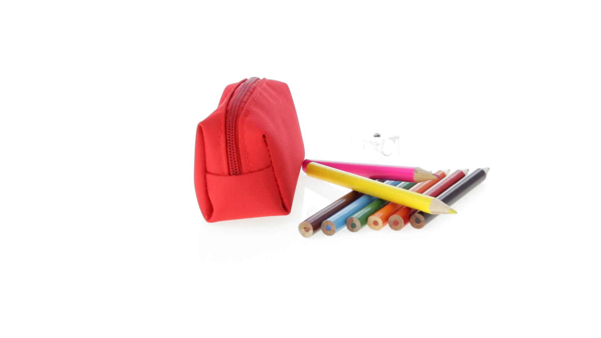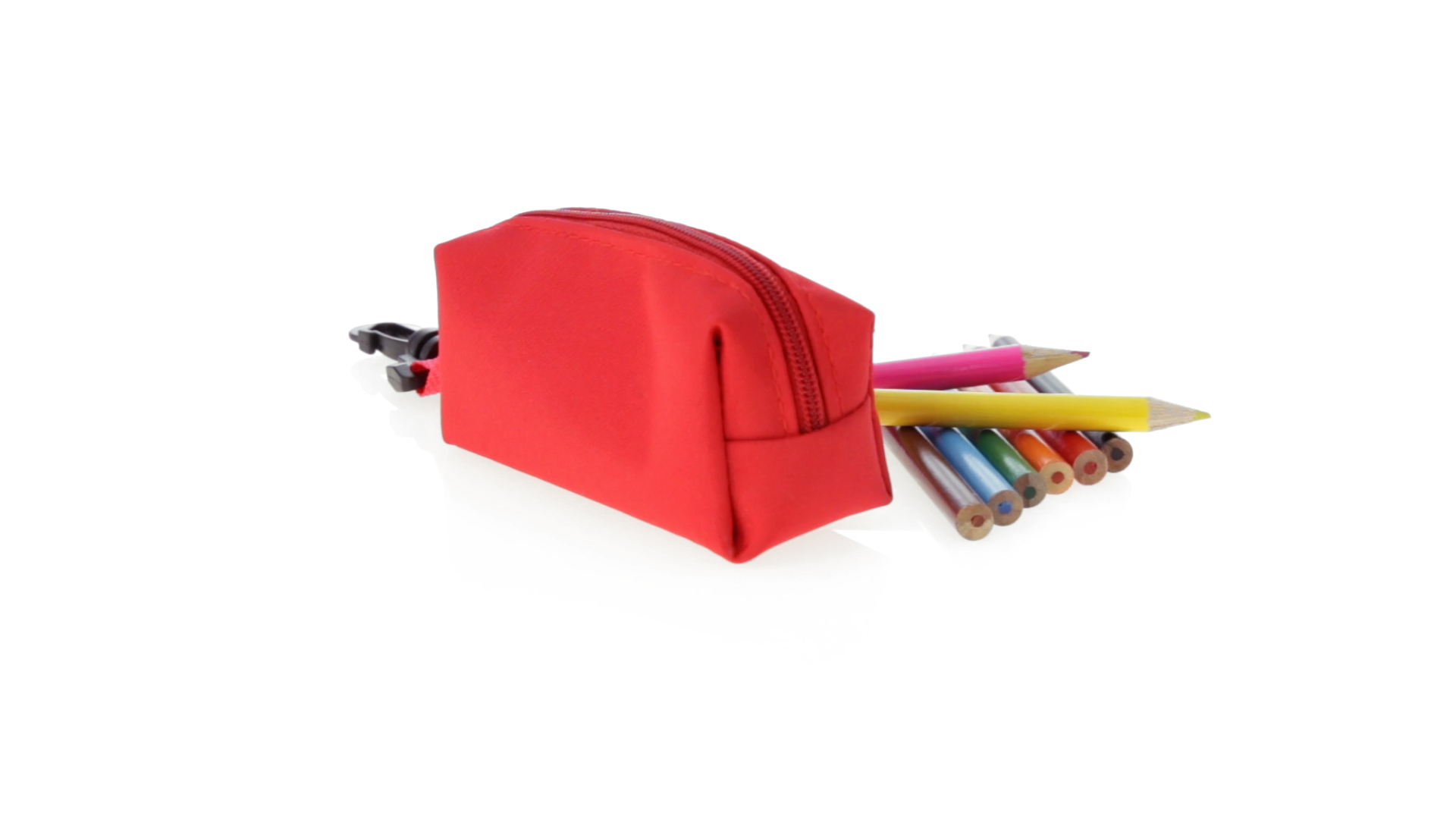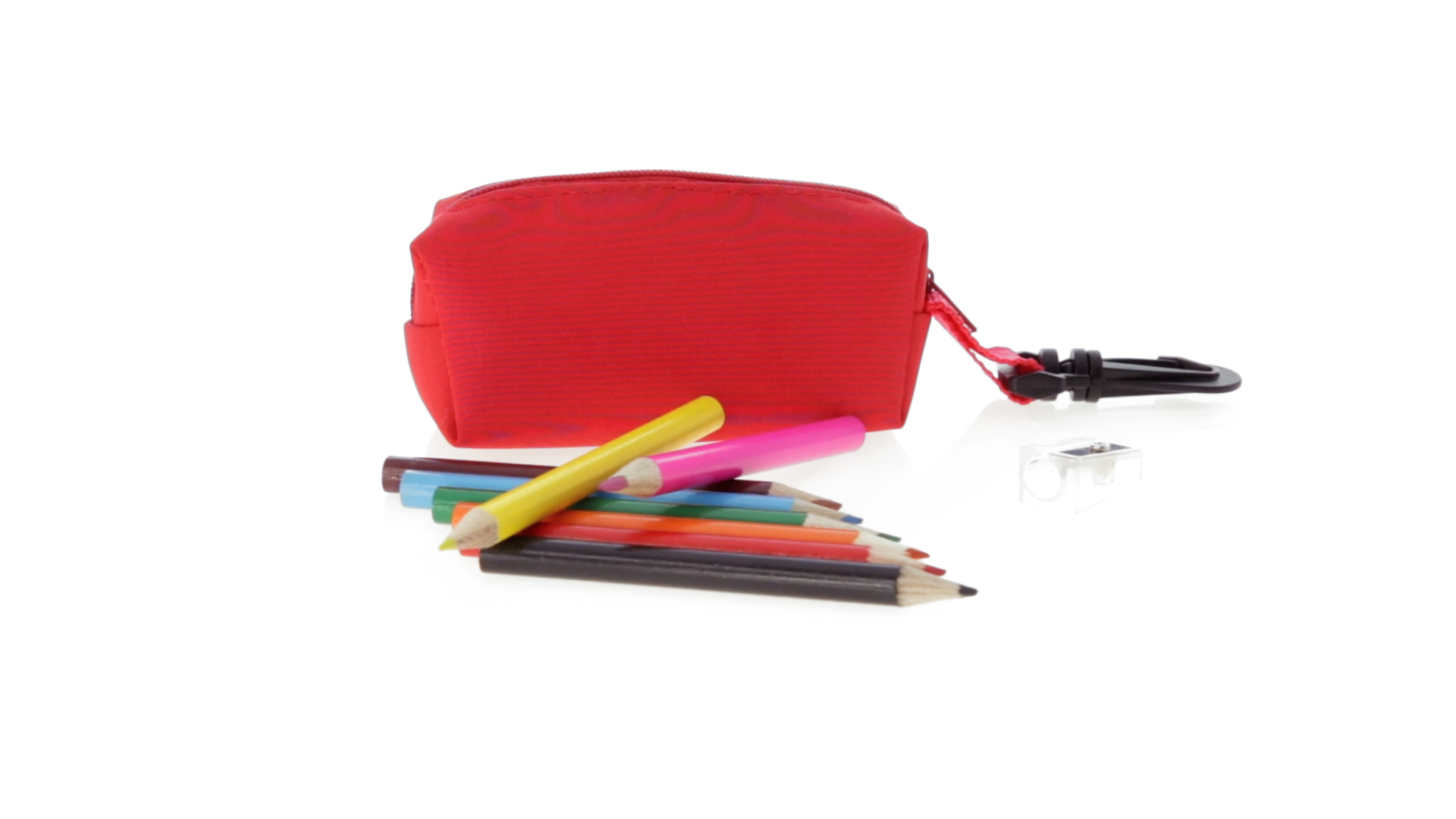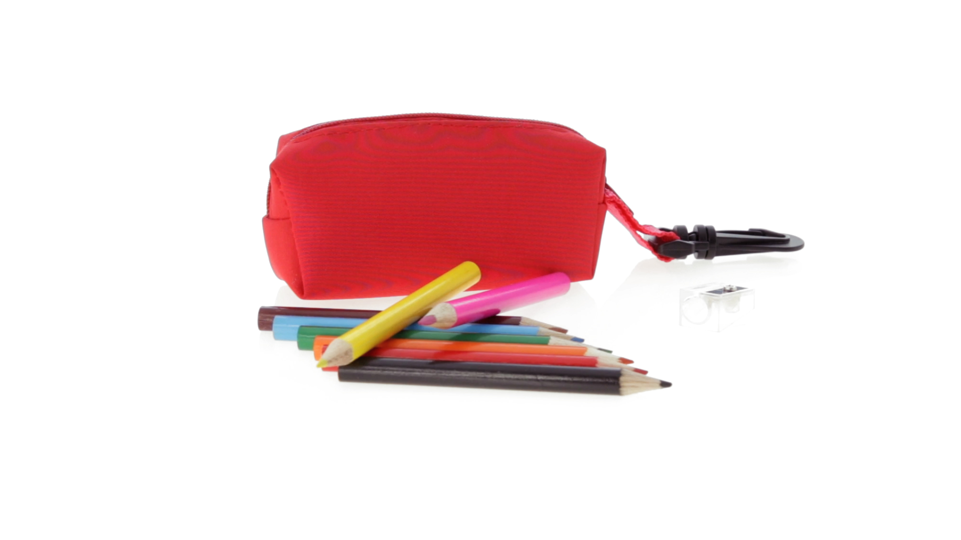 Etui mit farblich passendem Reissverschluss aus 420D Polyester in verschiedenen Farben. Mit drehbarem Karabiner. Enthält Anspitzer und 8 Buntstifte mit rundem Schaft in glänzender Ausführung und einer Vielzahl von Farben.