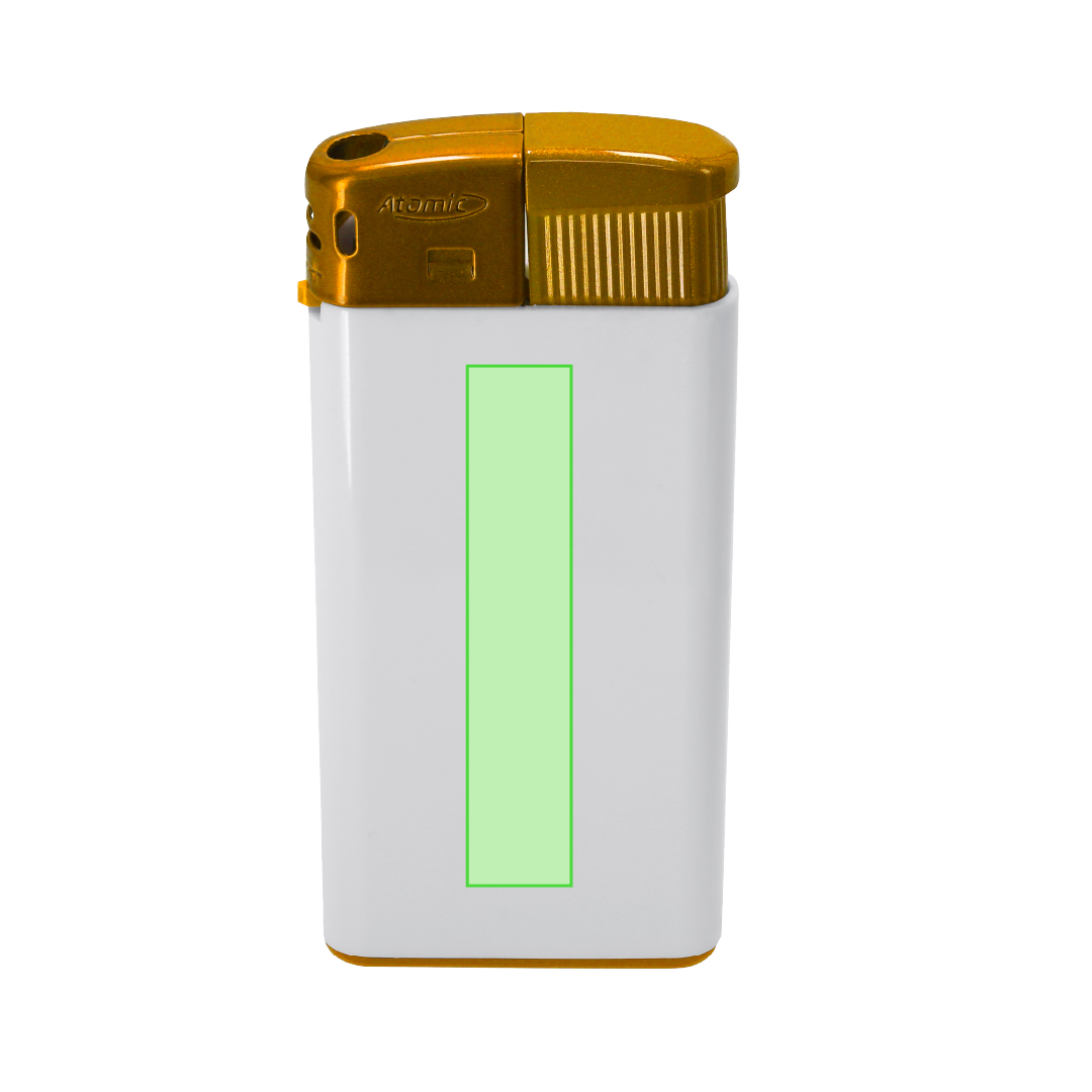 Gasanzünder mit elektrischem Mechanismus aus ABS. Mit Kinderschutz, wiederaufladbarem, Flammenregler und erhältlich in einer Vielzahl von Einfarbfarben, Korpus in glänzendem Weiss. Diente in Kisten mit 25 Einheiten und 5 Farben.