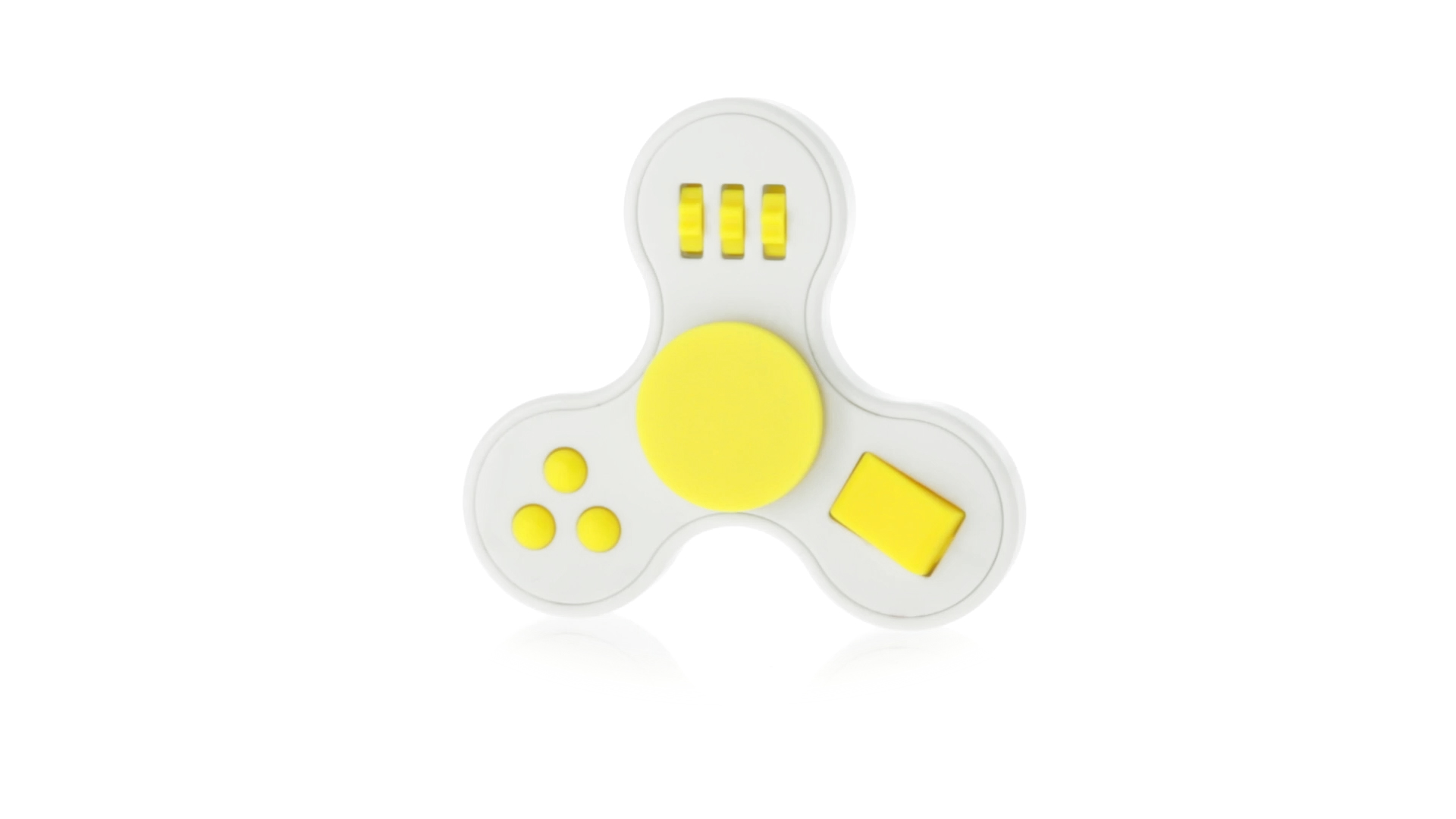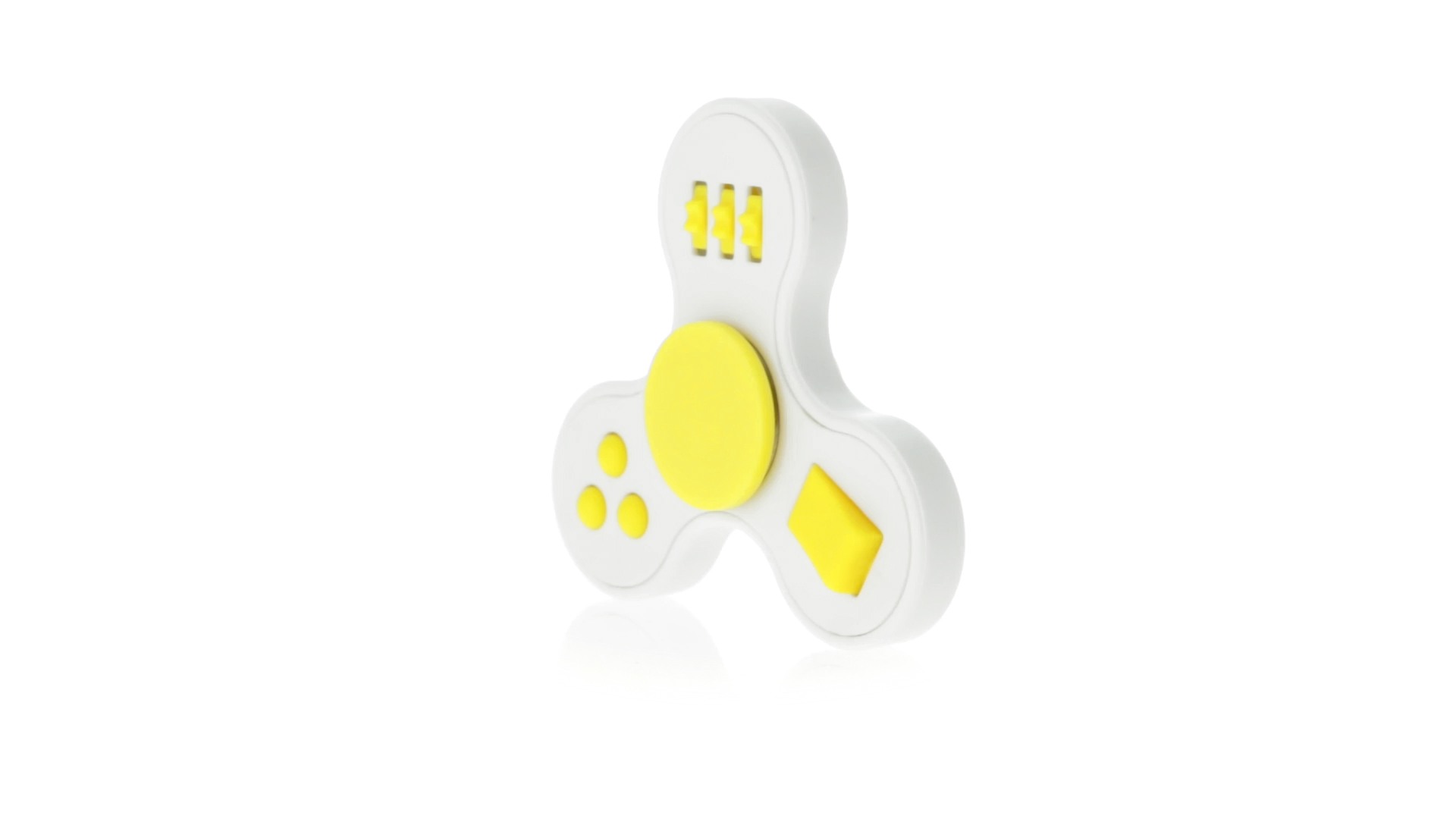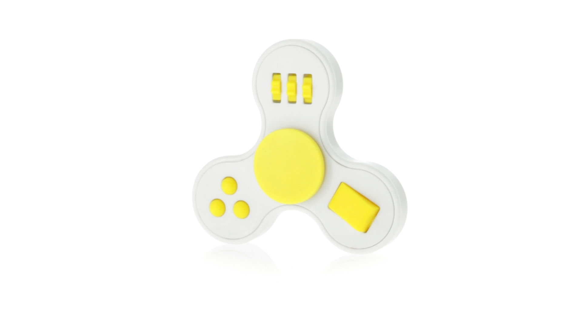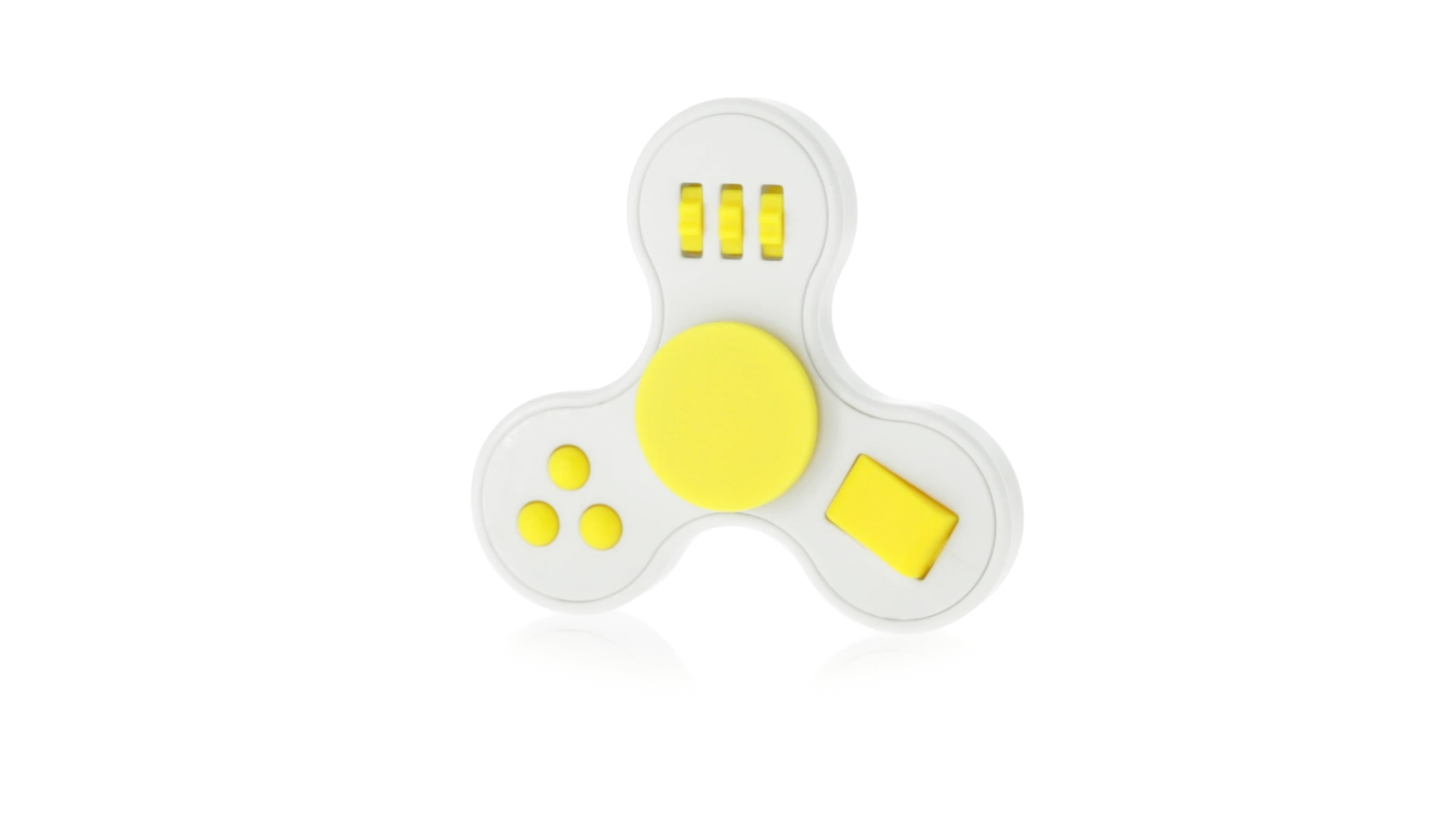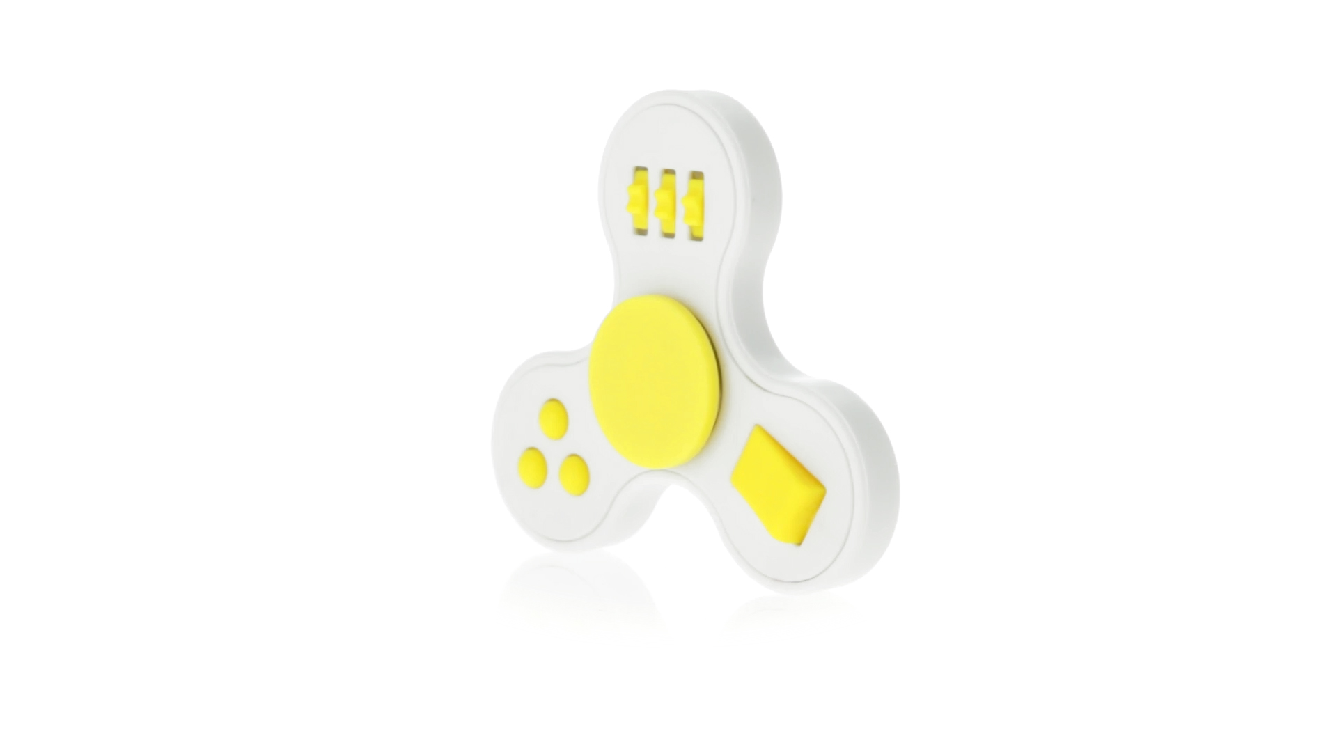 Fidget-Spinner mit vielen verschiedenen Knöpfen zur Entspannung. Gehäuse in Weiss mit Kontrastdetails in verschiedenen kräftigen Farben.