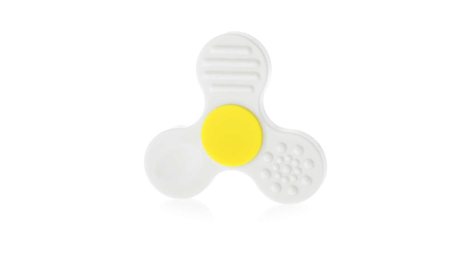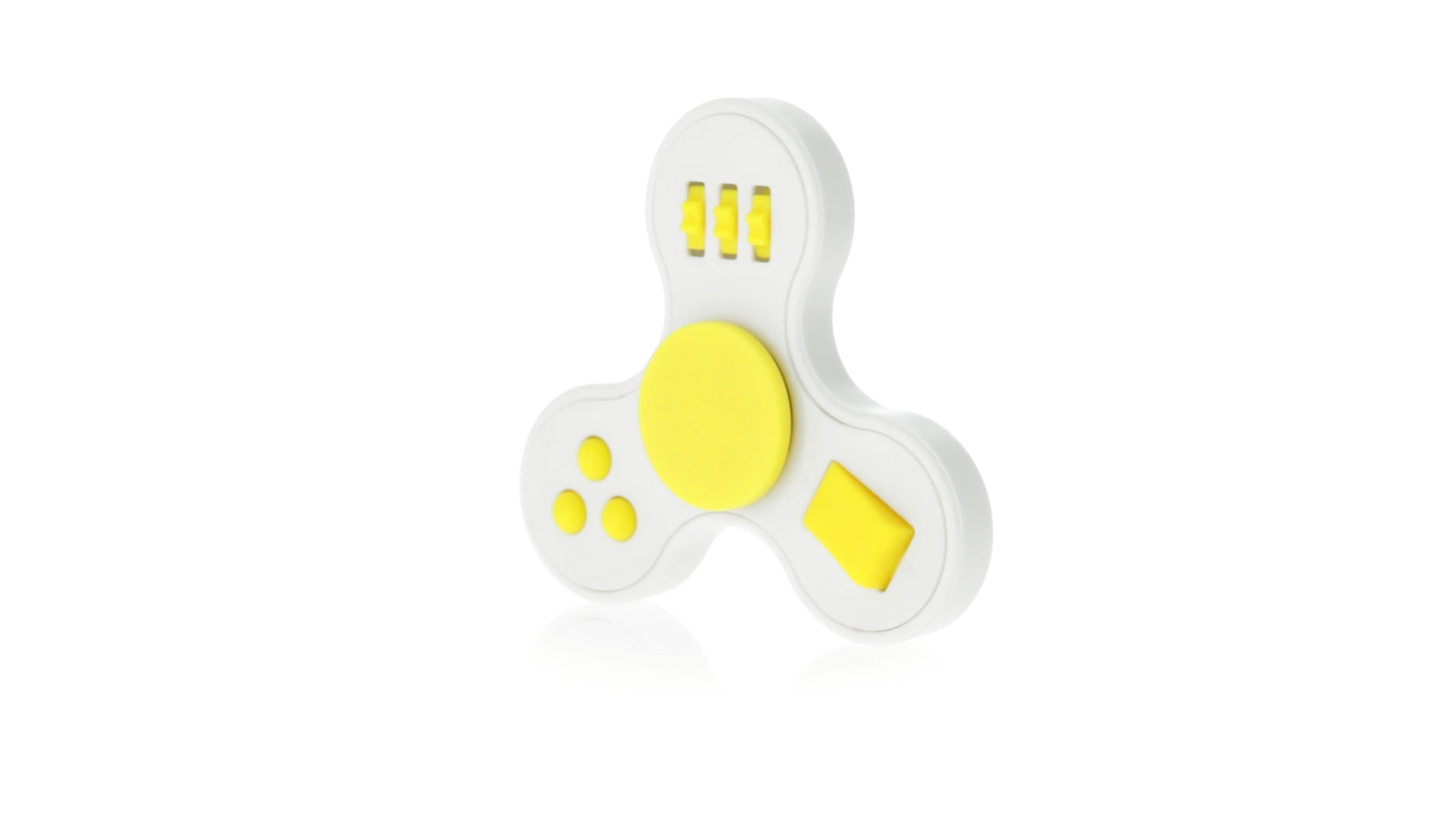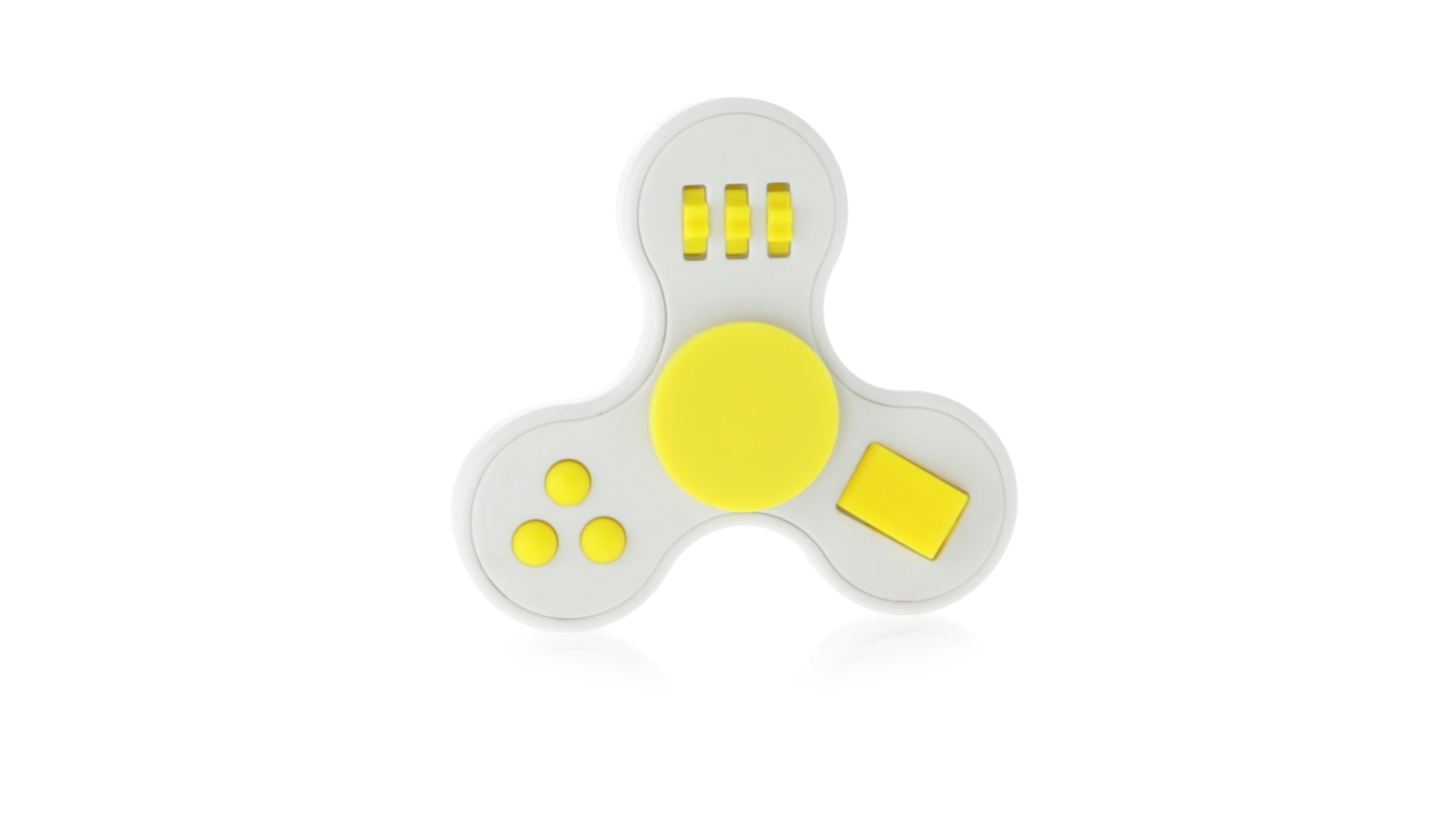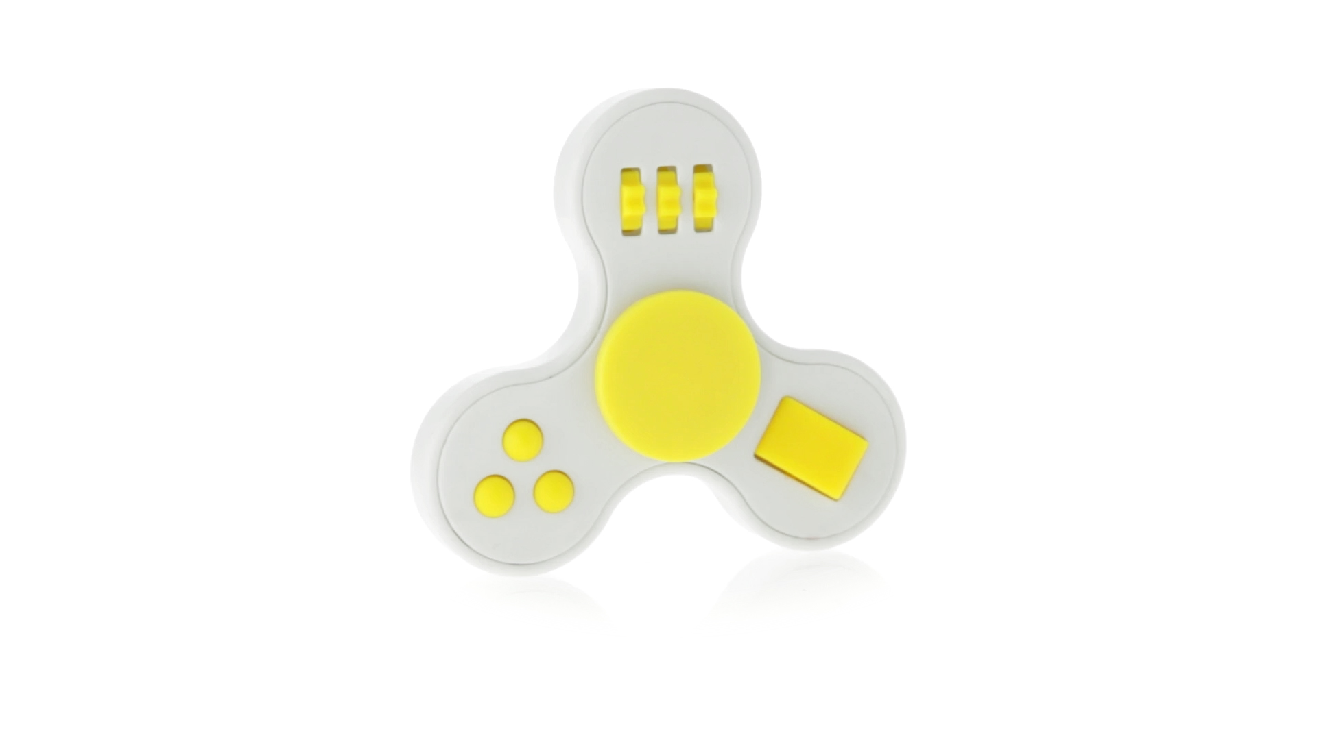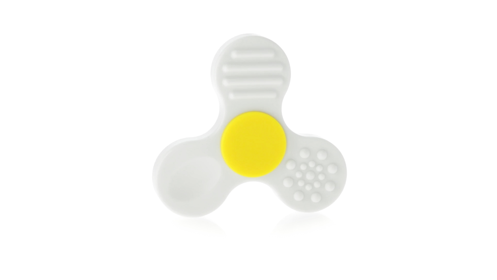 Fidget-Spinner mit vielen verschiedenen Knöpfen zur Entspannung. Gehäuse in Weiss mit Kontrastdetails in verschiedenen kräftigen Farben.