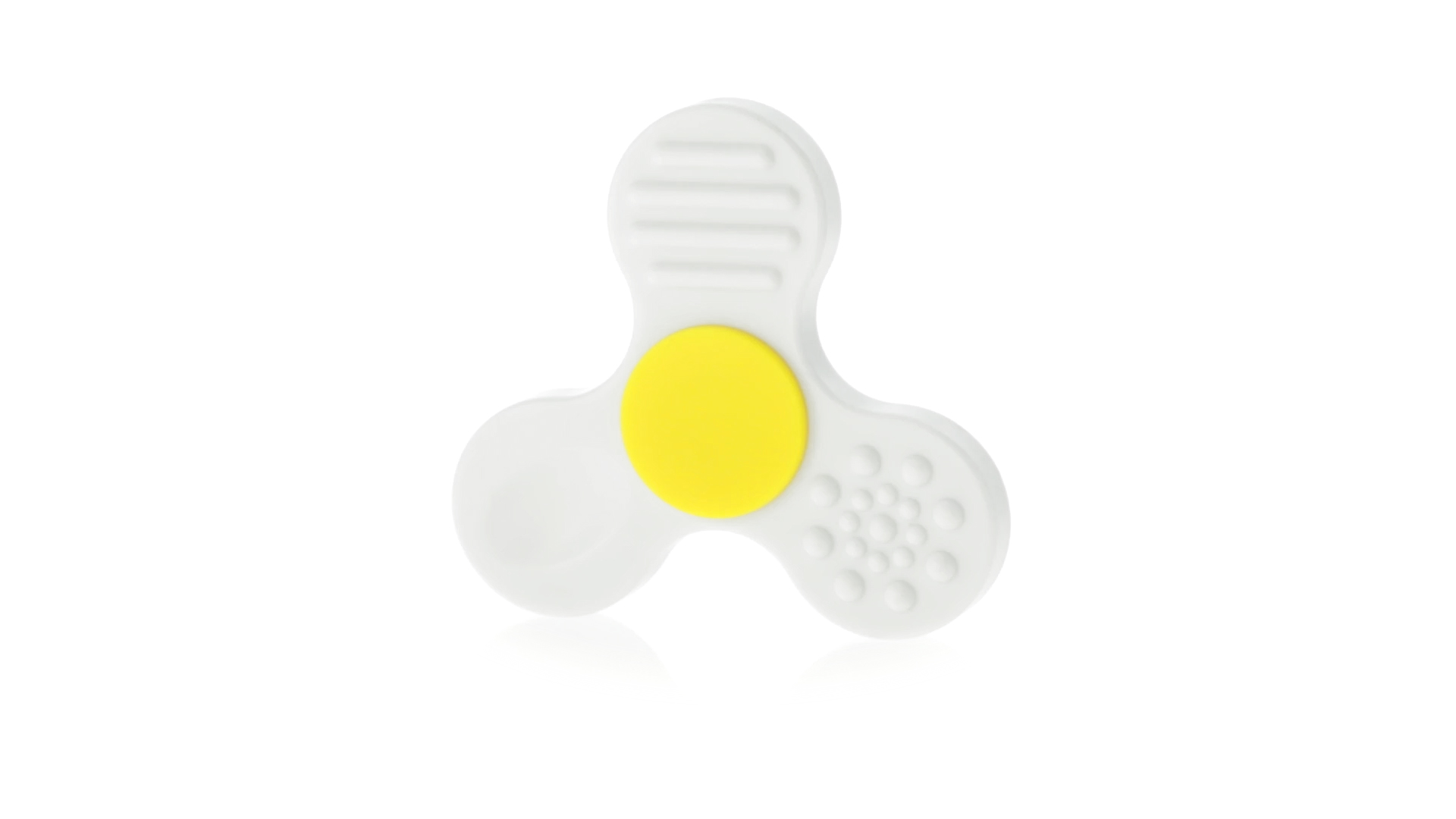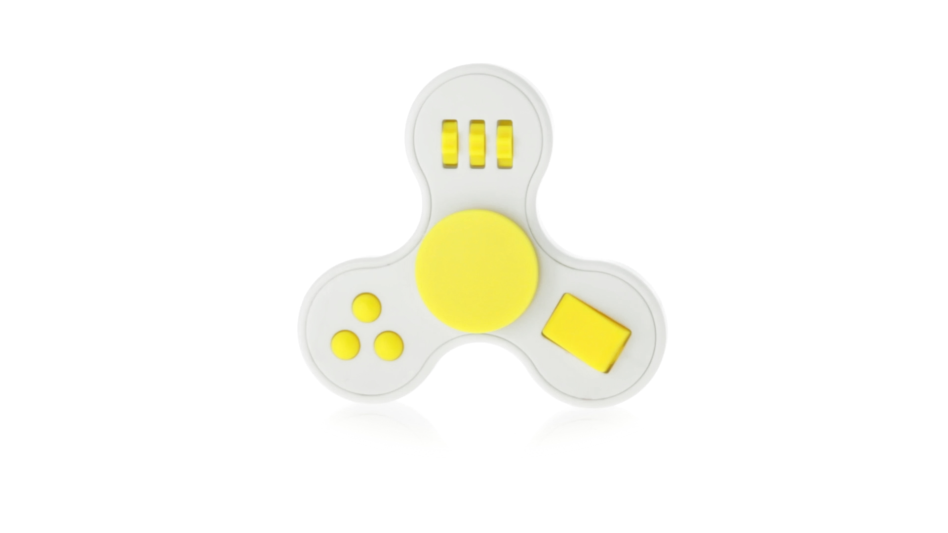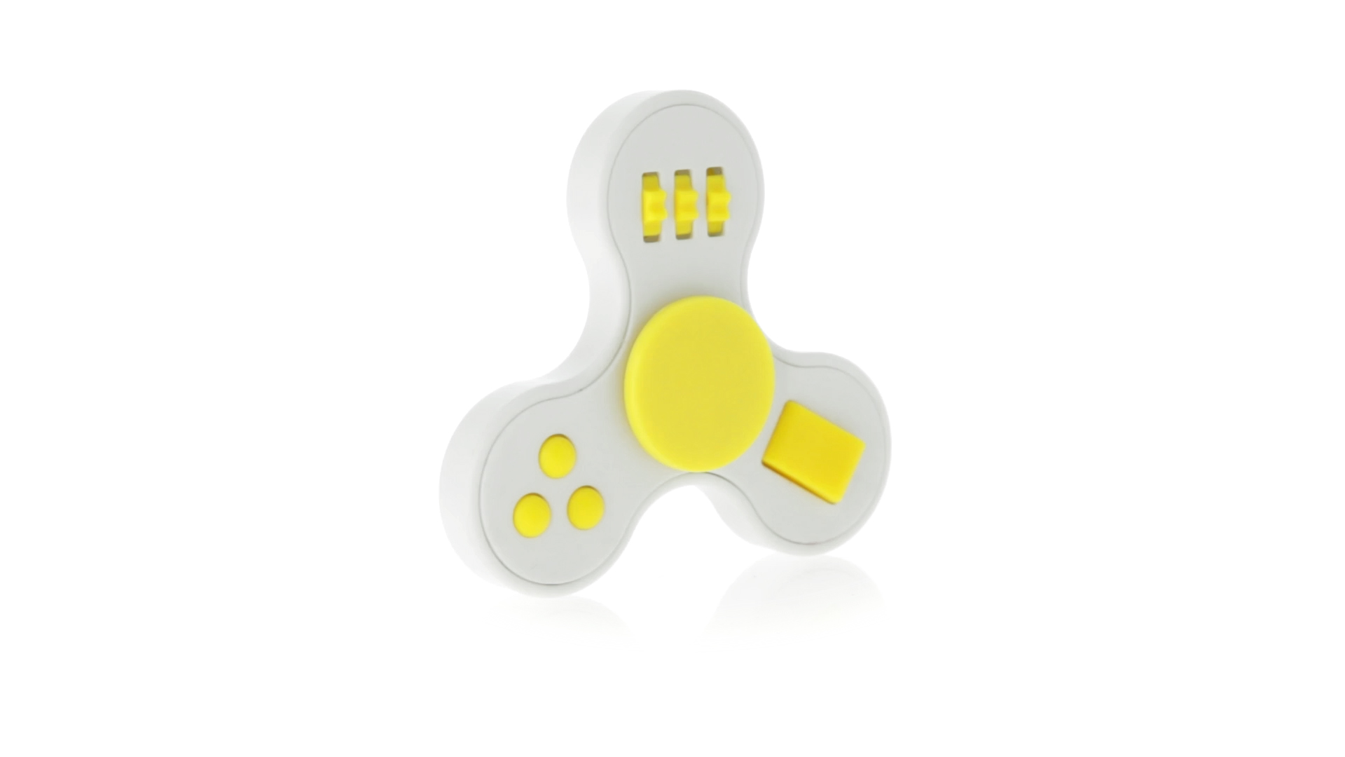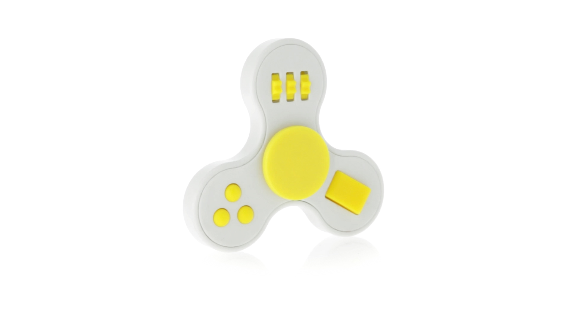 Fidget-Spinner mit vielen verschiedenen Knöpfen zur Entspannung. Gehäuse in Weiss mit Kontrastdetails in verschiedenen kräftigen Farben.