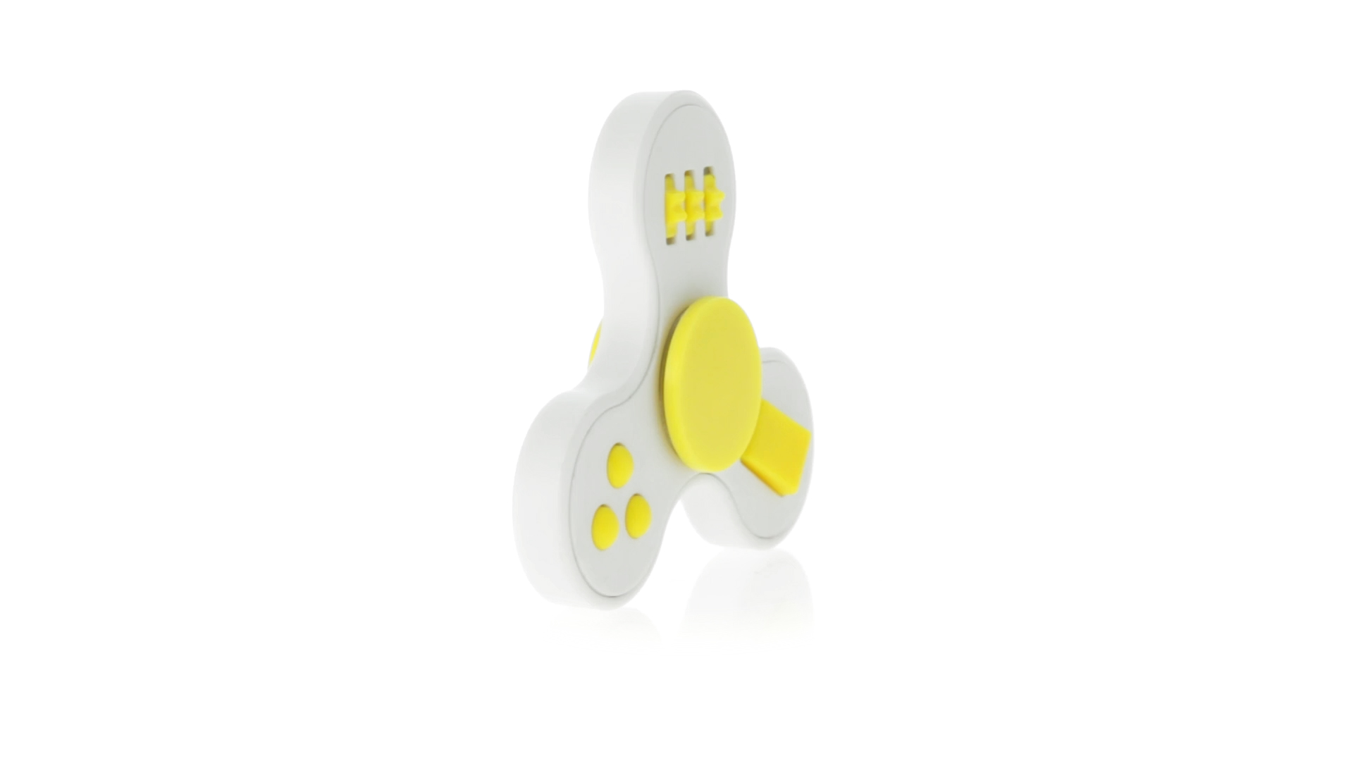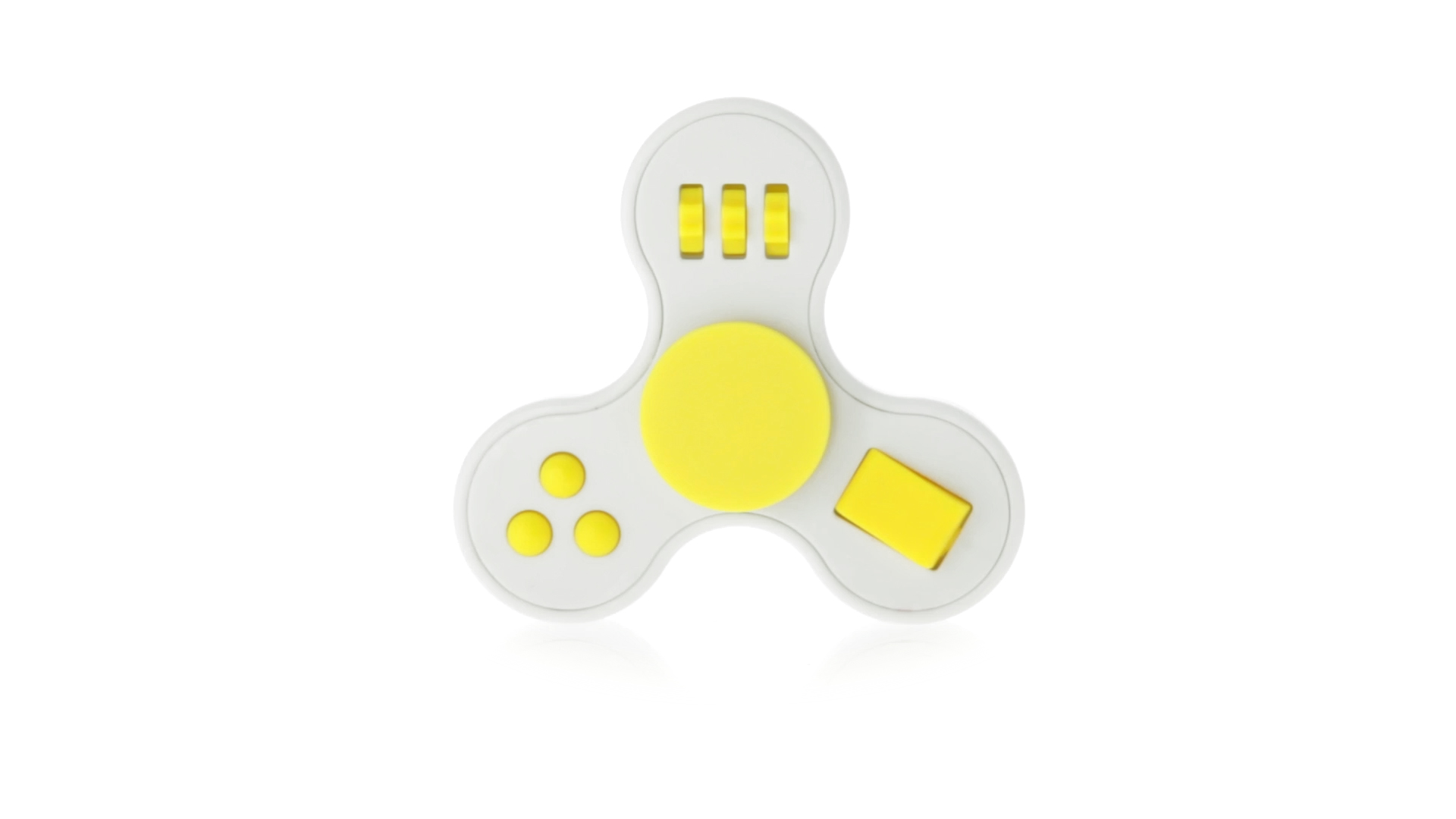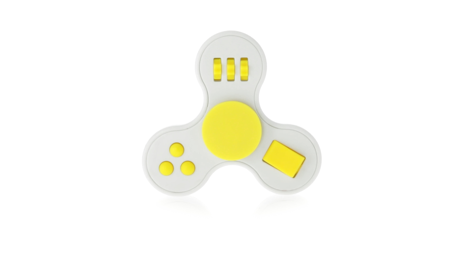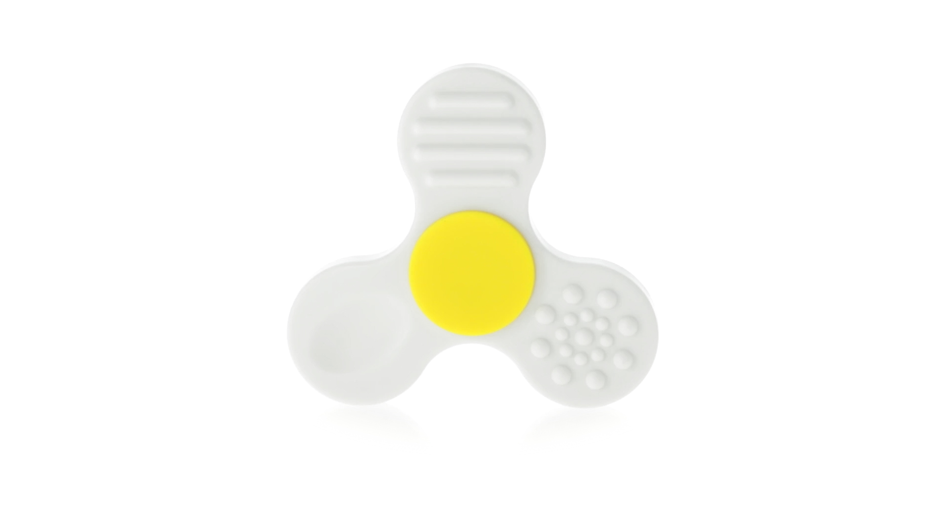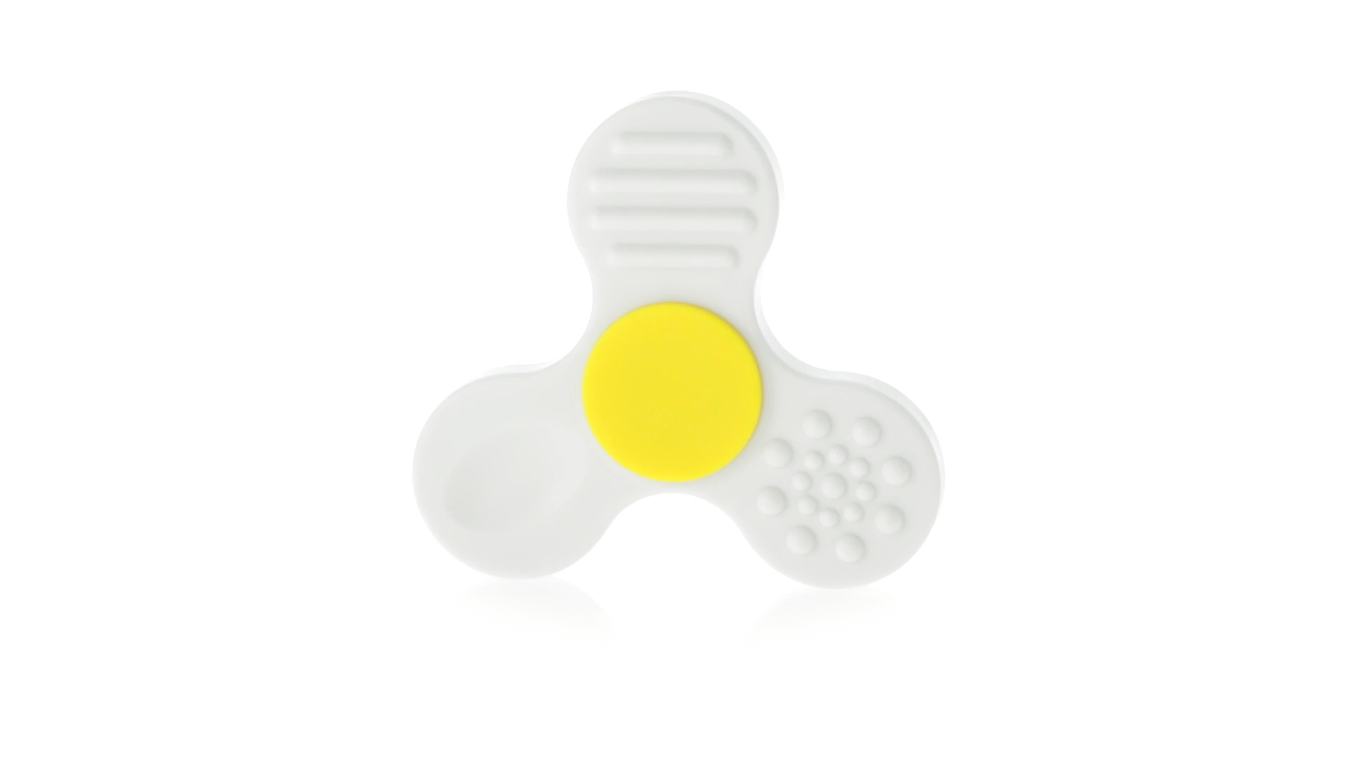 Fidget-Spinner mit vielen verschiedenen Knöpfen zur Entspannung. Gehäuse in Weiss mit Kontrastdetails in verschiedenen kräftigen Farben.
