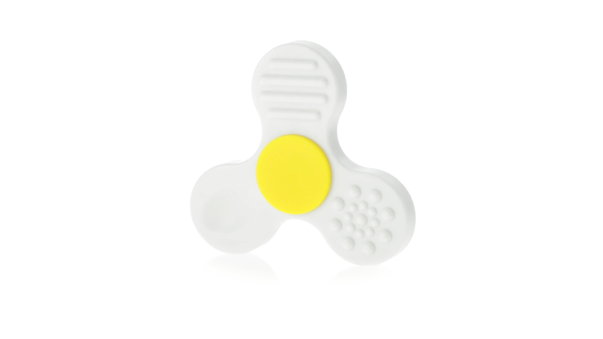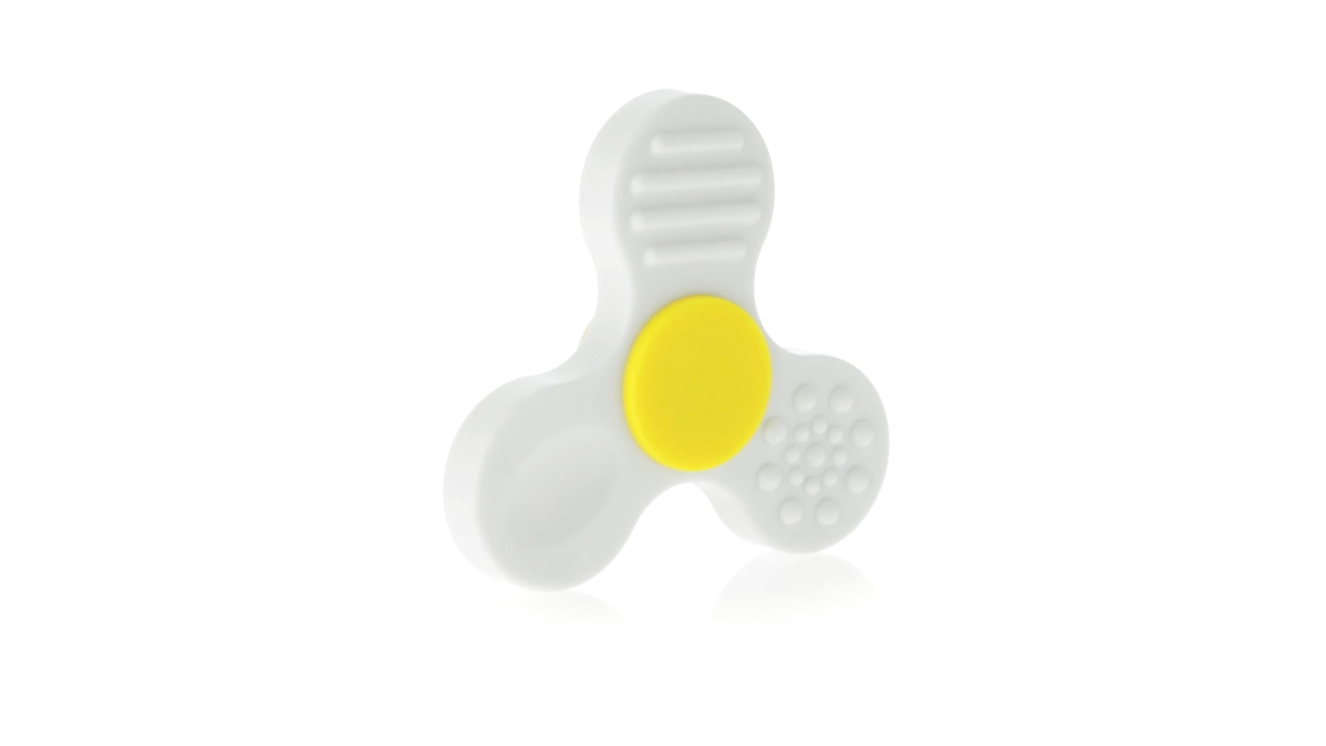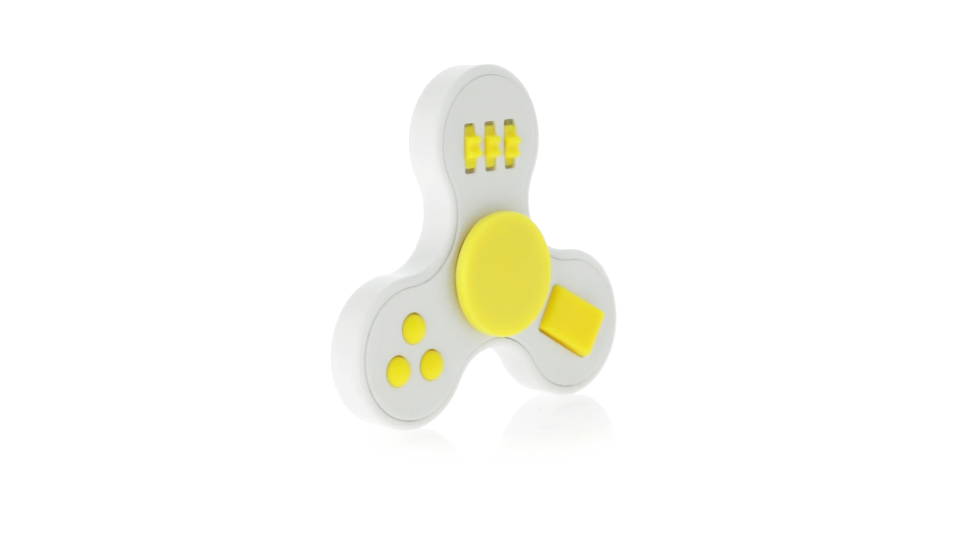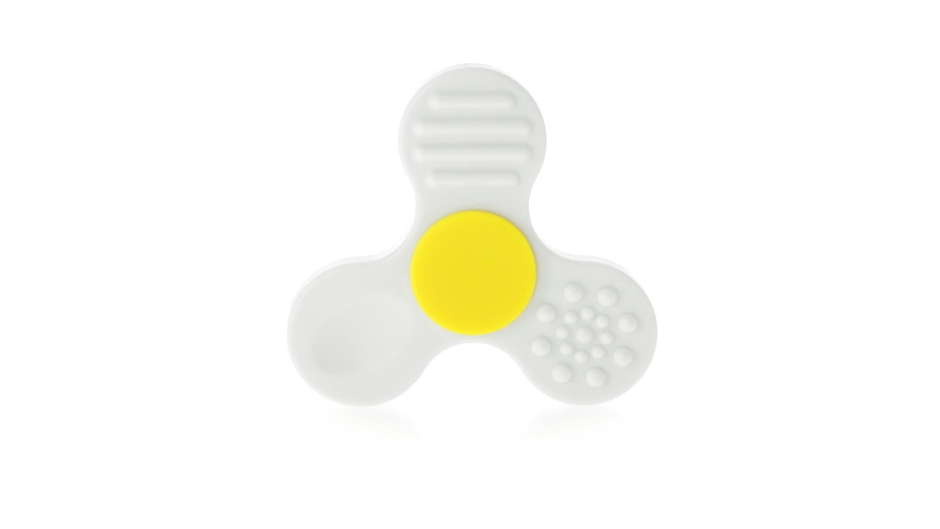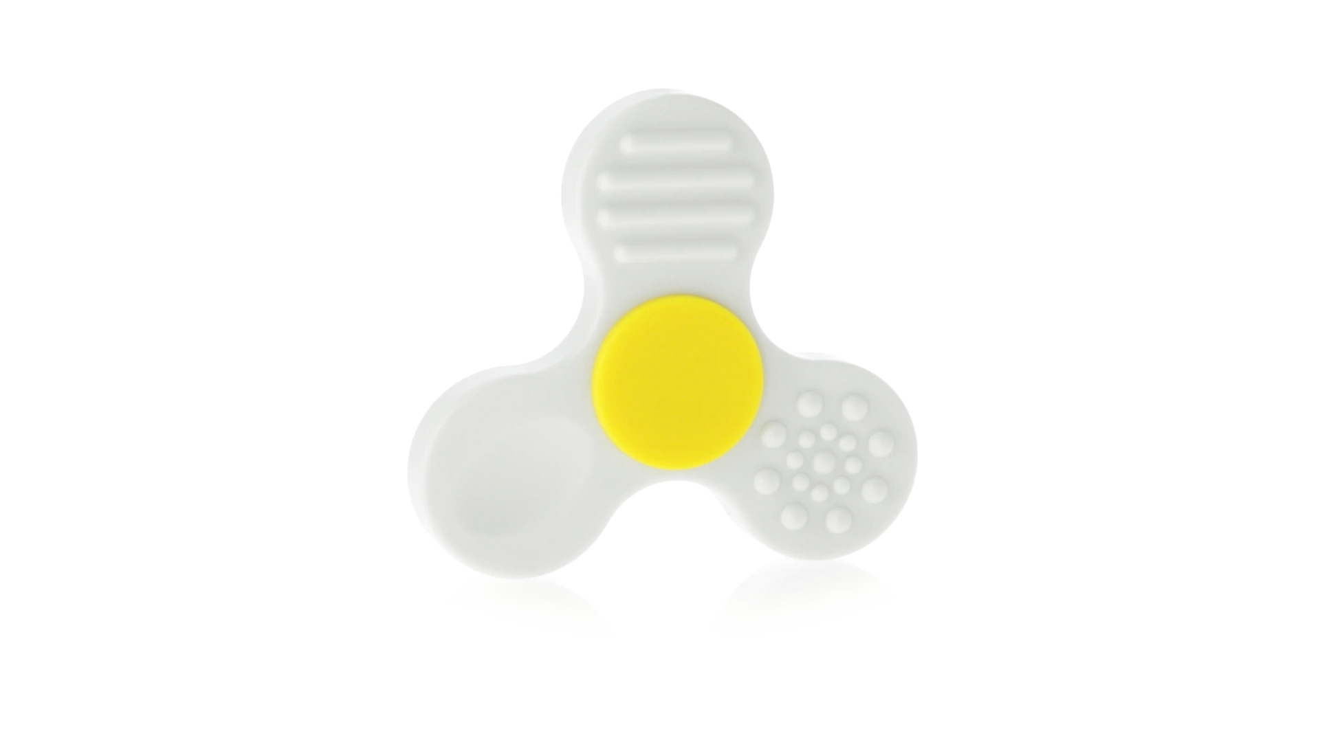 Fidget-Spinner mit vielen verschiedenen Knöpfen zur Entspannung. Gehäuse in Weiss mit Kontrastdetails in verschiedenen kräftigen Farben.