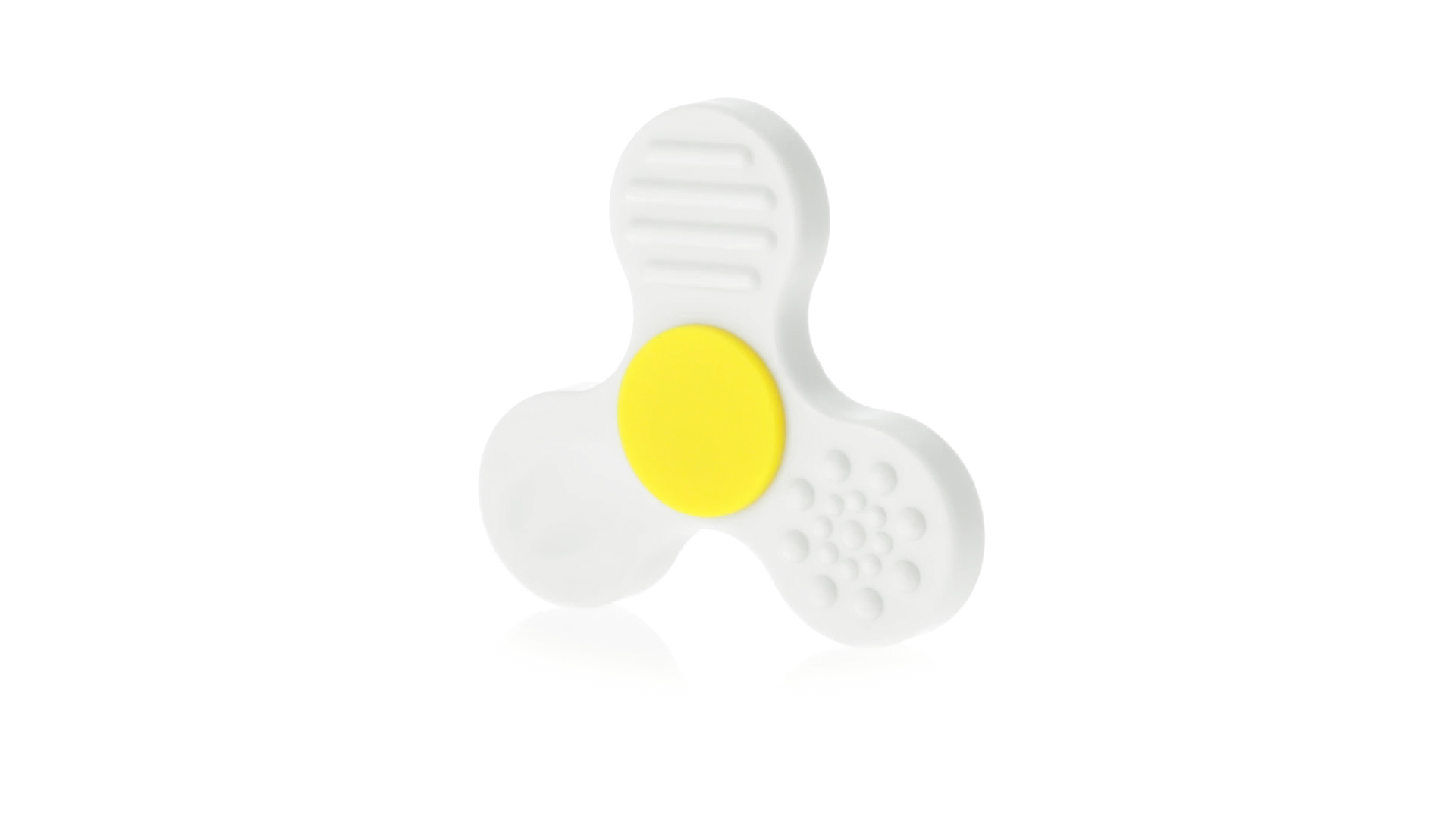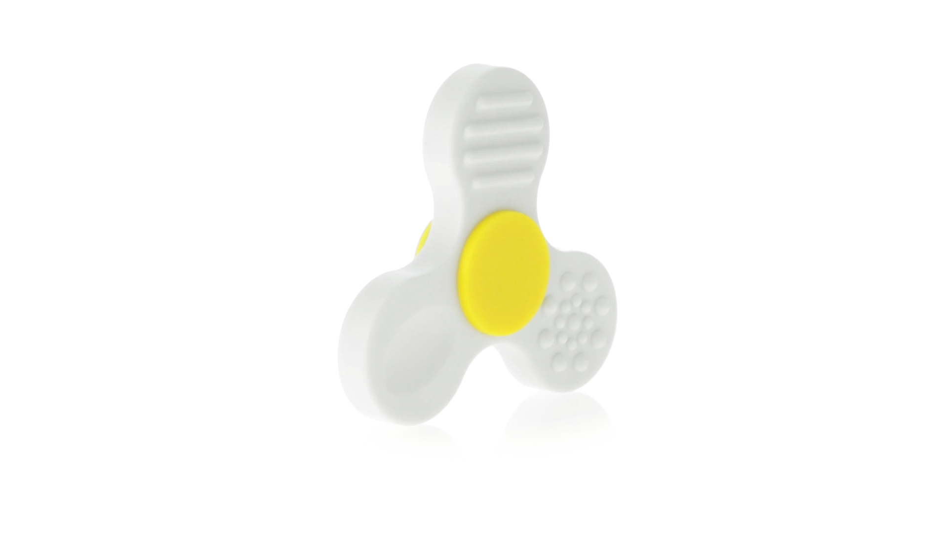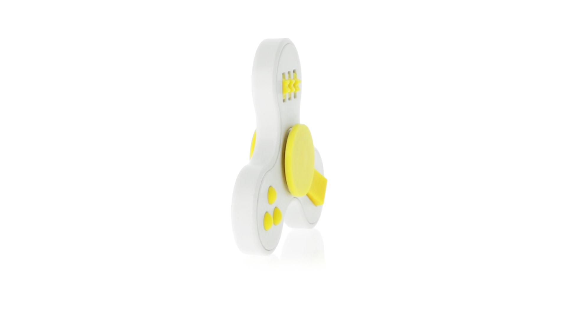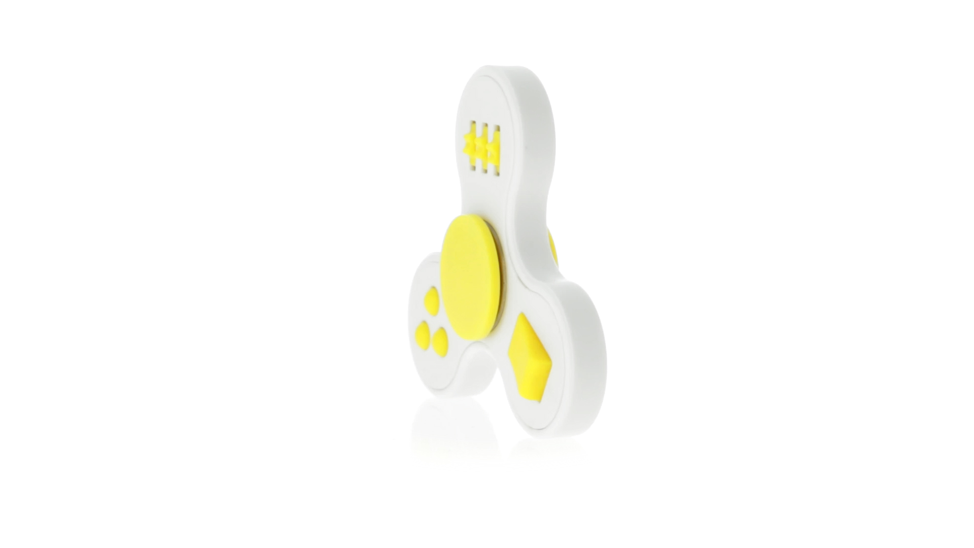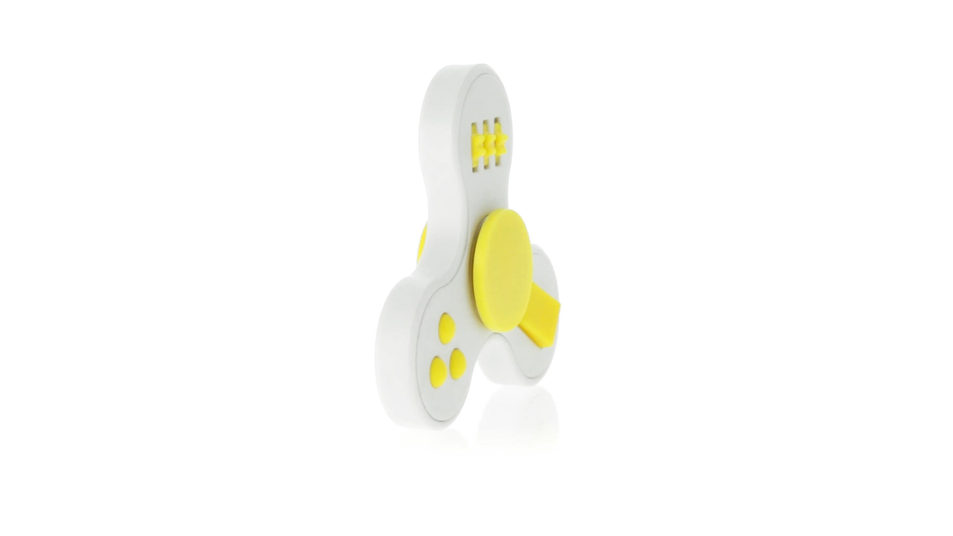 Fidget-Spinner mit vielen verschiedenen Knöpfen zur Entspannung. Gehäuse in Weiss mit Kontrastdetails in verschiedenen kräftigen Farben.