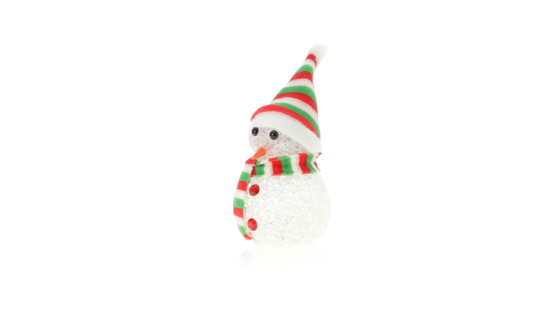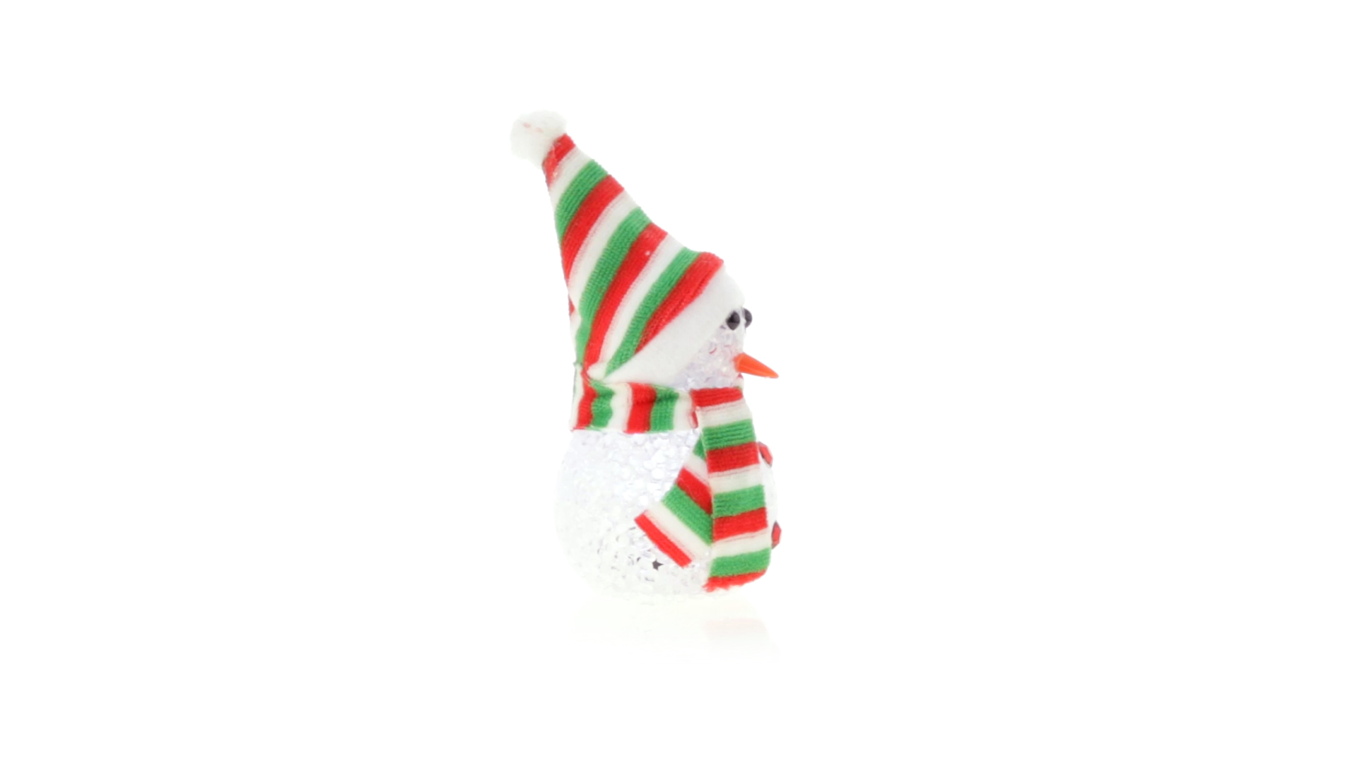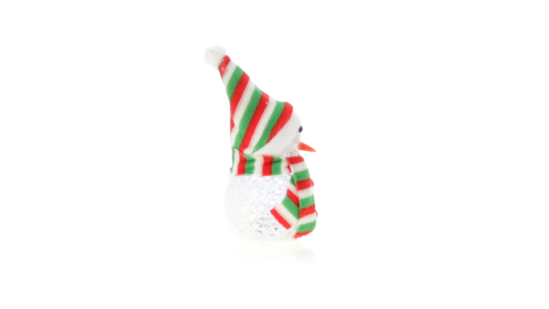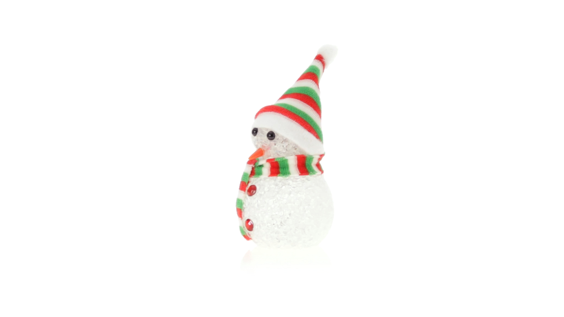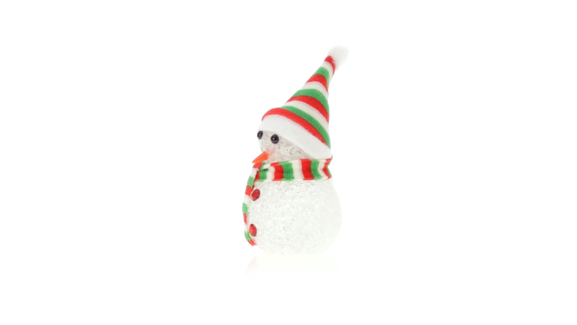Schneemann-Weihnachtsfigur mit mehrfarbigem LED-Licht im Inneren. 3 Knopfzellen inklusive. Präsentiert in einer individuellen Designbox.