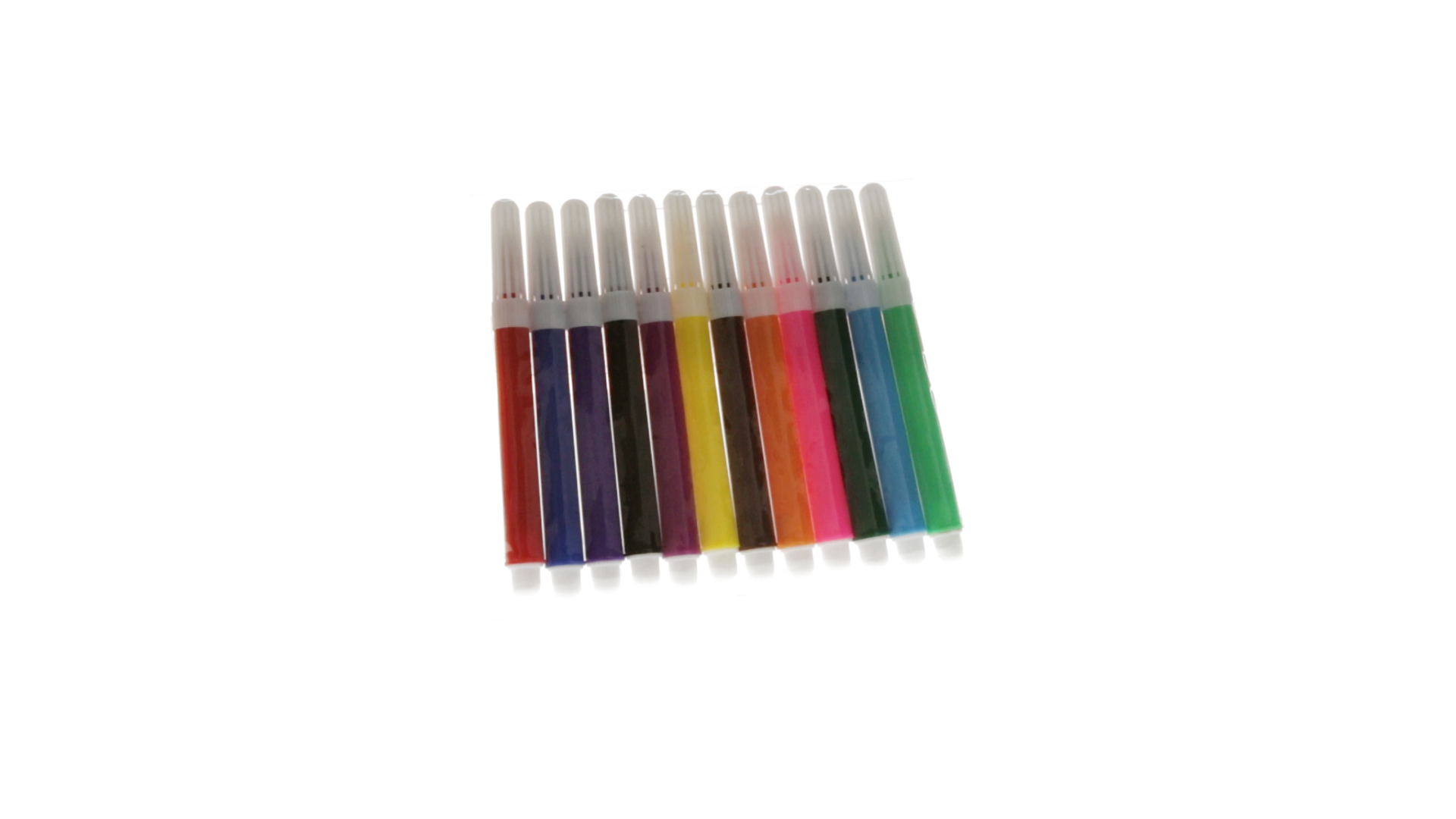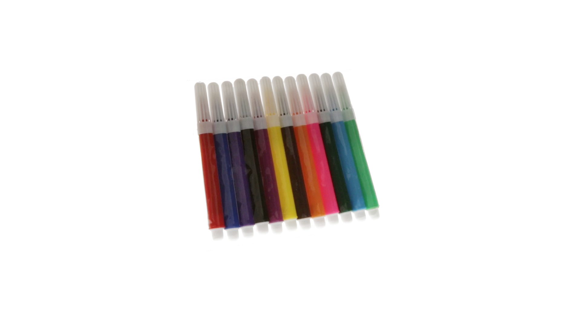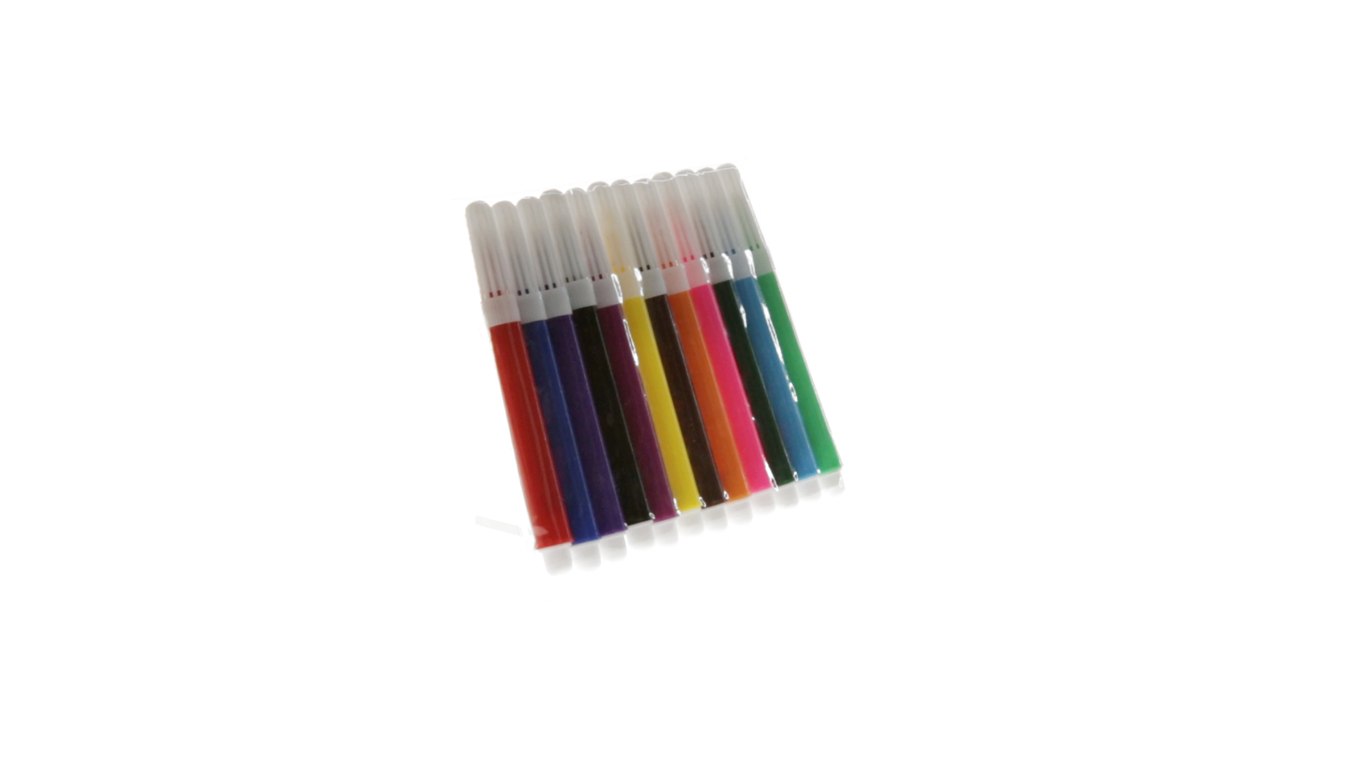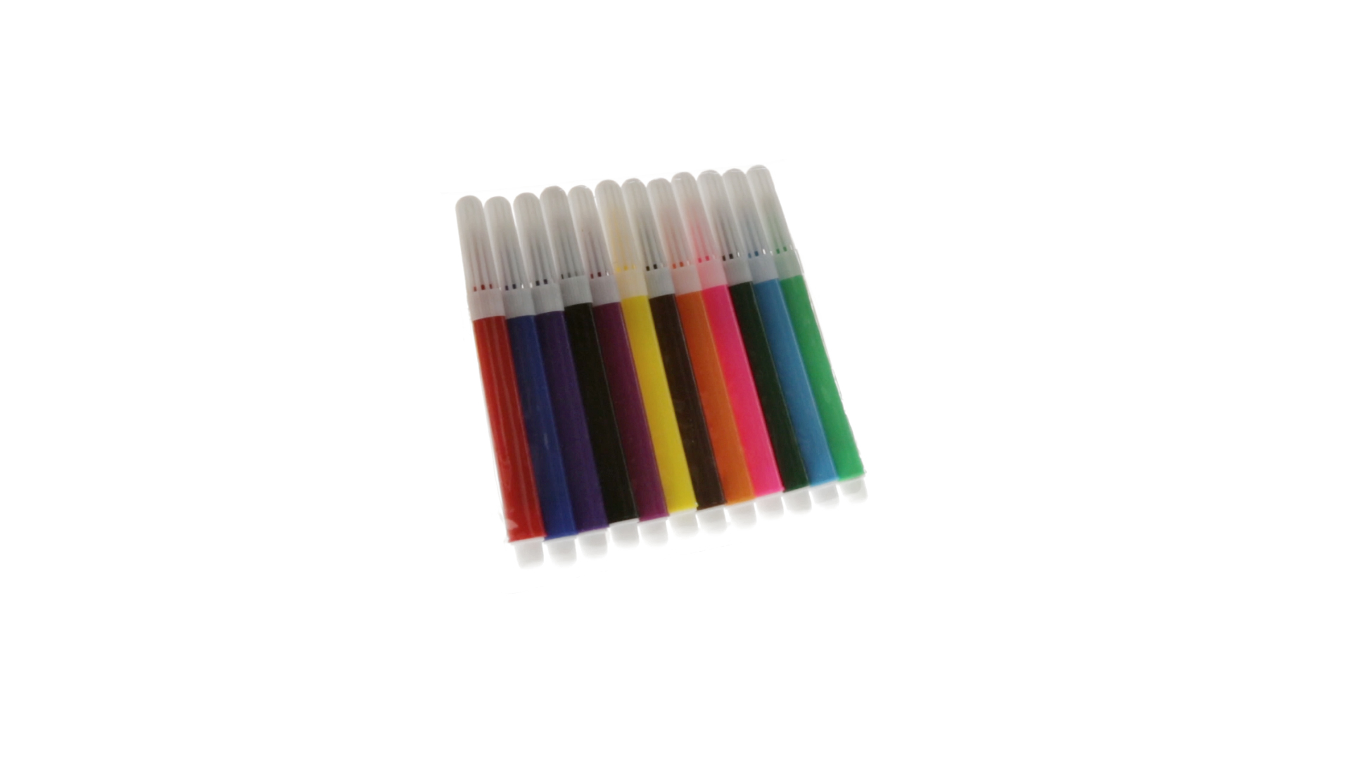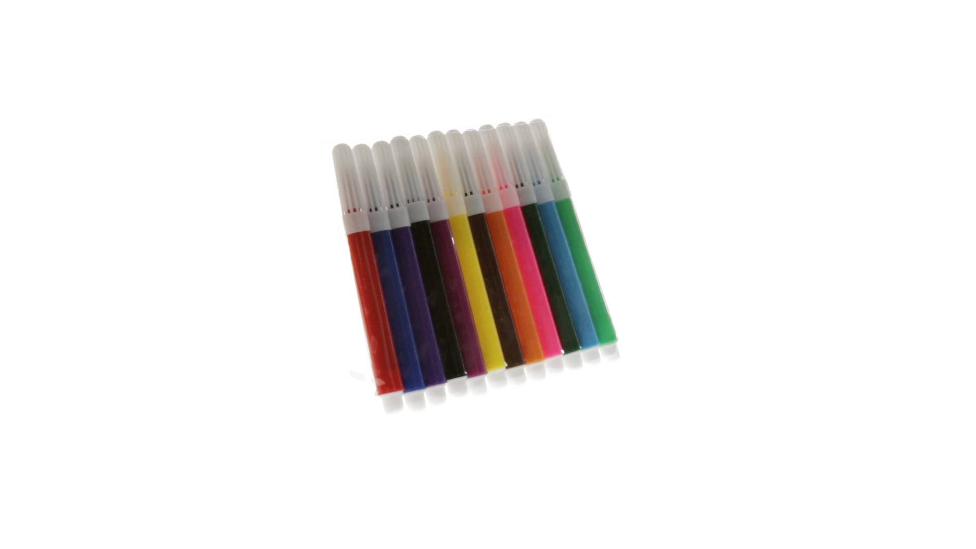 Set aus 12 Filzstiften in vielen verschiedenen Farben. Präsentiert in einer transparenten PVC-Schachtel.