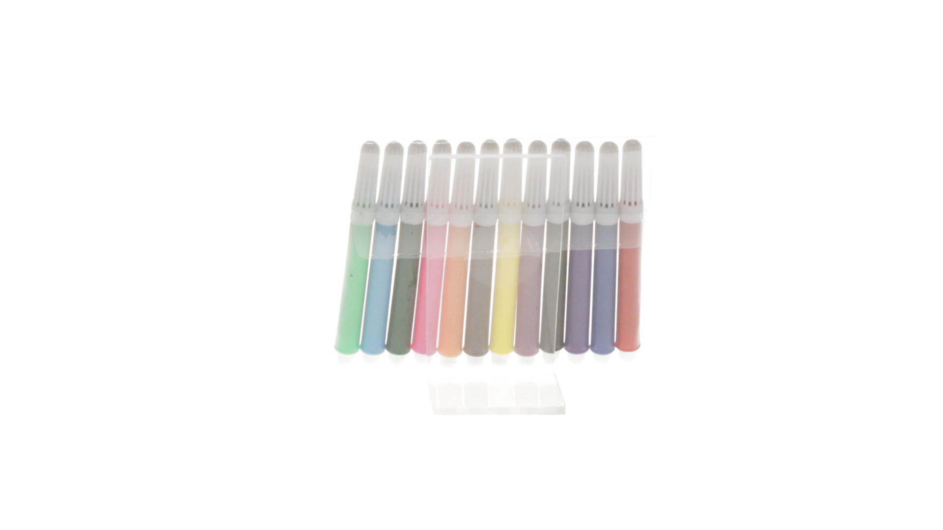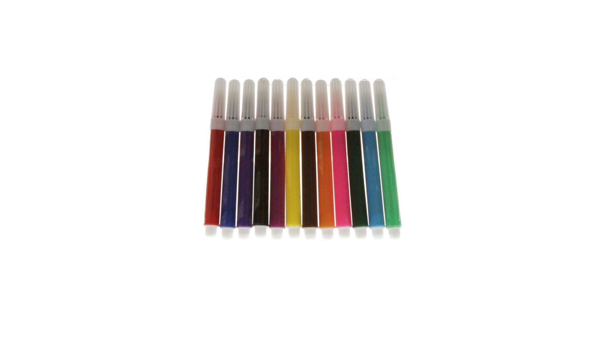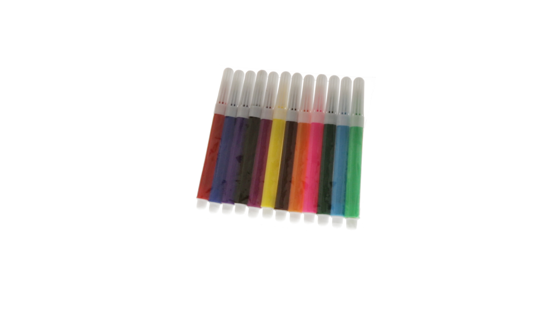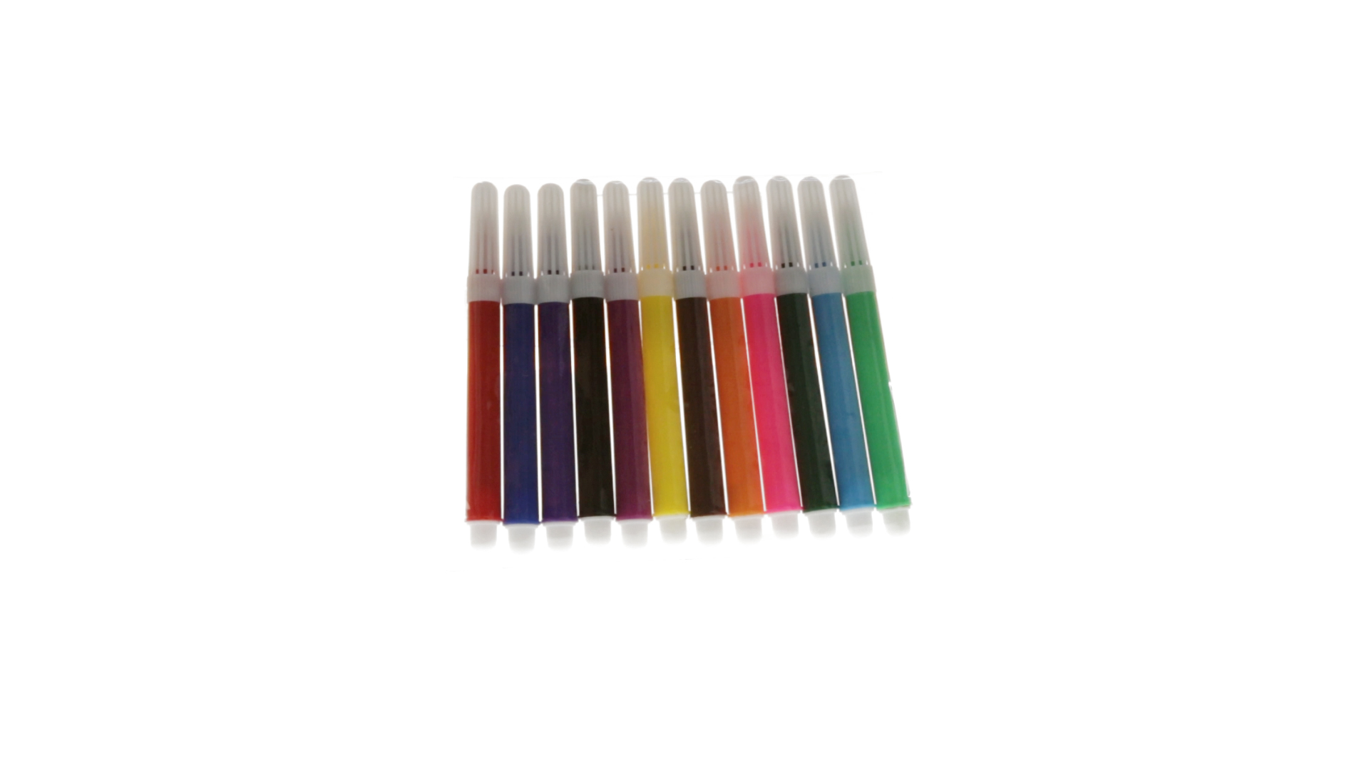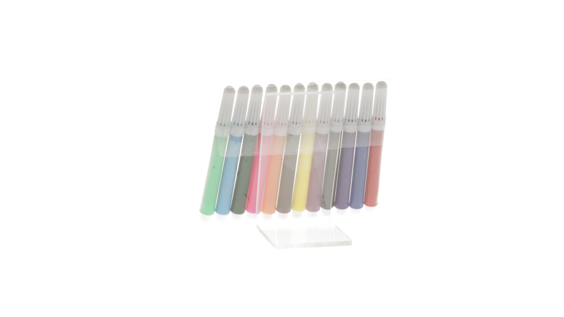 Set aus 12 Filzstiften in vielen verschiedenen Farben. Präsentiert in einer transparenten PVC-Schachtel.