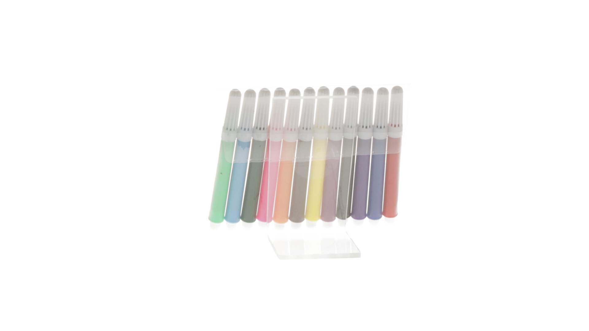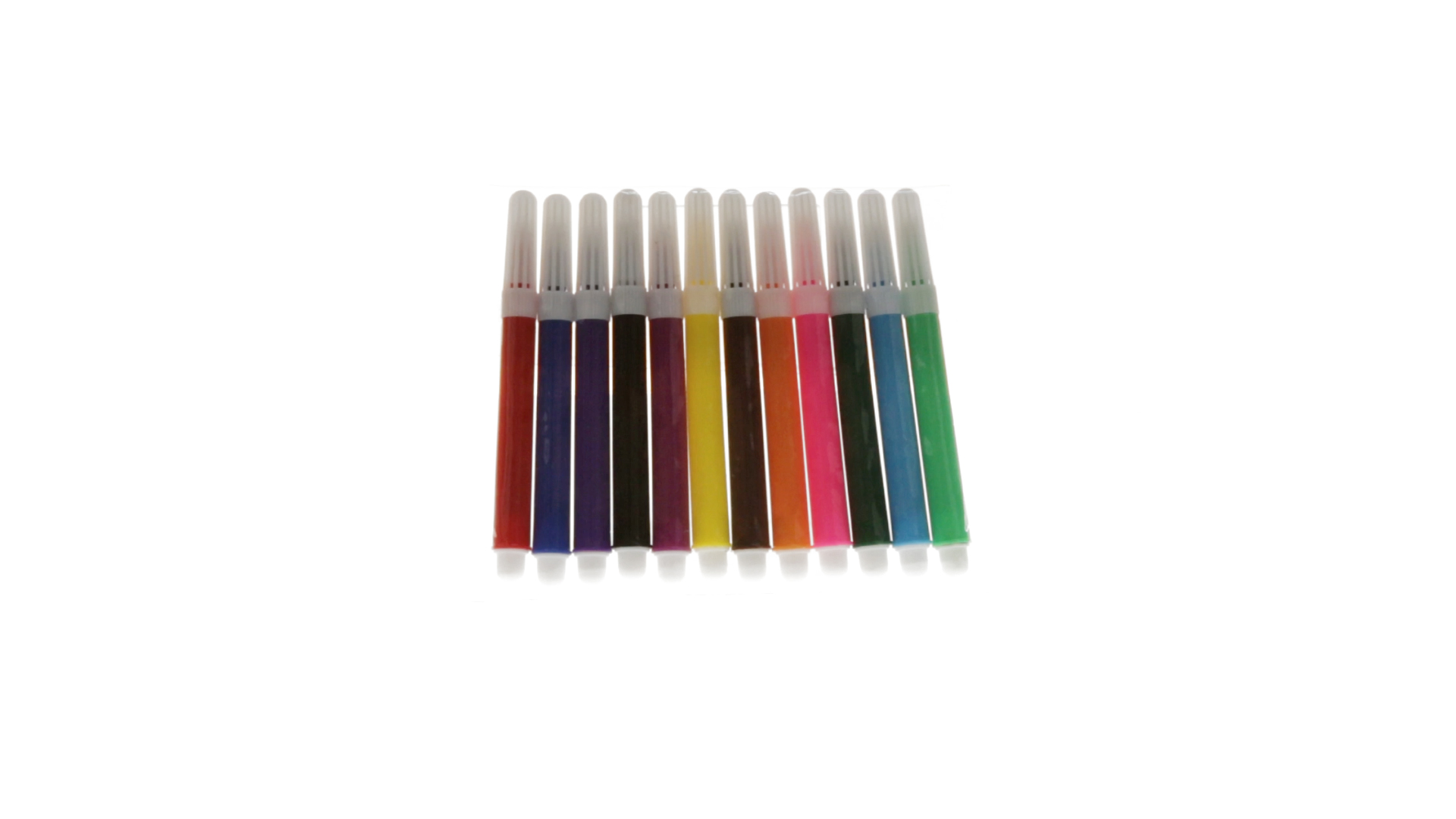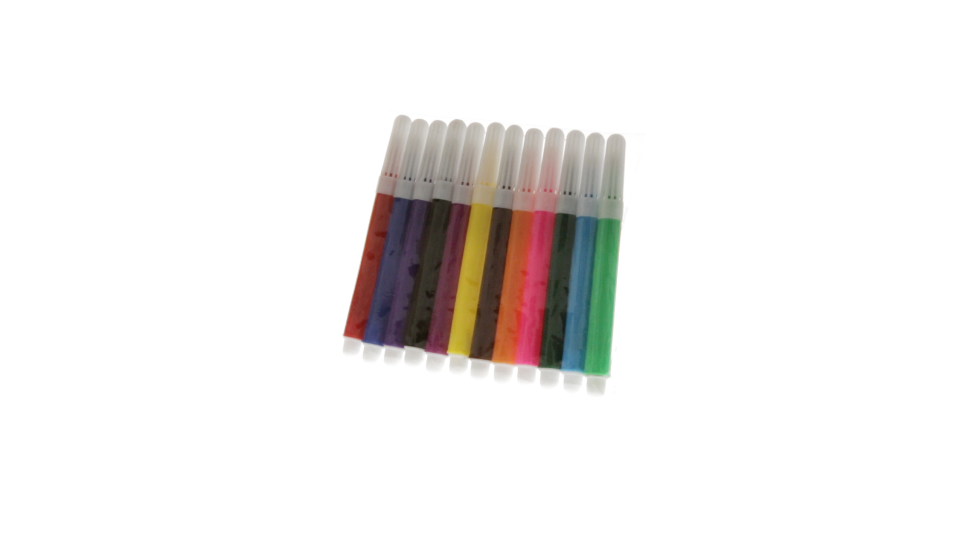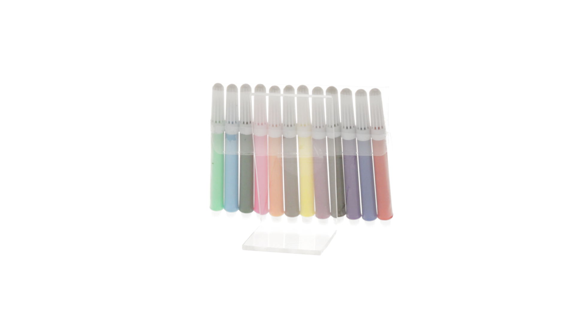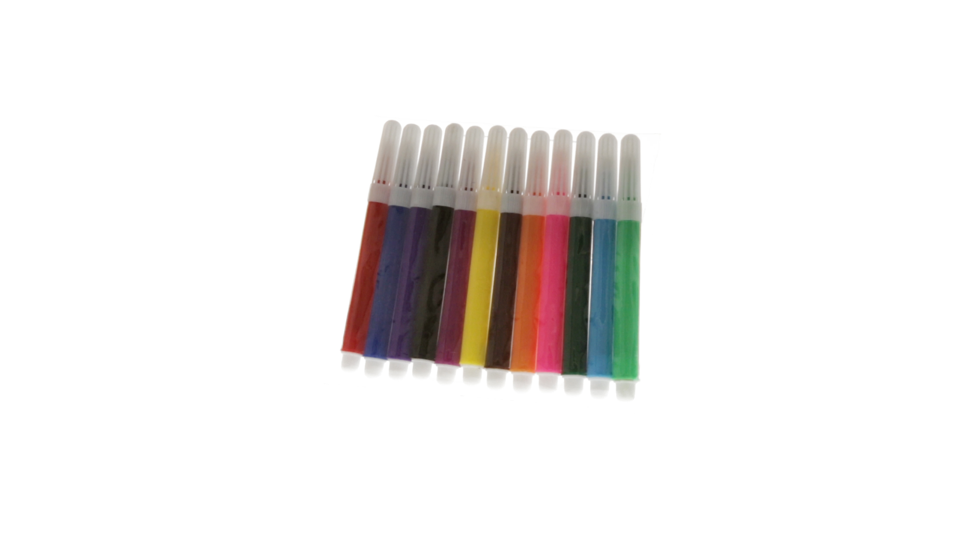 Set aus 12 Filzstiften in vielen verschiedenen Farben. Präsentiert in einer transparenten PVC-Schachtel.
