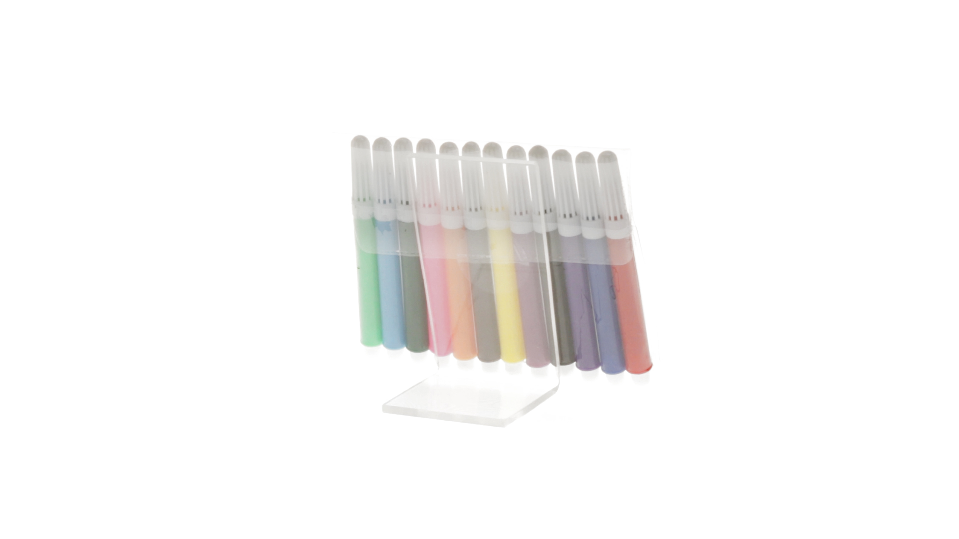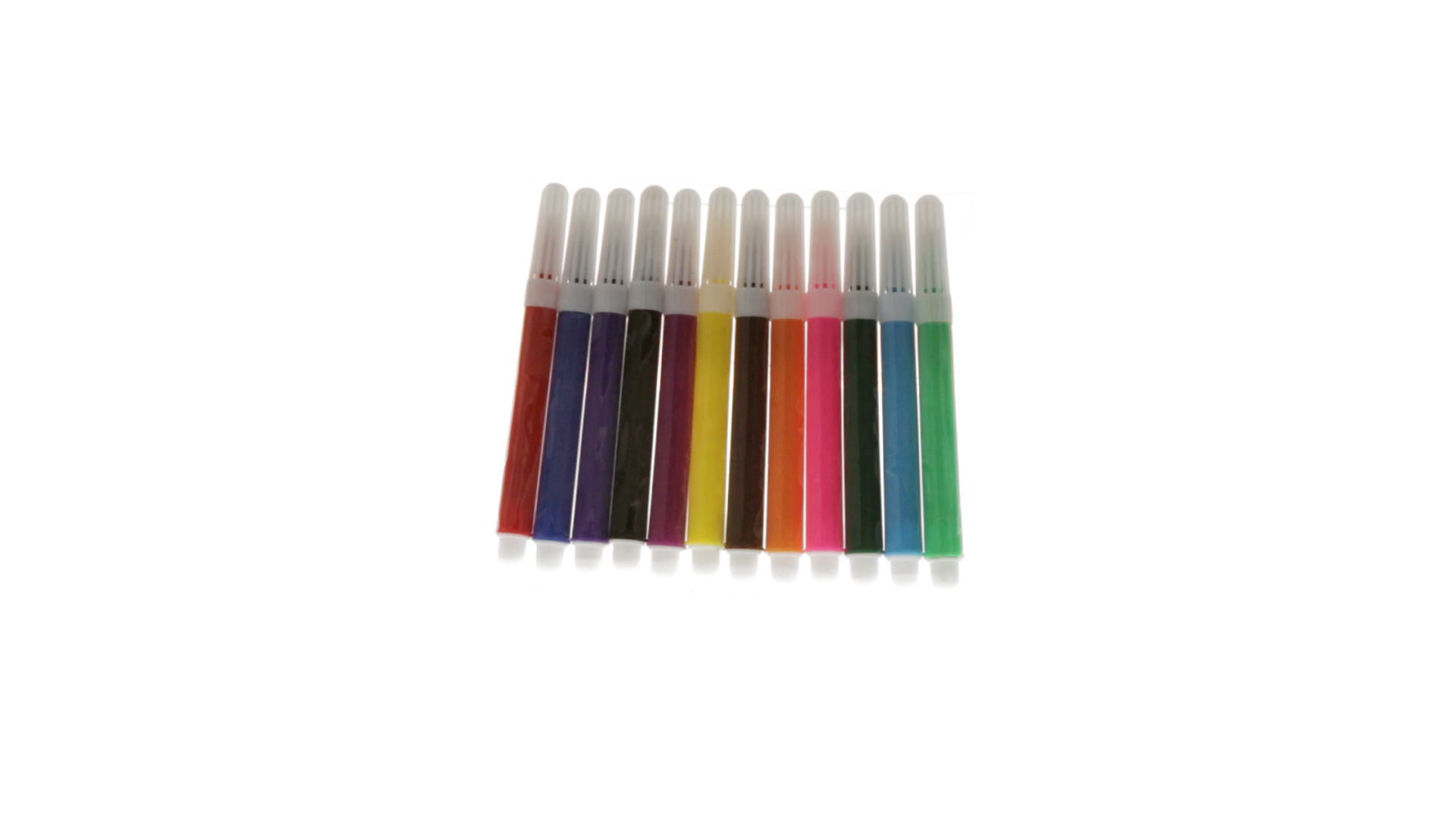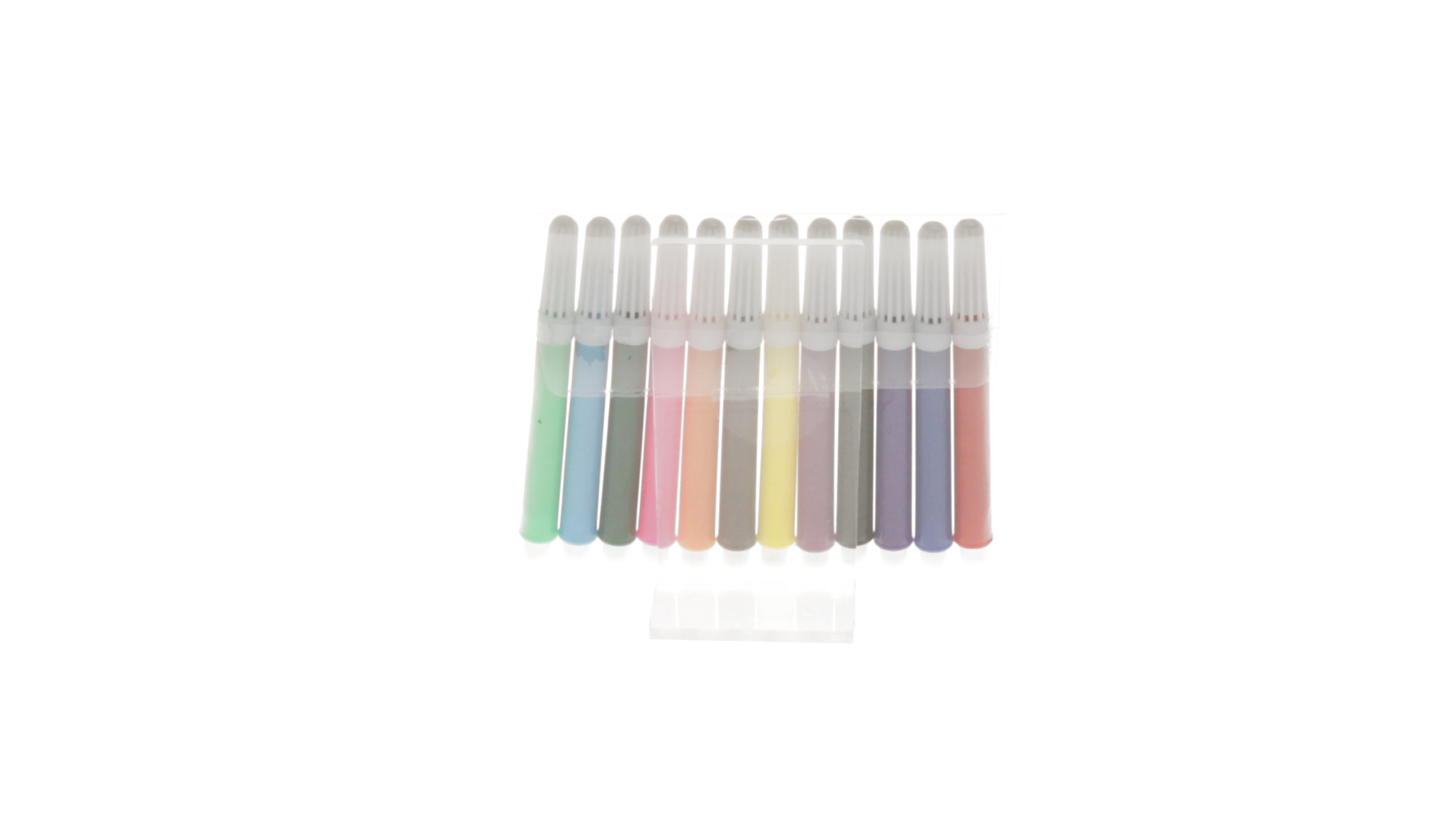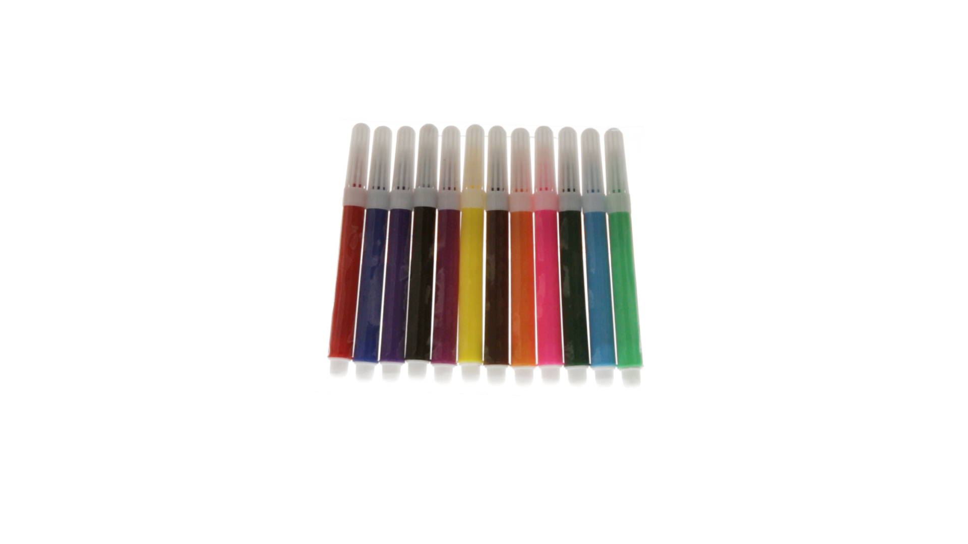 Set aus 12 Filzstiften in vielen verschiedenen Farben. Präsentiert in einer transparenten PVC-Schachtel.