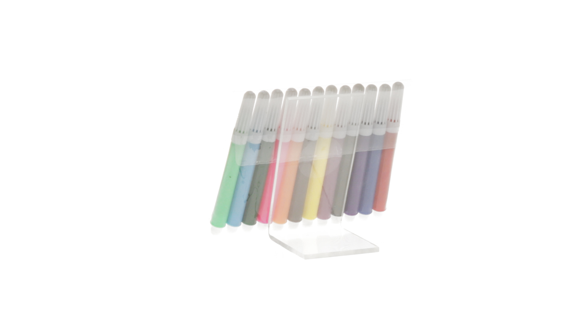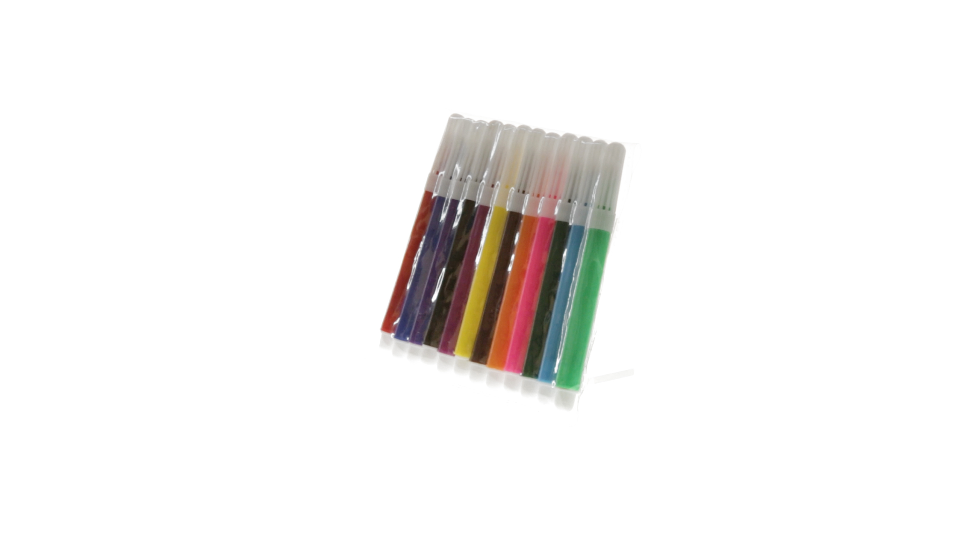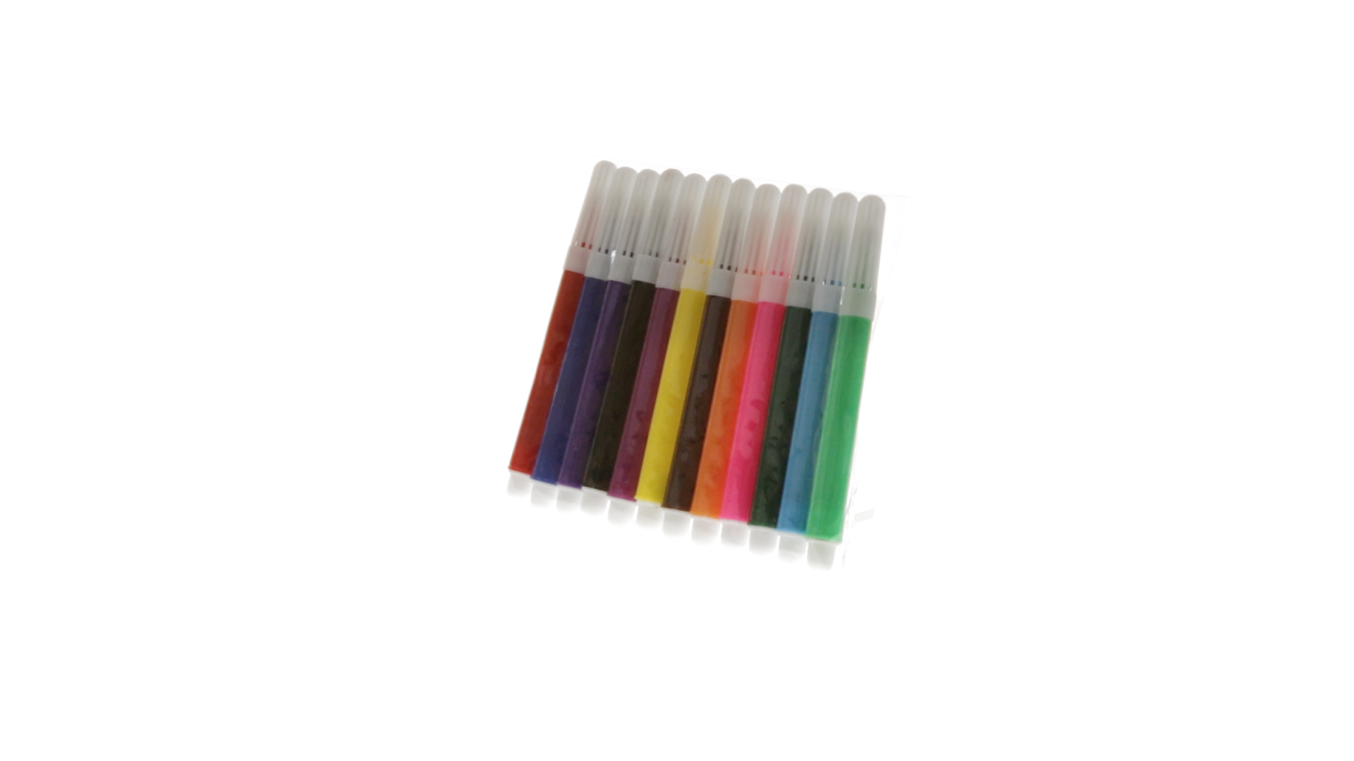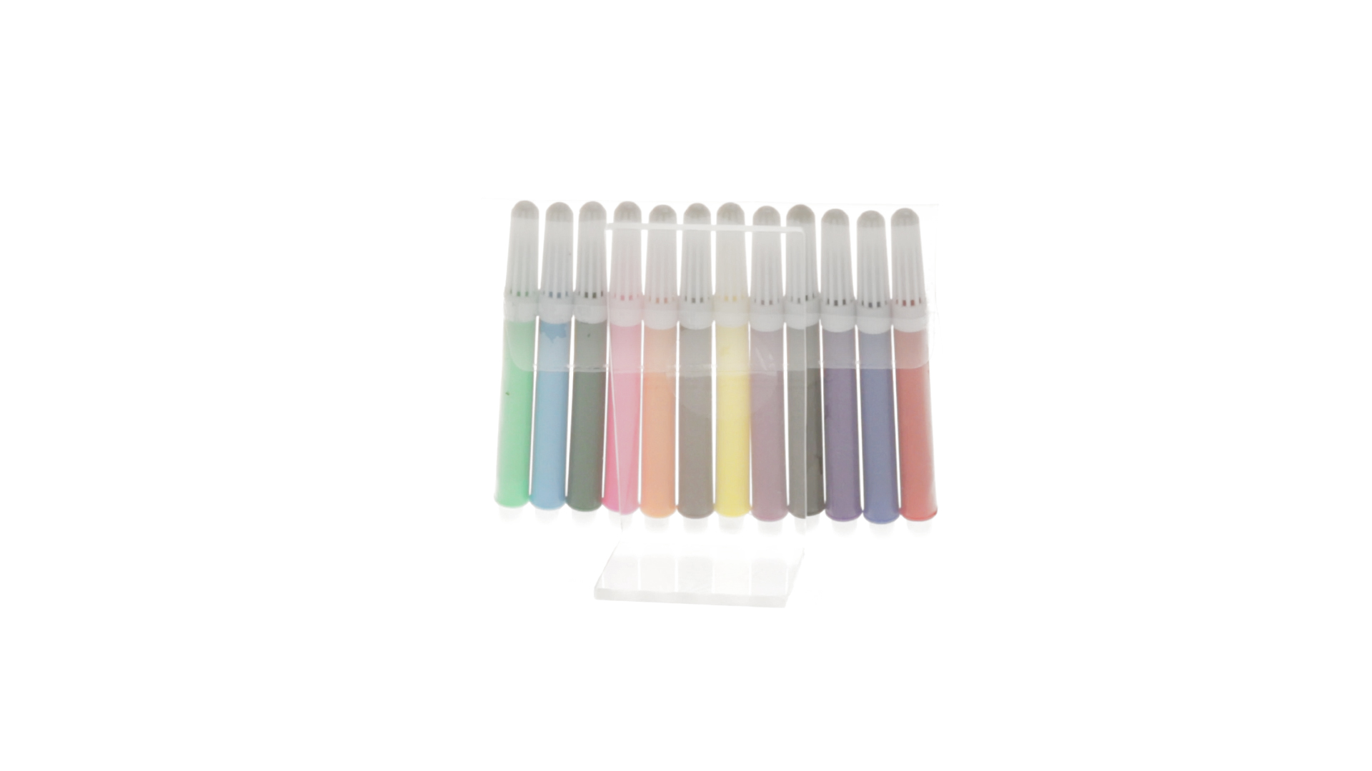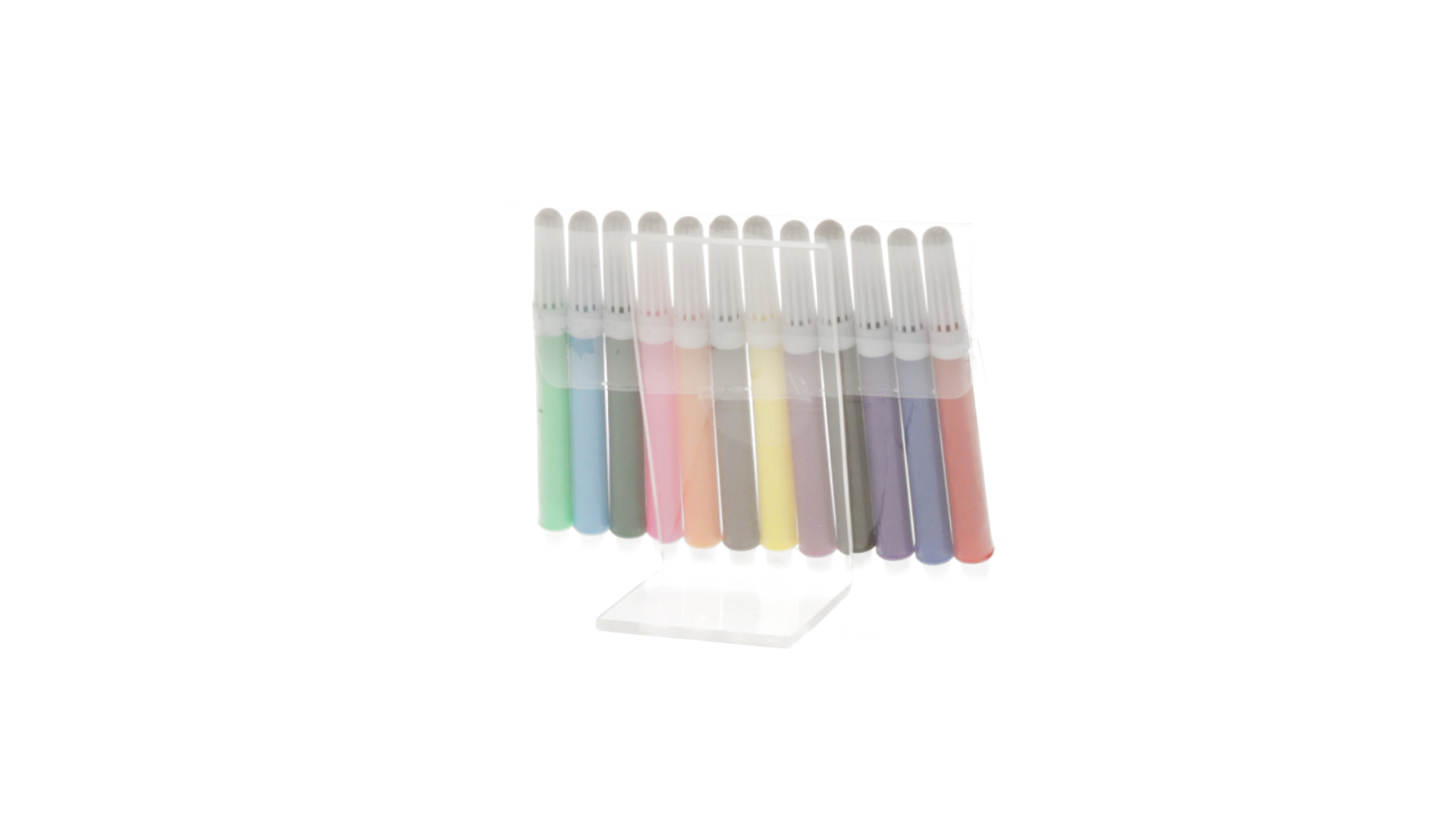 Set aus 12 Filzstiften in vielen verschiedenen Farben. Präsentiert in einer transparenten PVC-Schachtel.