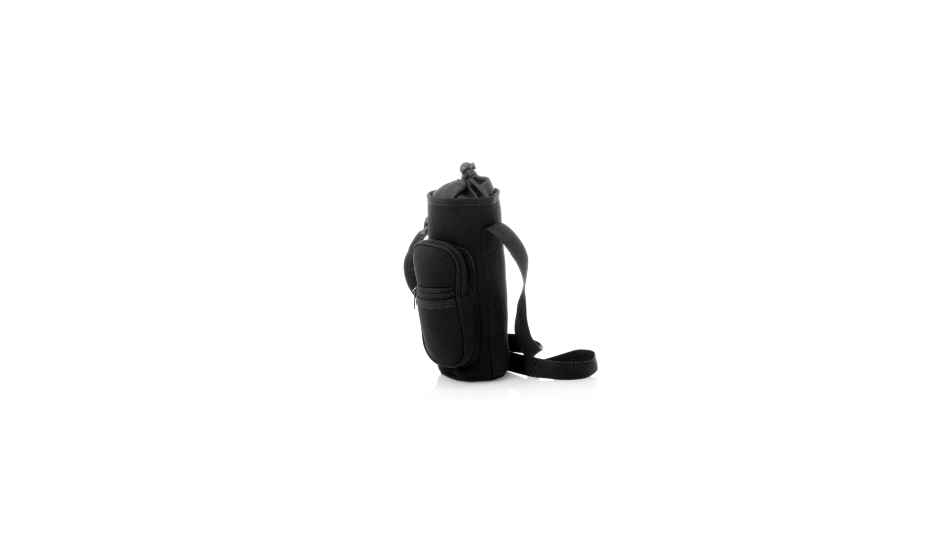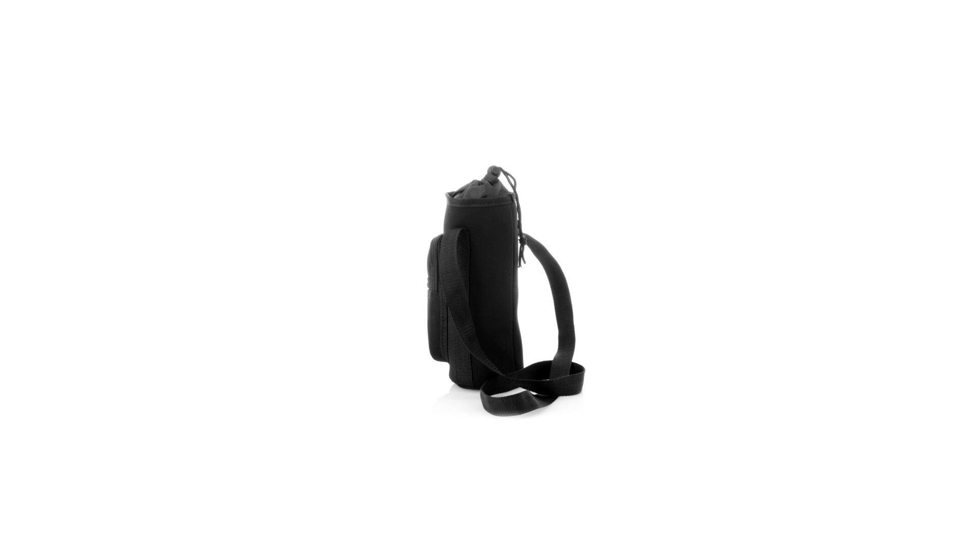 Halter für Flaschen bis 1,5L, aus Softshell. Mit Kordelzugverschluss und angenehm zu tragen, mit verstellbarem Schultergurt. Mit Reissverschlusstaschen vorne und einzeln in einer recycelten Tasche präsentiert.