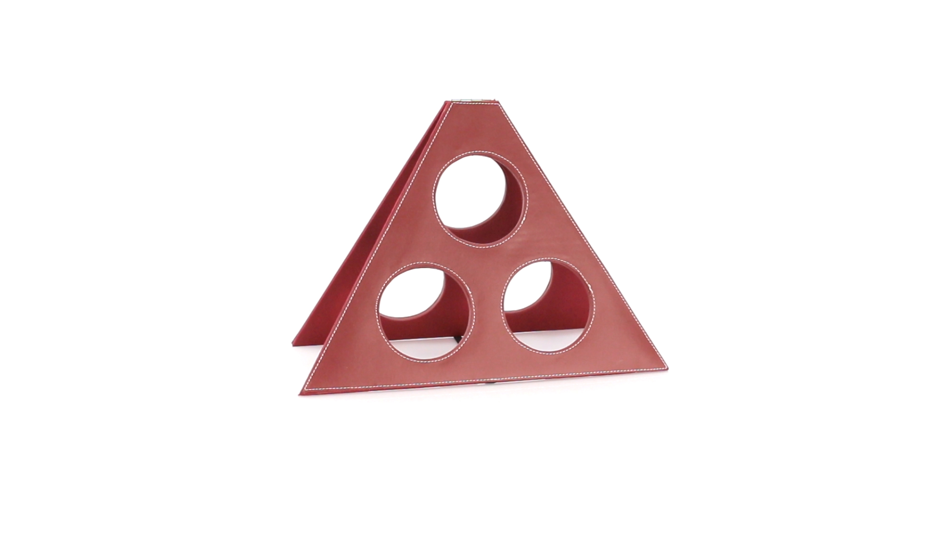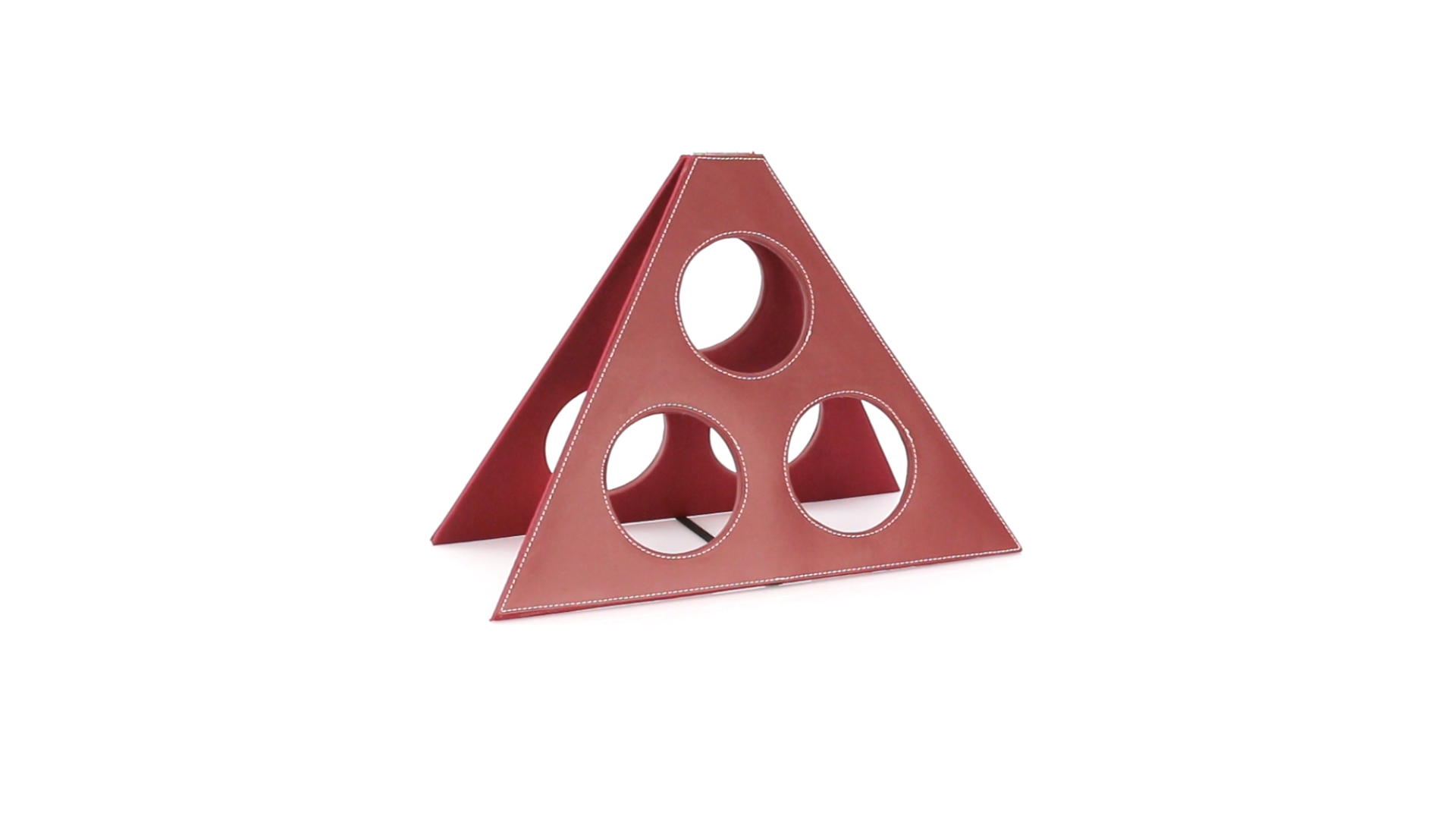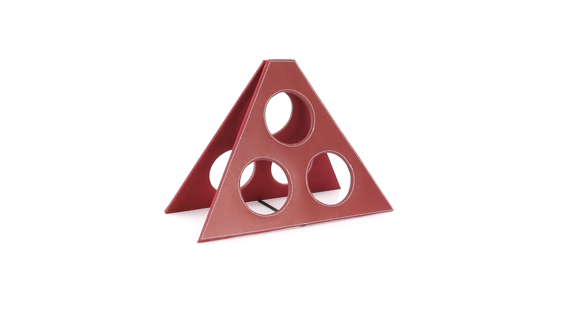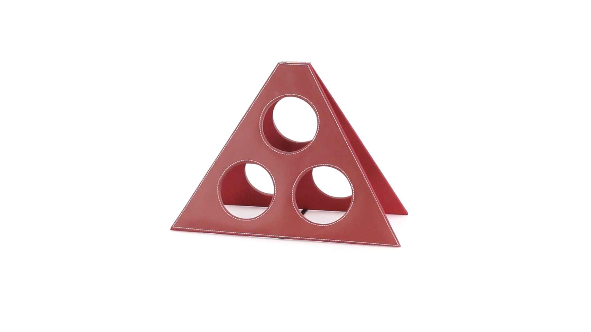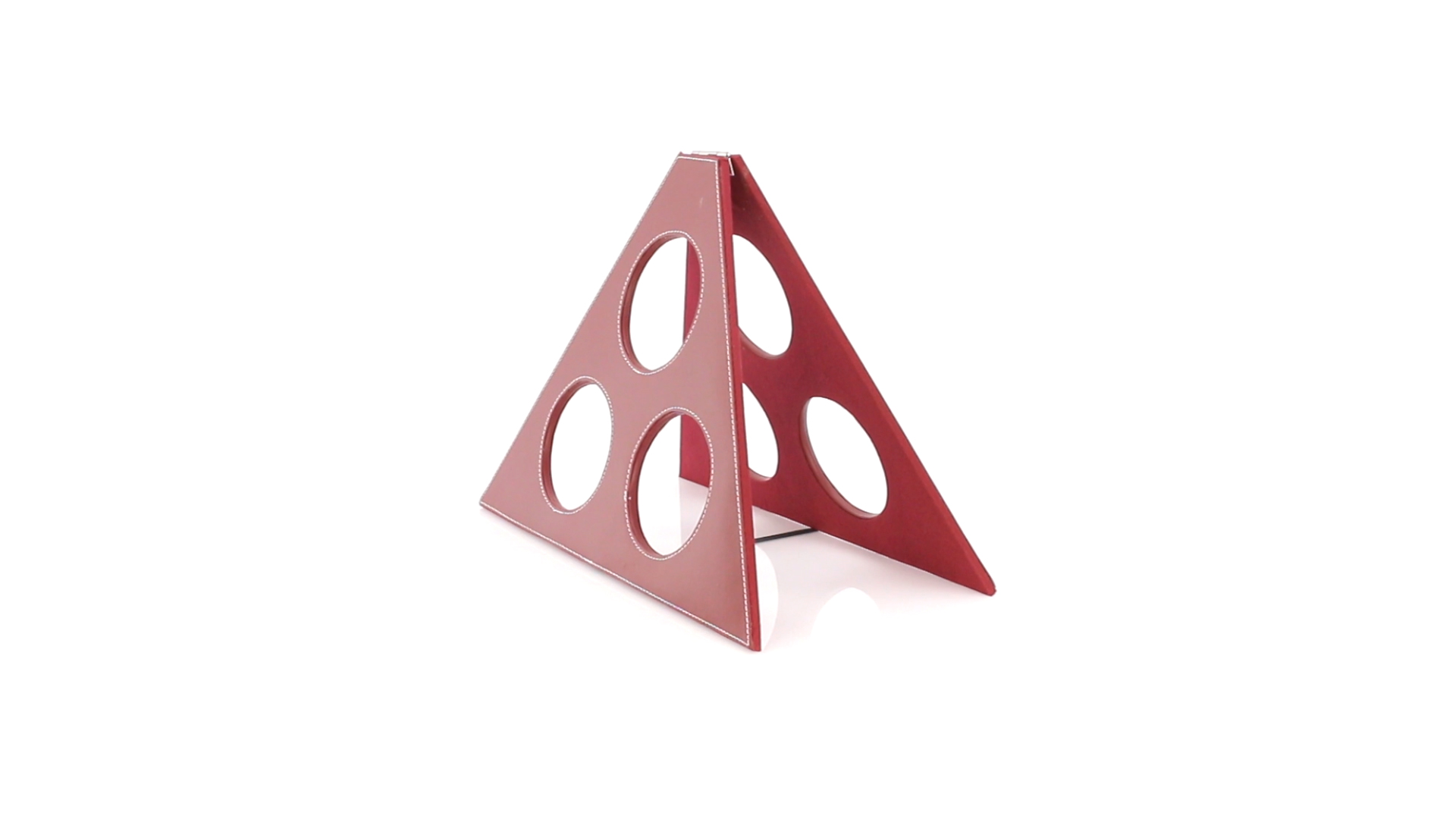 Klappbarer Flaschenständer für 3 Flaschen aus elegantem Kunstleder in schlichten Rosé- und Rottönen. Mit Verstärkungsnähten in Weiss.