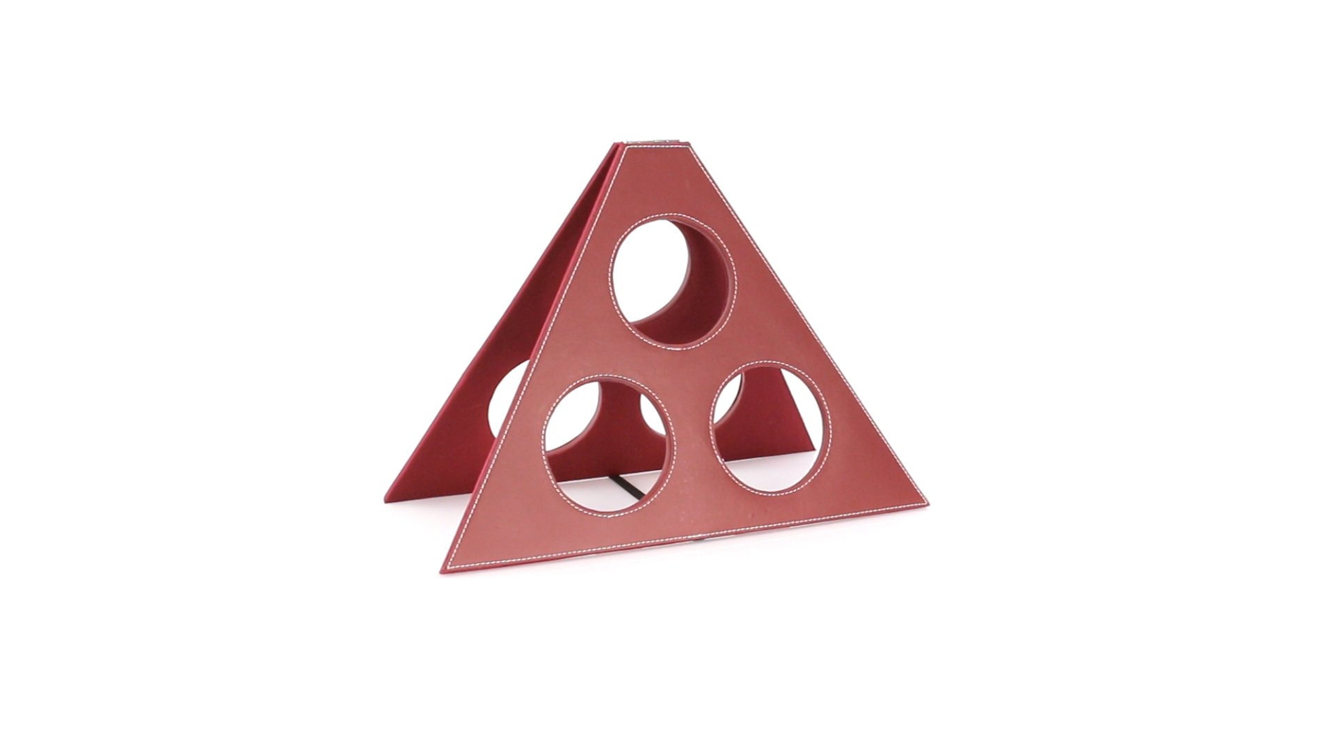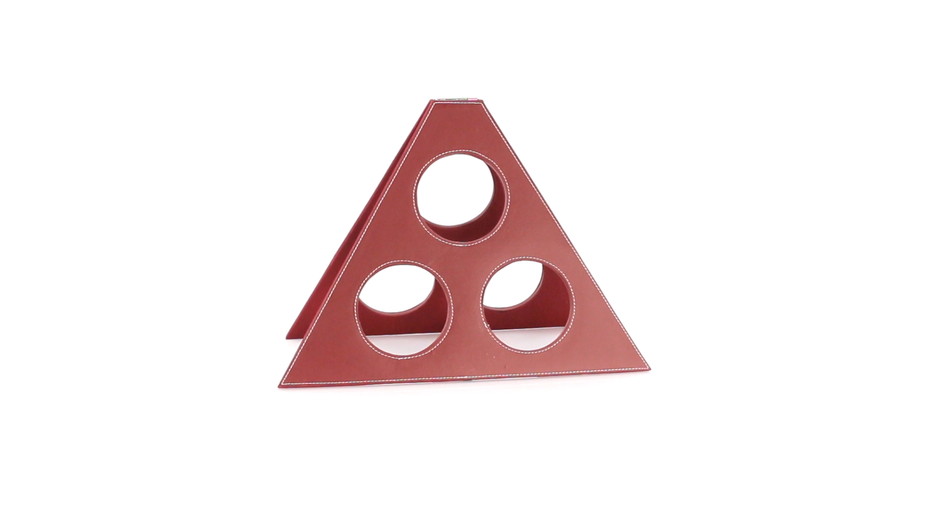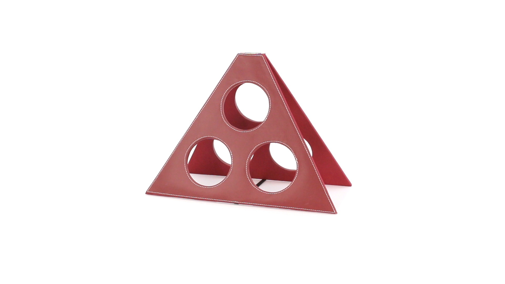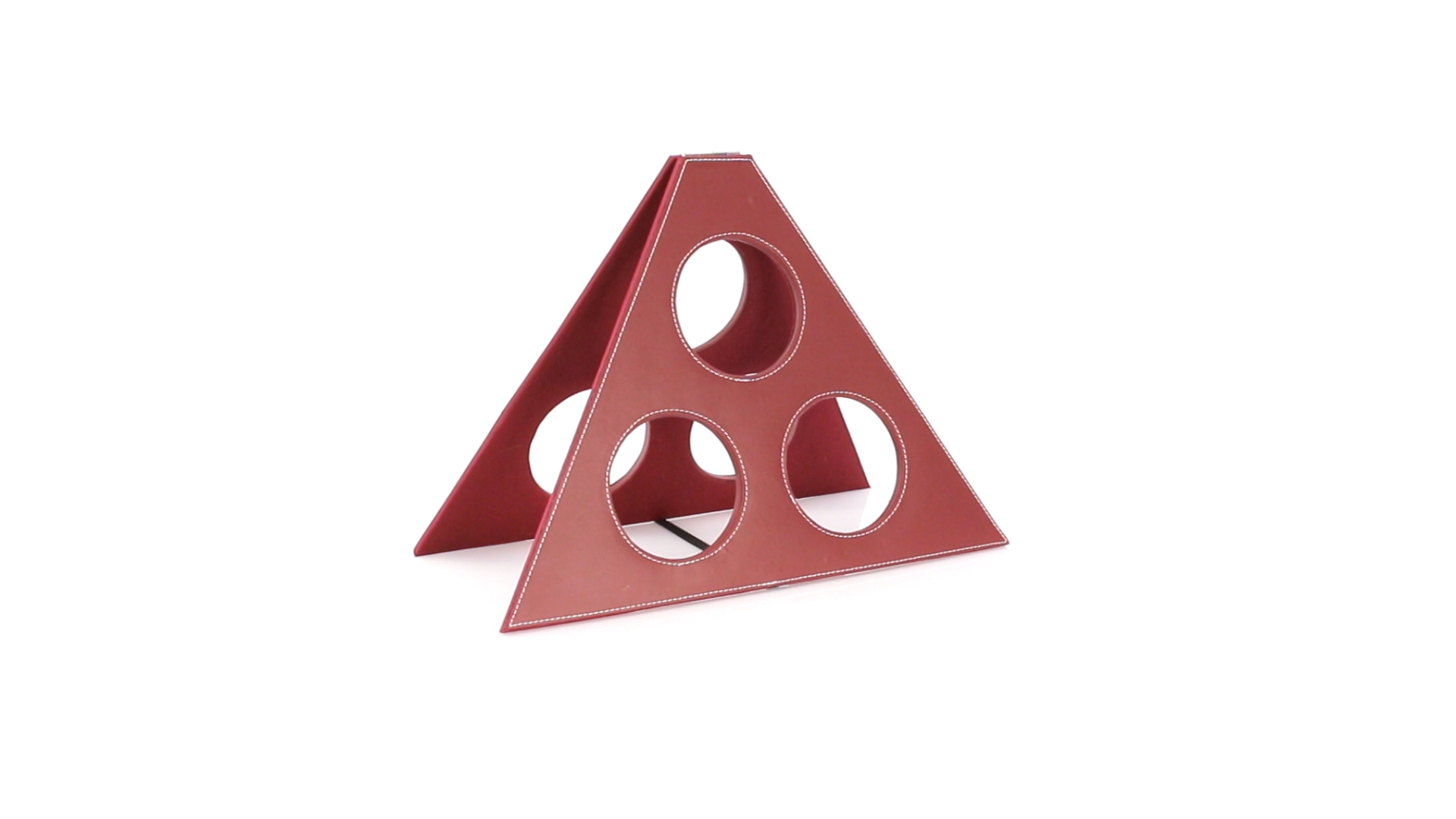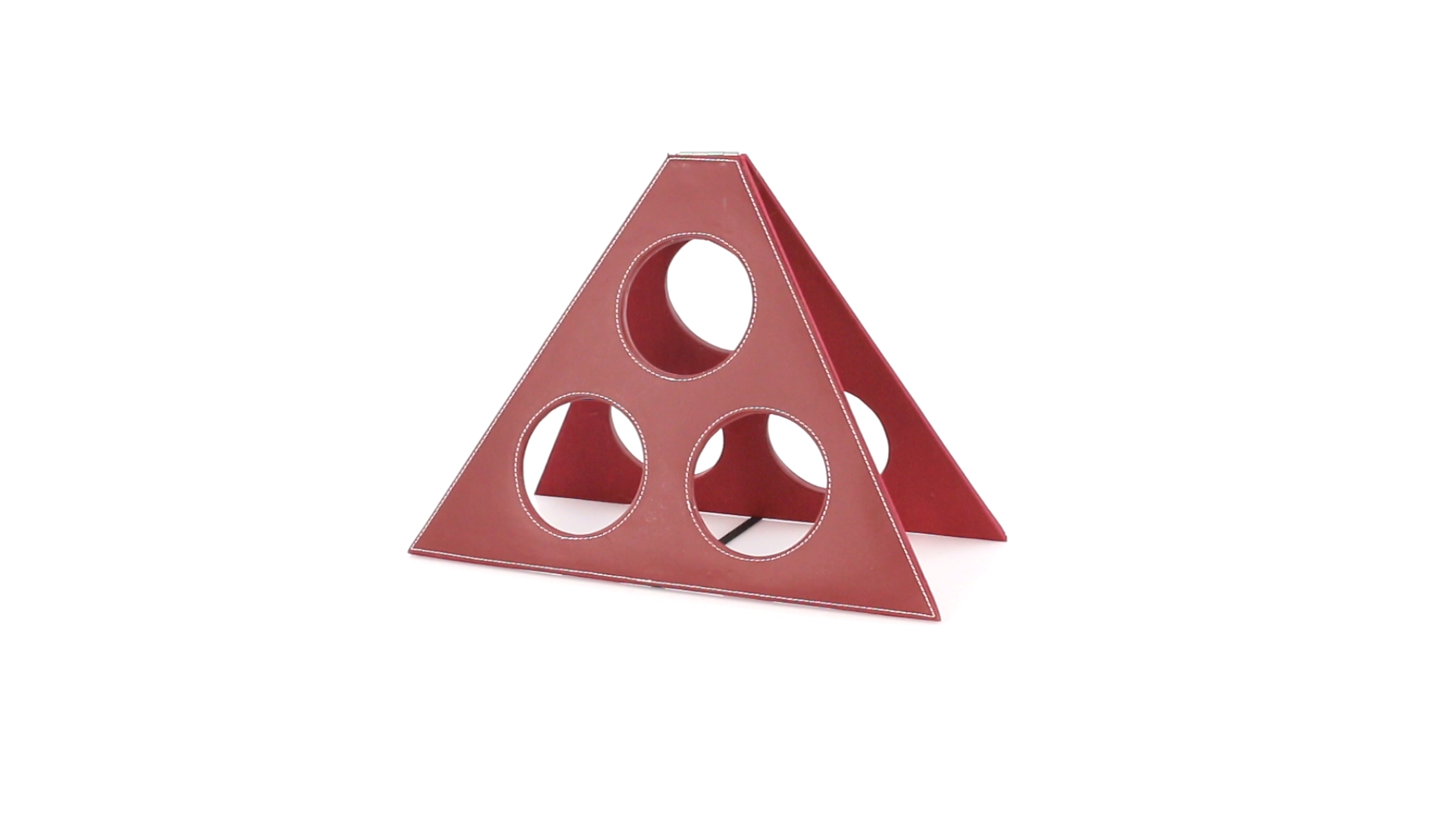 Klappbarer Flaschenständer für 3 Flaschen aus elegantem Kunstleder in schlichten Rosé- und Rottönen. Mit Verstärkungsnähten in Weiss.