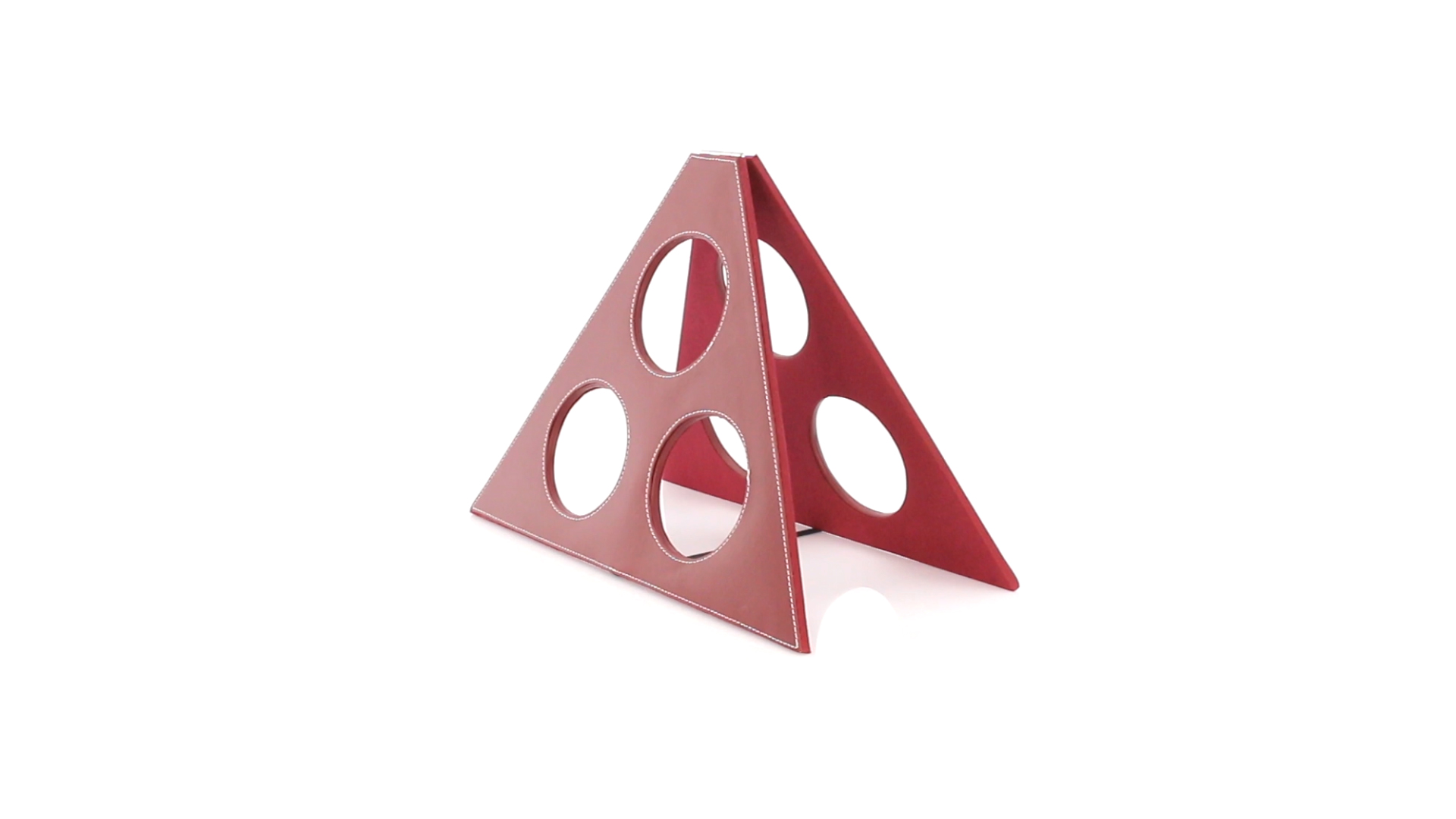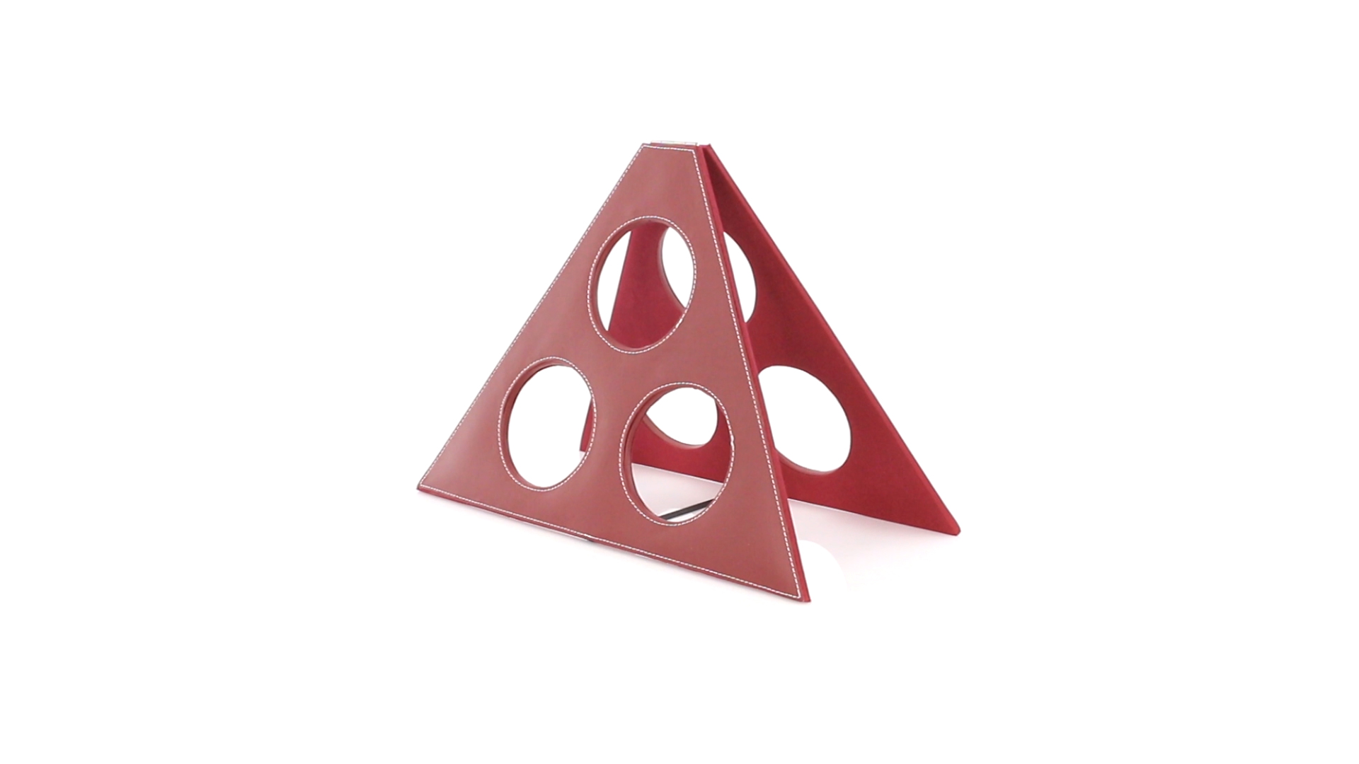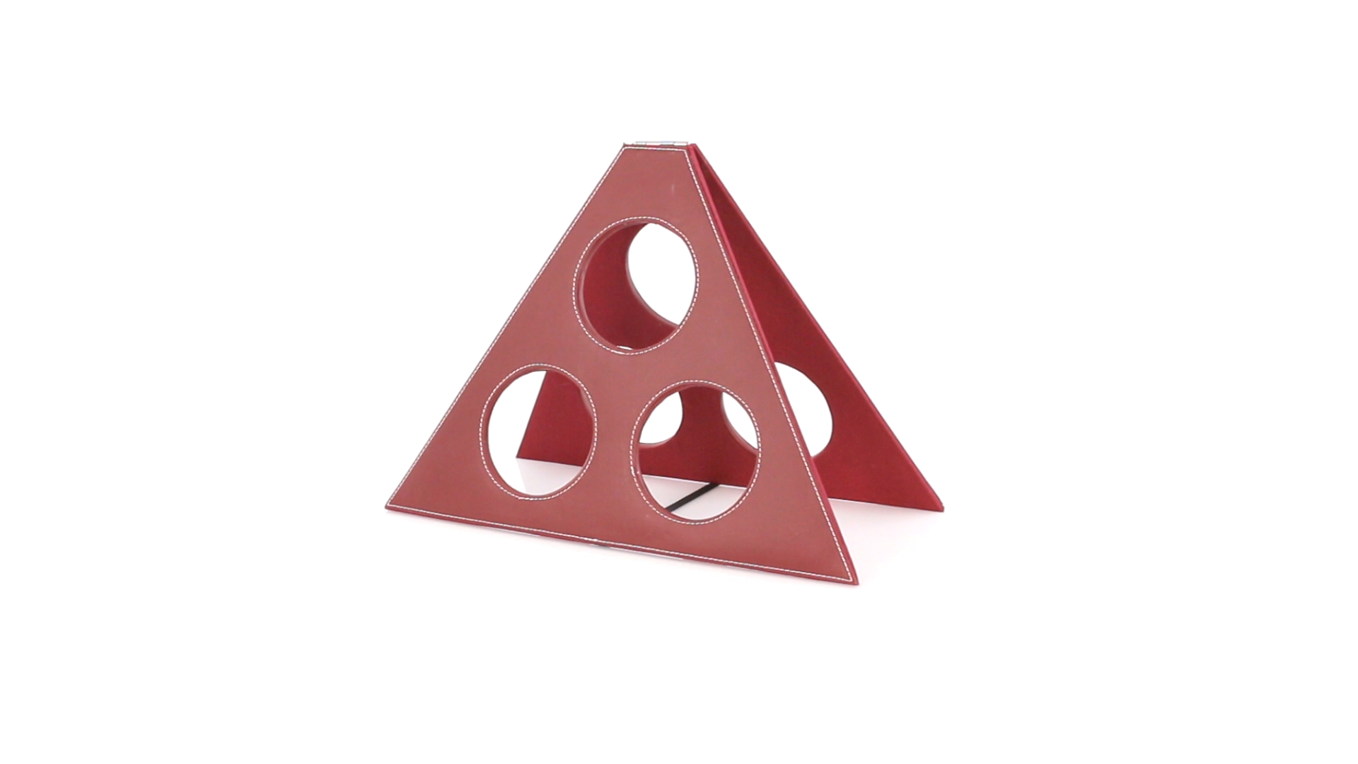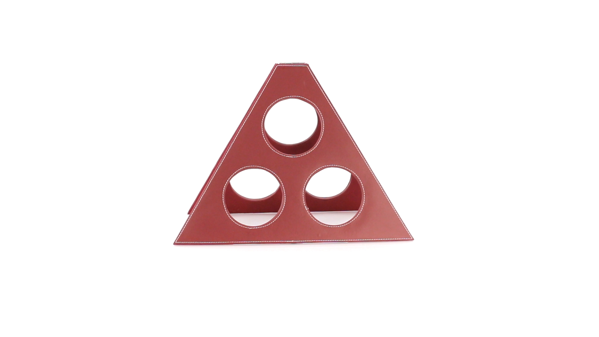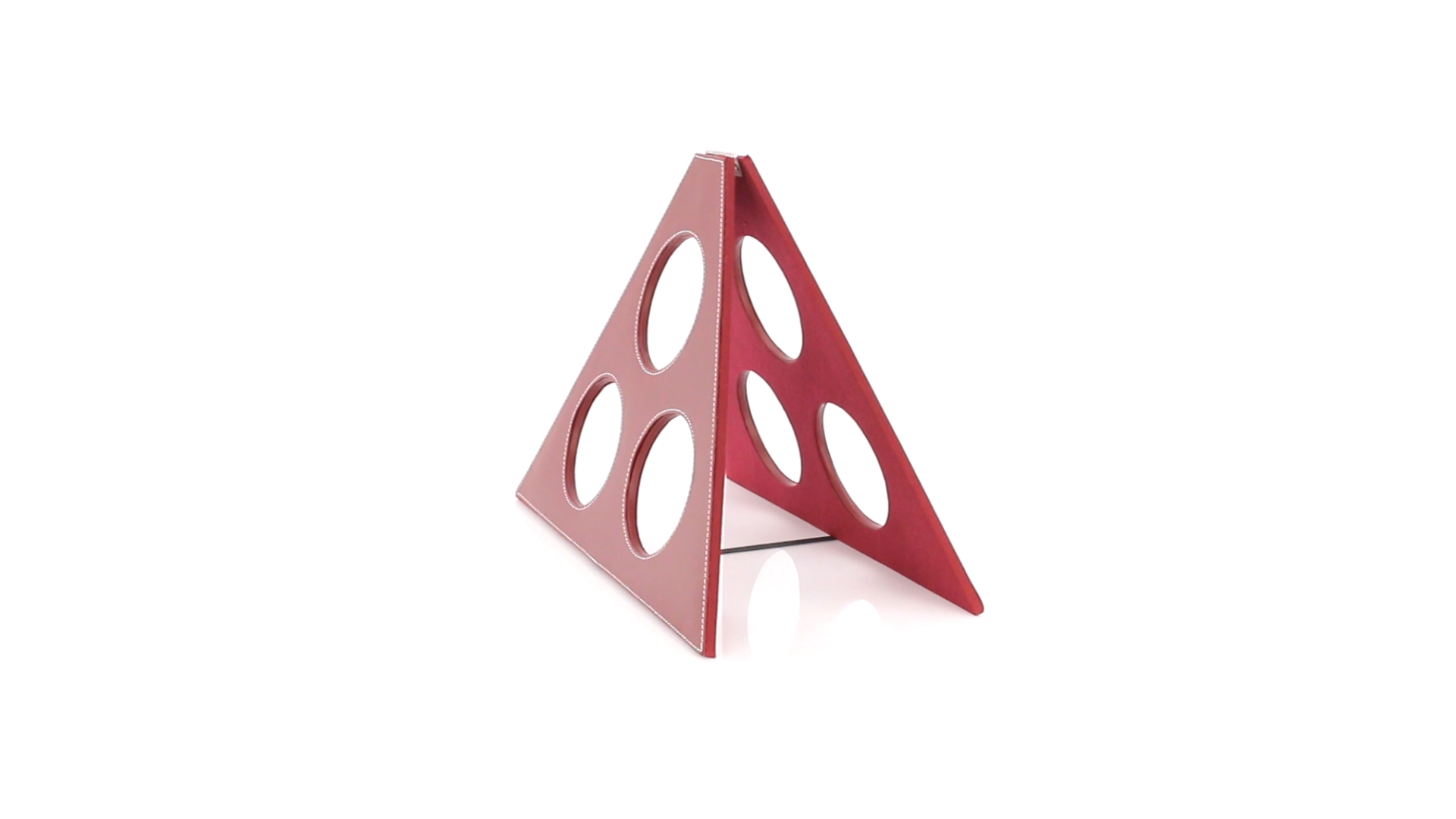 Klappbarer Flaschenständer für 3 Flaschen aus elegantem Kunstleder in schlichten Rosé- und Rottönen. Mit Verstärkungsnähten in Weiss.