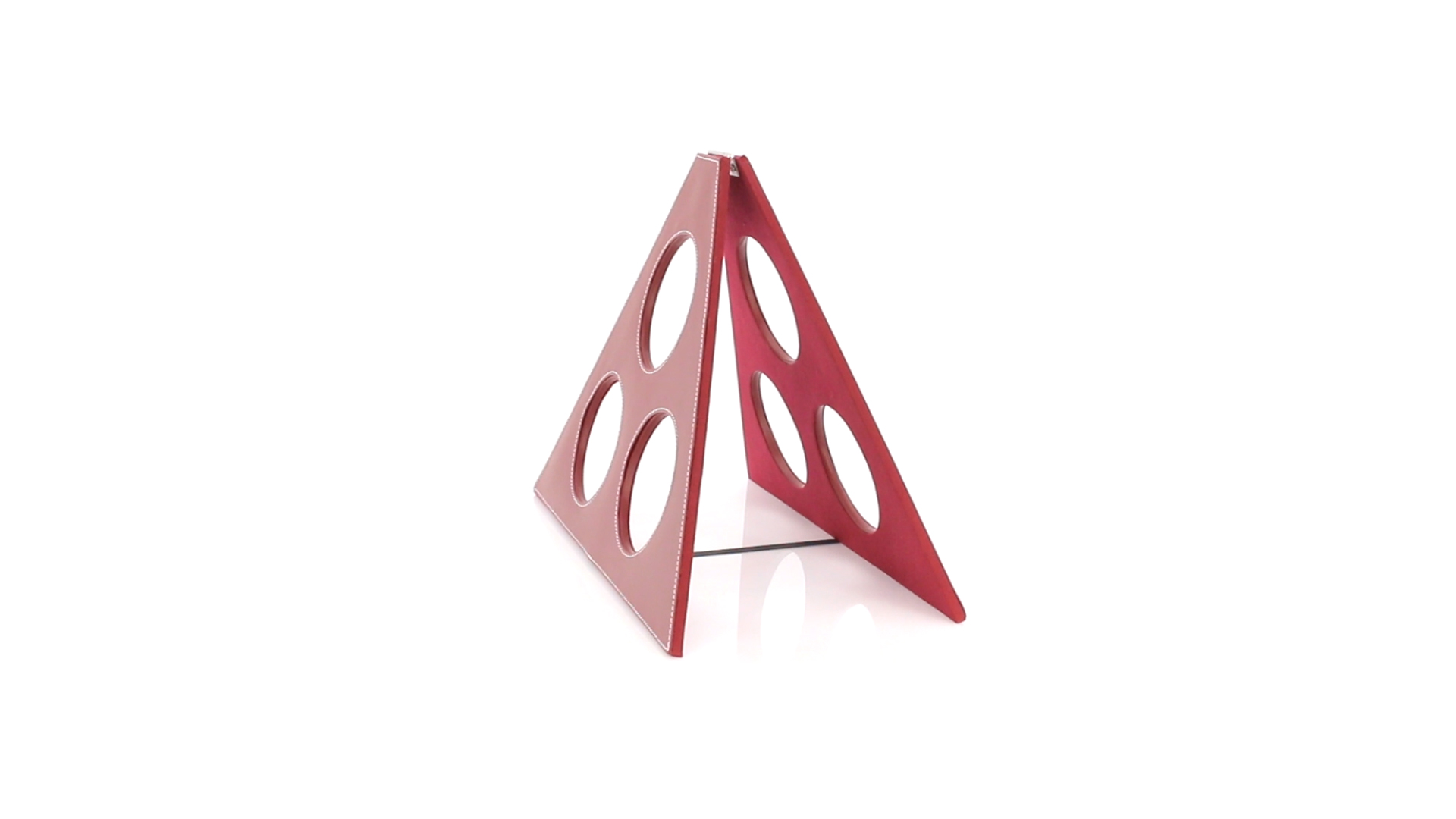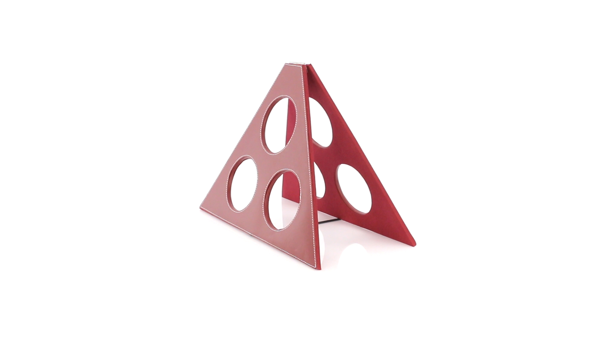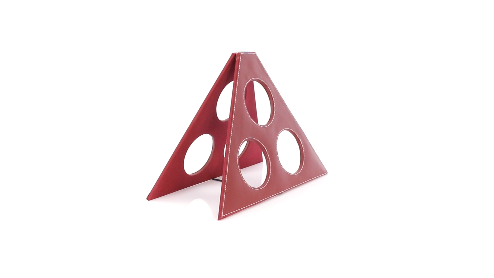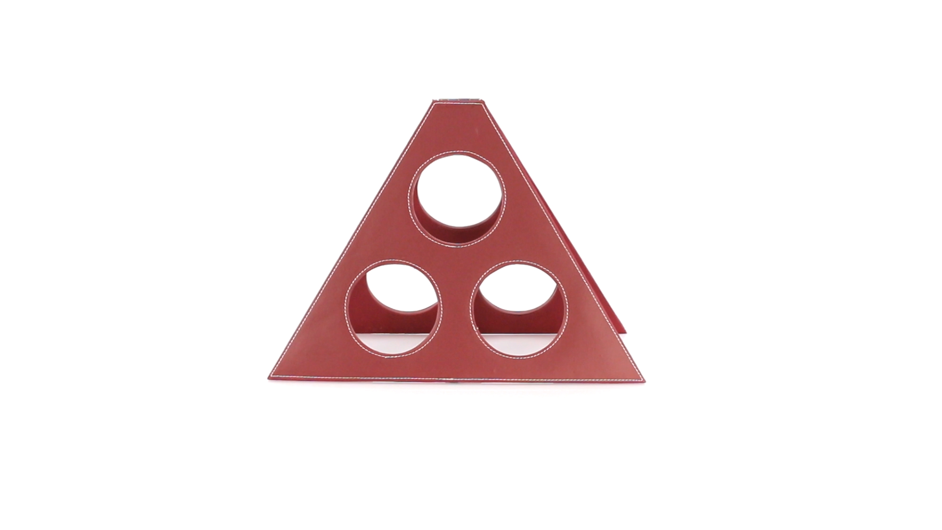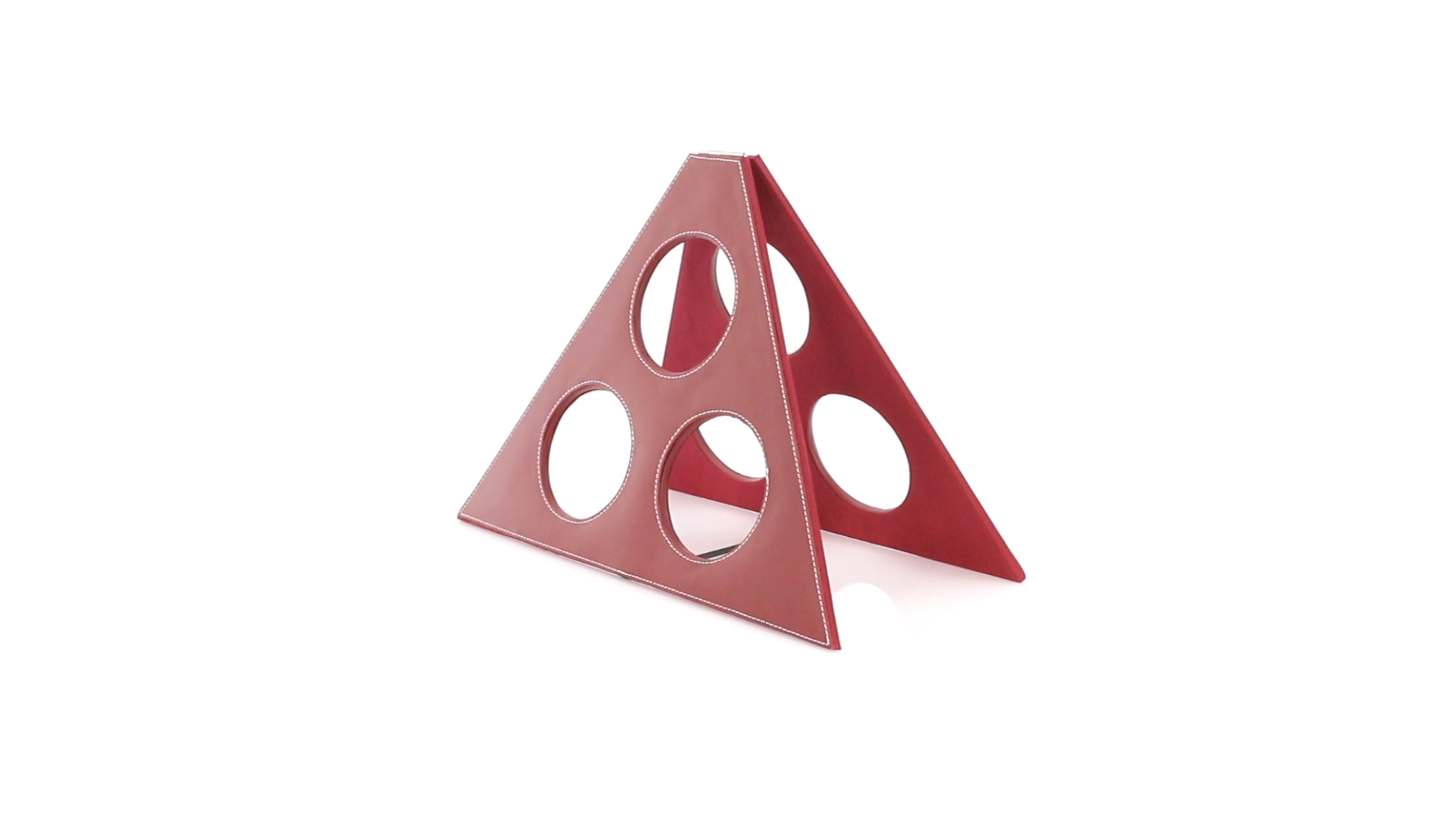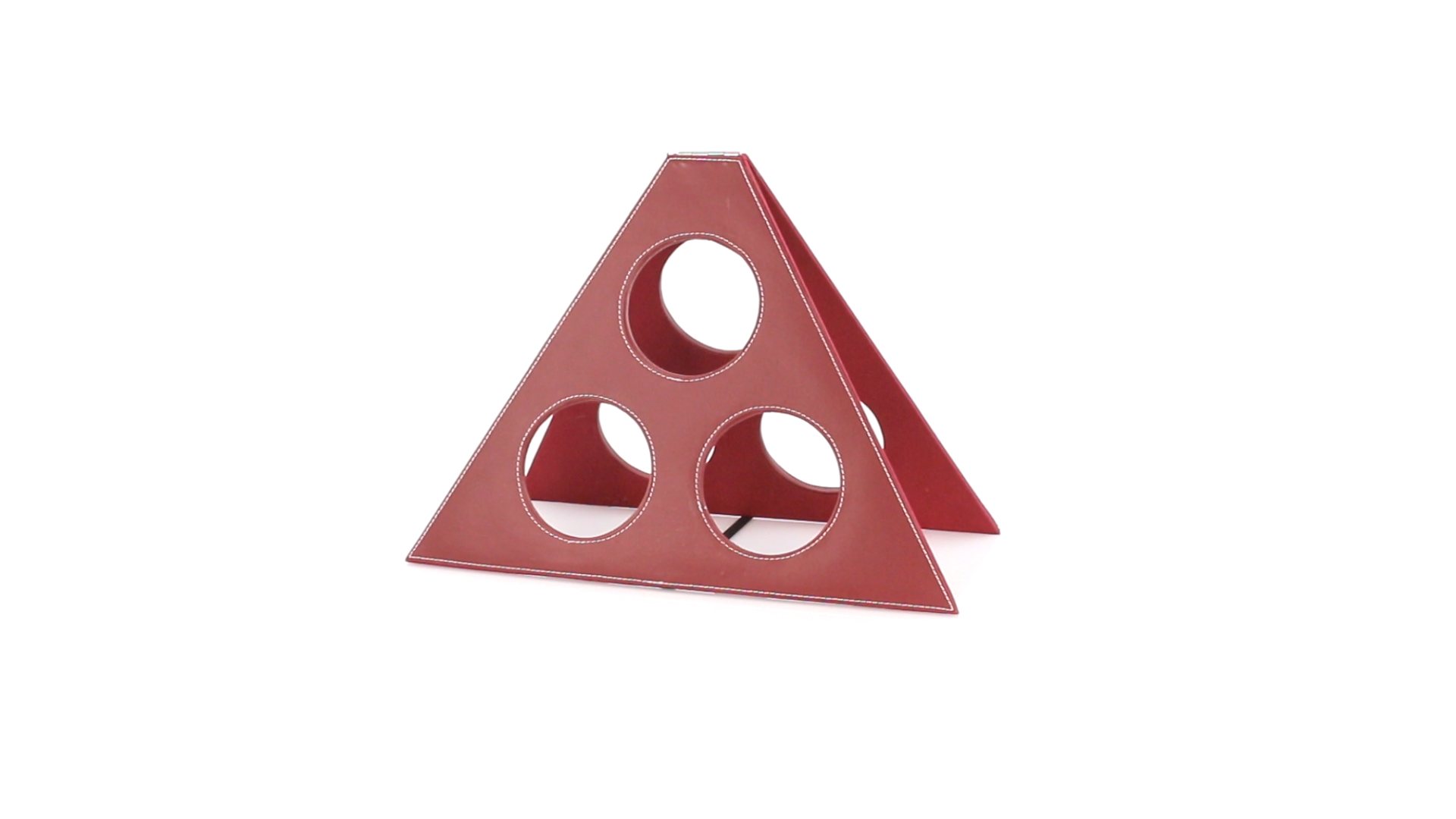 Klappbarer Flaschenständer für 3 Flaschen aus elegantem Kunstleder in schlichten Rosé- und Rottönen. Mit Verstärkungsnähten in Weiss.