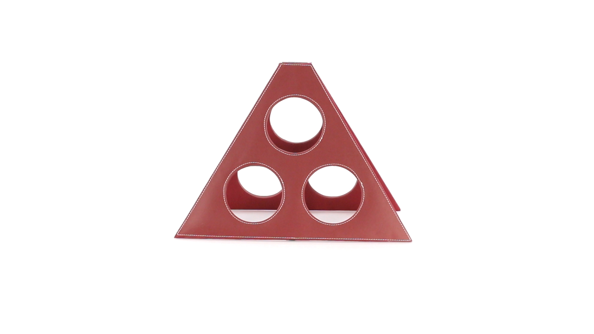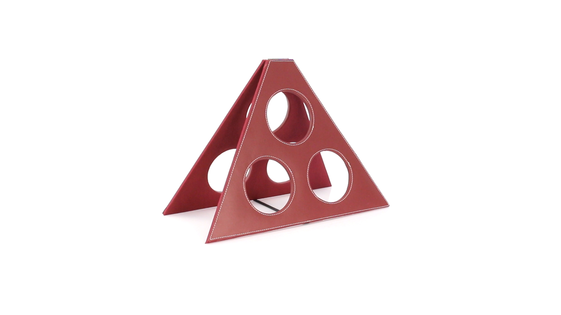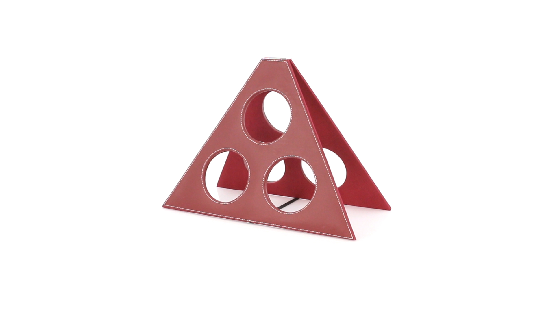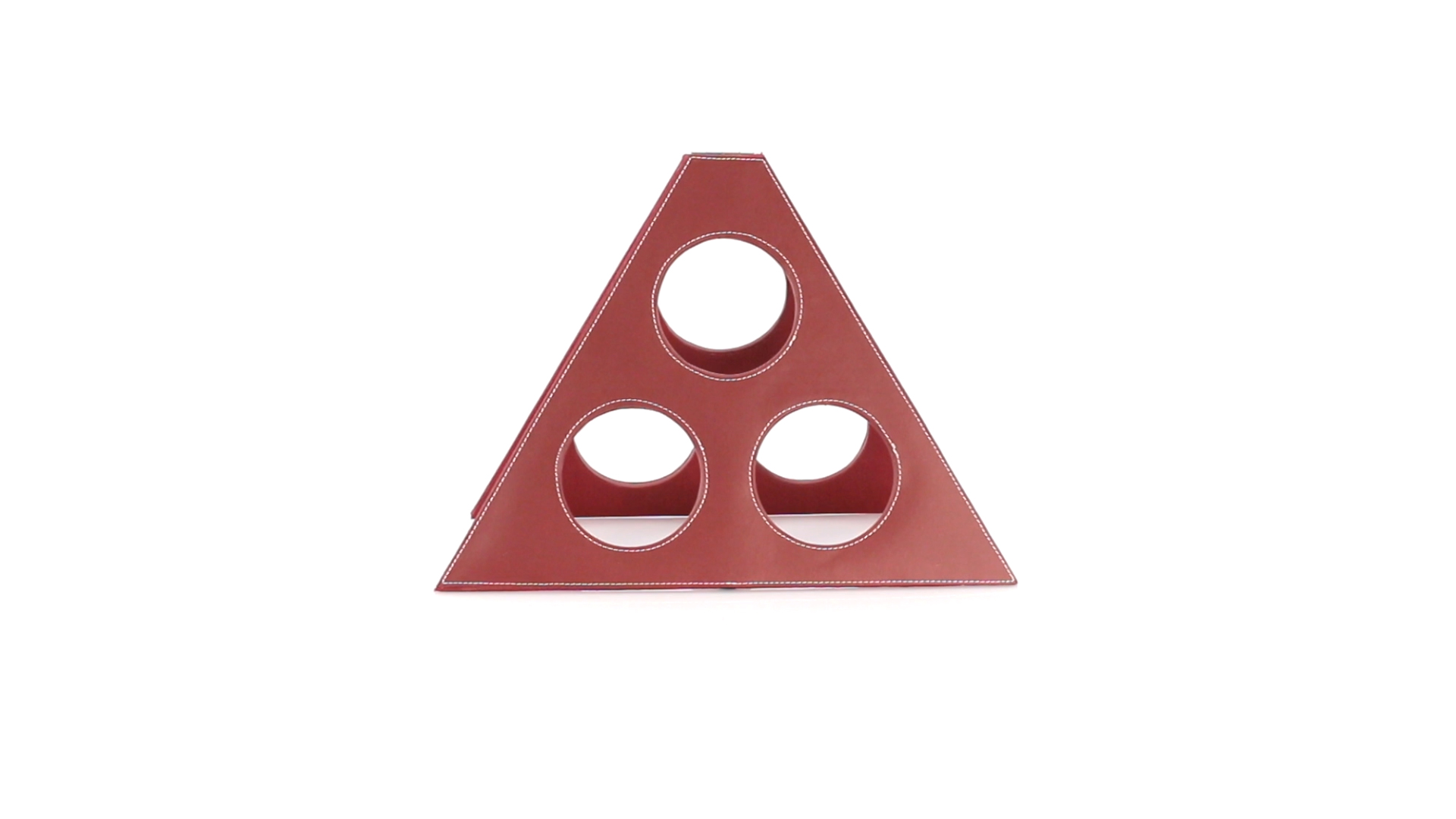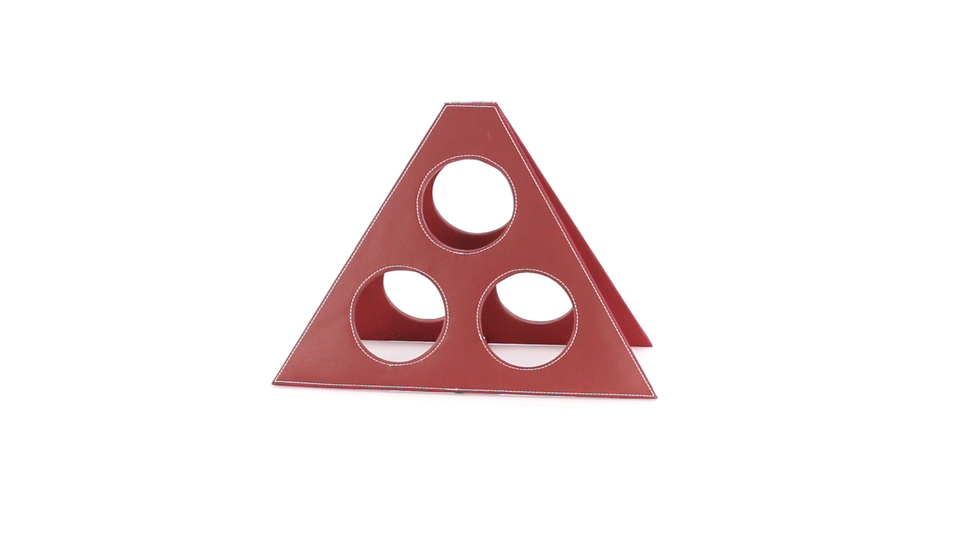 Klappbarer Flaschenständer für 3 Flaschen aus elegantem Kunstleder in schlichten Rosé- und Rottönen. Mit Verstärkungsnähten in Weiss.