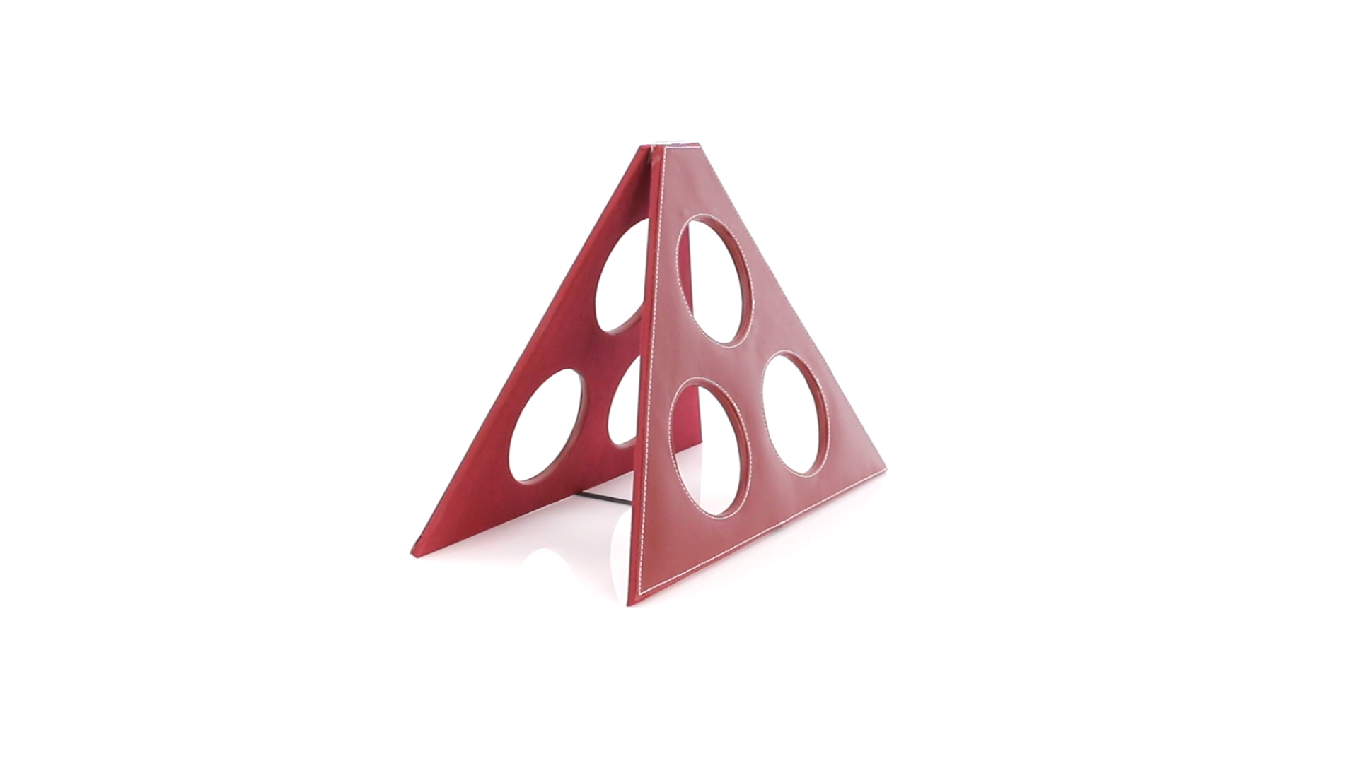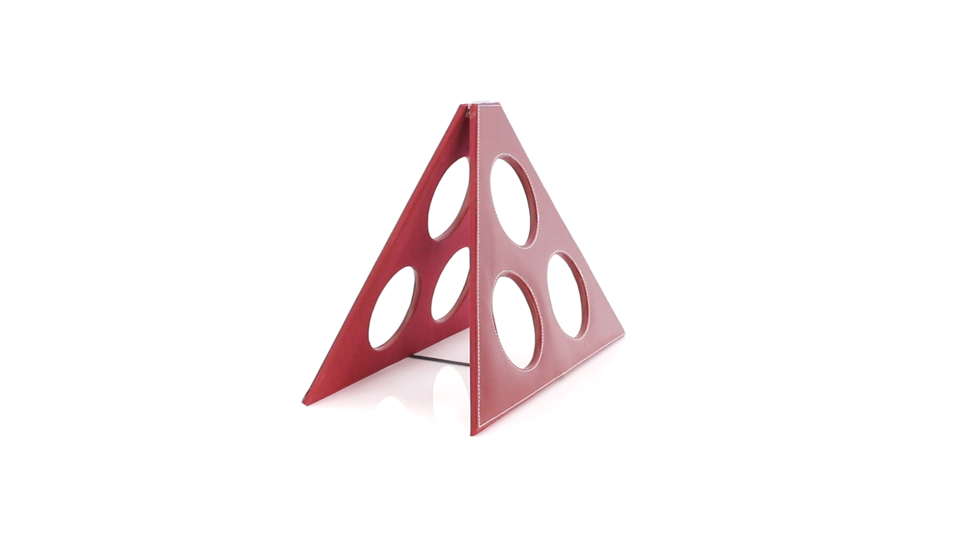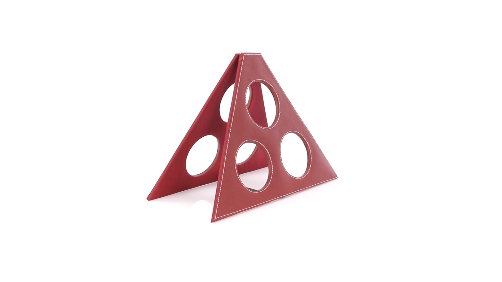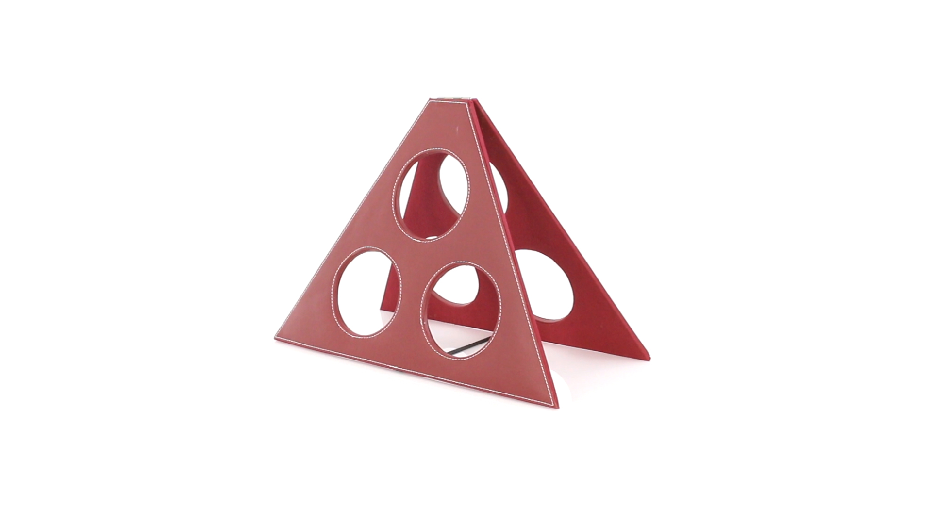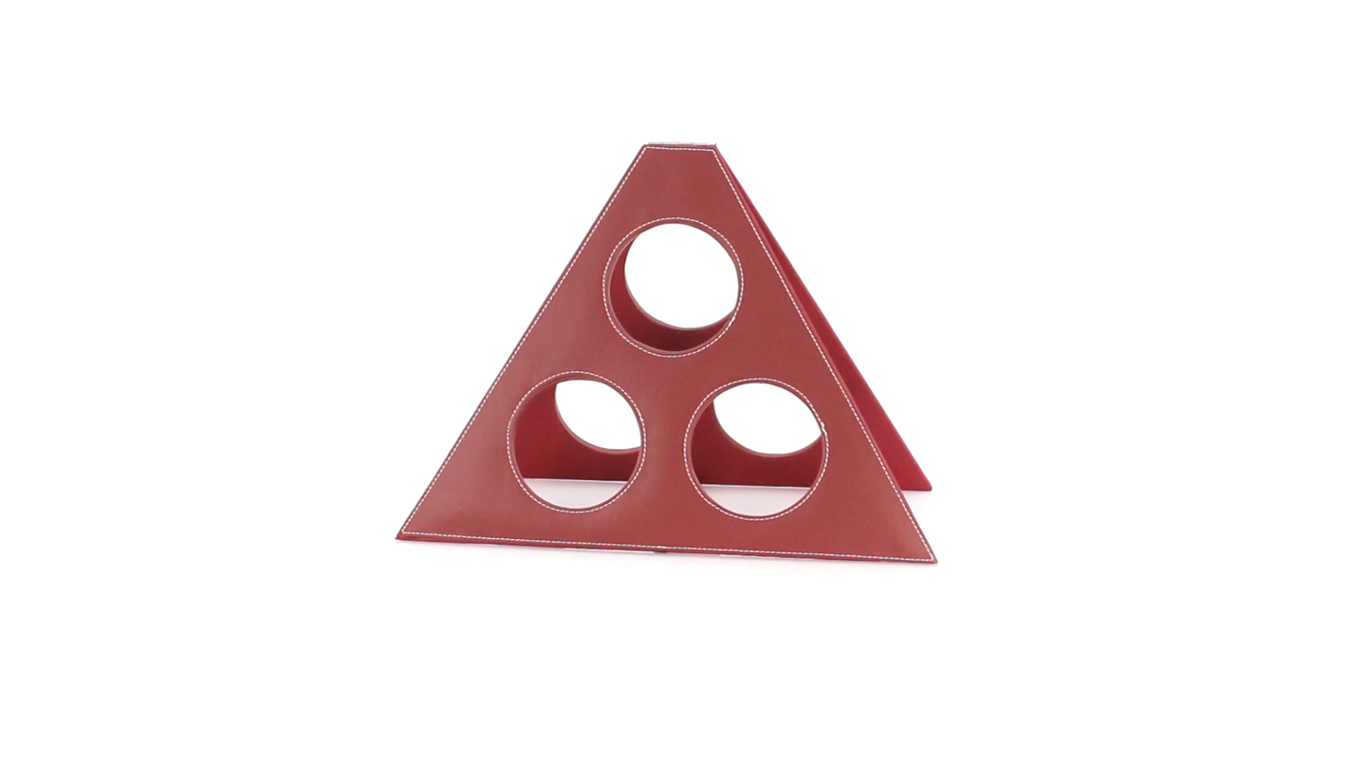 Klappbarer Flaschenständer für 3 Flaschen aus elegantem Kunstleder in schlichten Rosé- und Rottönen. Mit Verstärkungsnähten in Weiss.