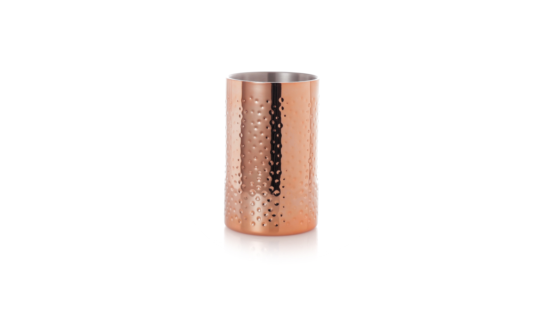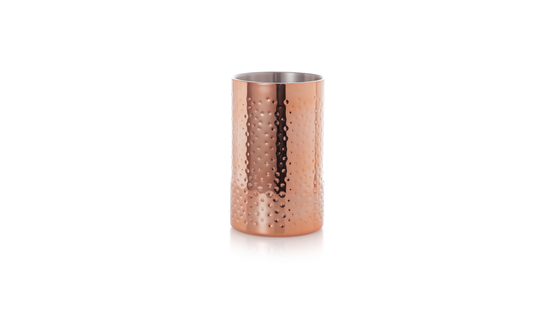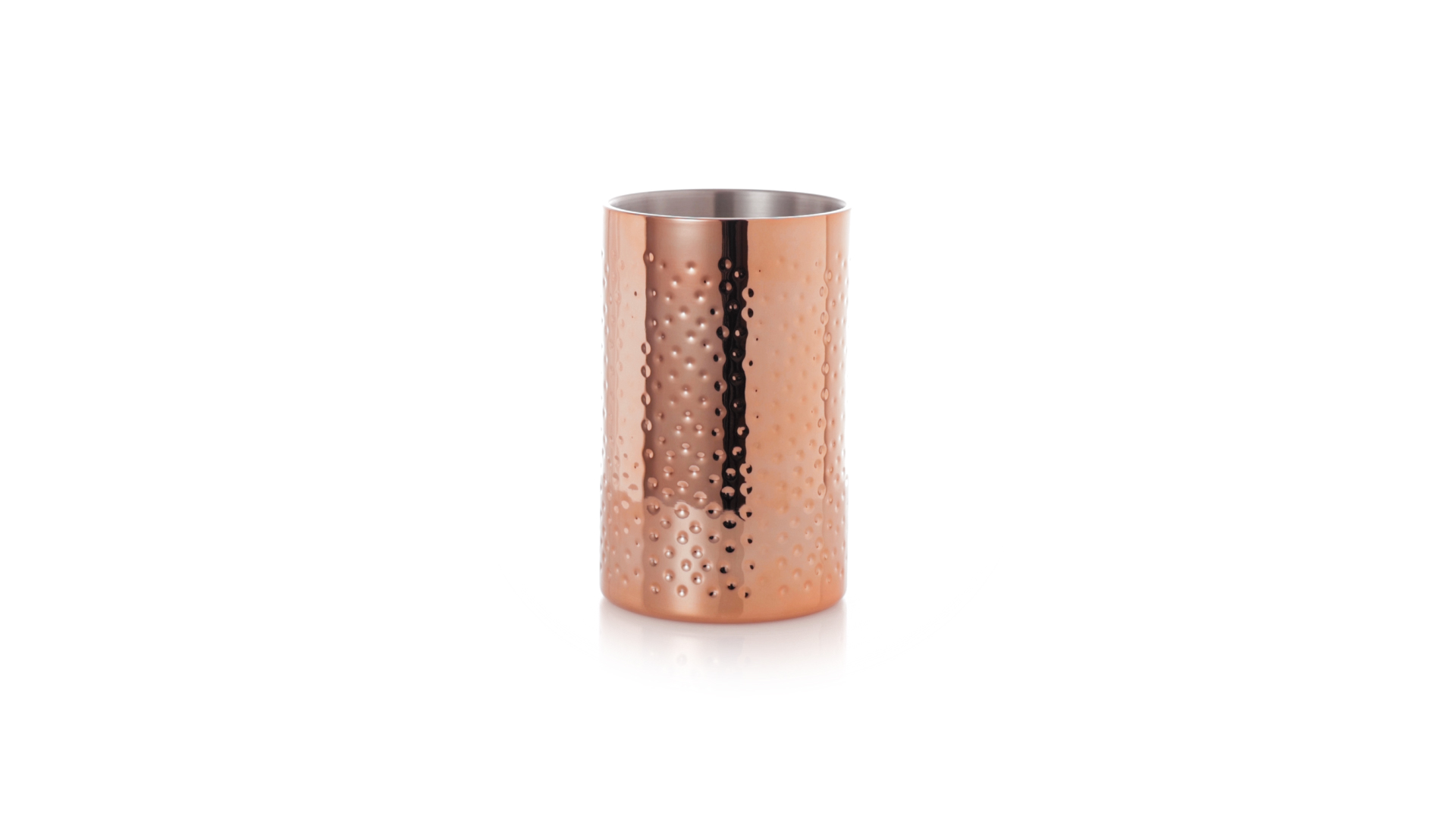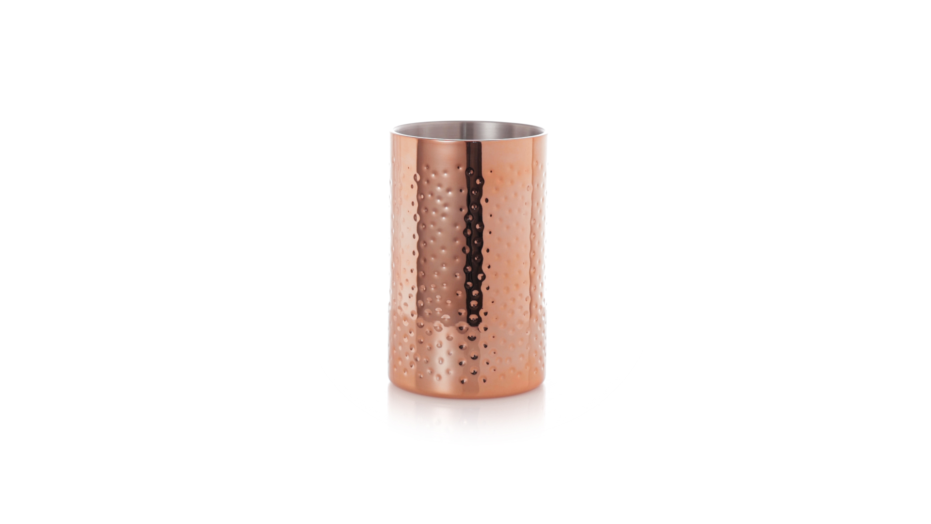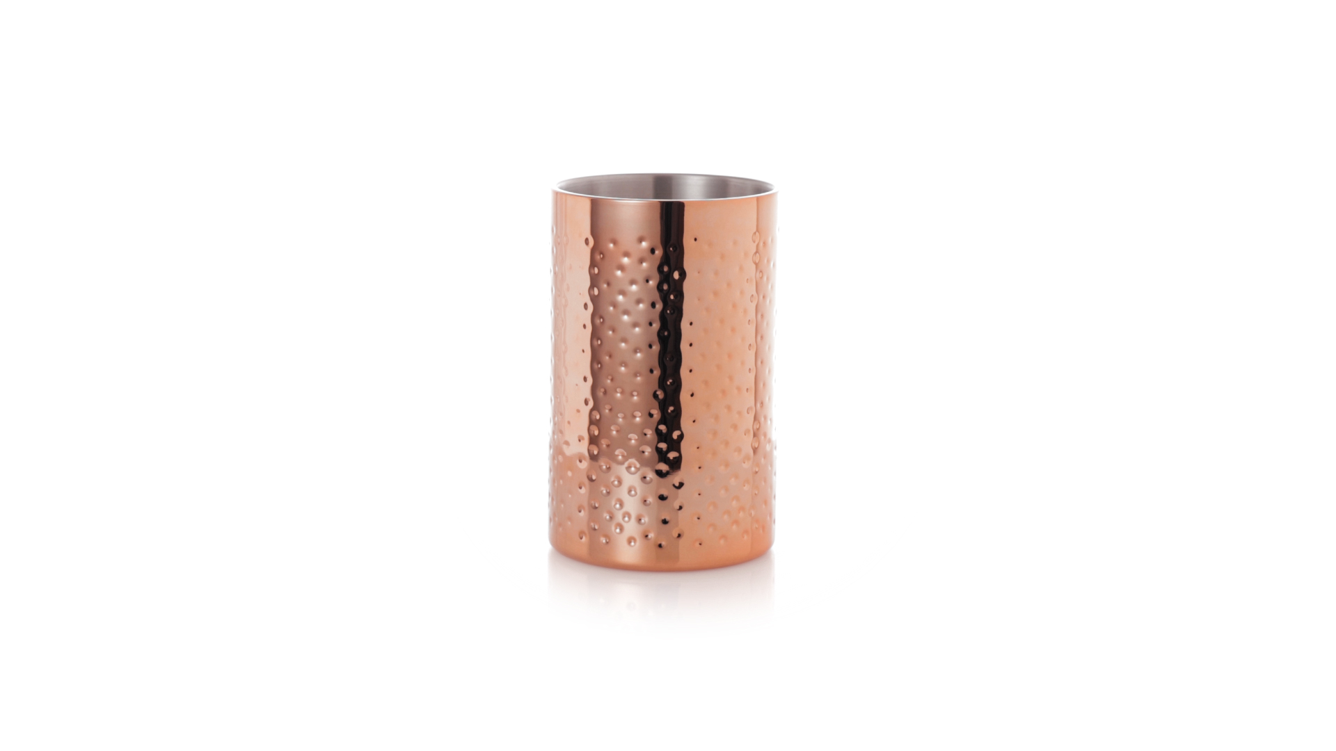 Eleganter Kühler mit 1 Liter Fassungsvermögen aus Edelstahl mit verzinkter Kupferbeschichtung. Mit seinem originellen Design und der glänzenden Oberfläche ist es ein perfektes Accessoire, um kalte Getränke stilvoll zu präsentieren. Präsentiert in einer exklusiven individuellen schwarzen Designbox.