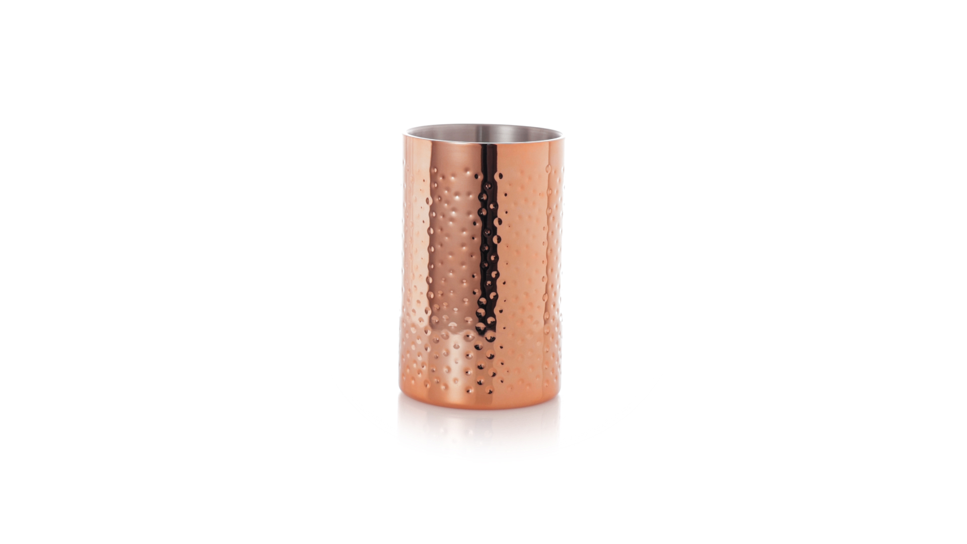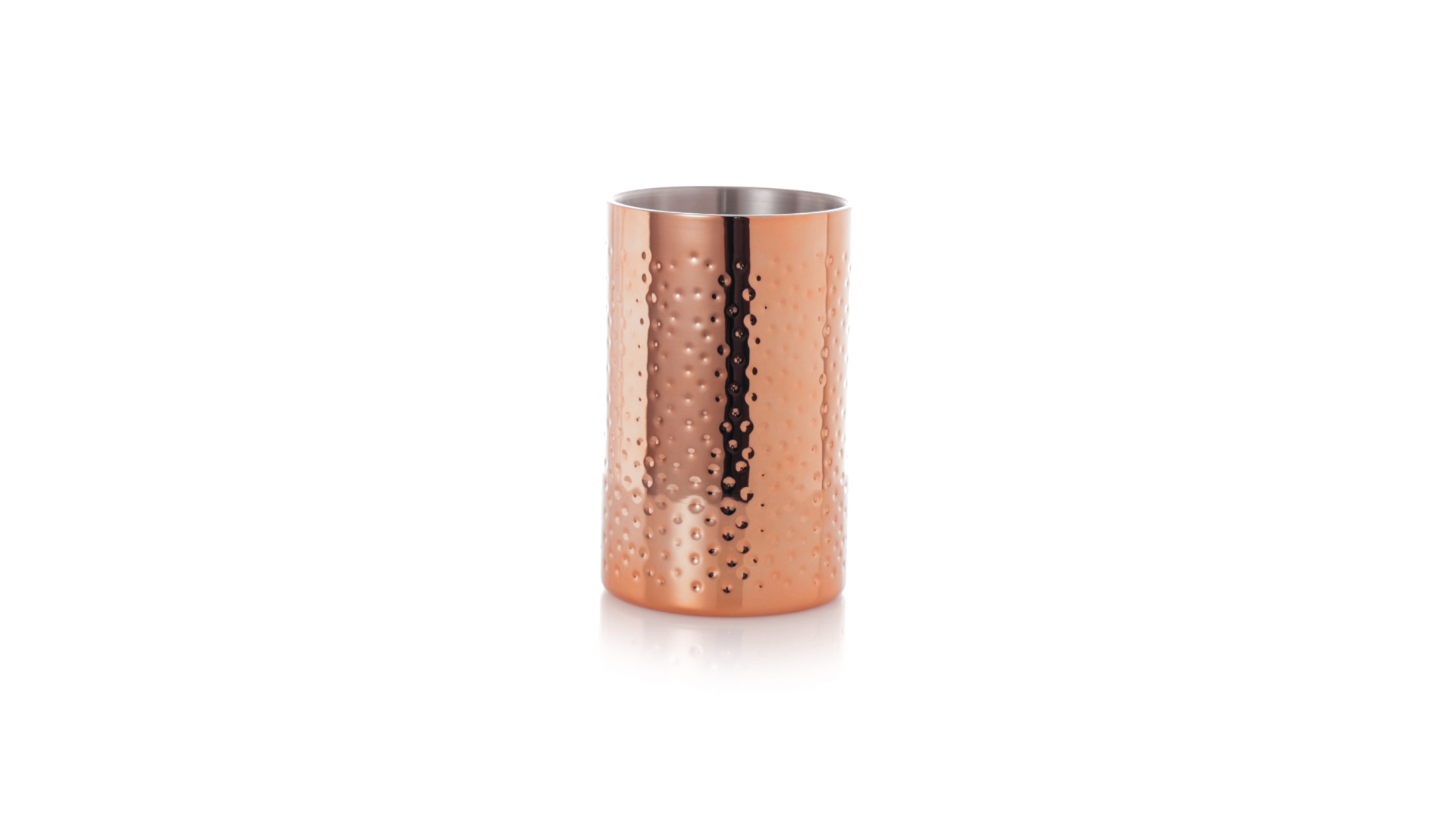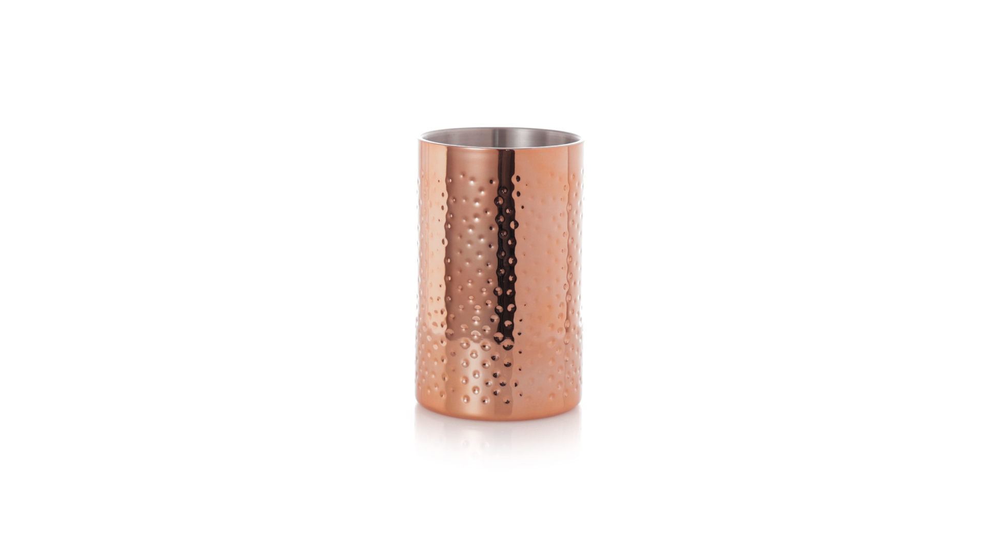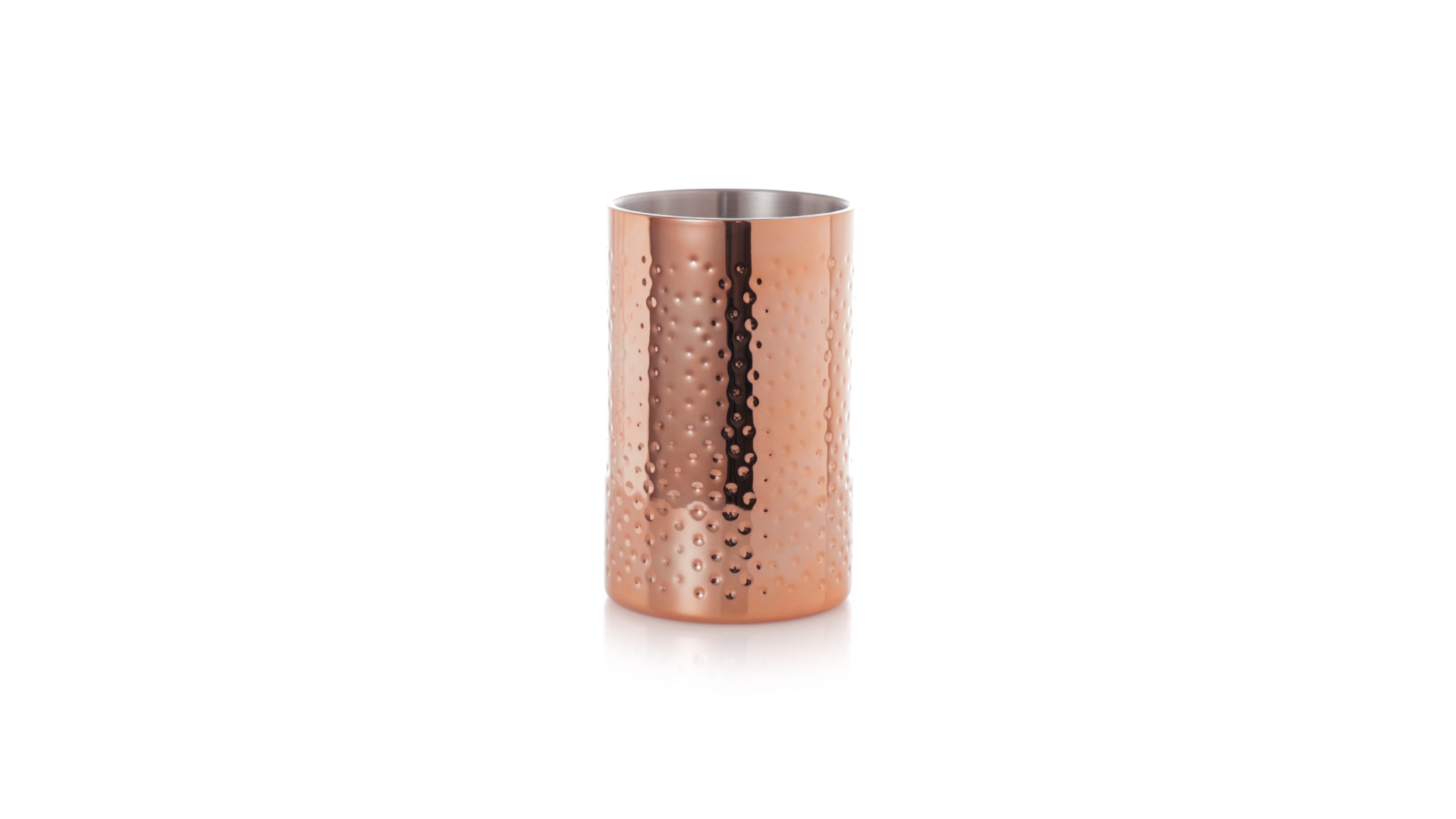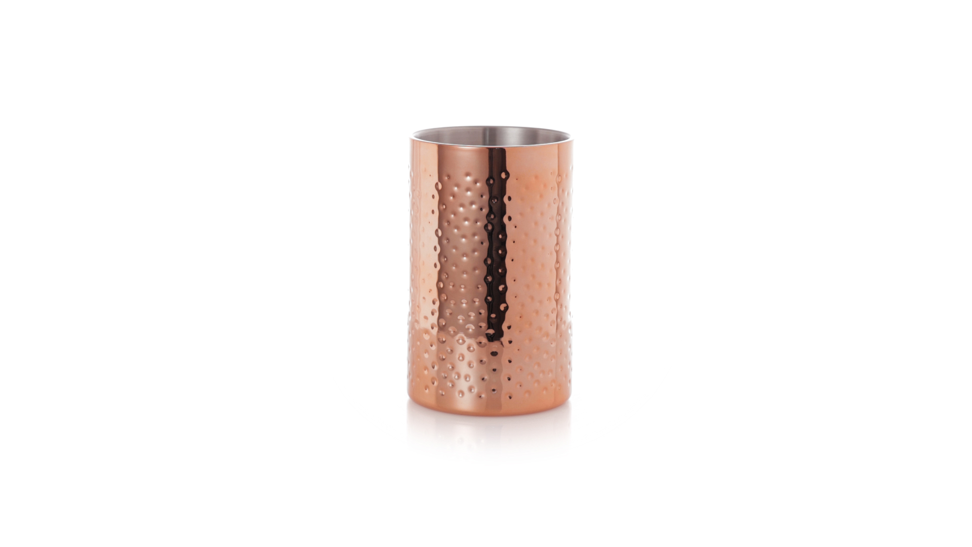 Eleganter Kühler mit 1 Liter Fassungsvermögen aus Edelstahl mit verzinkter Kupferbeschichtung. Mit seinem originellen Design und der glänzenden Oberfläche ist es ein perfektes Accessoire, um kalte Getränke stilvoll zu präsentieren. Präsentiert in einer exklusiven individuellen schwarzen Designbox.