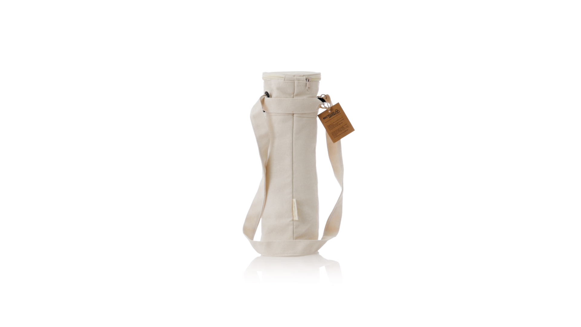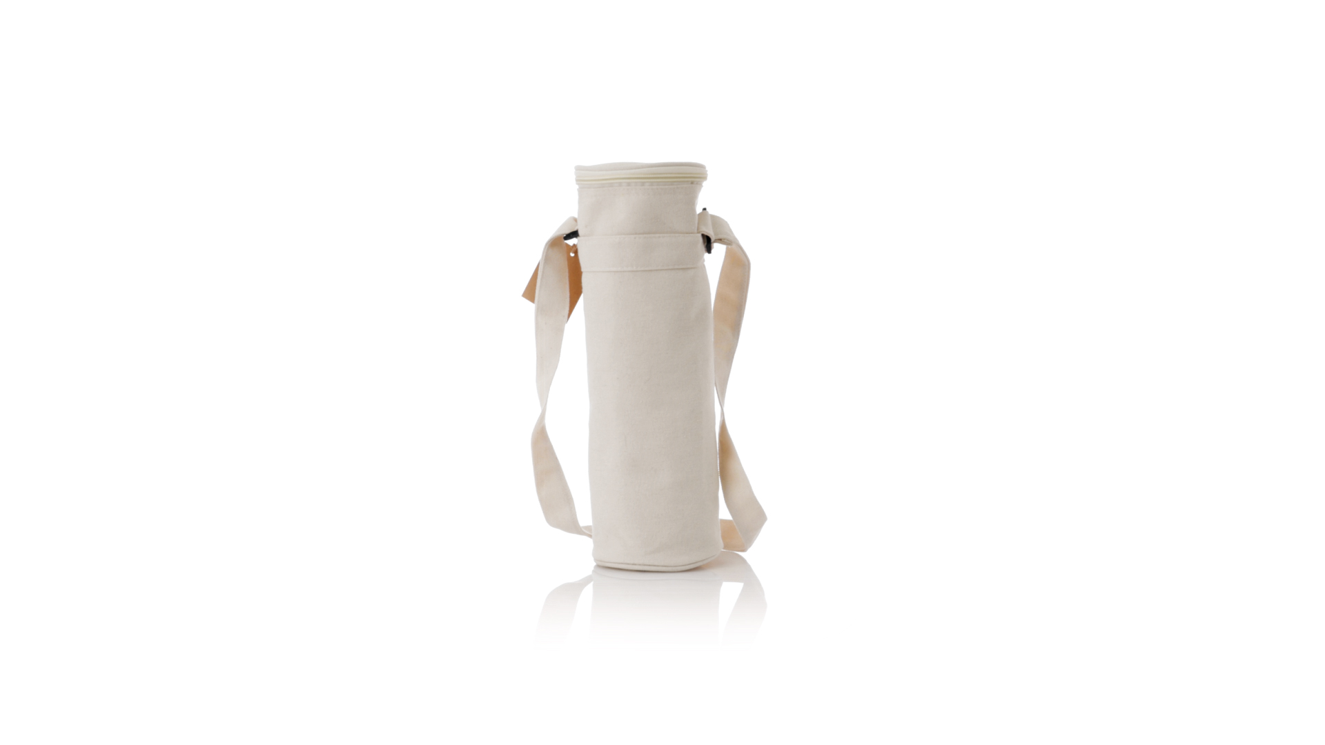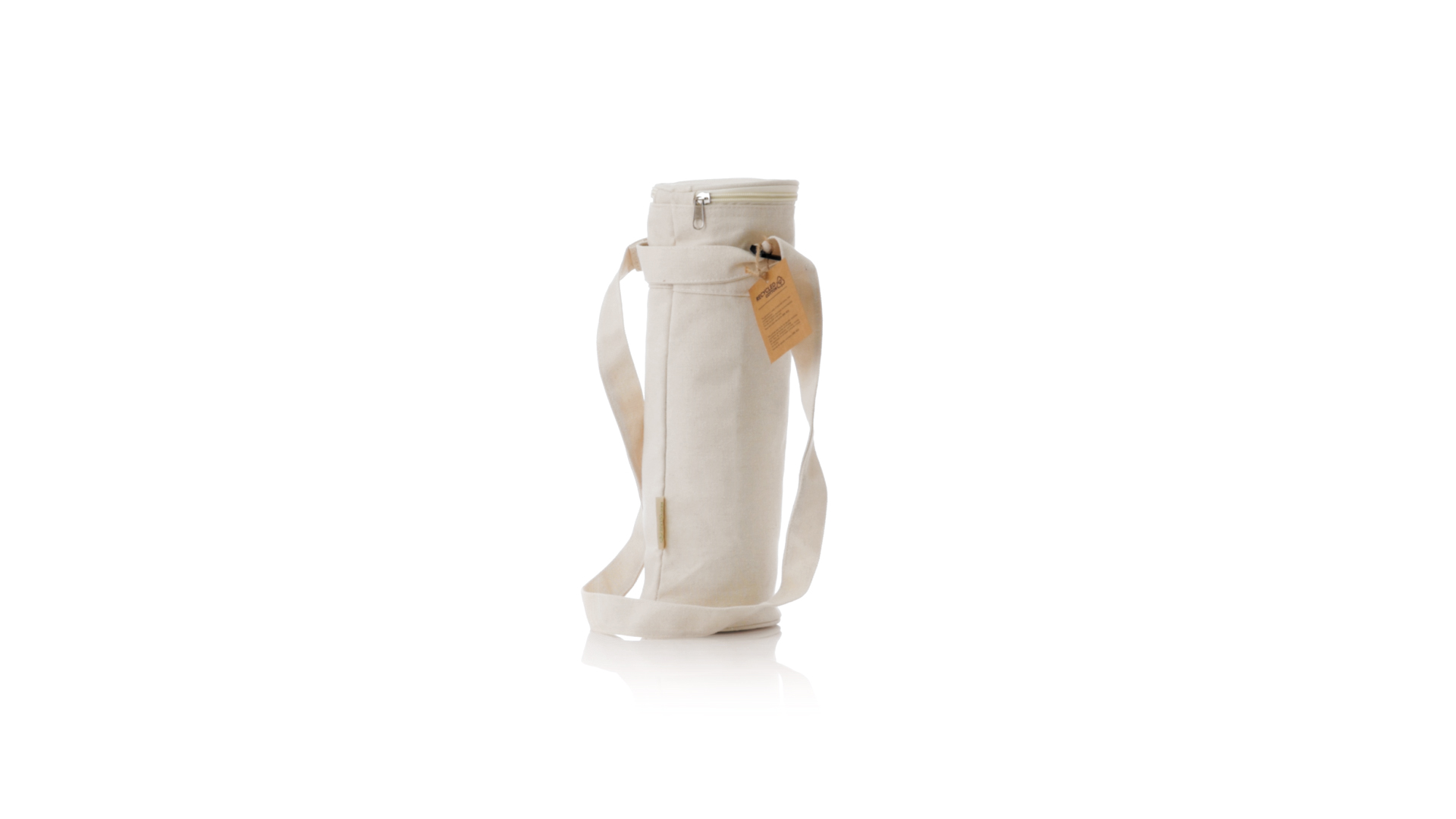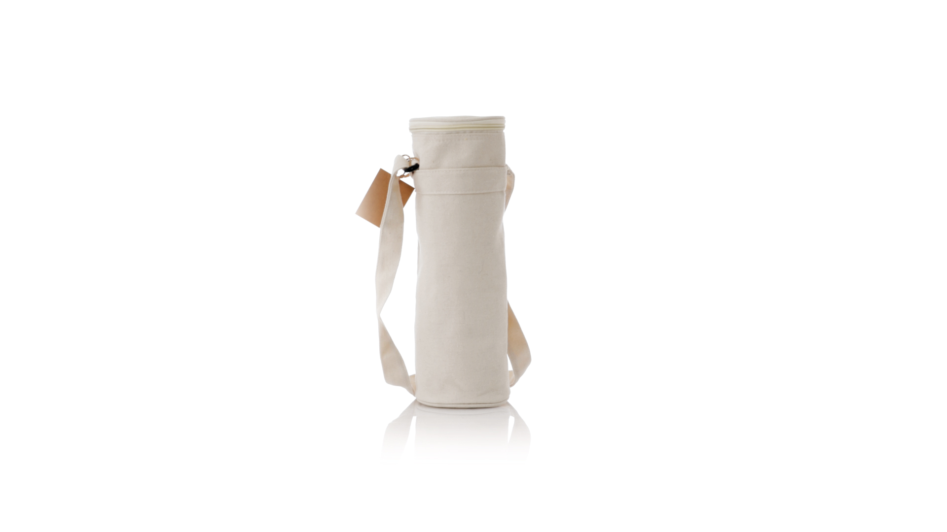 Thermotasche für den Transport von Flaschen bis zu 1,5 l, hergestellt aus 100 % recycelter Baumwolle. Es wird mit einem Reissverschluss geschlossen und mit dem verstellbaren Schultergurt in Naturton bequem getragen. Die Innenseite ist mit isothermischem Aluminiummaterial ausgekleidet und mit einem Etikett aus recycelter Baumwolle versehen. Einzeln in einer recycelten Tasche präsentiert.