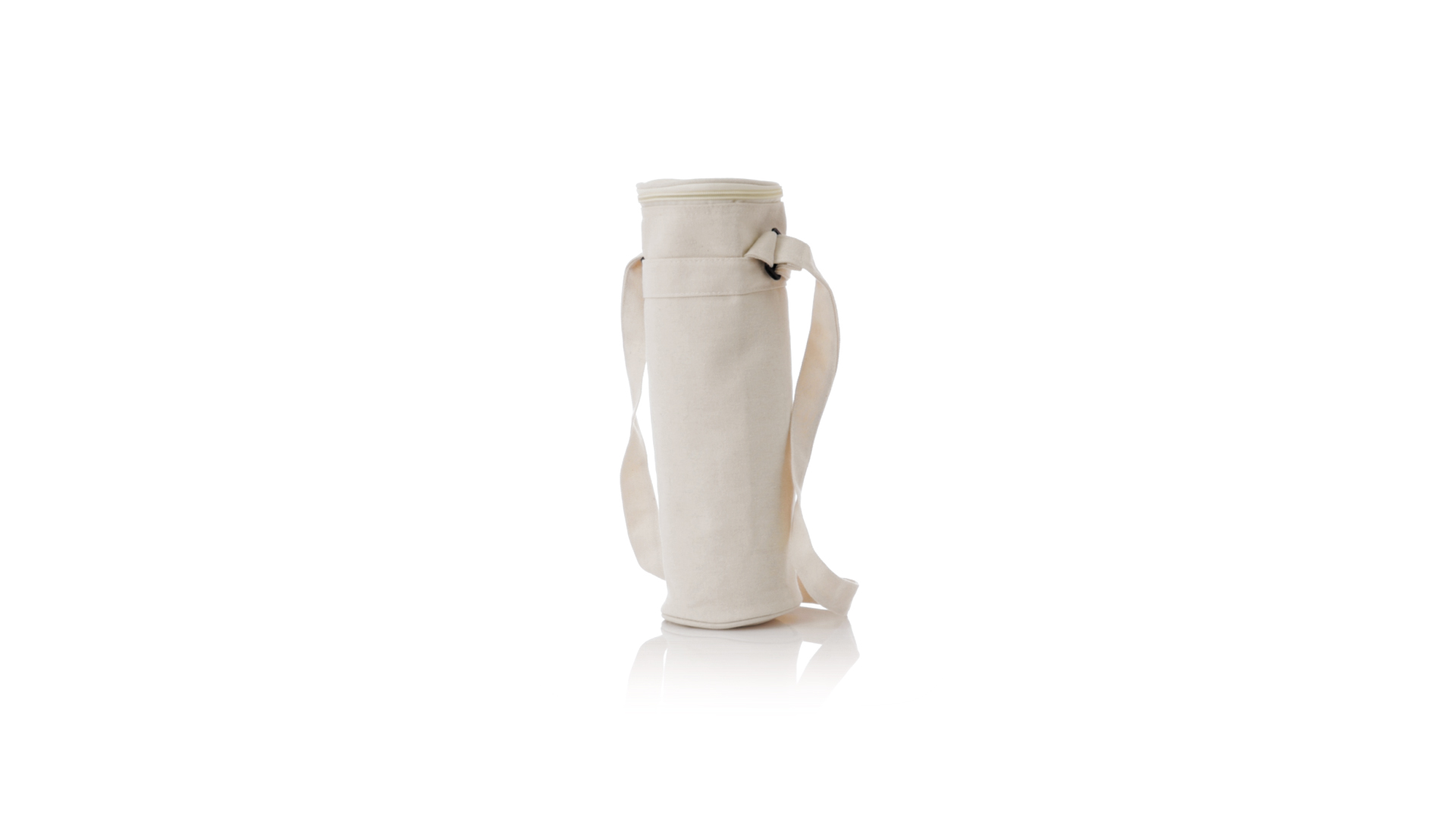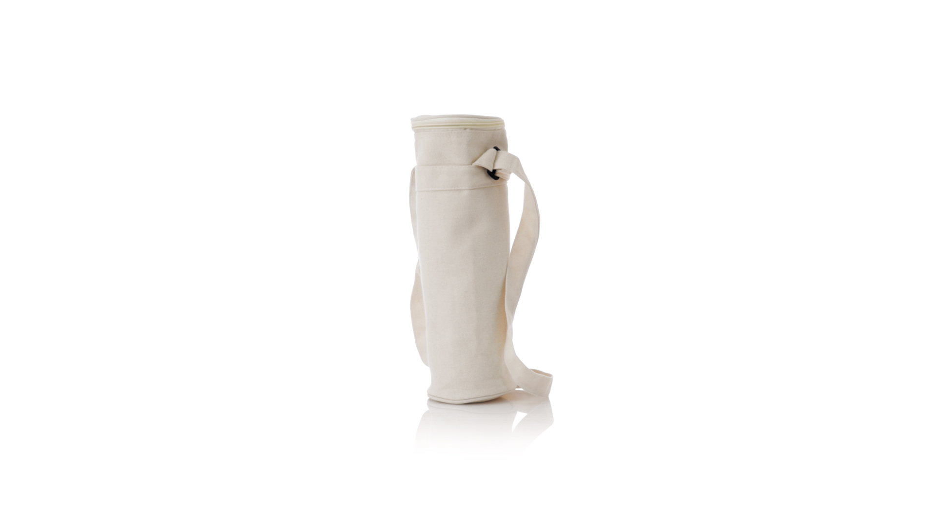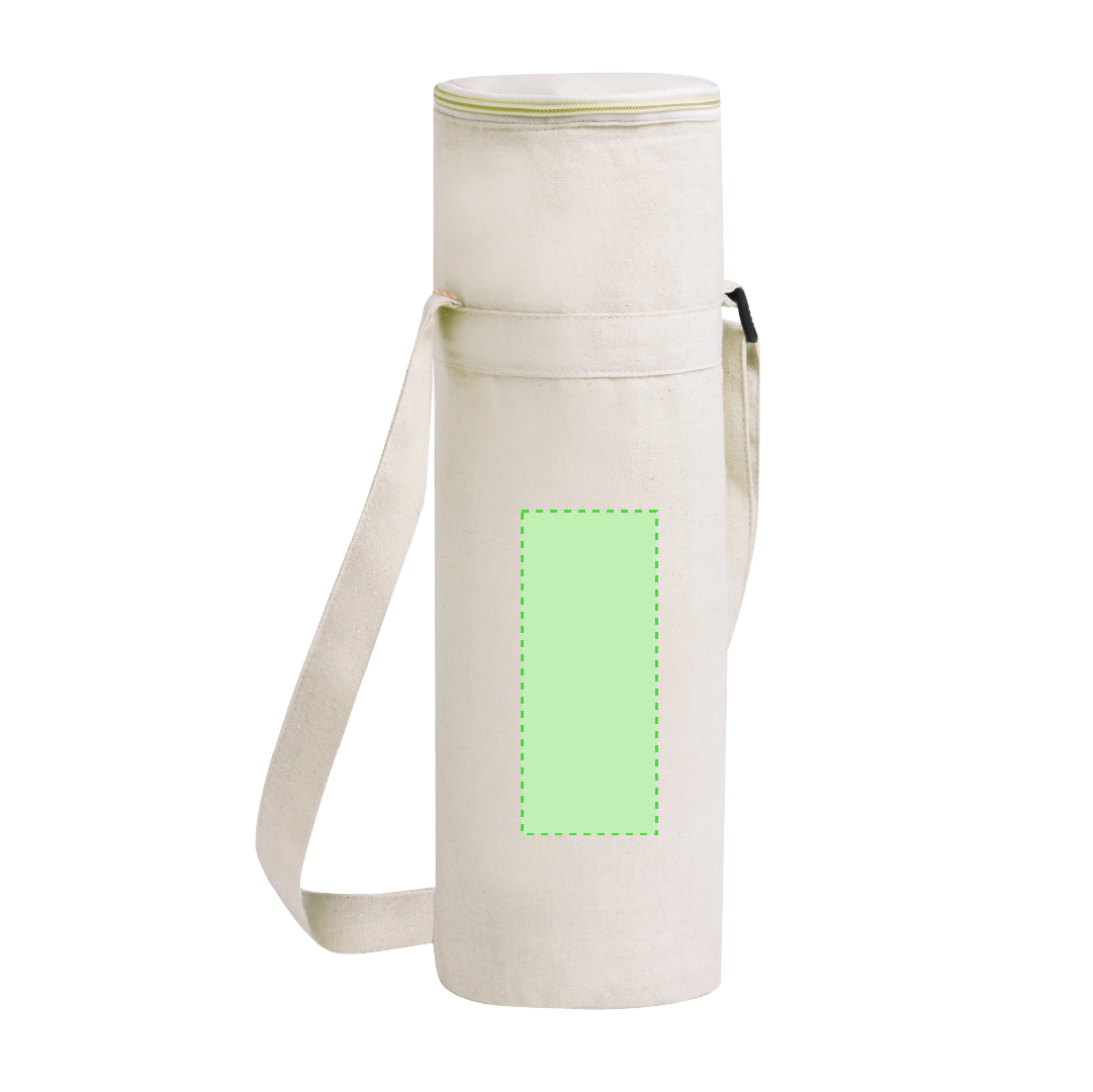 Thermotasche für den Transport von Flaschen bis zu 1,5 l, hergestellt aus 100 % recycelter Baumwolle. Es wird mit einem Reissverschluss geschlossen und mit dem verstellbaren Schultergurt in Naturton bequem getragen. Die Innenseite ist mit isothermischem Aluminiummaterial ausgekleidet und mit einem Etikett aus recycelter Baumwolle versehen. Einzeln in einer recycelten Tasche präsentiert.