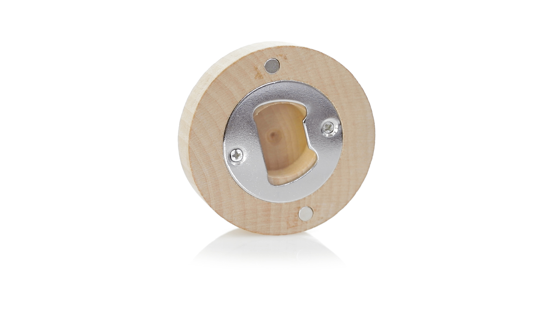 Flaschenöffner aus Holz mit magnetischem Innenleben aus rostfreiem Stahl und originellem runden Design. Präsentiert in einer individuellen Tasche.