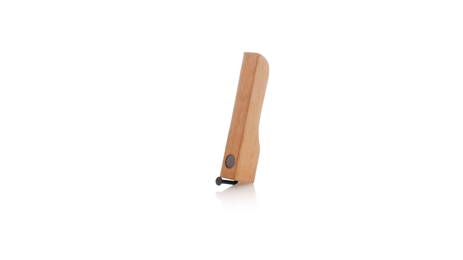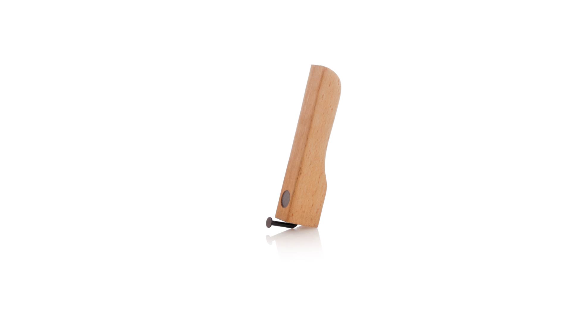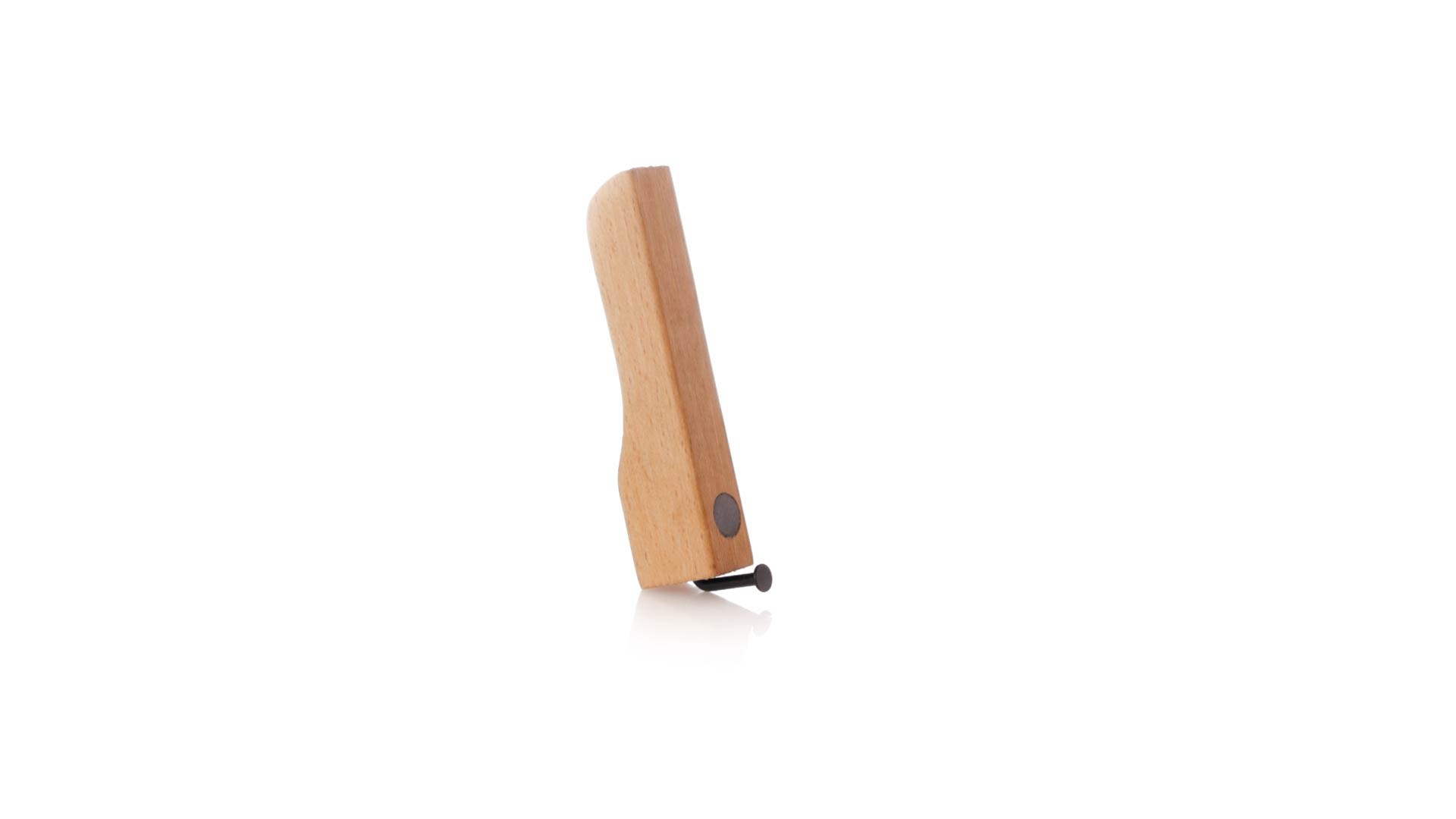 Echter Flaschenöffner aus Holz. Industriedesign aus weichem Naturholz mit nagelförmigem Öffner und praktischen Magneten zum Halten des Flaschenverschlusses und zum Platzieren auf jeder Metalloberfläche. Präsentiert in einer Kraft-Design-Box.