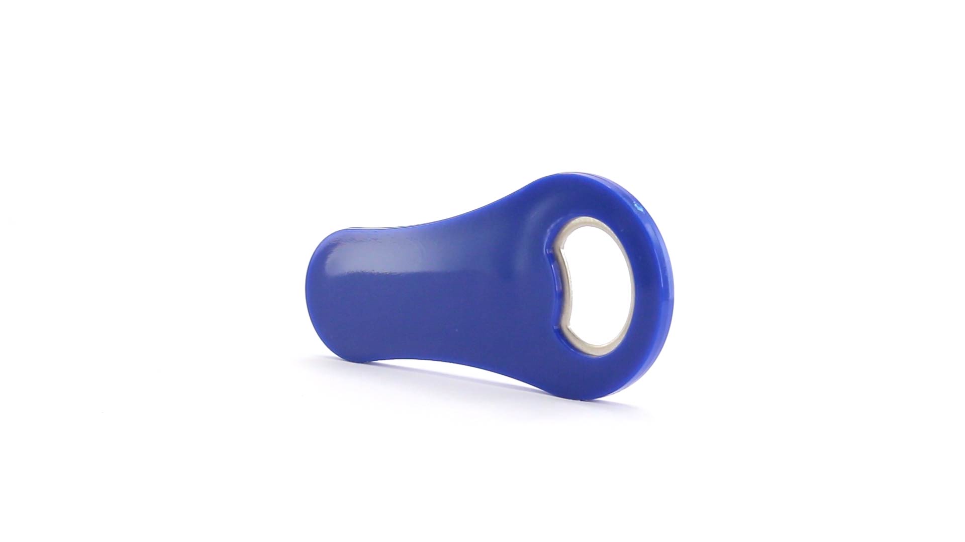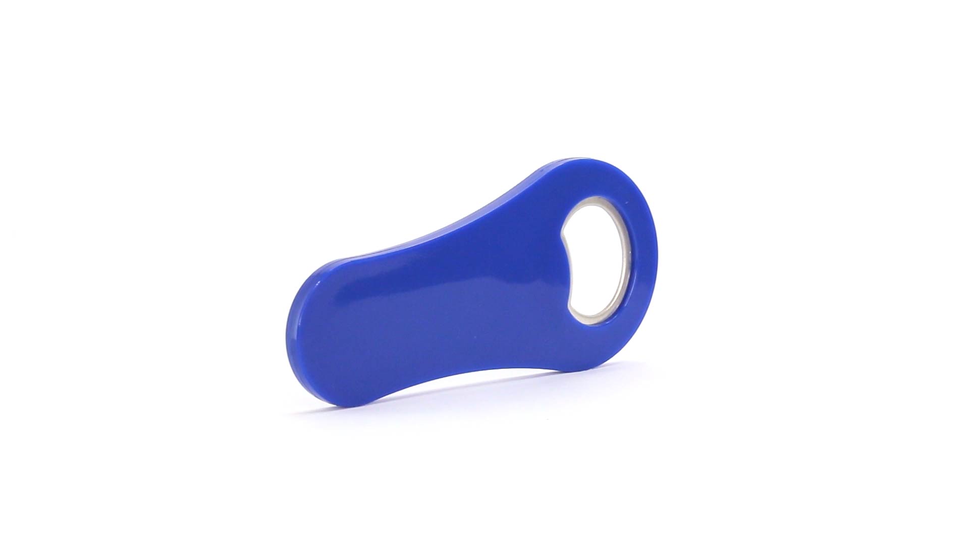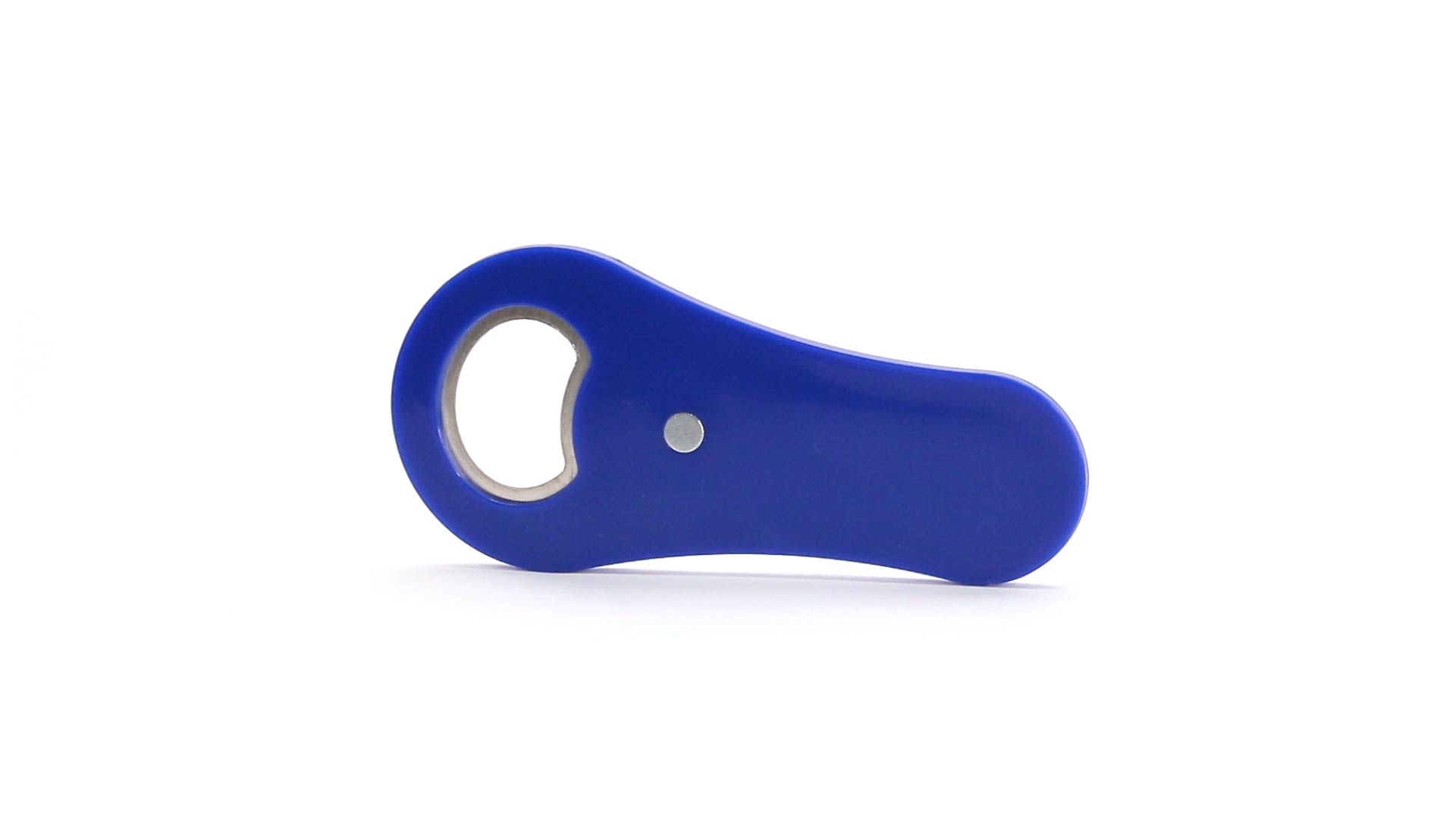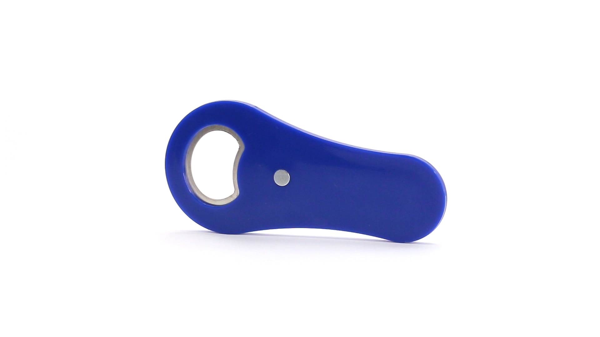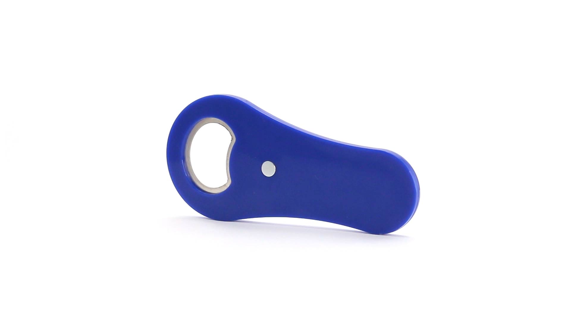 Magnetischer Flaschenöffner mit robustem Körper in verschiedenen Farben und Metallheber zum Öffnen.