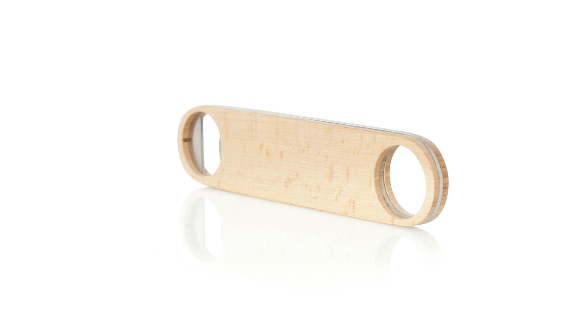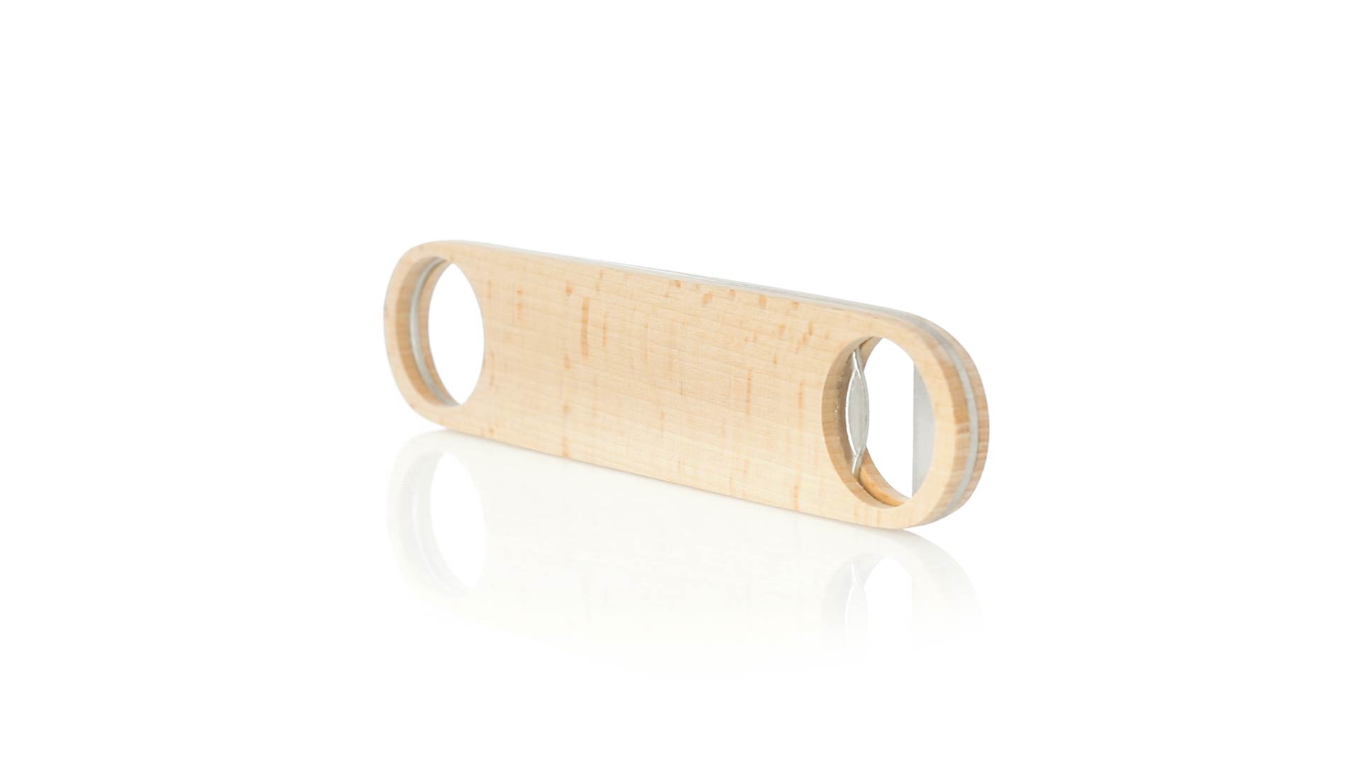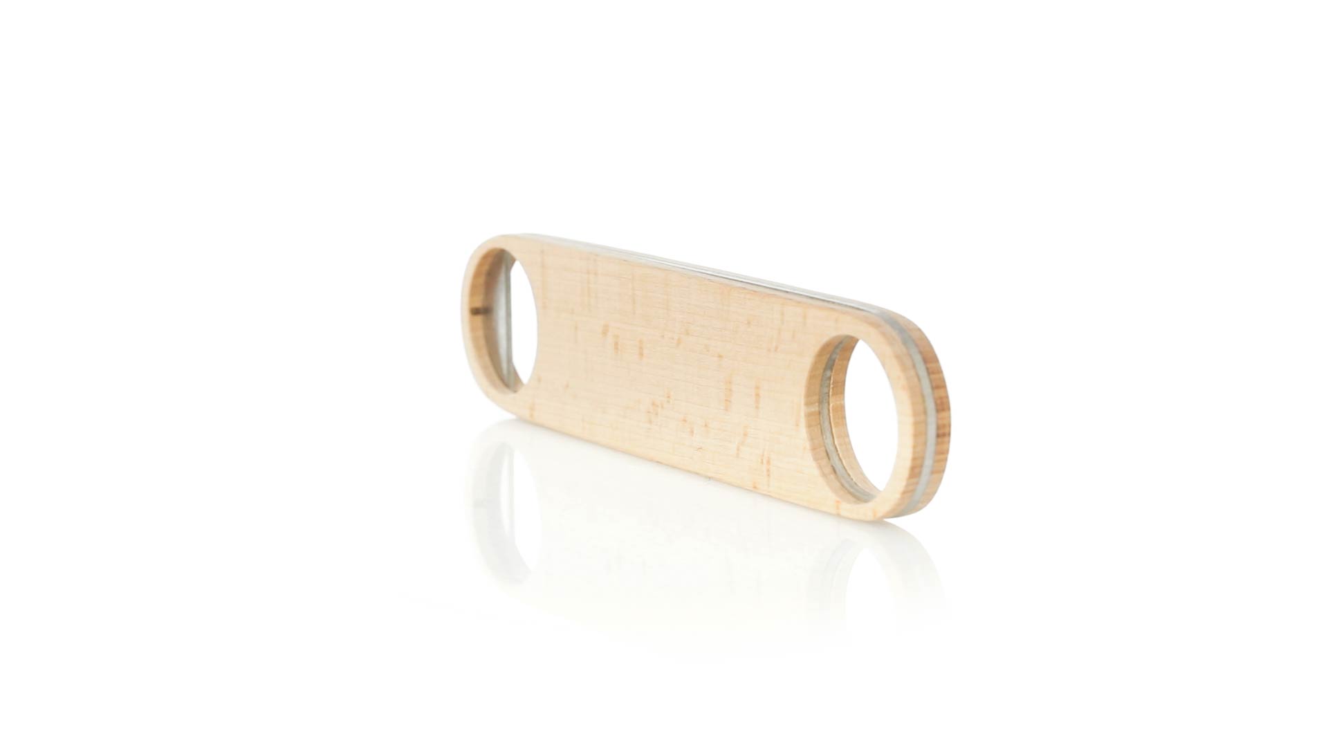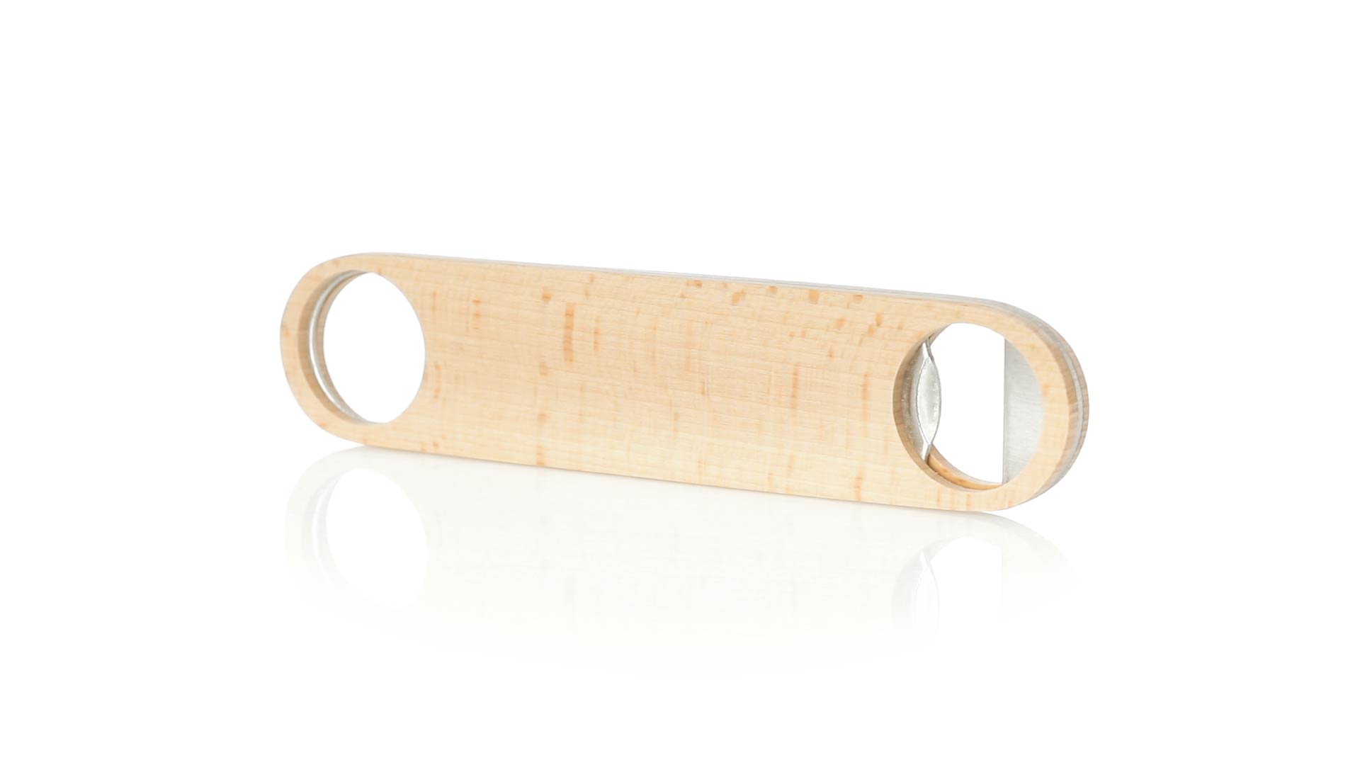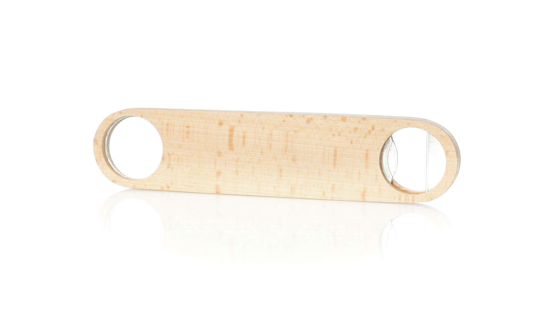 Flaschenöffner aus Buchenholz mit Edelstahlkern. Gestanzter Griff zum Aufhängen.