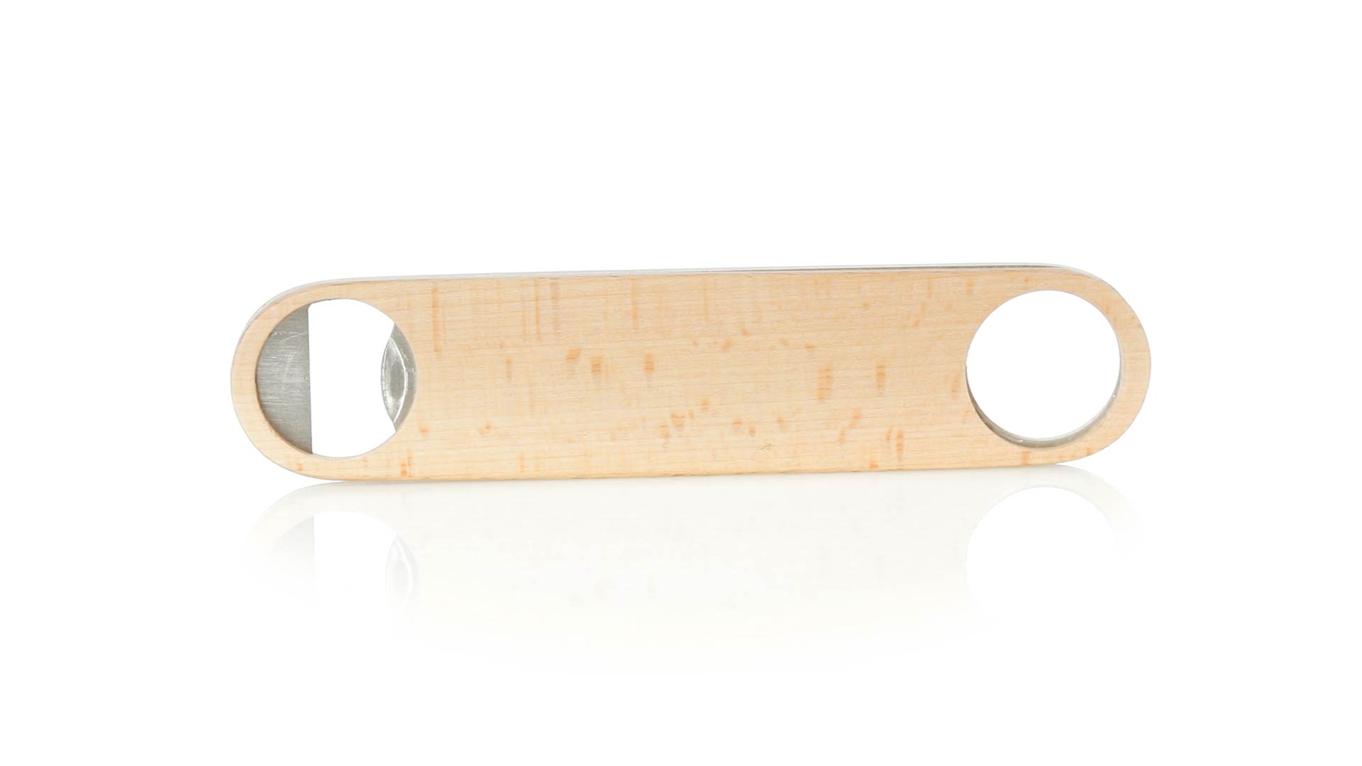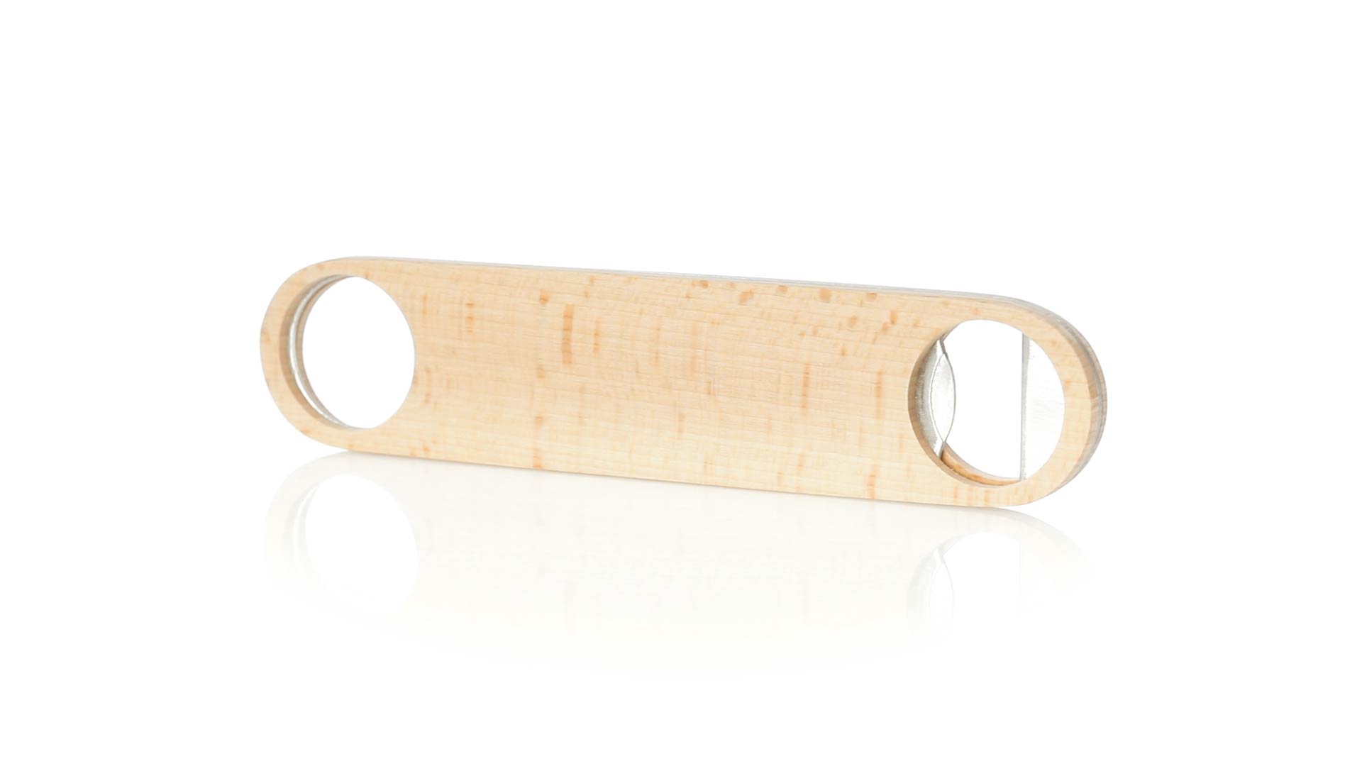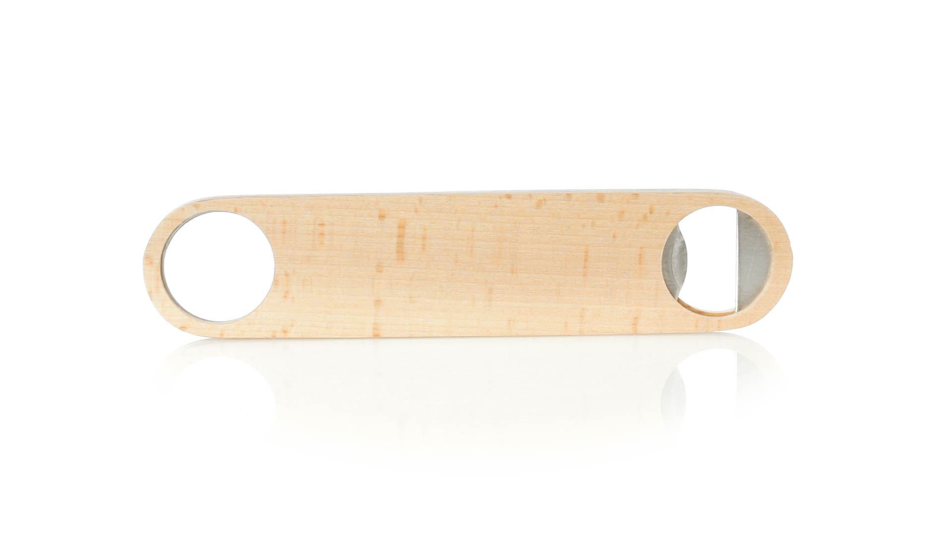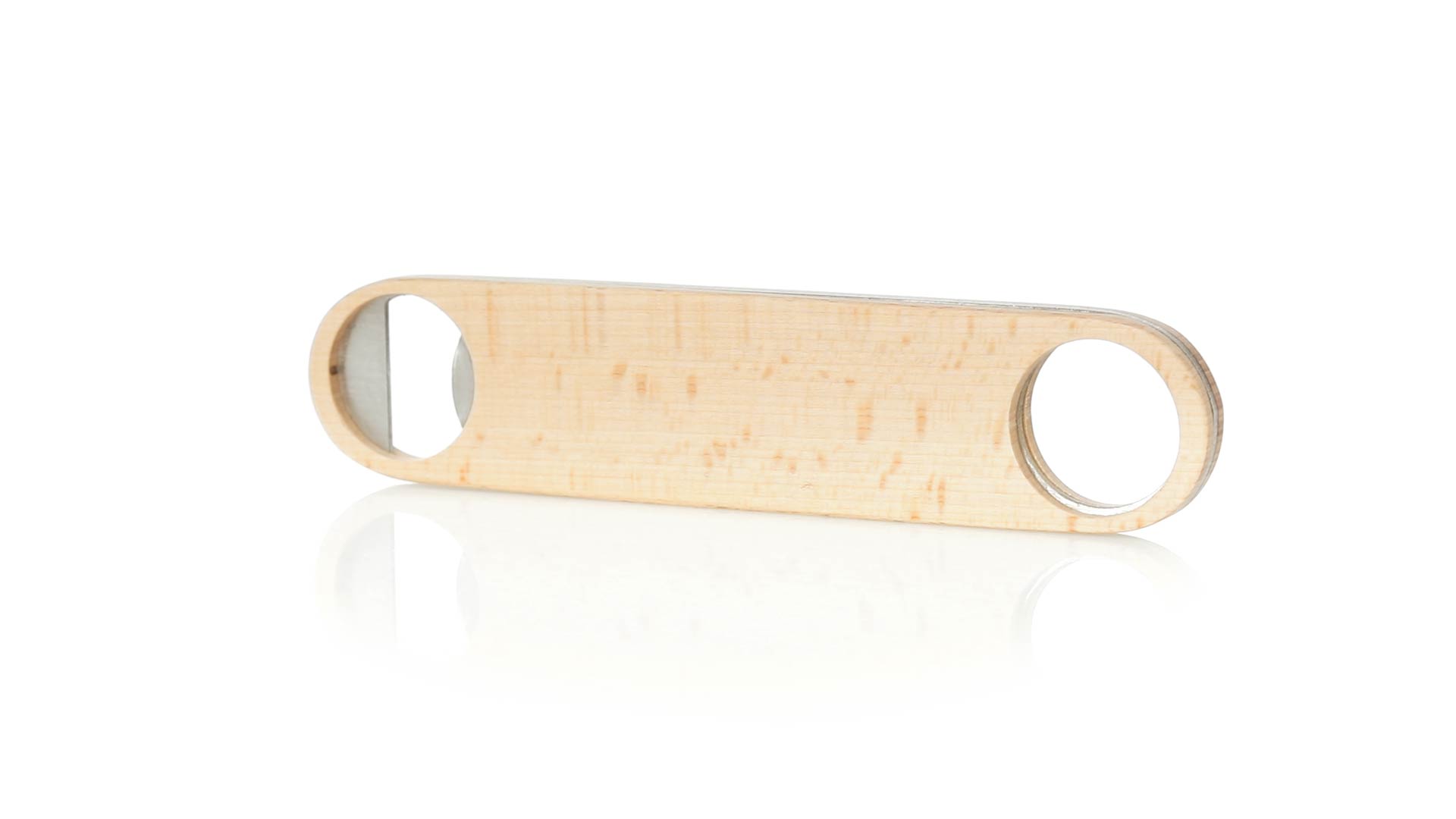 Flaschenöffner aus Buchenholz mit Edelstahlkern. Gestanzter Griff zum Aufhängen.