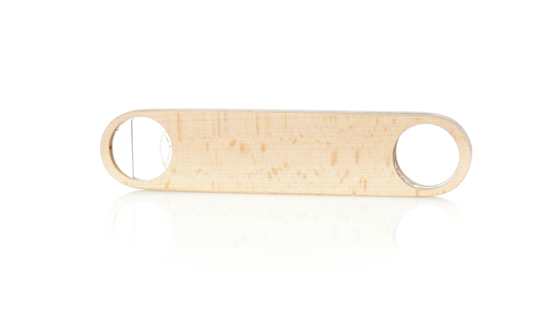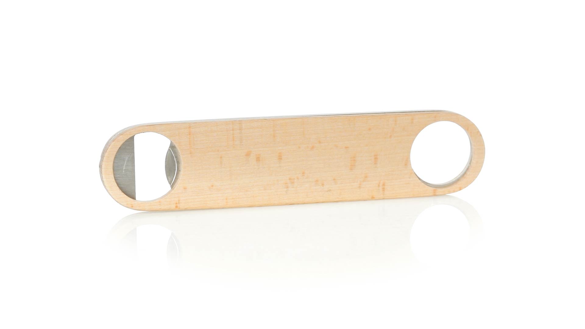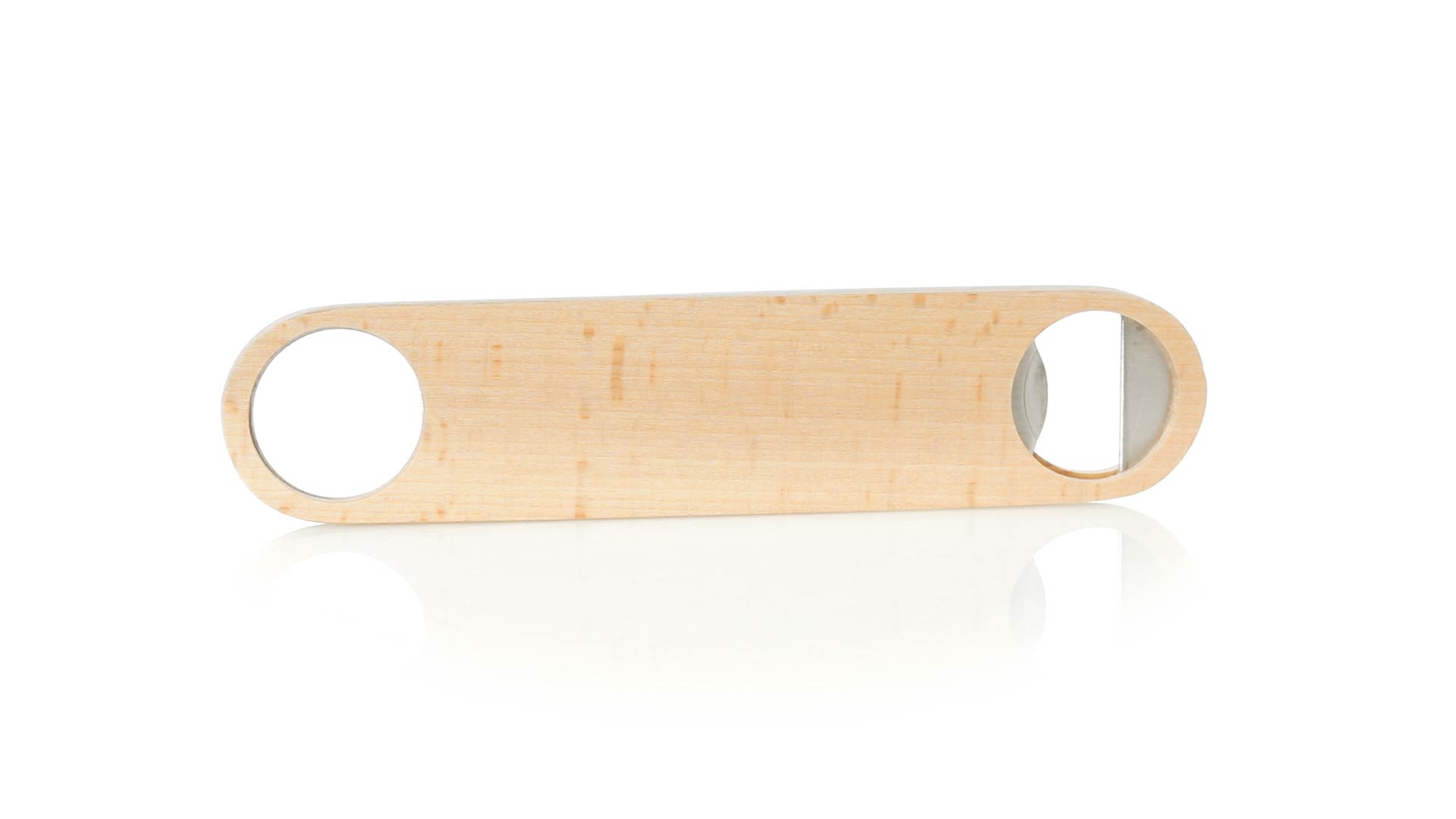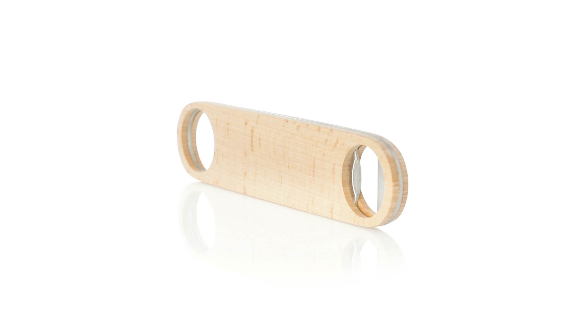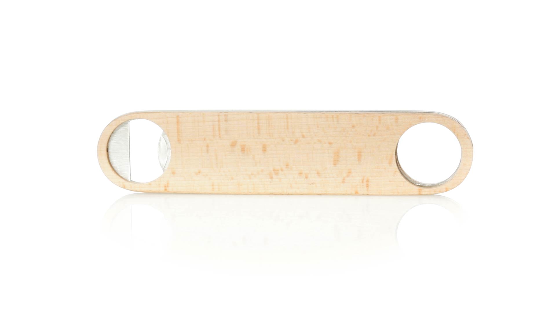 Flaschenöffner aus Buchenholz mit Edelstahlkern. Gestanzter Griff zum Aufhängen.