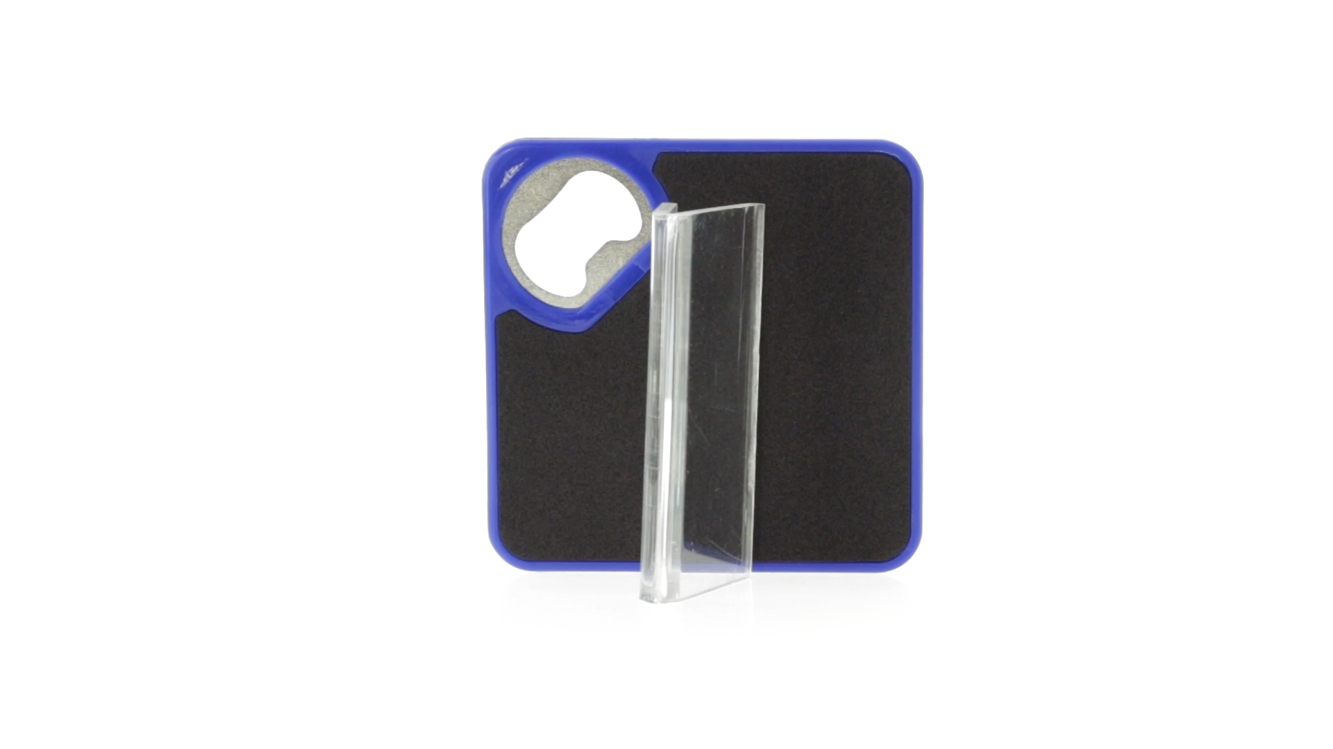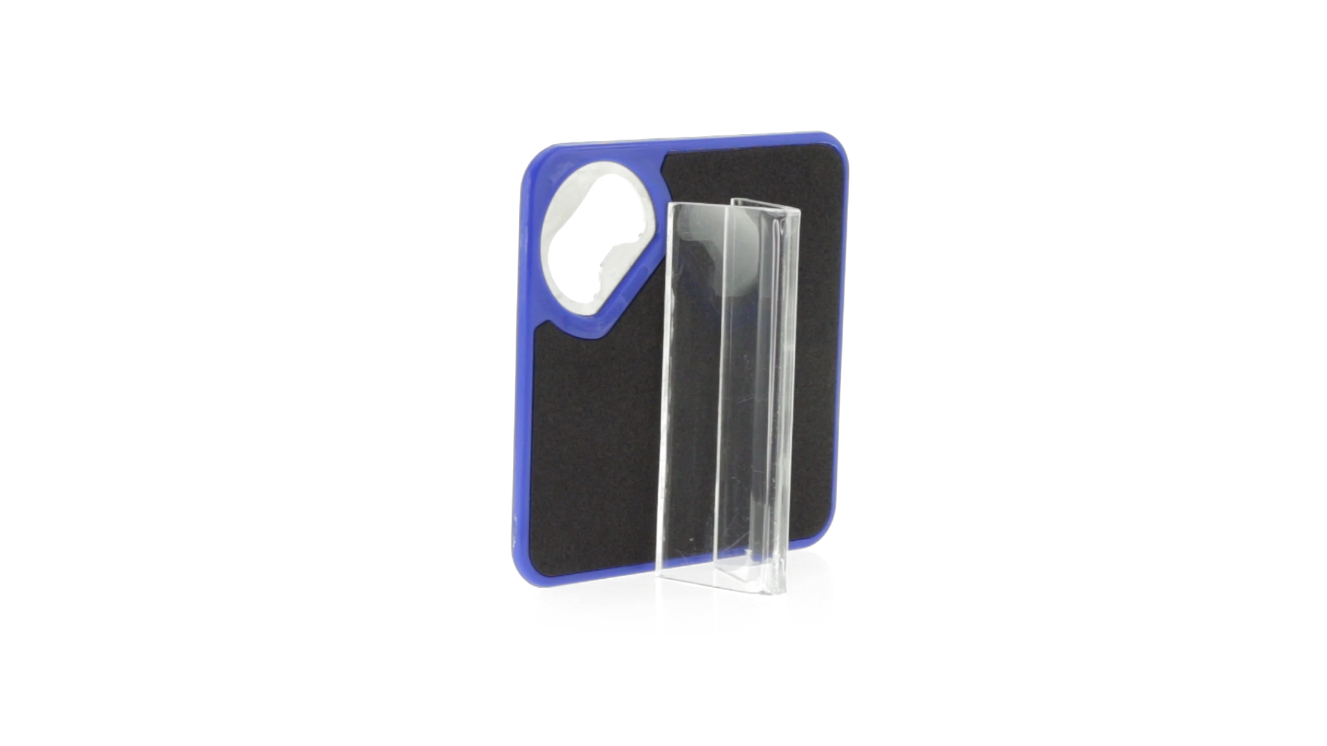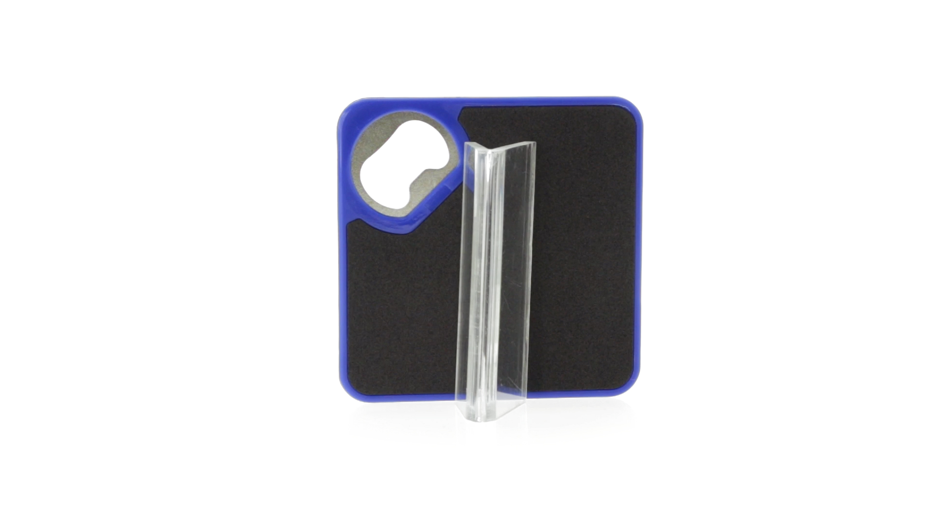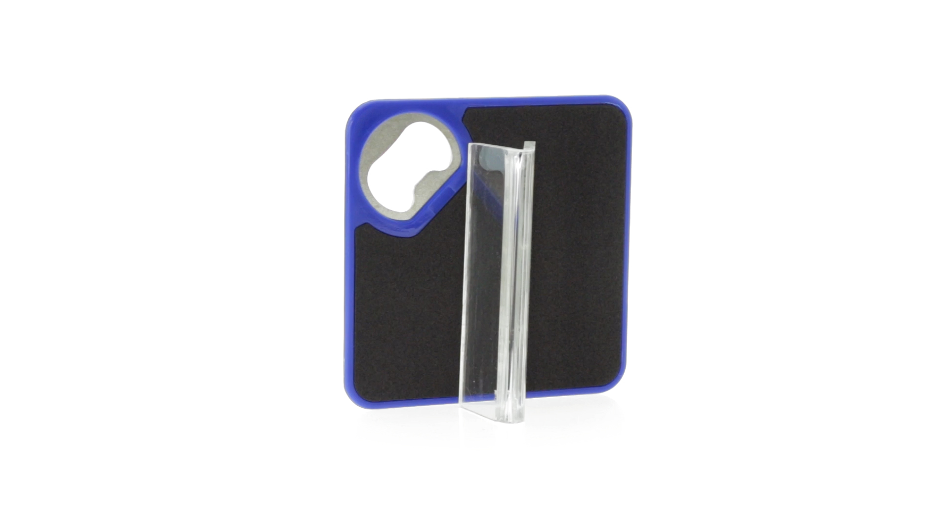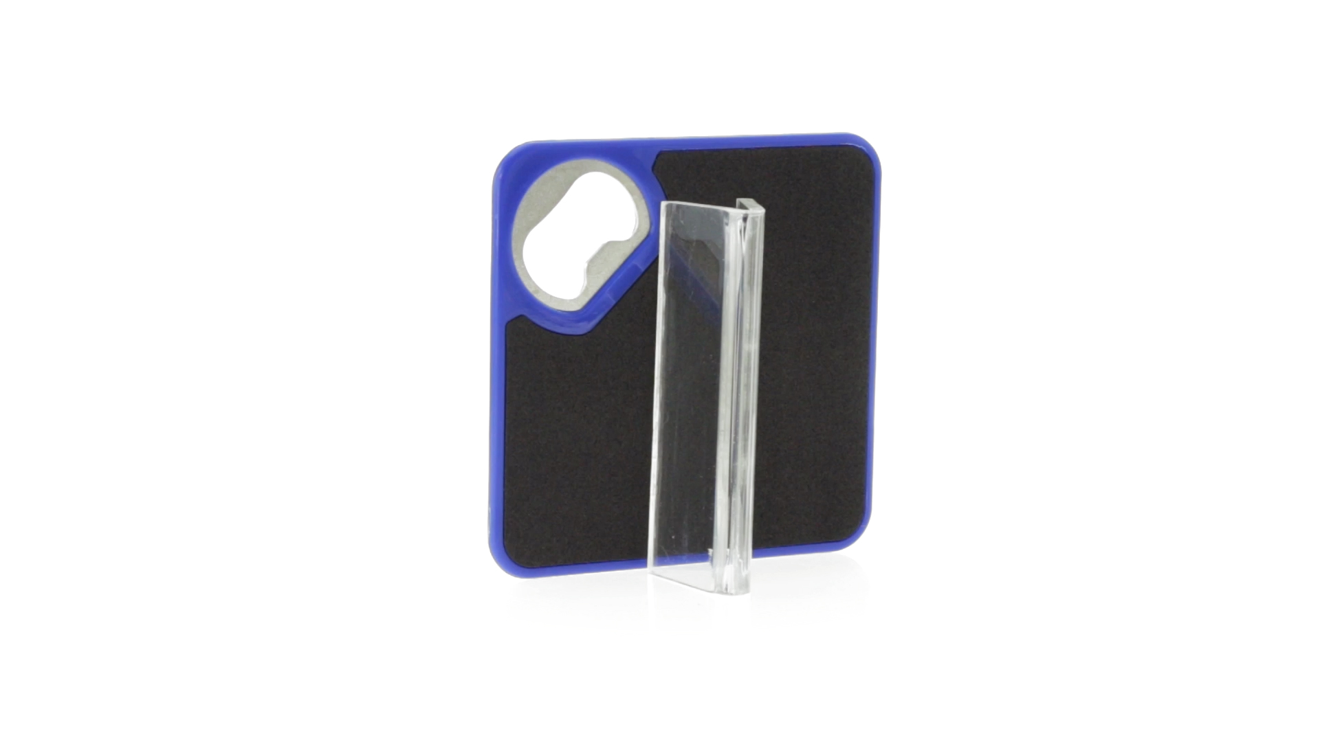 Origineller Untersetzer mit integriertem Metall-Flaschenöffner in einer Vielzahl von lebendigen Farben. Mit rutschfester Unterseite.