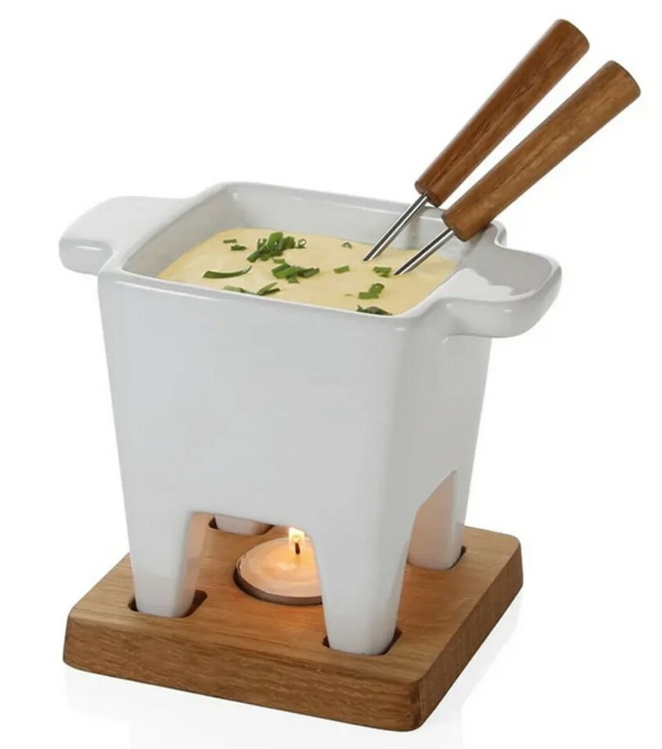 Individuelles eckiges Porzellan Fondue Set mit Bambusplatte, Teelicht und 4 Gabeln. Fassungsvermögen ca 360 ml