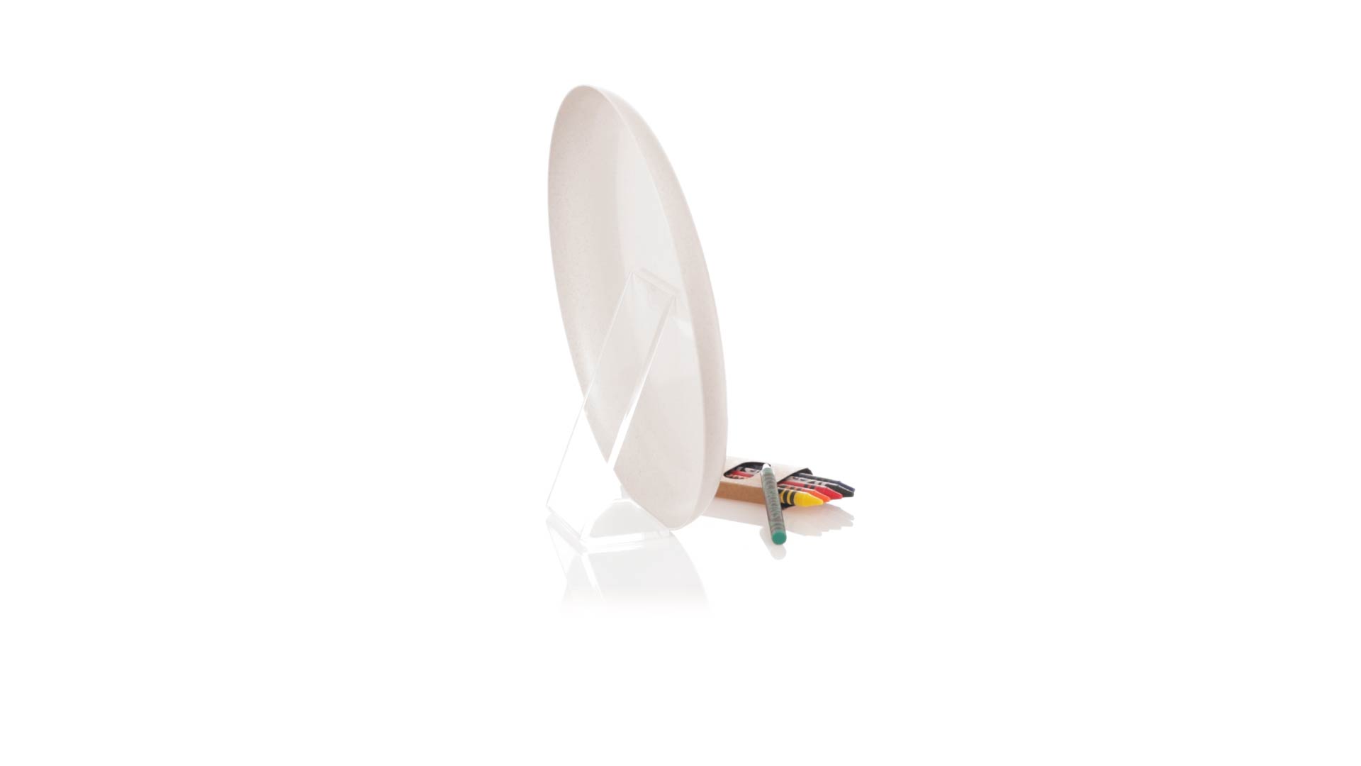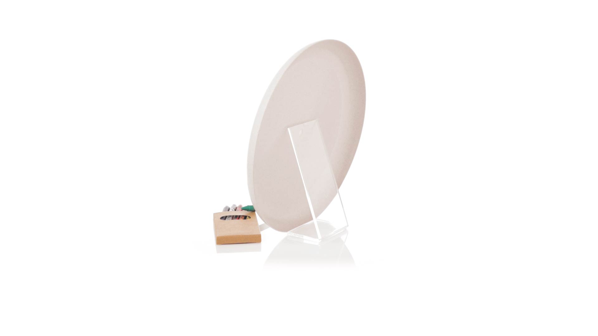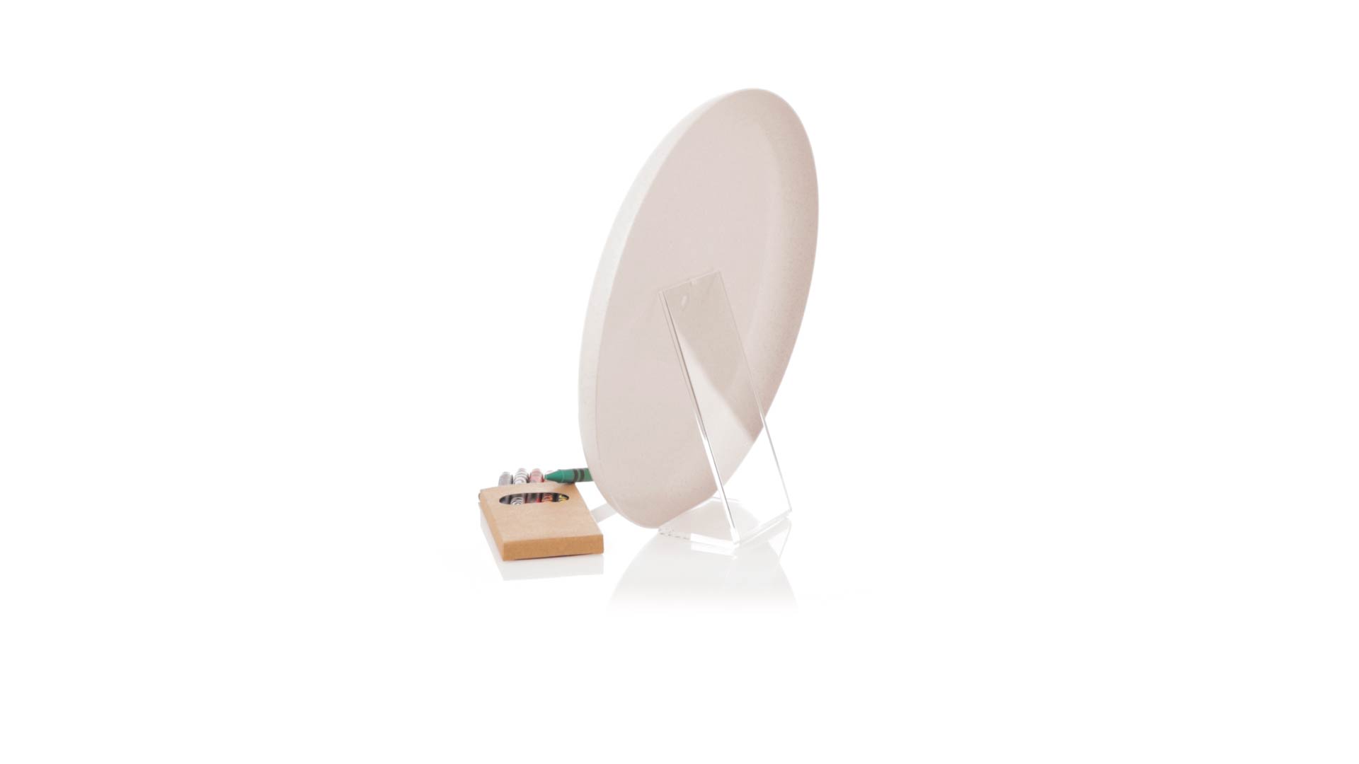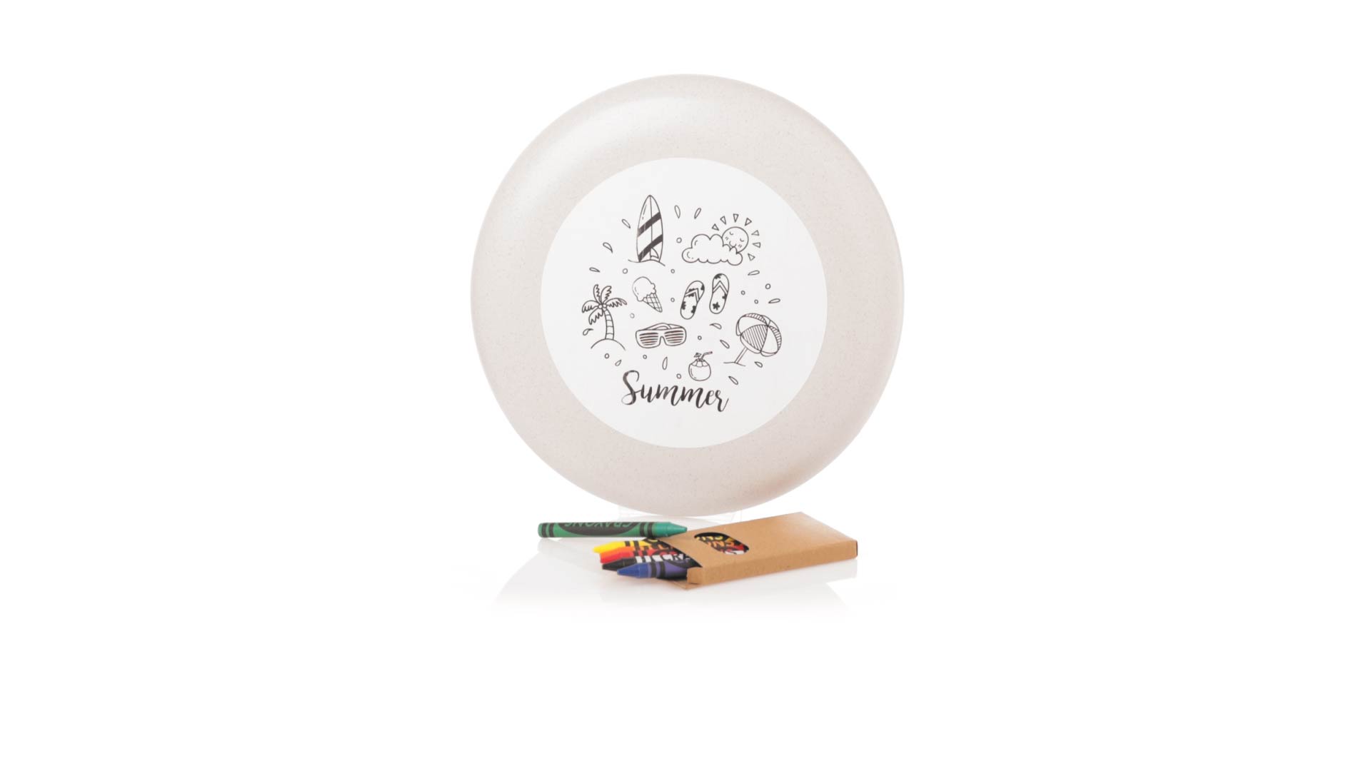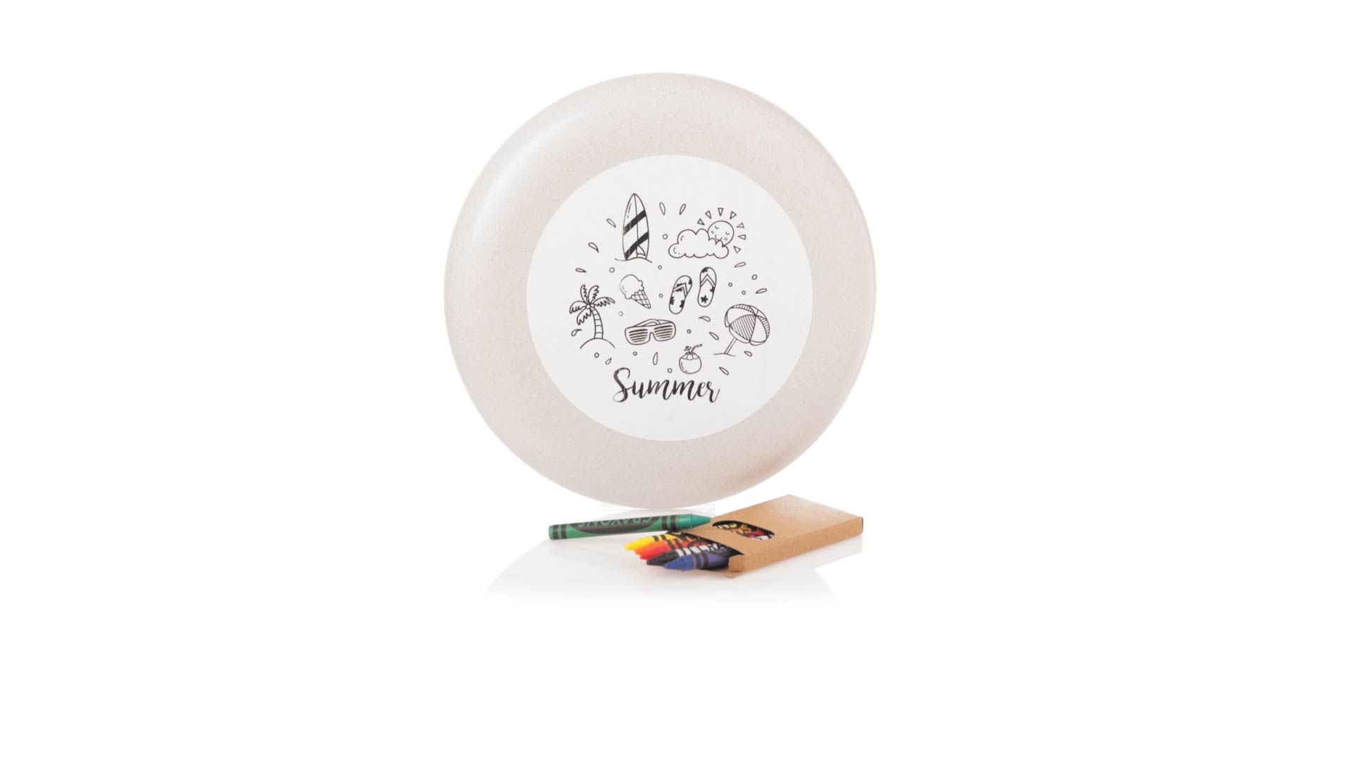 Origineller, anpassbarer Frisbee aus Weizenrohr. Lustiges Set aus Buntstiften und Frisbiee, mit einem Bereich zum Ausmalen der ursprünglichen Naturzeichnung. Präsentiert in einer recycelten Papiertüte. Inklusive: Frisbee mit Naturzeichnung zum Ausmalen. Box mit 6 Buntstiften in verschiedenen Farben.